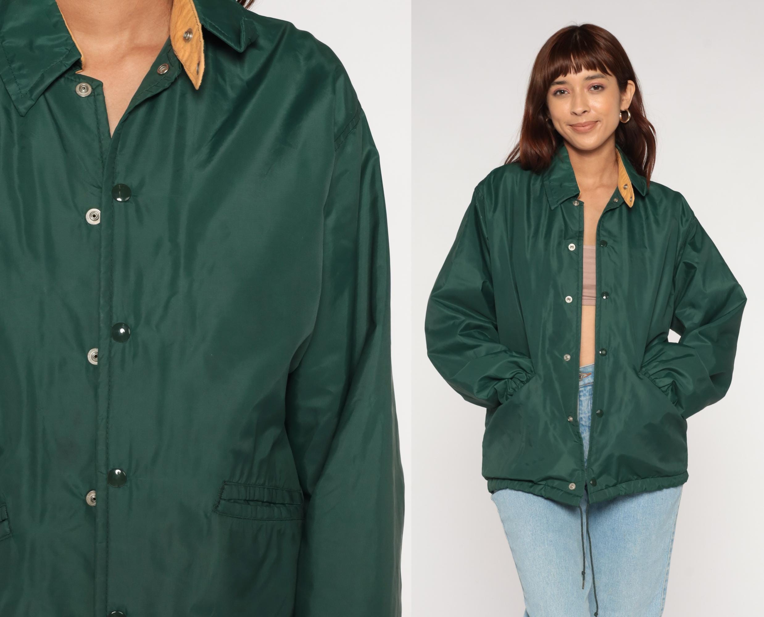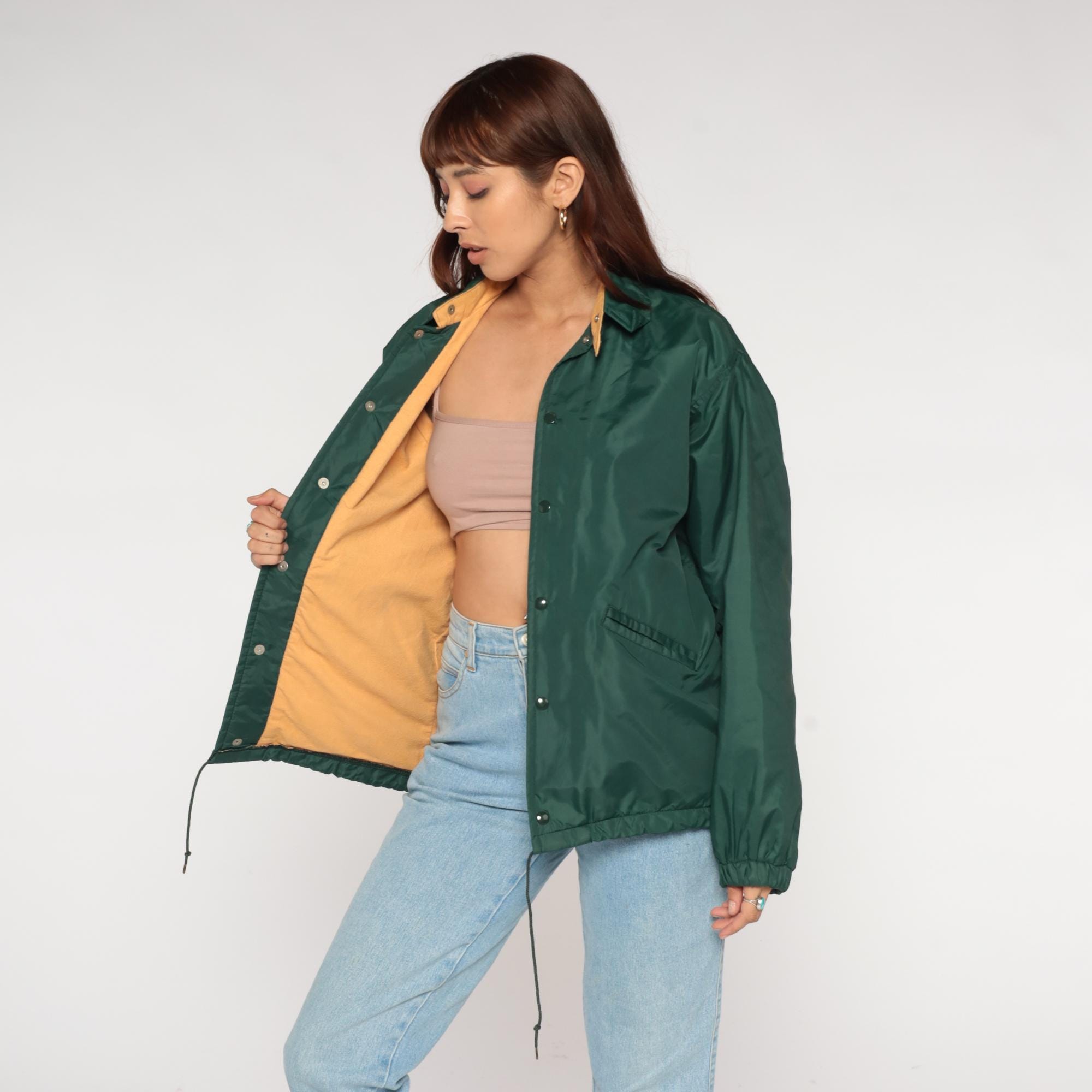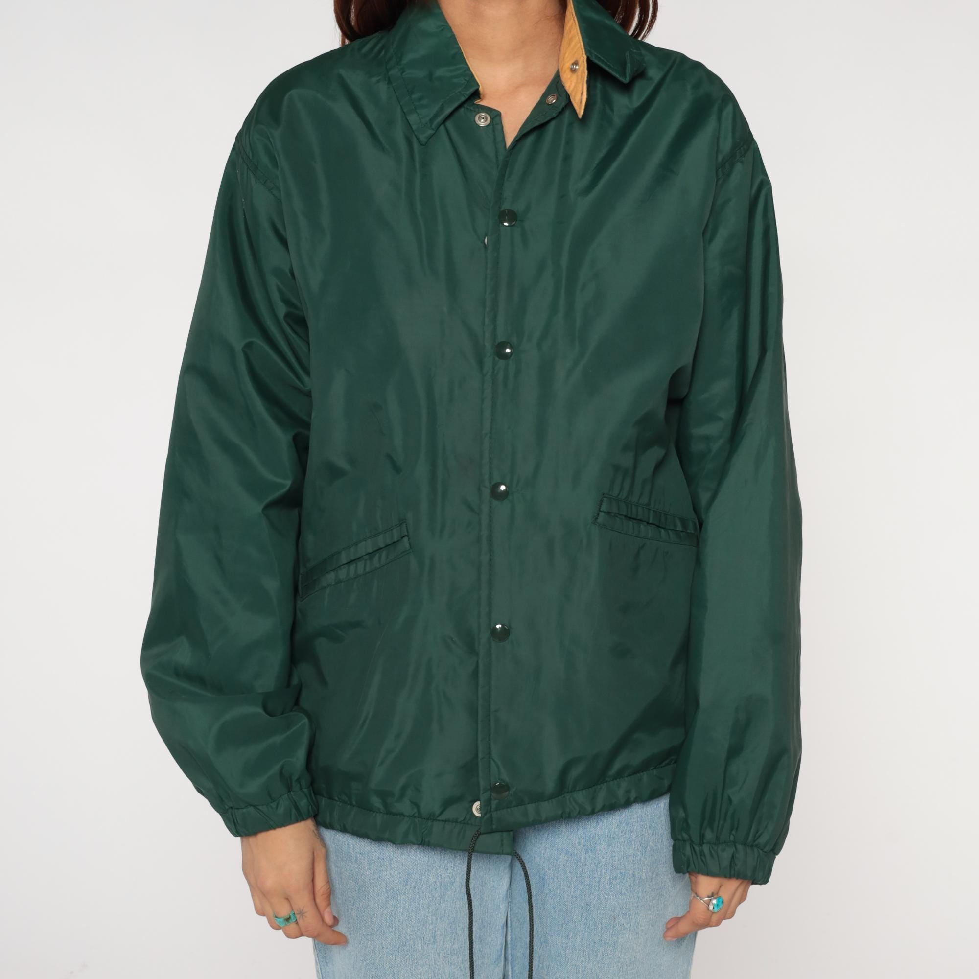 80s L.L.Bean coach jacket in forest green with distinctive mustard yellow collar accent. Classic snap button front closure with dual front slash pockets.