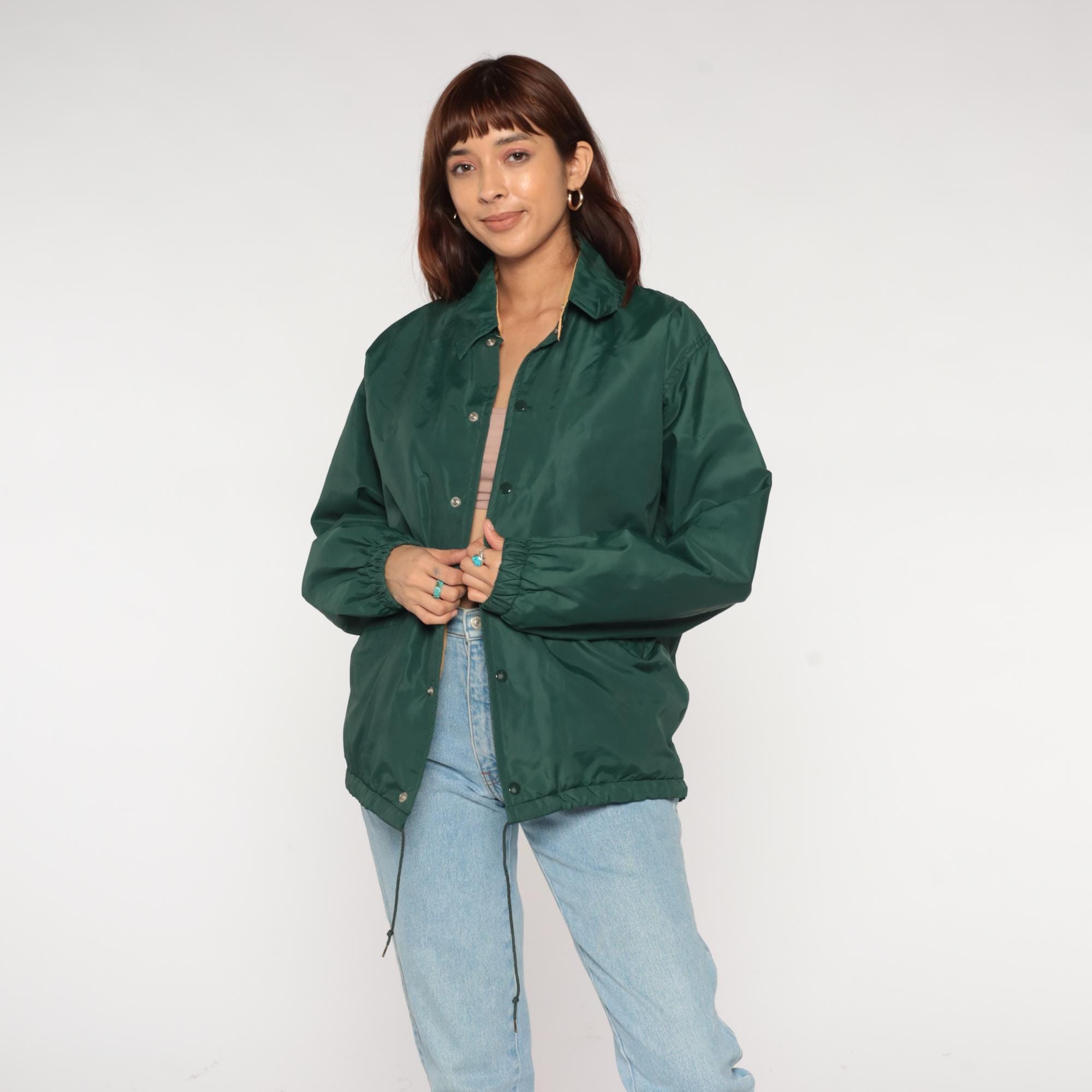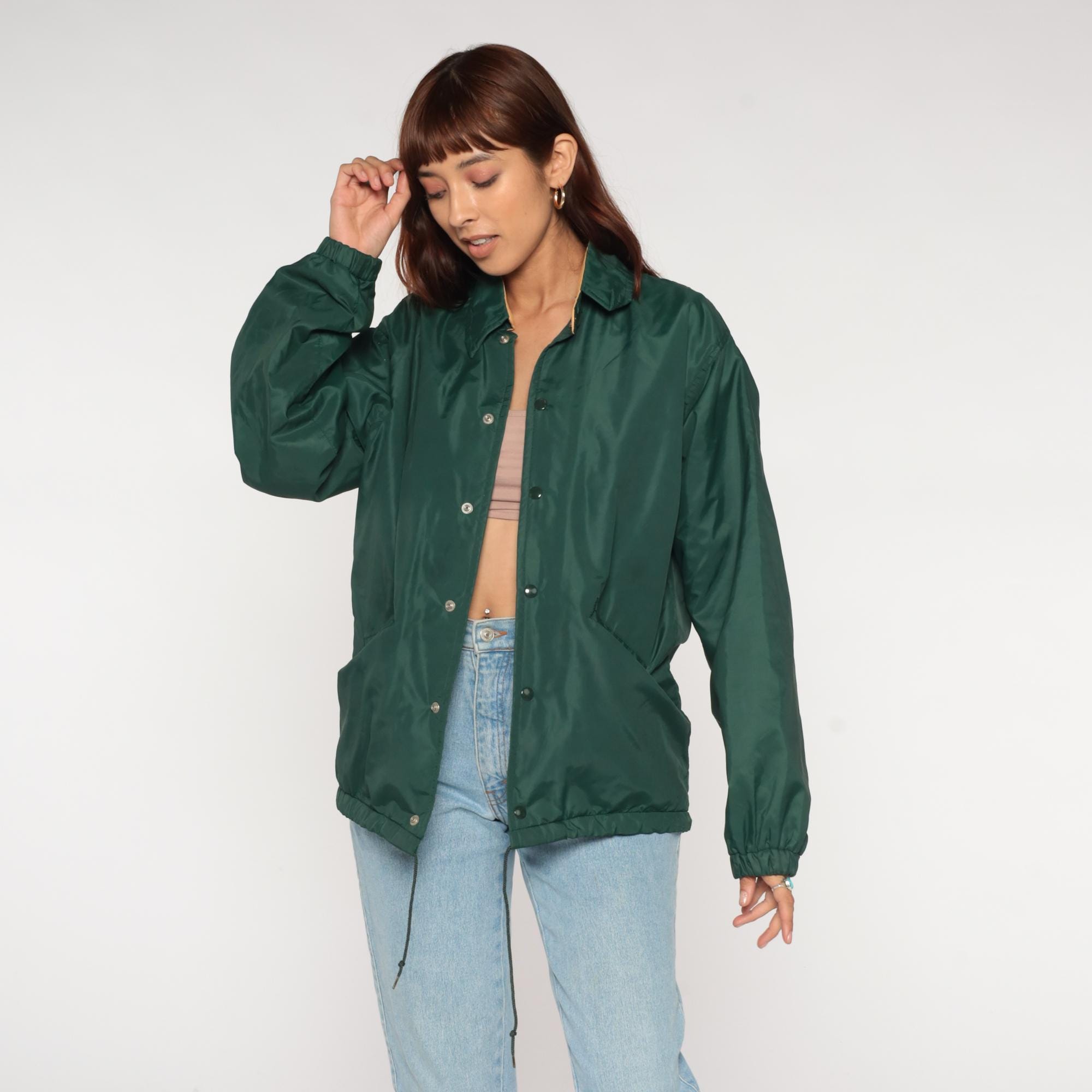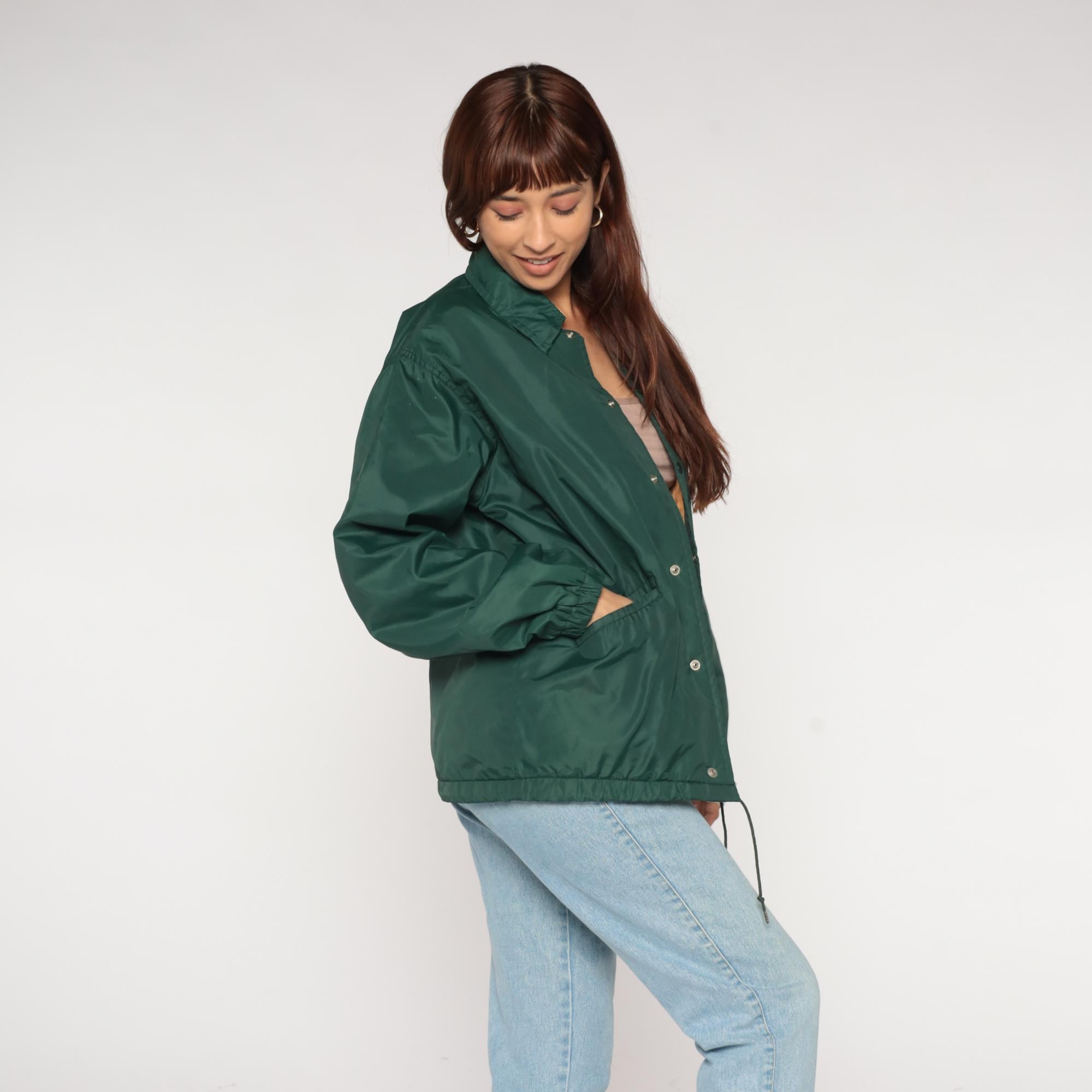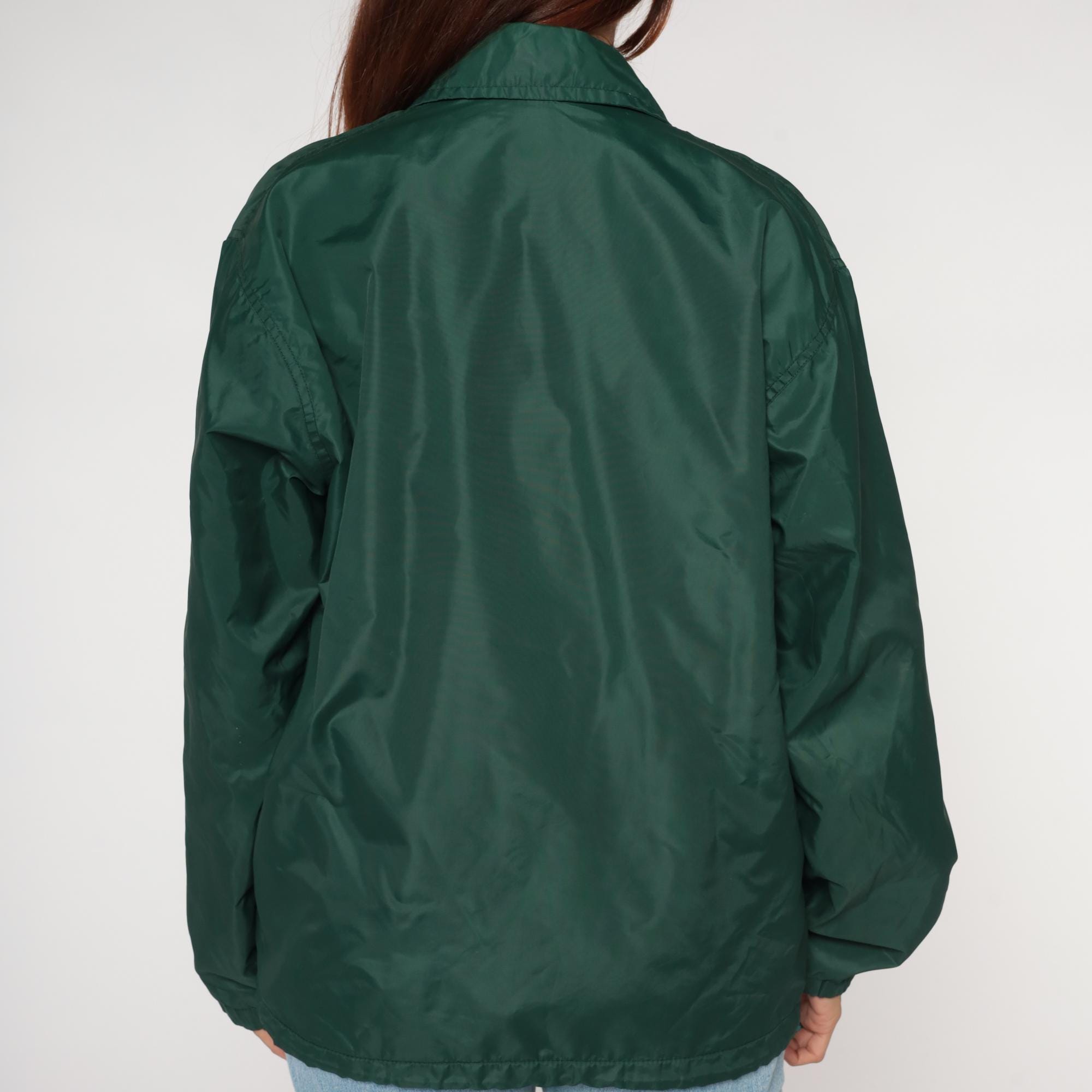 80s L.L.Bean coach jacket in forest green with distinctive mustard yellow collar accent. Classic snap button front closure with dual front slash pockets.