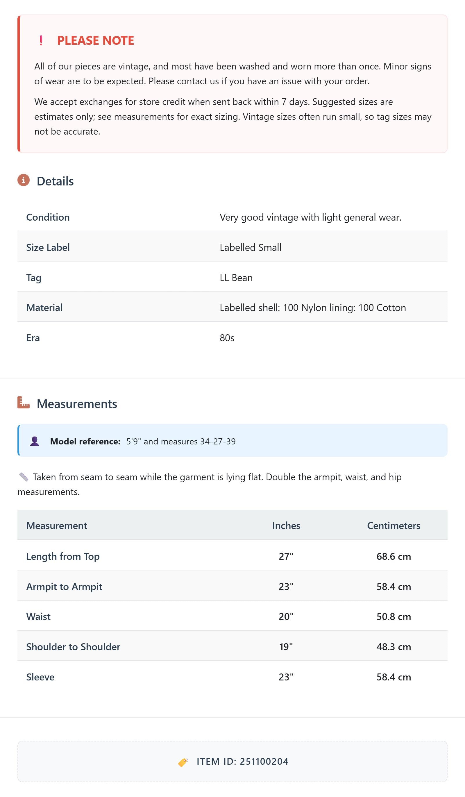 All of our pieces are vintage, and most have been washed and worn more than once. Minor signs of wear are to be expected. Please contact us if you have an issue with your order. We accept exchanges for store credit when sent back within 7 days.