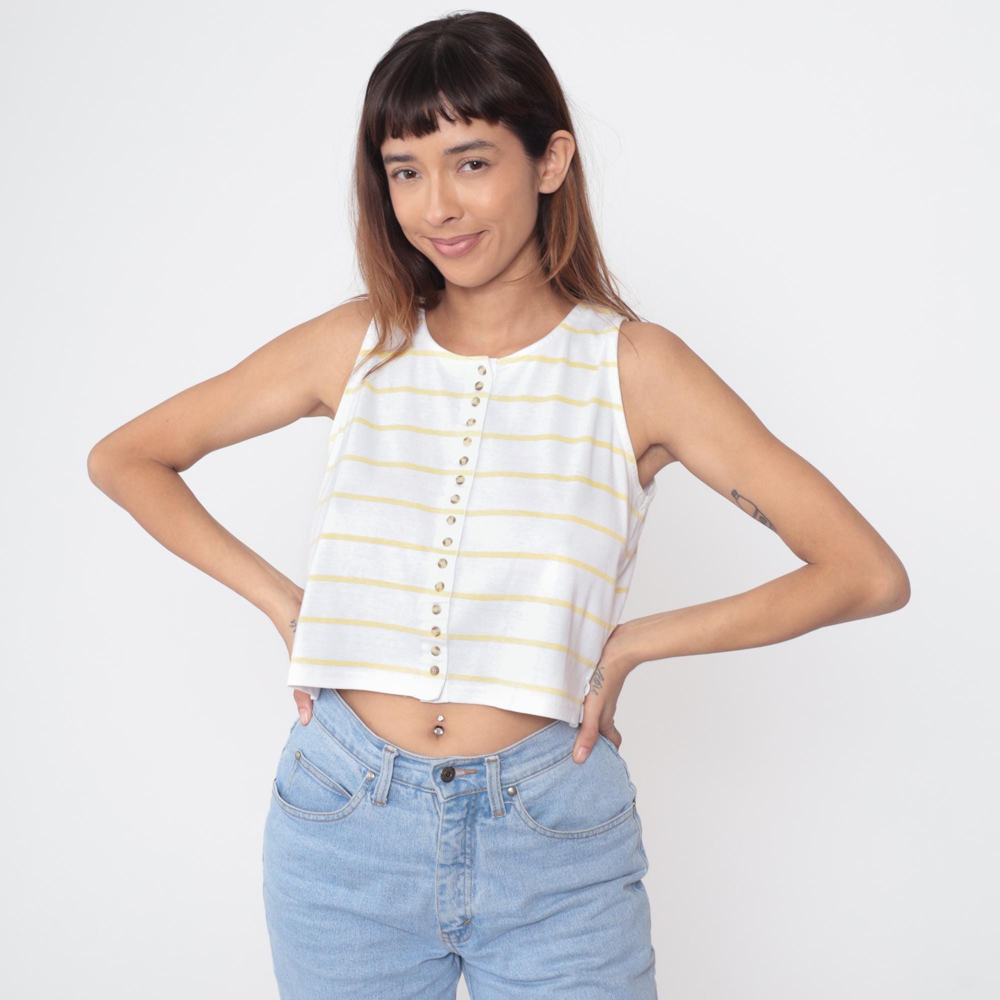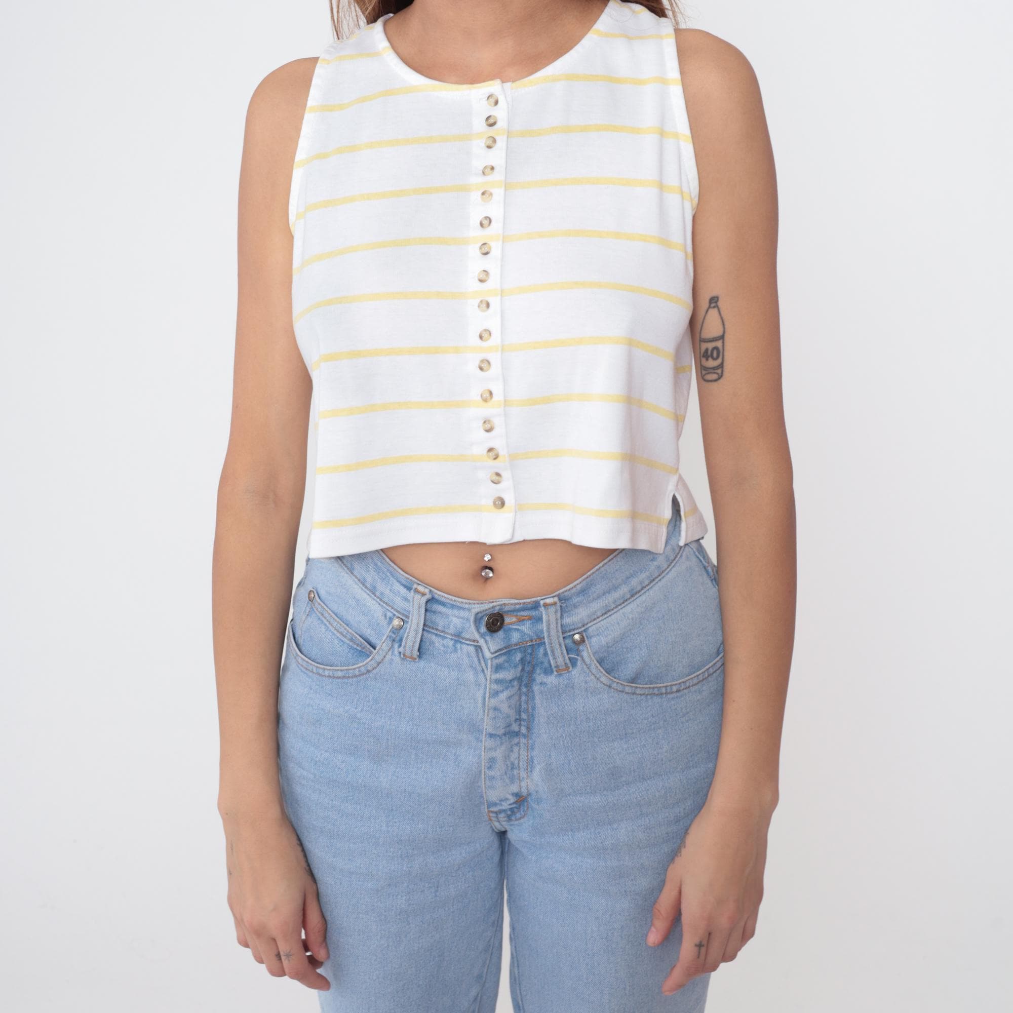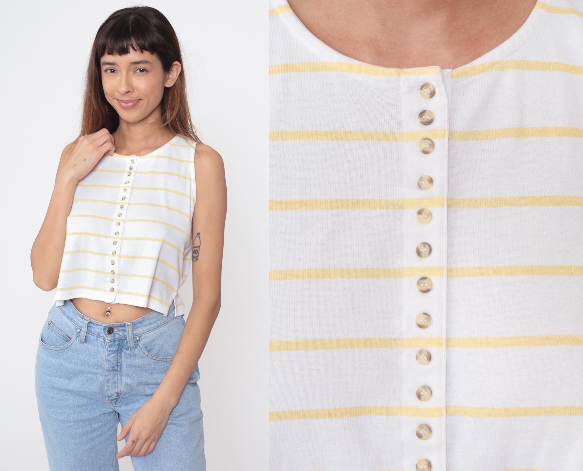 80s Outback Red sleeveless crop top in yellow and white horizontal stripes. Features full button-front closure with pearlescent buttons. Clean crew neckline and straight hem. Cropped length hits at natural waist. Perfect representation of 80s preppy style with modern Y2K appeal.