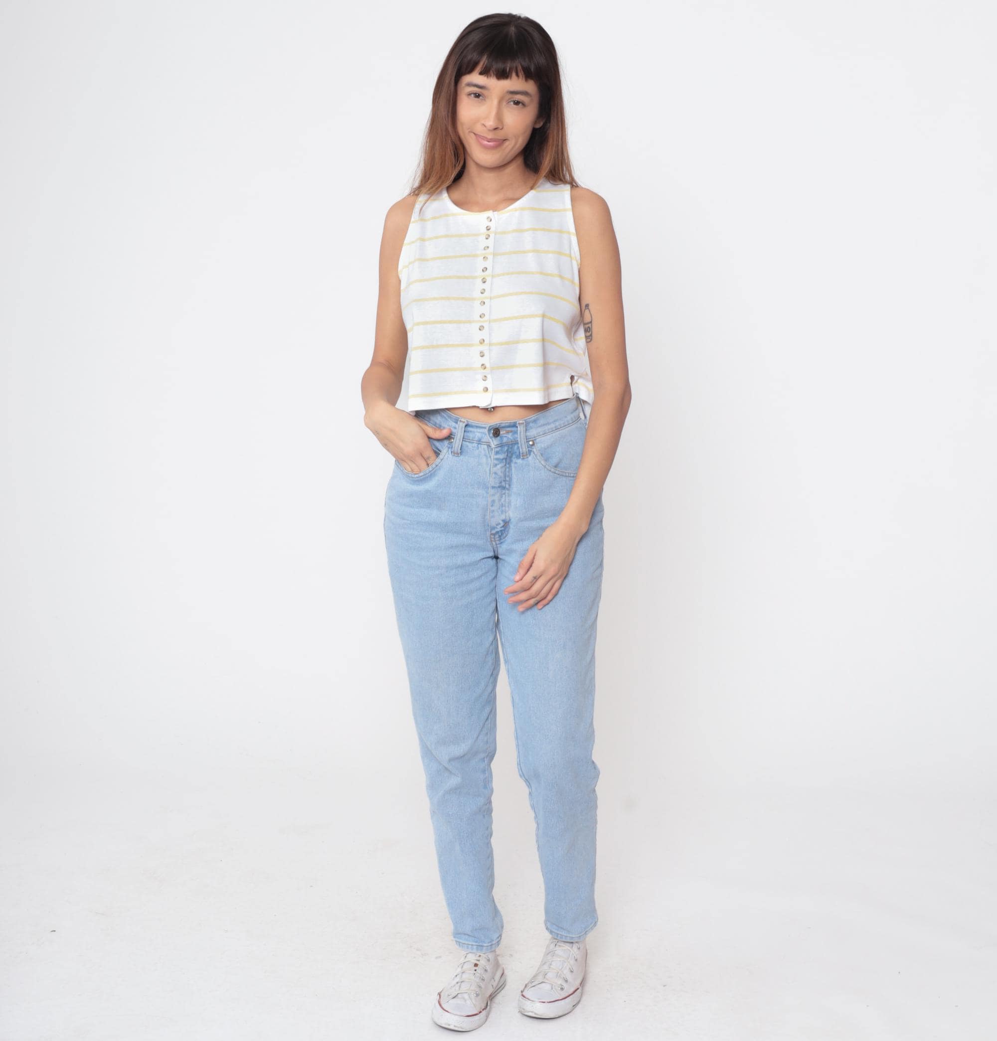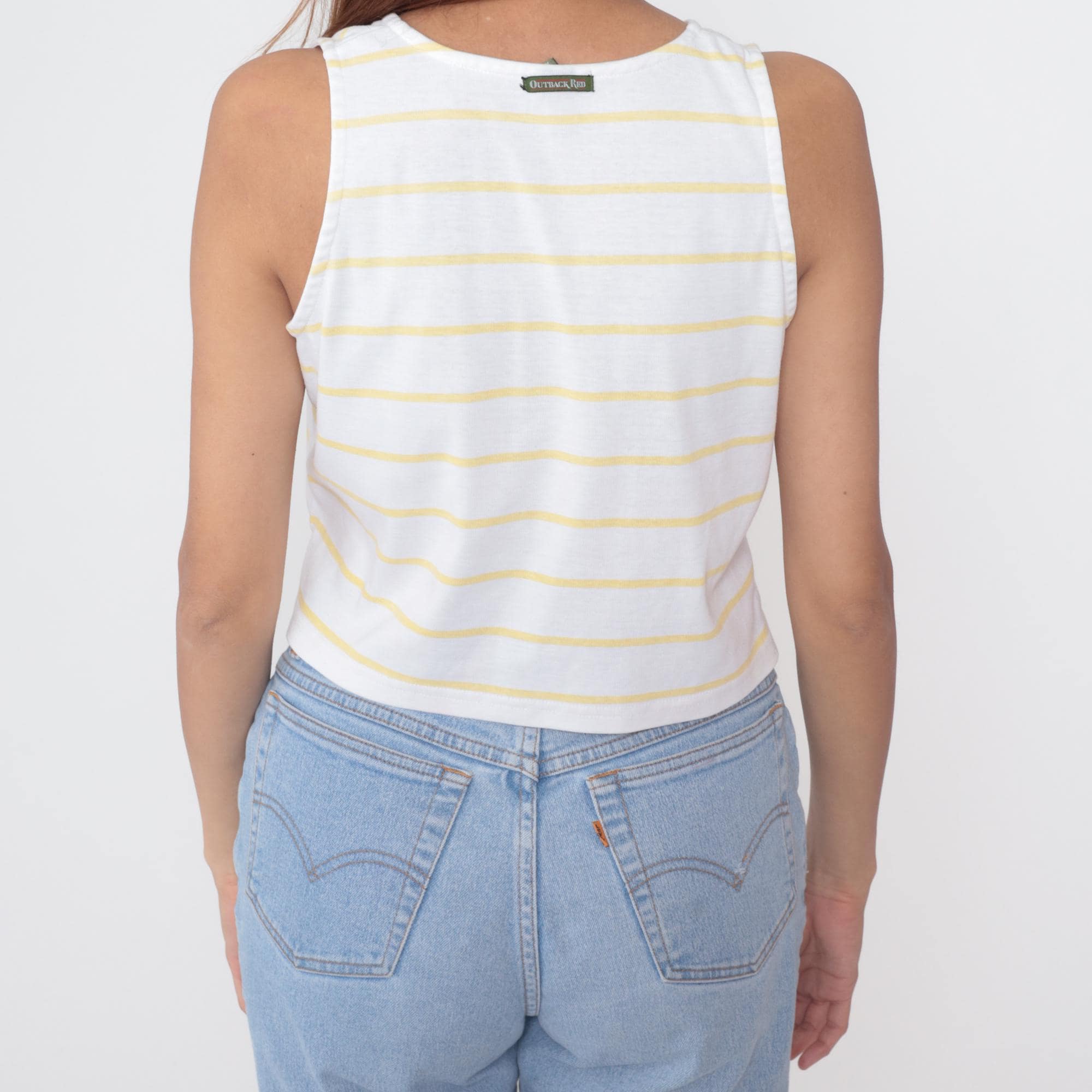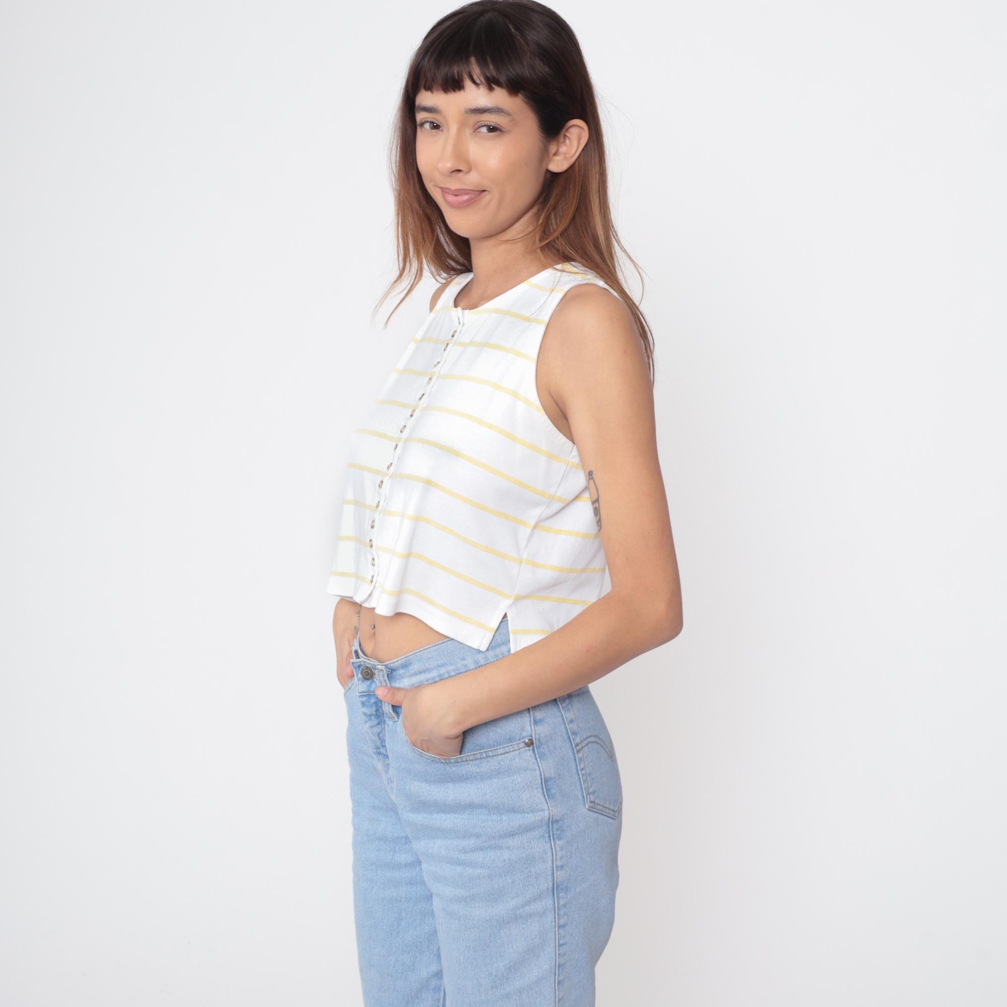 80s Outback Red sleeveless crop top in yellow and white horizontal stripes. Features full button-front closure with pearlescent buttons. Clean crew neckline and straight hem. Cropped length hits at natural waist. Perfect representation of 80s preppy style with modern Y2K appeal.