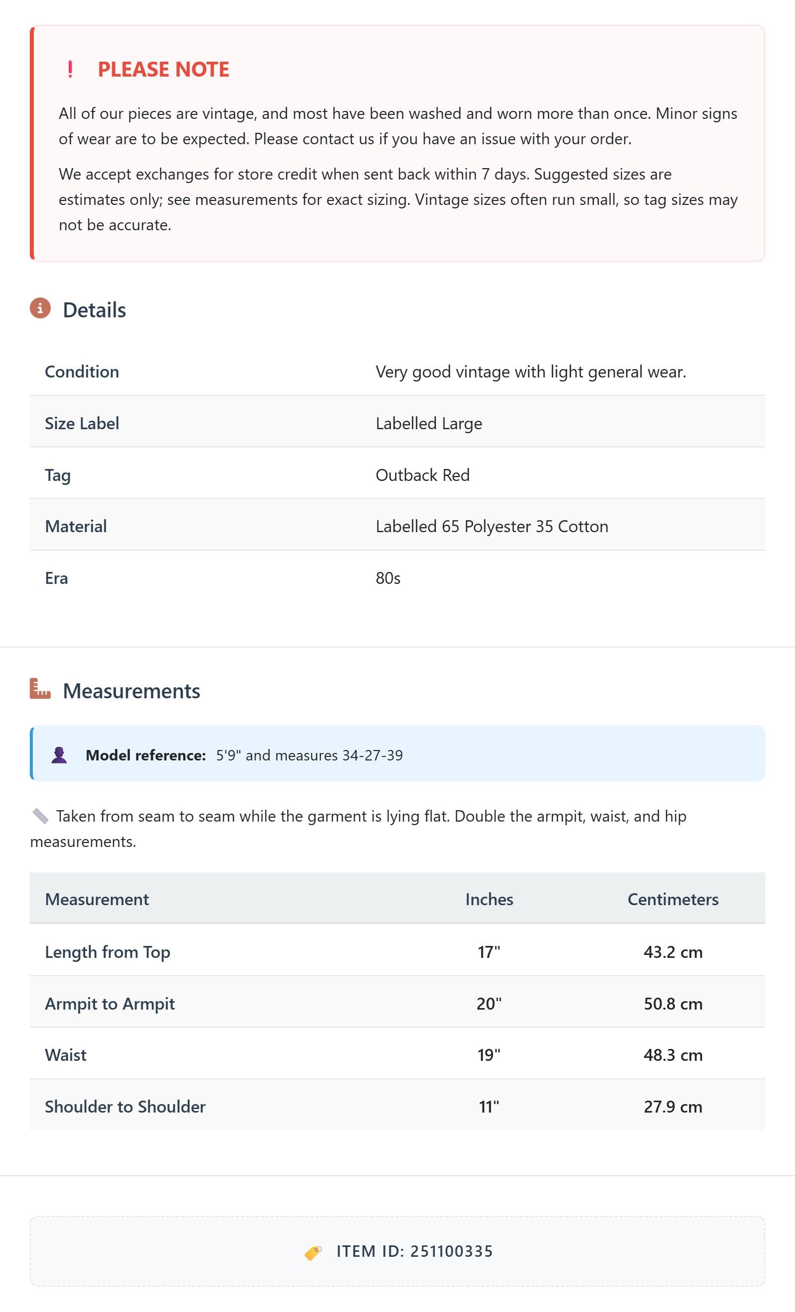 All of our pieces are vintage, and most have been washed and worn more than once. Minor signs of wear are to be expected. Please contact us if you have an issue with your order. We accept exchanges for store credit when sent back within 7 days.