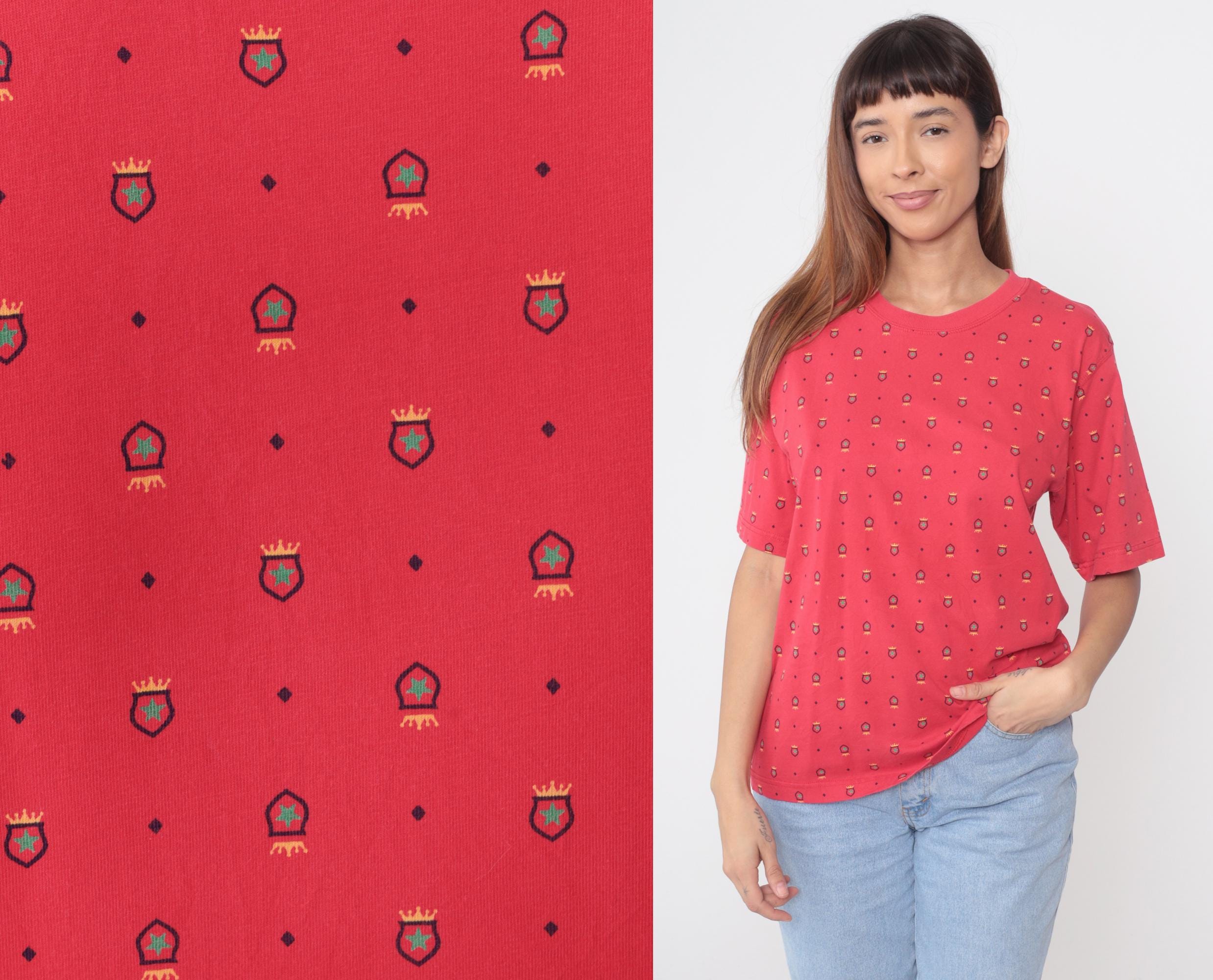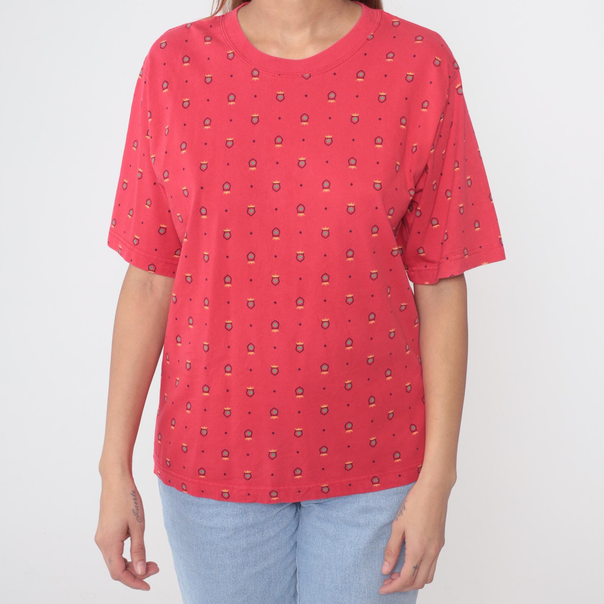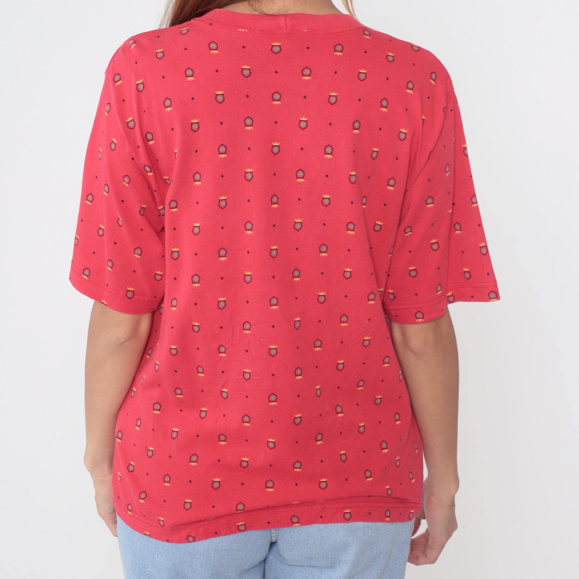 90s Talbot's red t-shirt featuring all-over print of decorative shield crests with crowns and small diamond shapes. Classic crew neck with short sleeves.