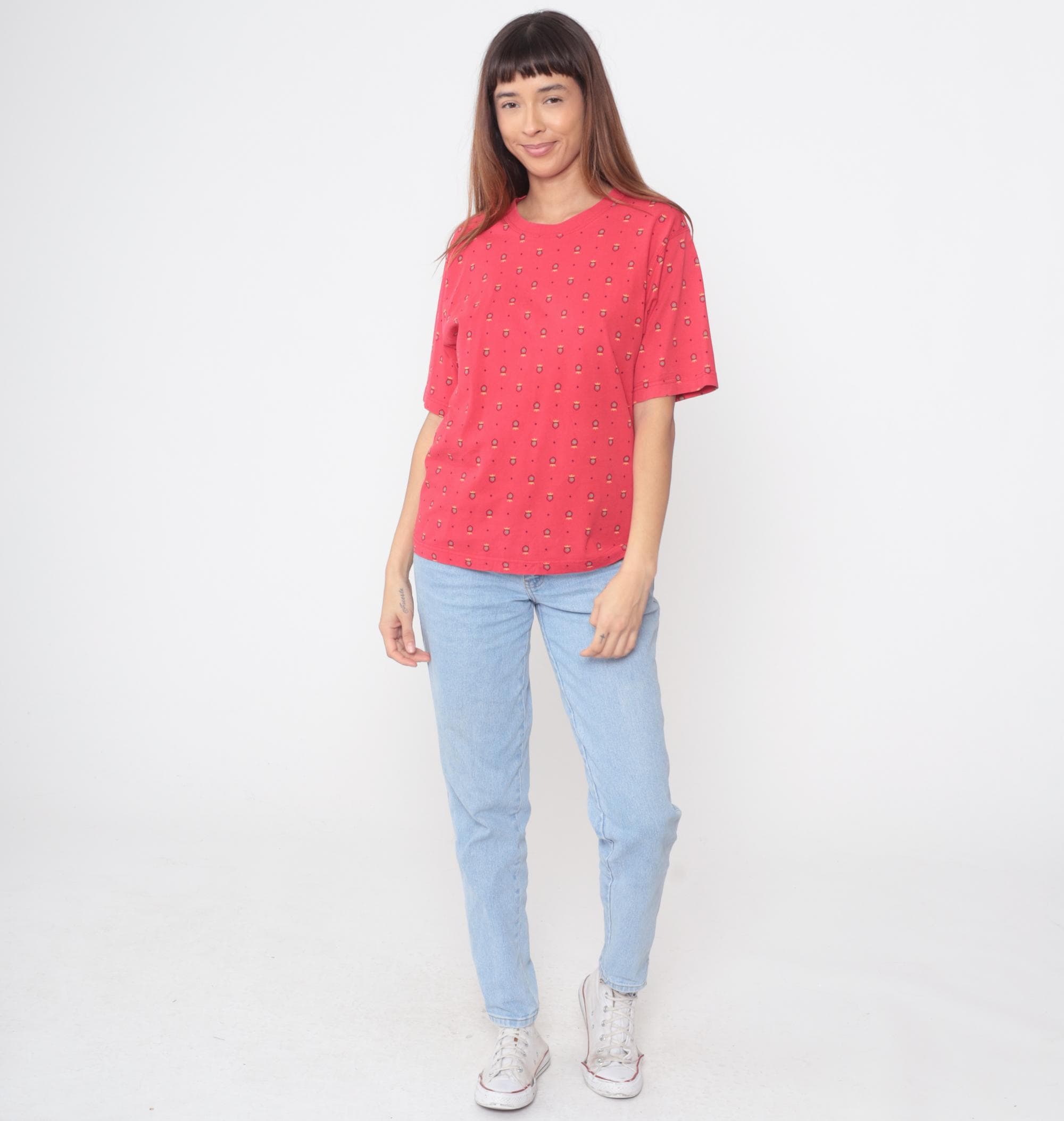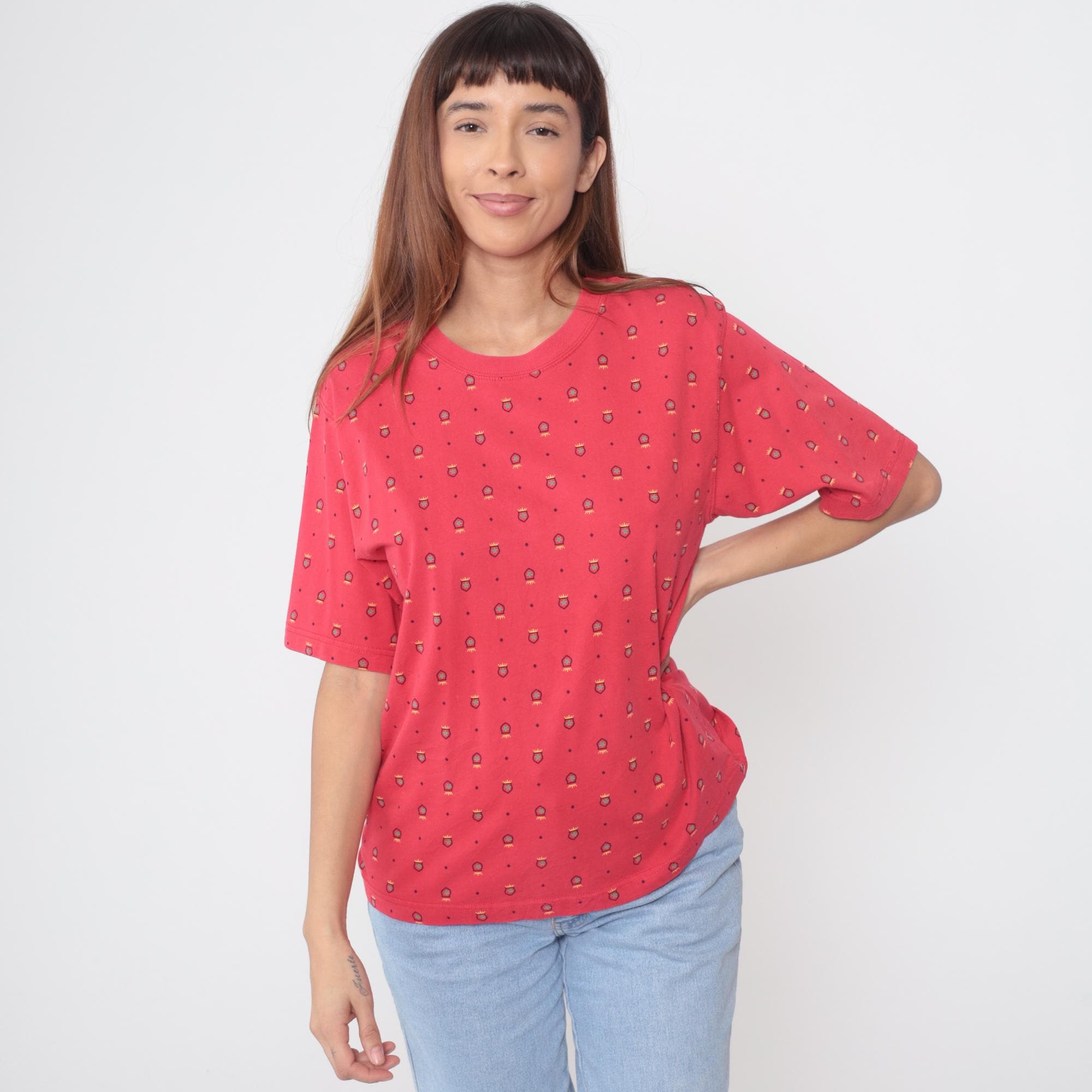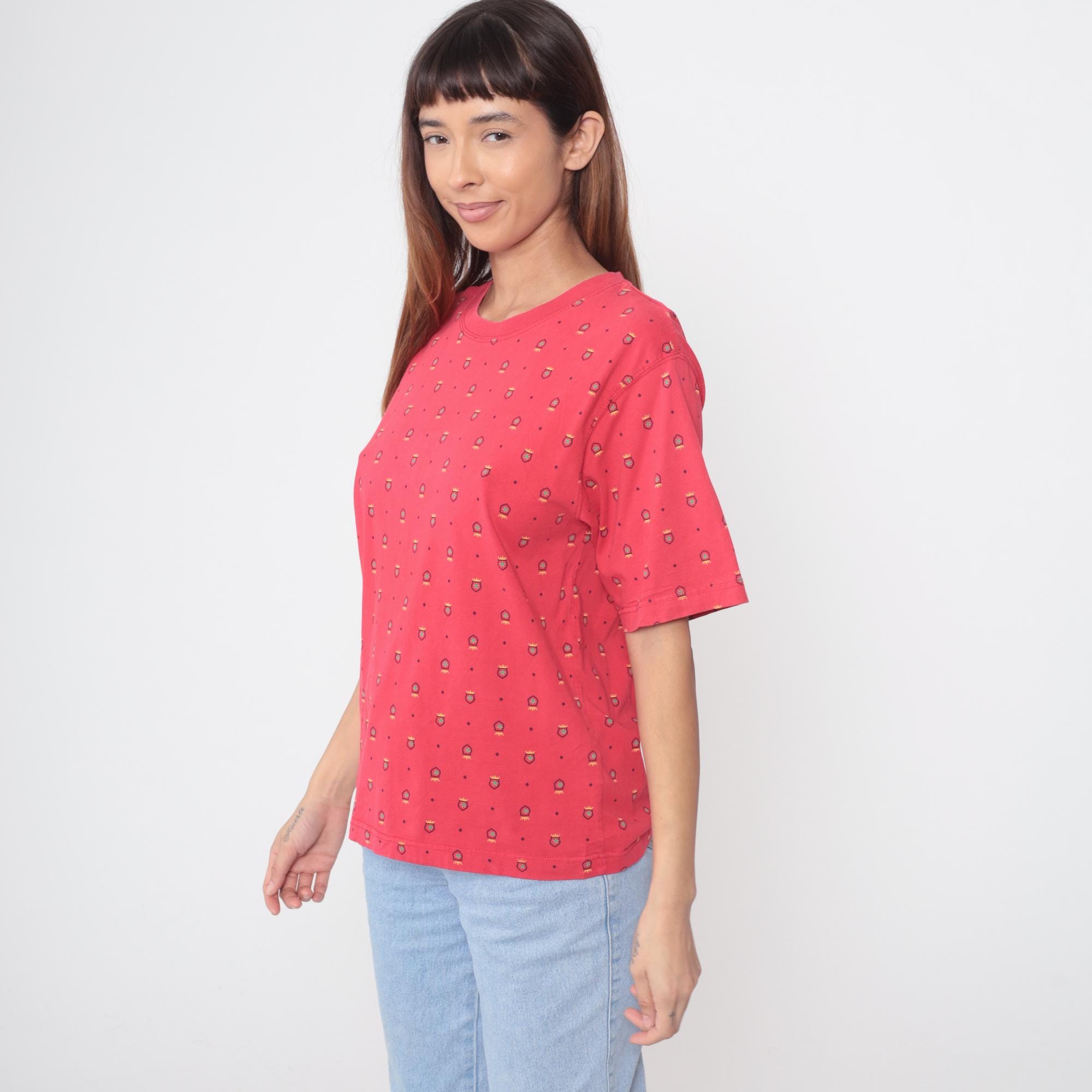 90s Talbot's red t-shirt featuring all-over print of decorative shield crests with crowns and small diamond shapes. Classic crew neck with short sleeves.