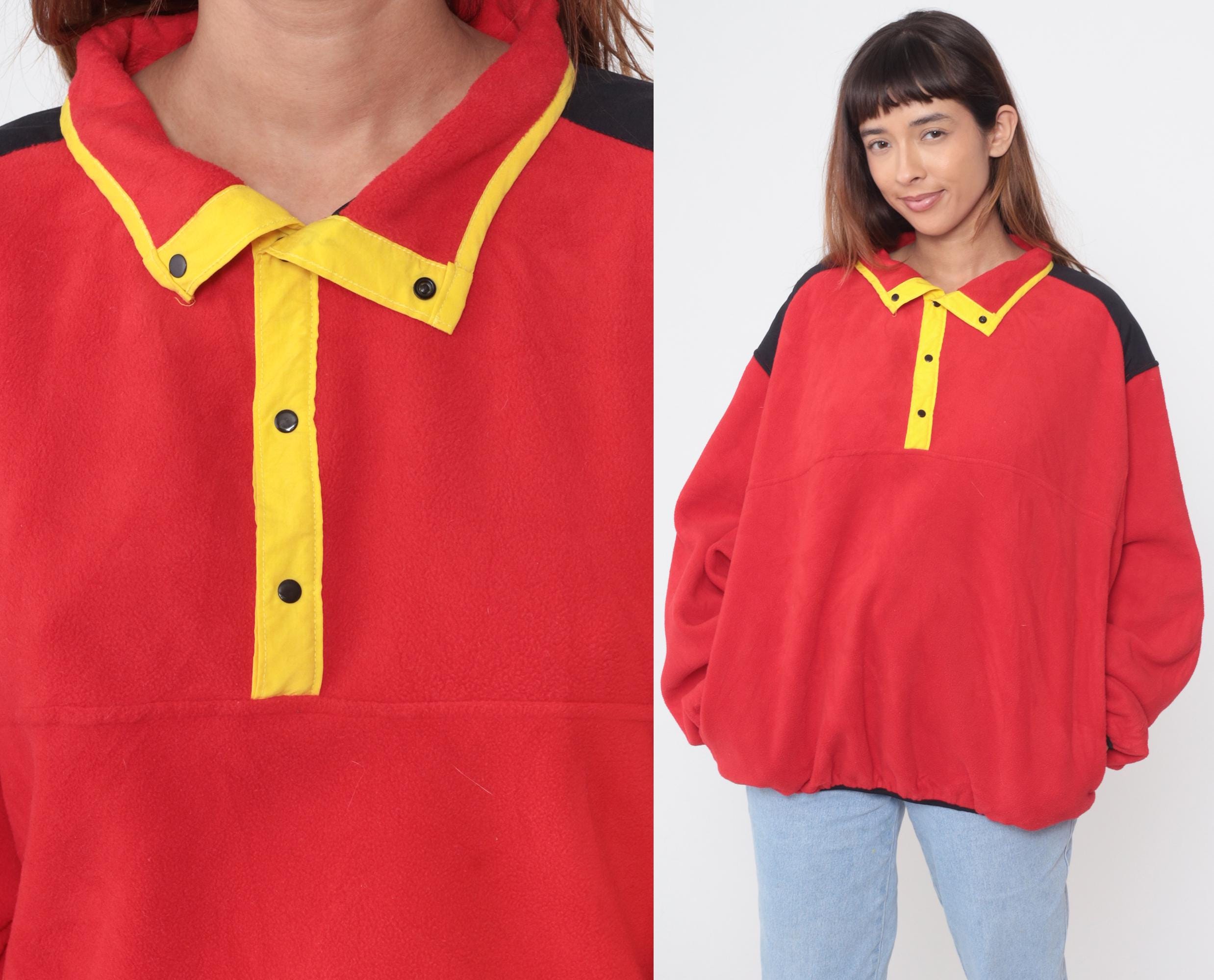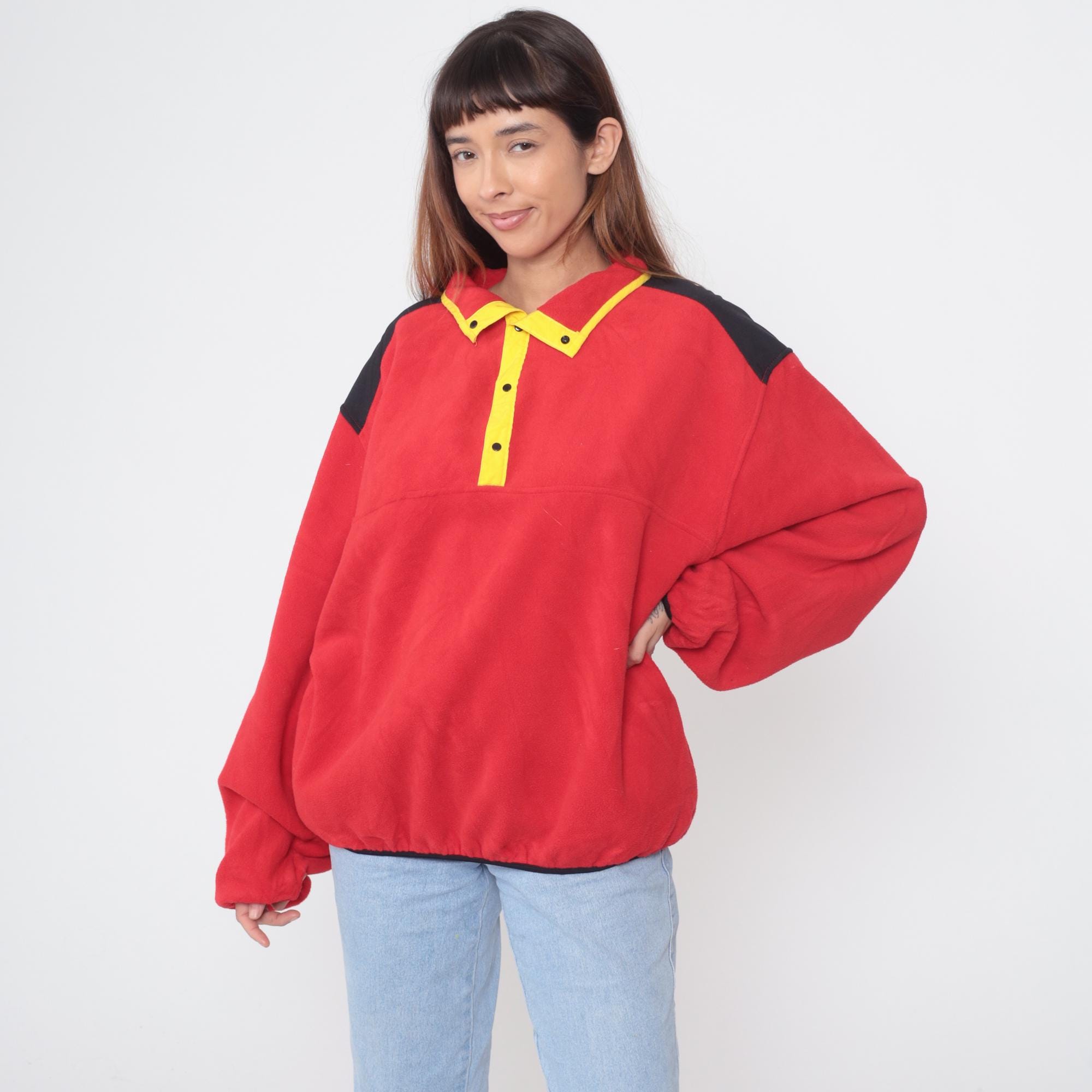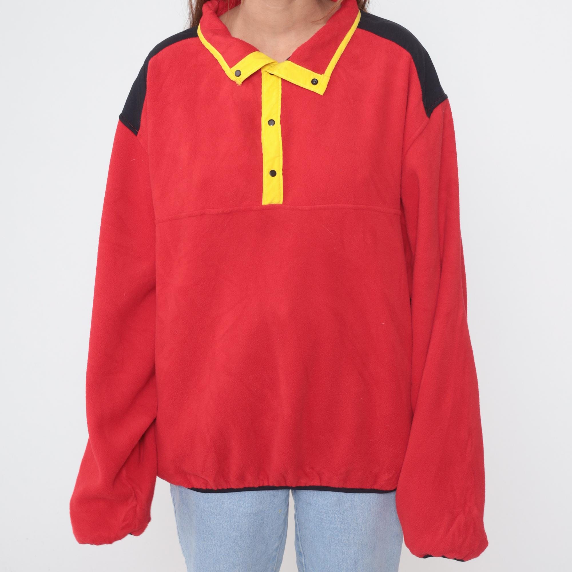 90s Marlboro Adventure Team fleece pullover. Vibrant red with black shoulder panels and bright yellow snap placket collar. Features four black snap buttons at the asymmetrical collar. Elastic hem for fitted silhouette.
