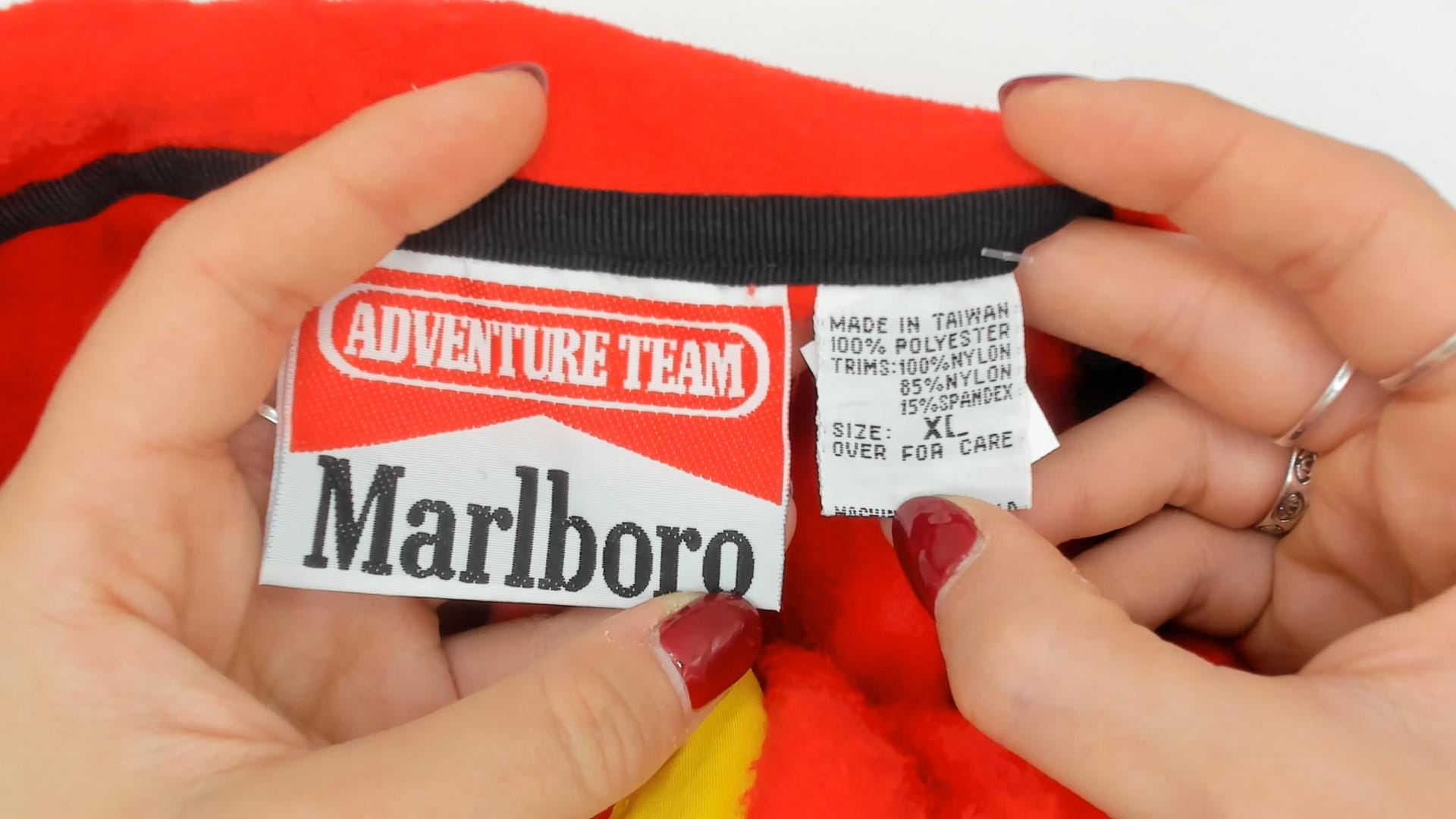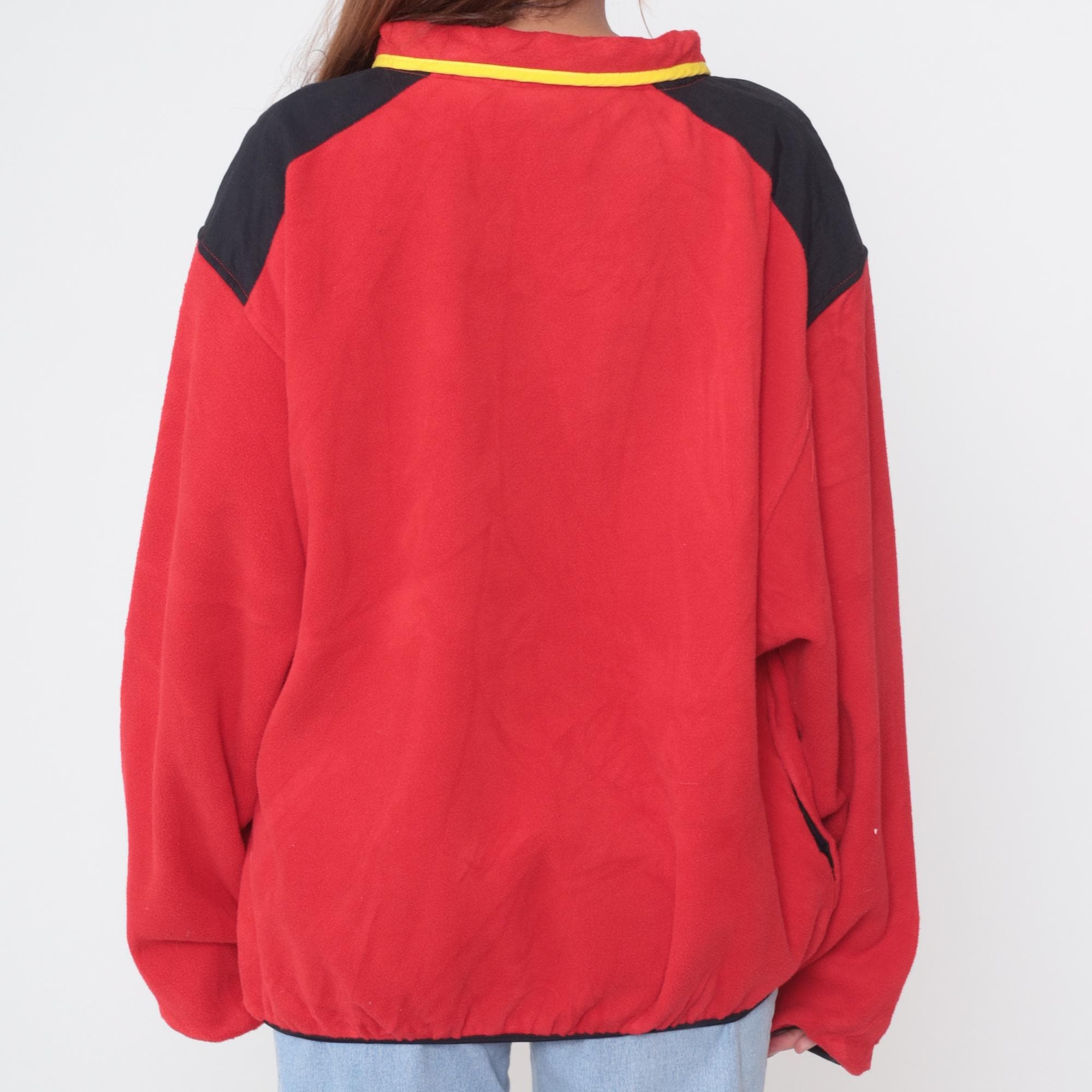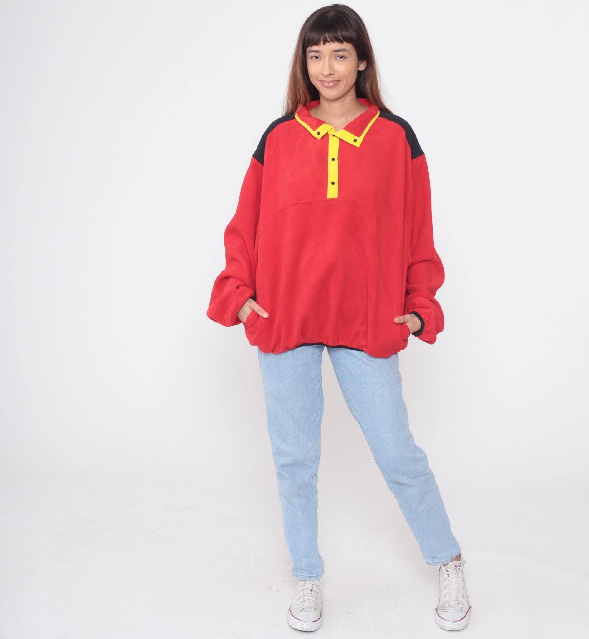 90s Marlboro Adventure Team fleece pullover. Vibrant red with black shoulder panels and bright yellow snap placket collar. Features four black snap buttons at the asymmetrical collar. Elastic hem for fitted silhouette.