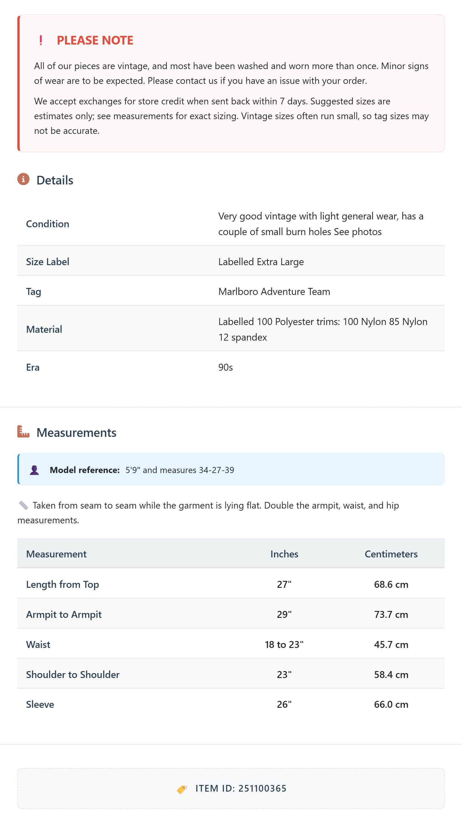 All of our pieces are vintage, and most have been washed and worn more than once. Minor signs of wear are to be expected. Please contact us if you have an issue with your order. We accept exchanges for store credit when sent back within 7 days.