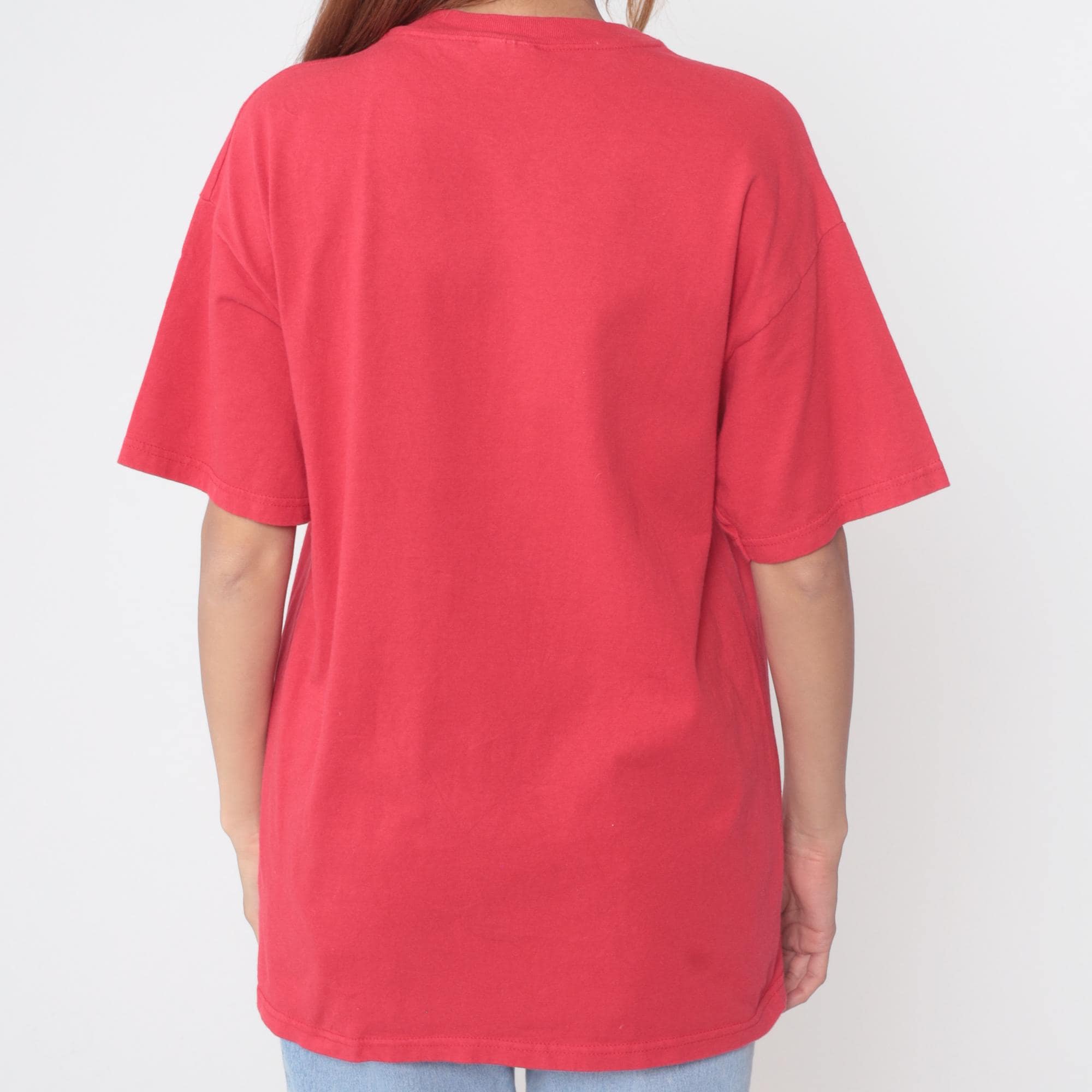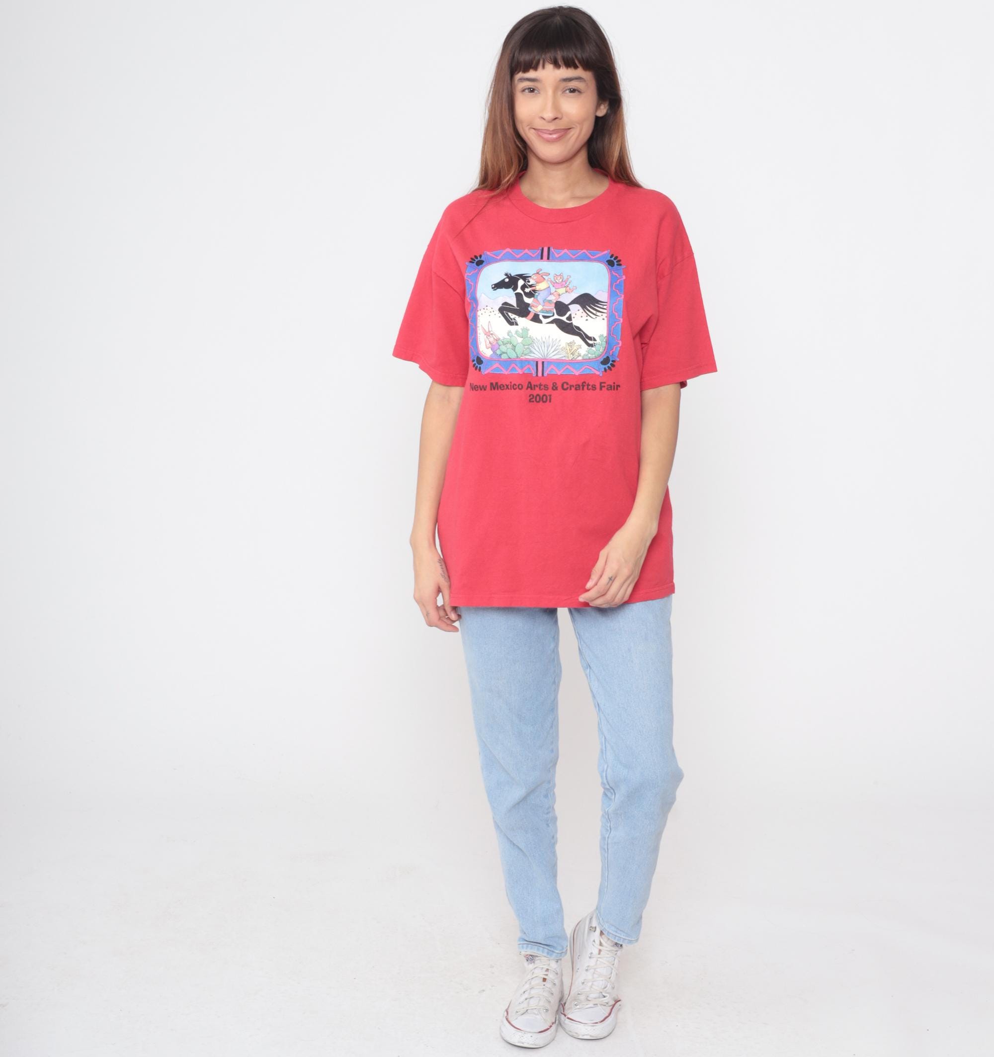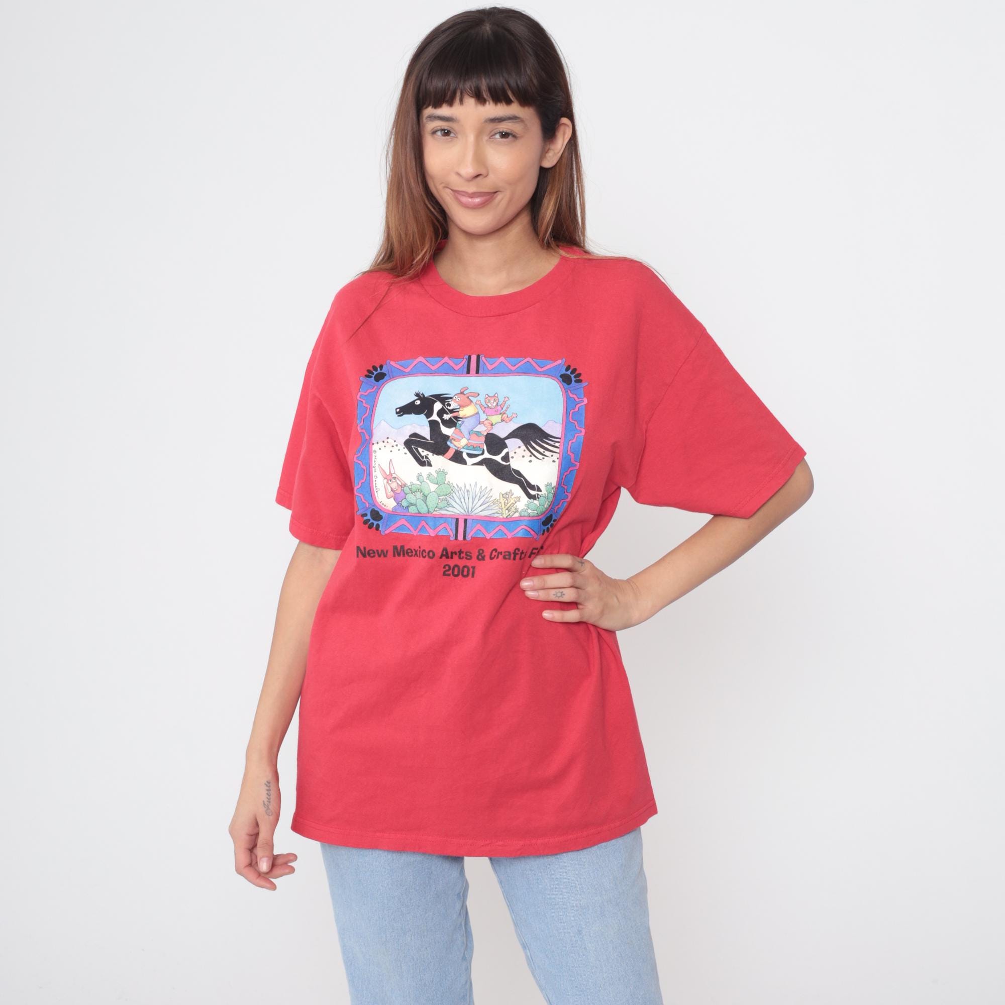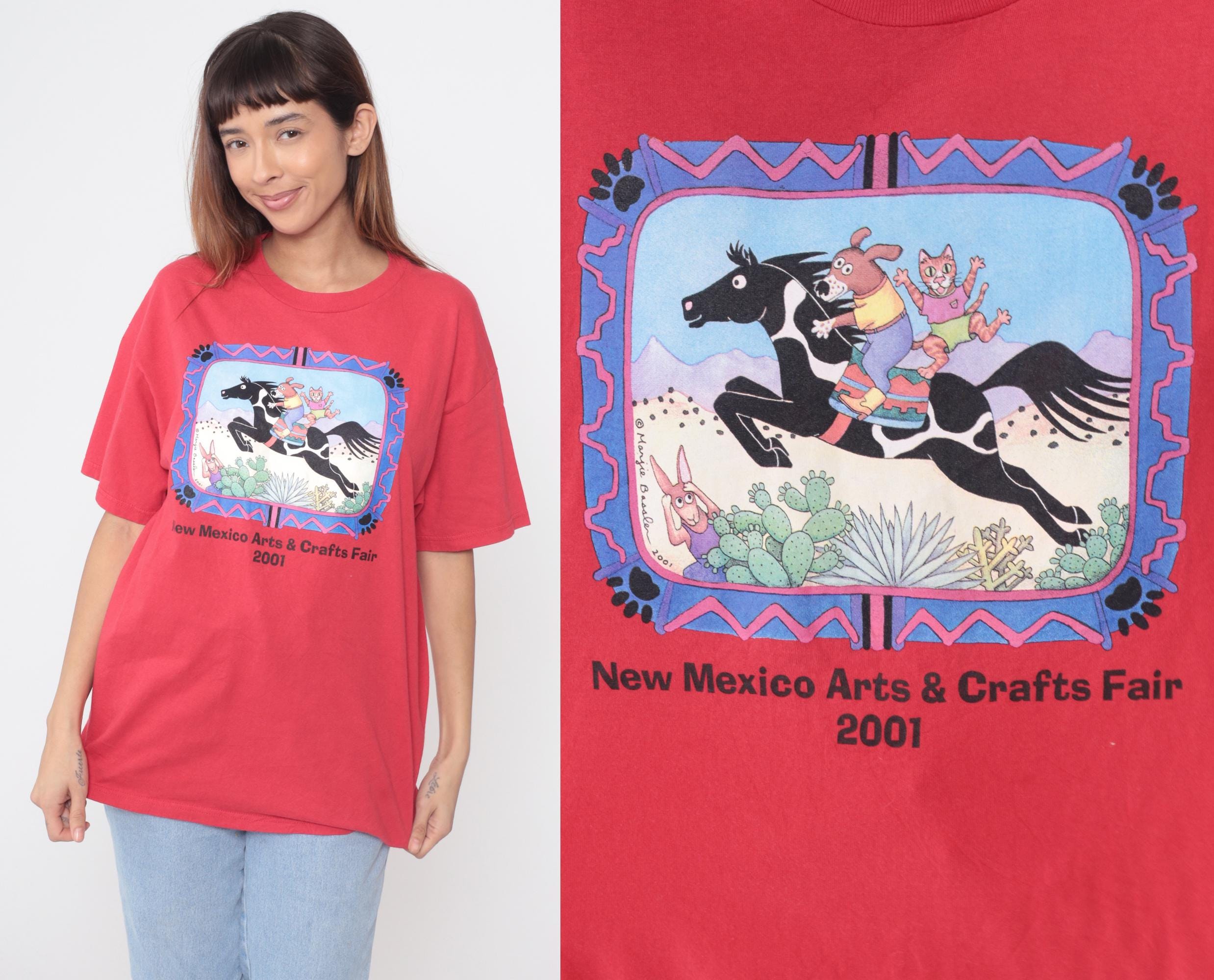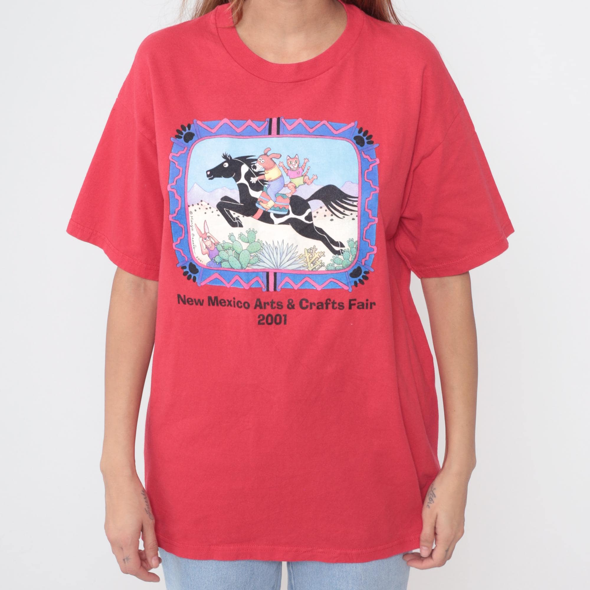 Vintage 2001 New Mexico Arts & Crafts Fair t-shirt featuring colorful southwest folk art illustration. Vibrant red heavyweight cotton with blue-bordered graphic showing black and white horse carrying cartoon animals (rabbit and cat) through desert landscape with cacti. Classic crew neck with short sleeves and straight hem.