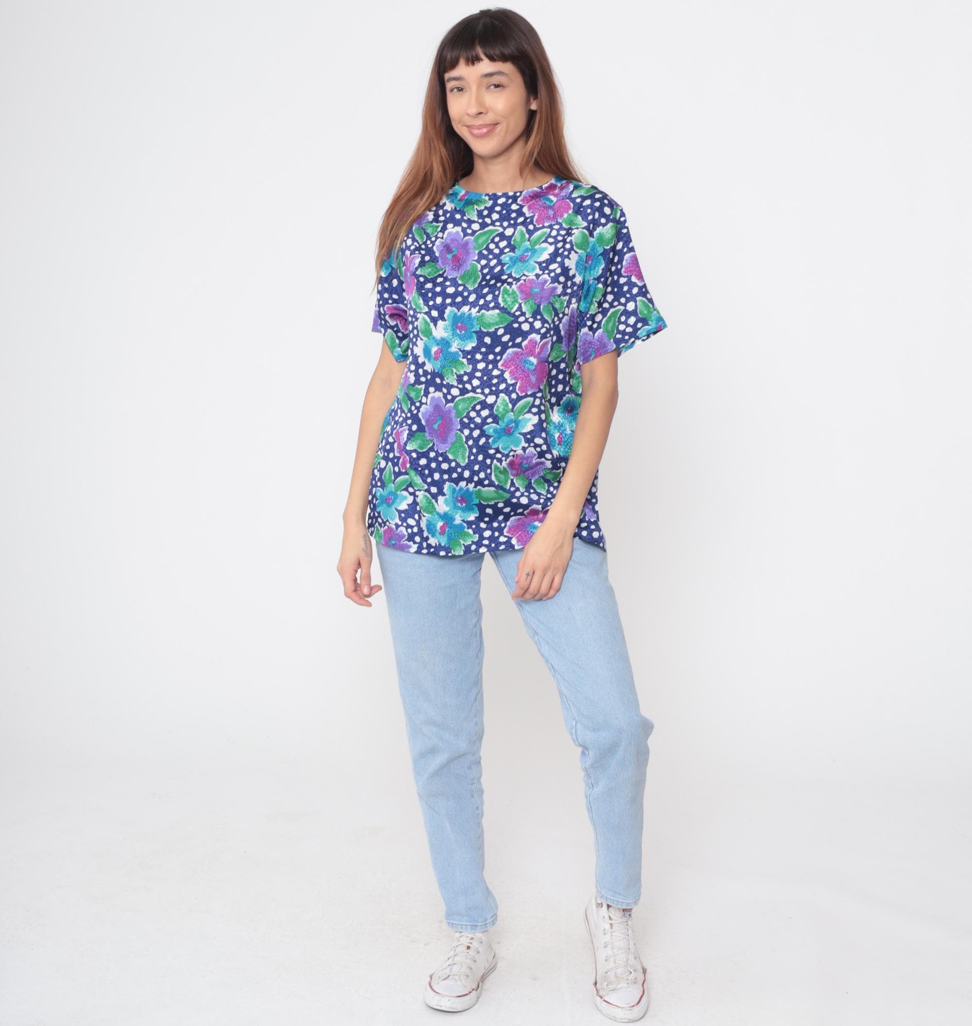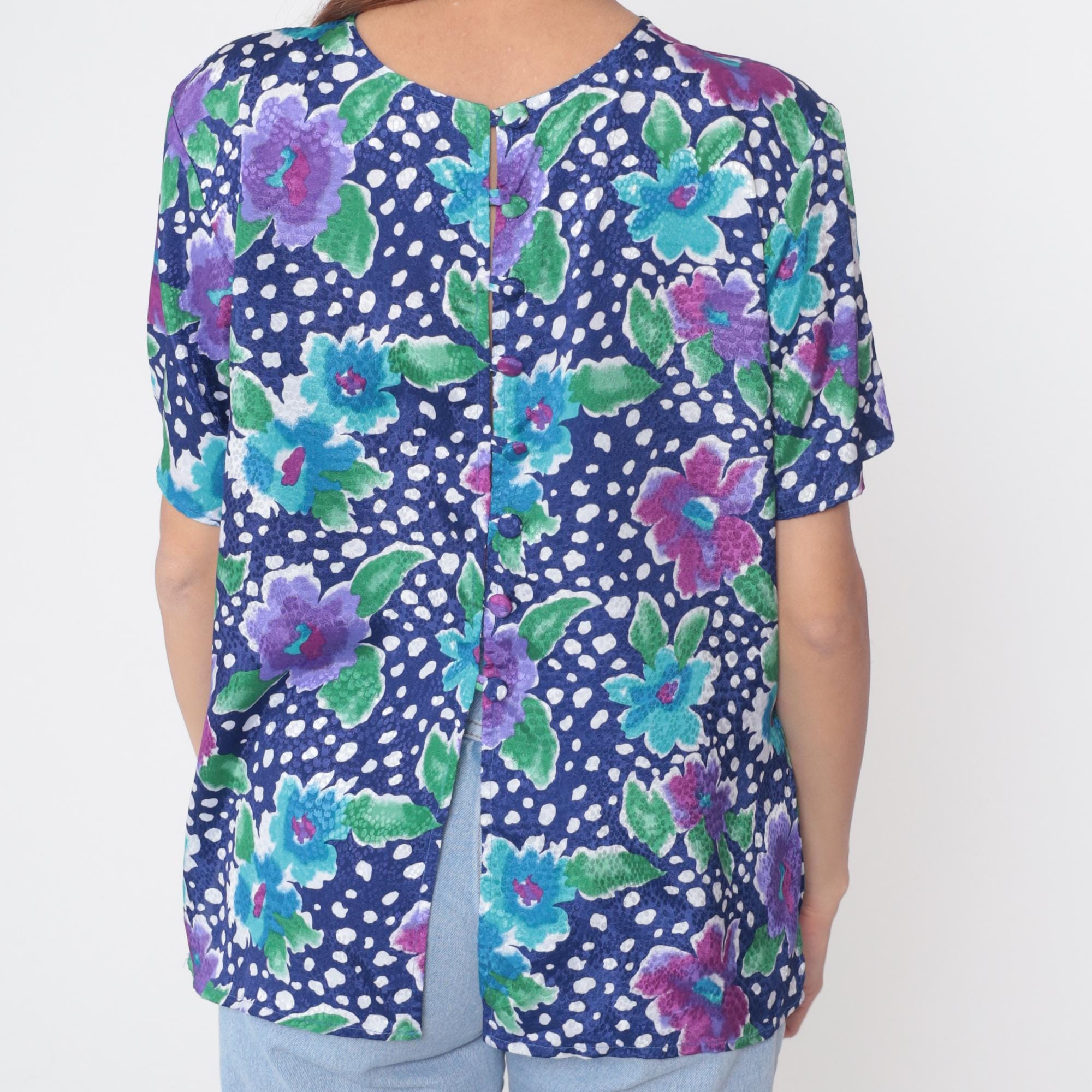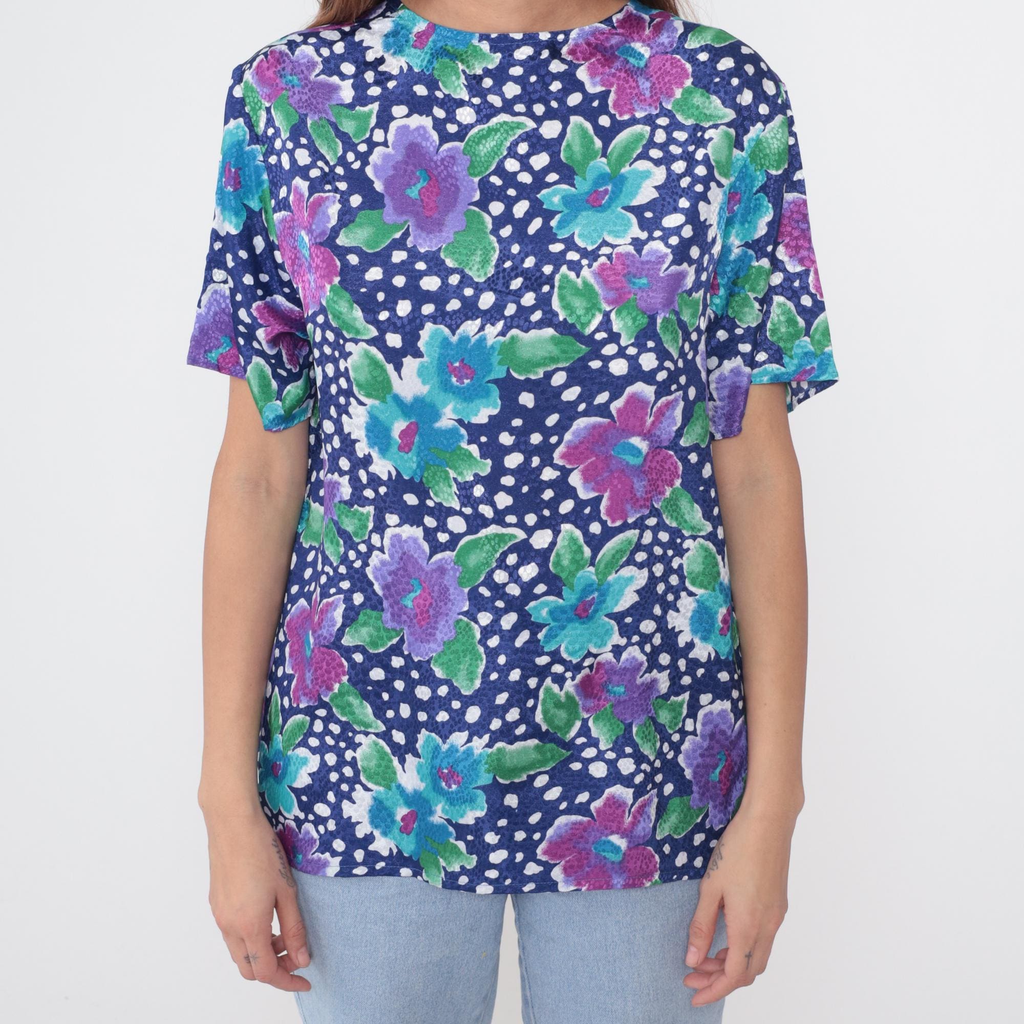 90s navy blue blouse from Sybil California featuring a striking combination of white polka dots with watercolor-style floral overlay. Bold flowers in purple, teal, and green create a vibrant jewel-tone palette against the navy background.