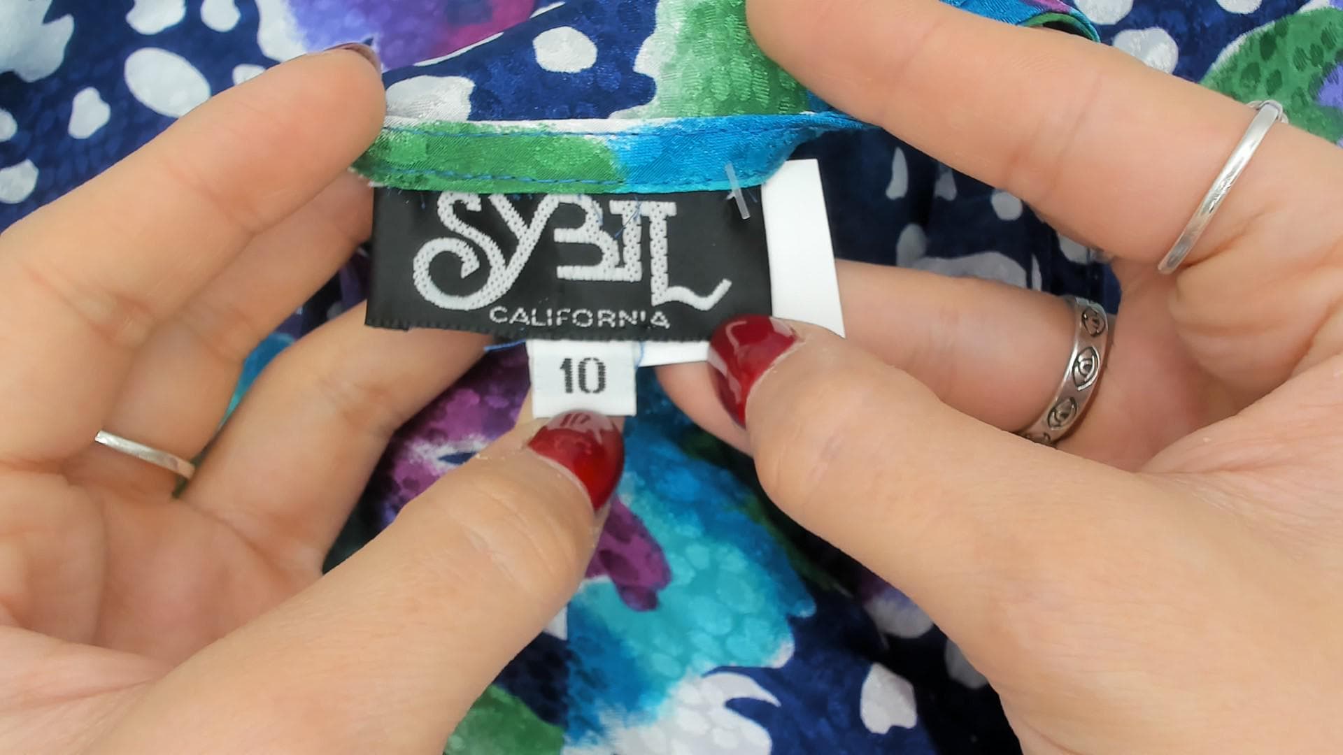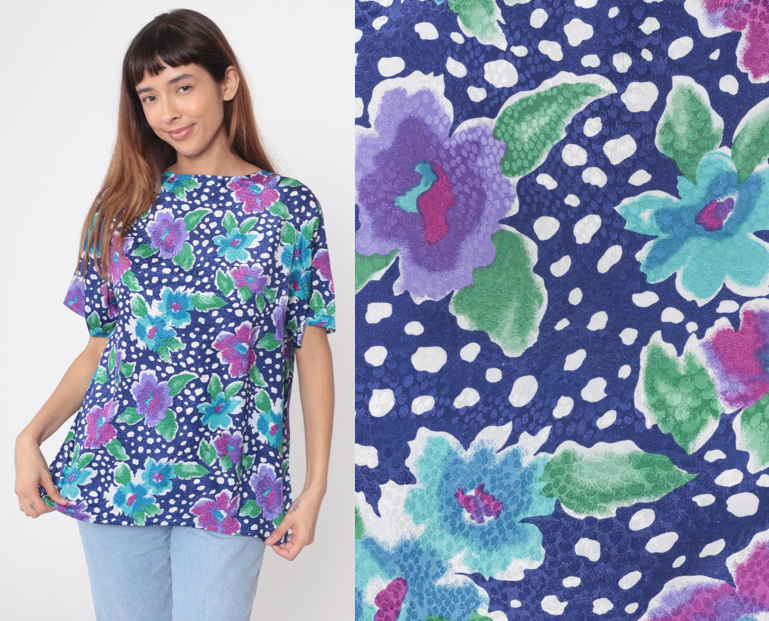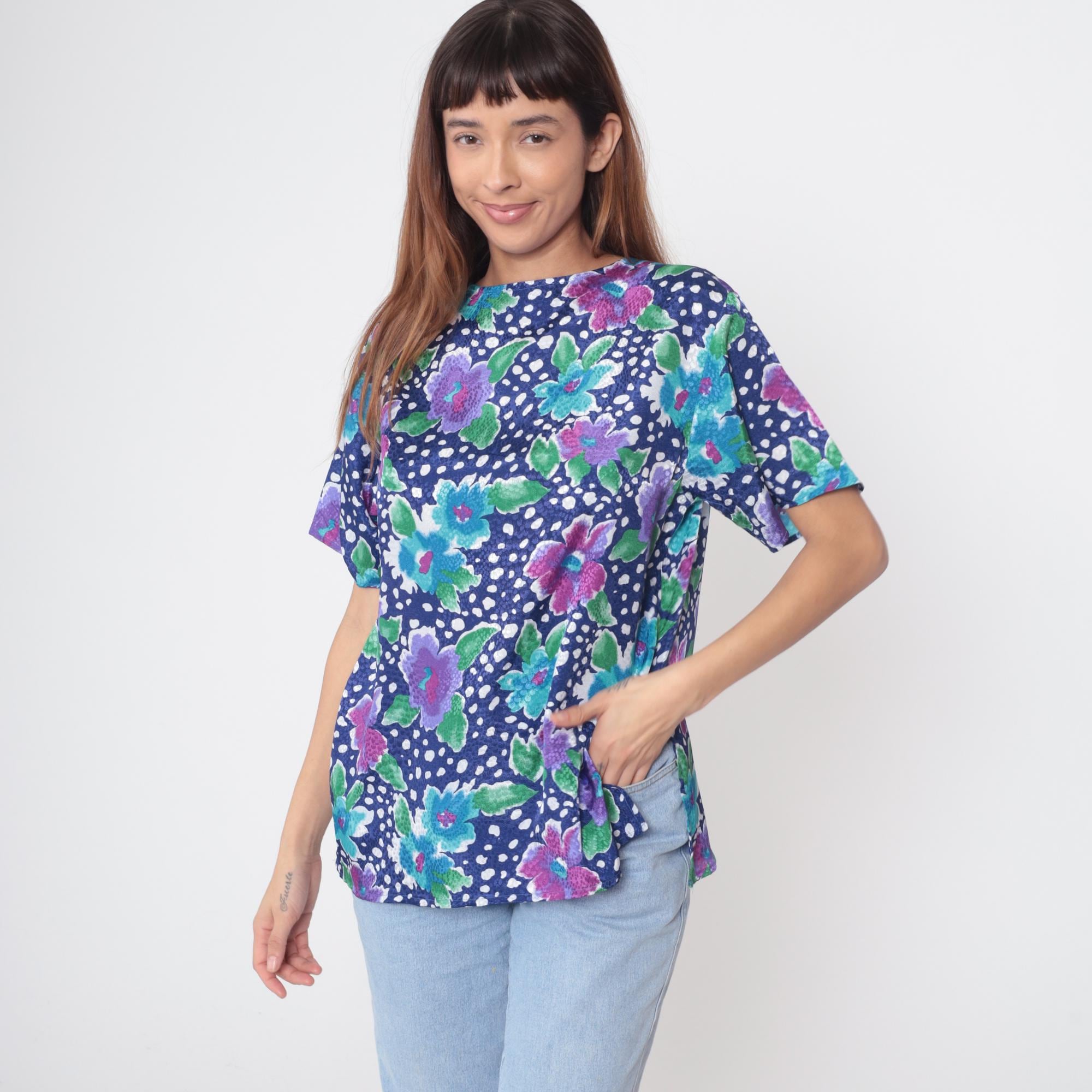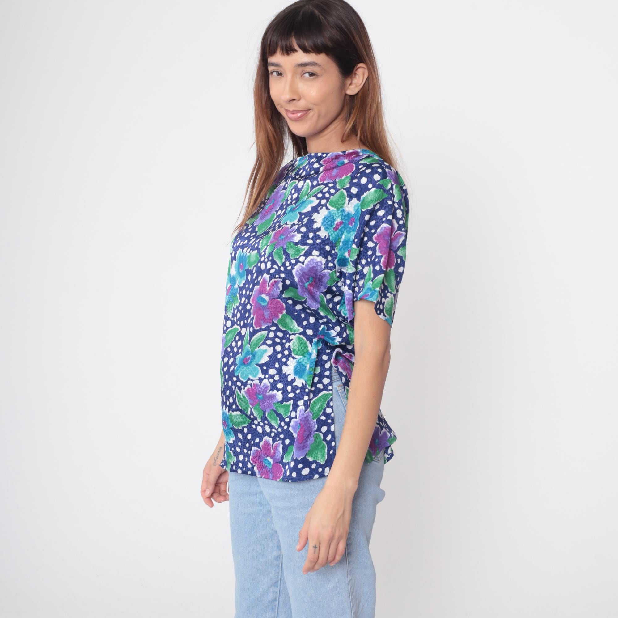 90s navy blue blouse from Sybil California featuring a striking combination of white polka dots with watercolor-style floral overlay. Bold flowers in purple, teal, and green create a vibrant jewel-tone palette against the navy background.