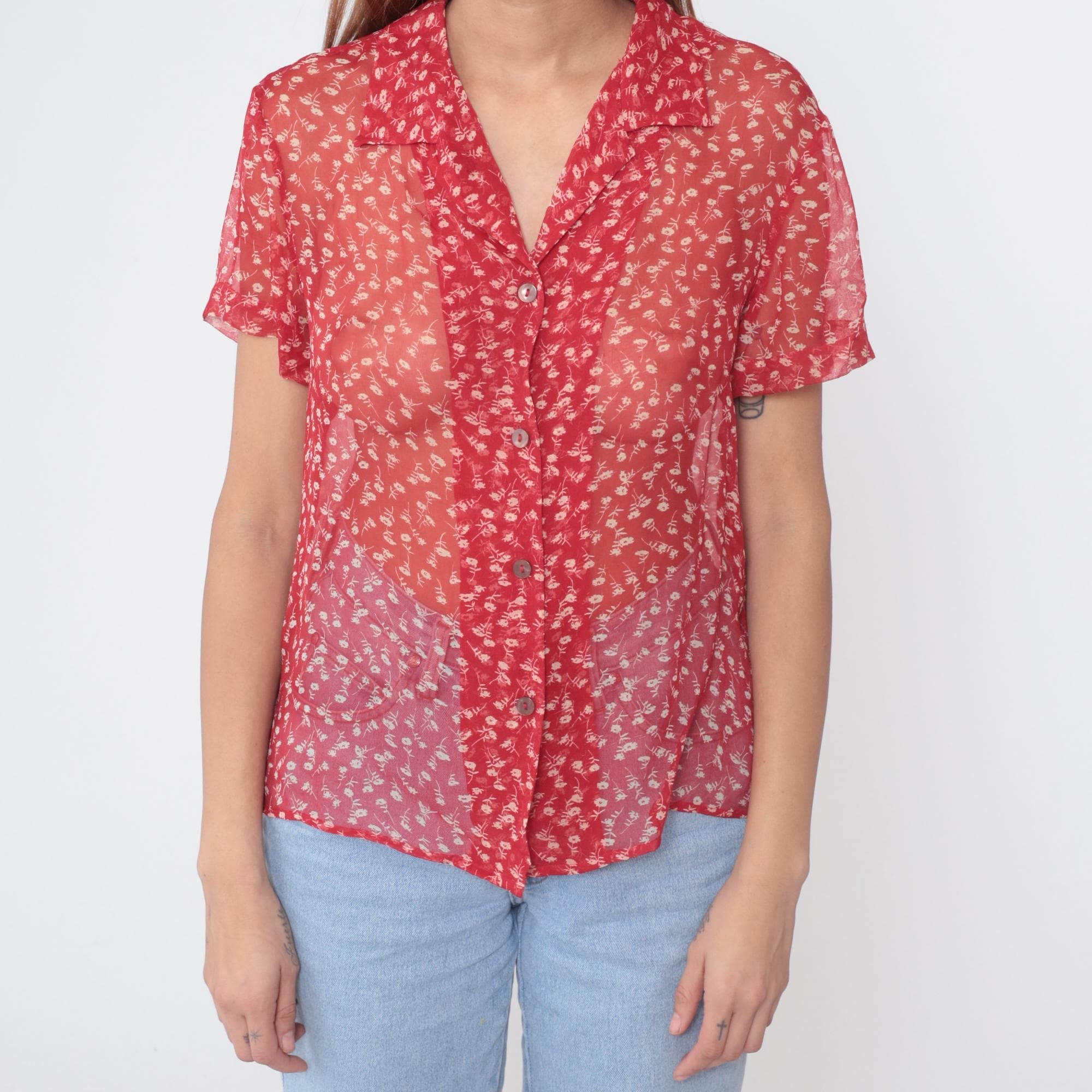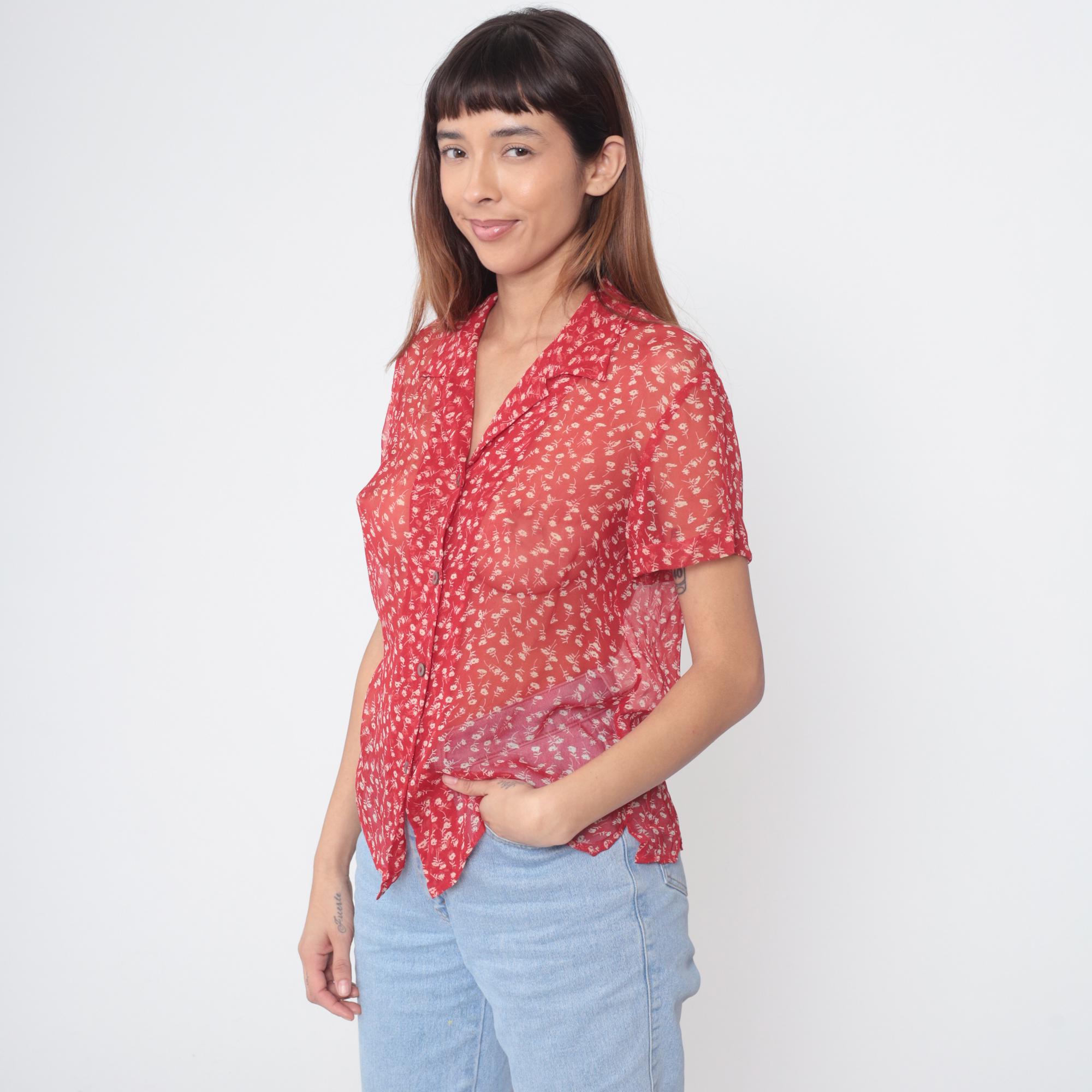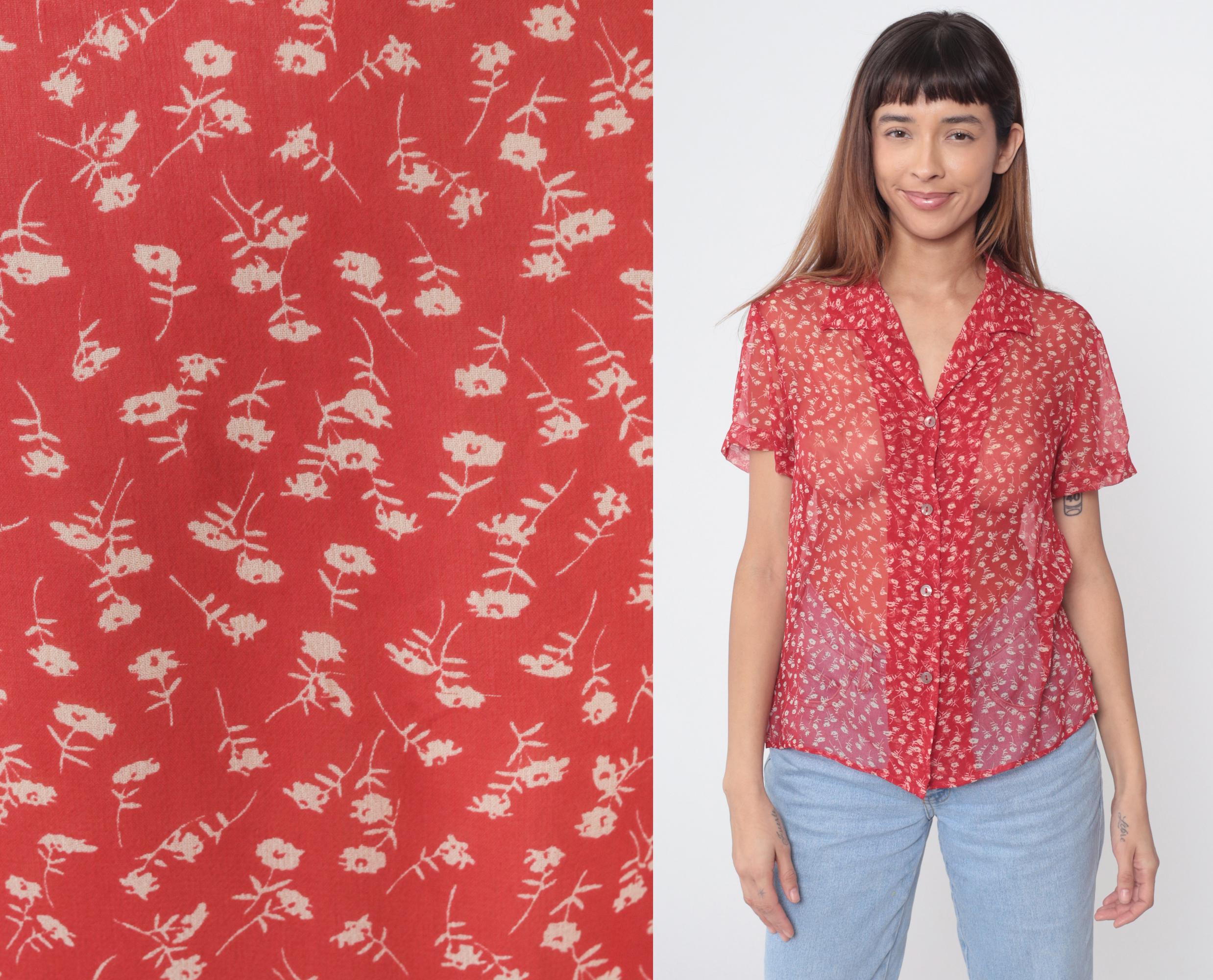 90s red silk blouse by Robbie Bee featuring a delicate white floral ditsy print throughout. Lightweight sheer silk fabric with excellent drape. Classic button-down design with pointed collar and full front closure with pearlescent buttons. Short sleeves with a slightly relaxed fit.