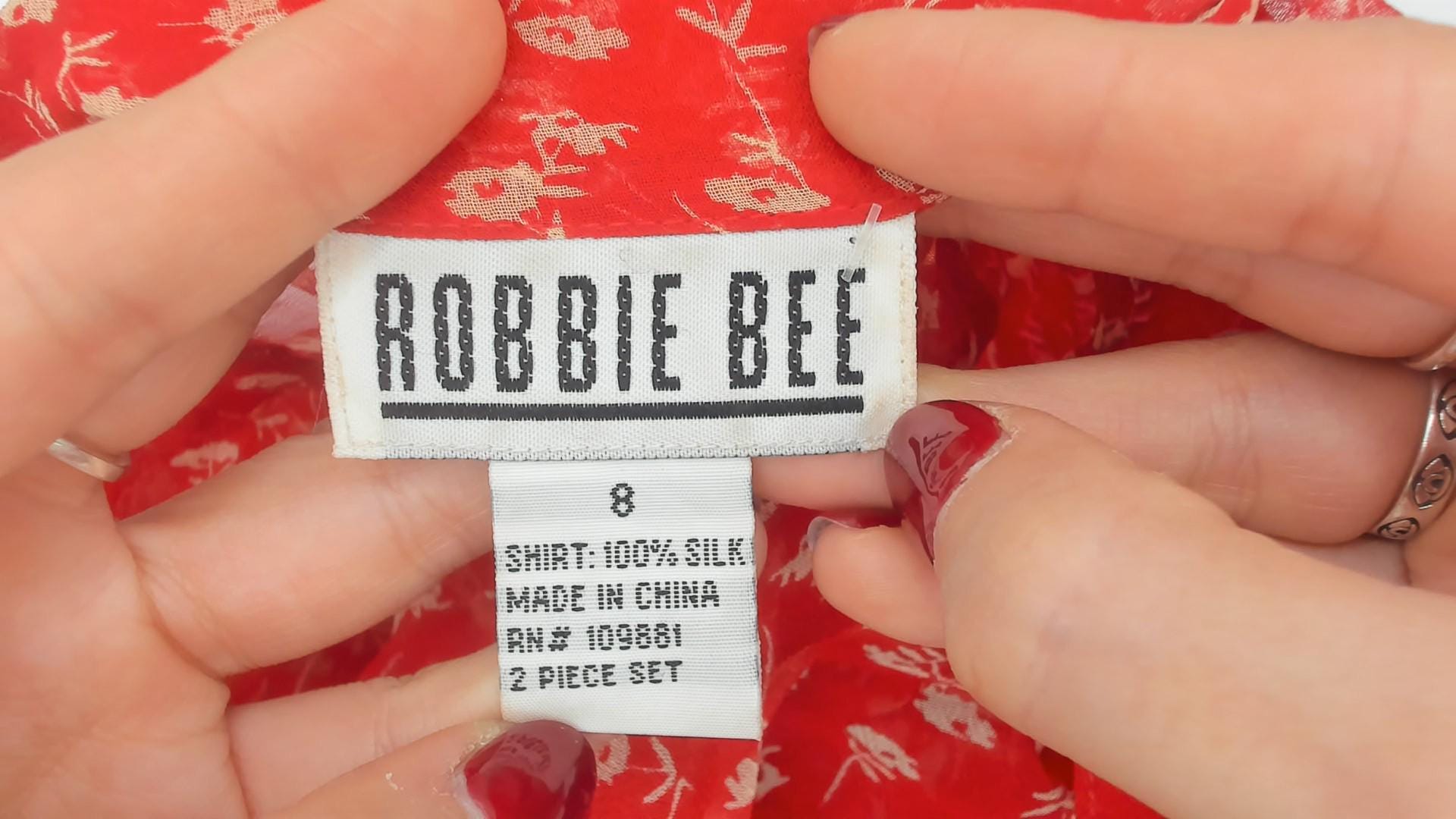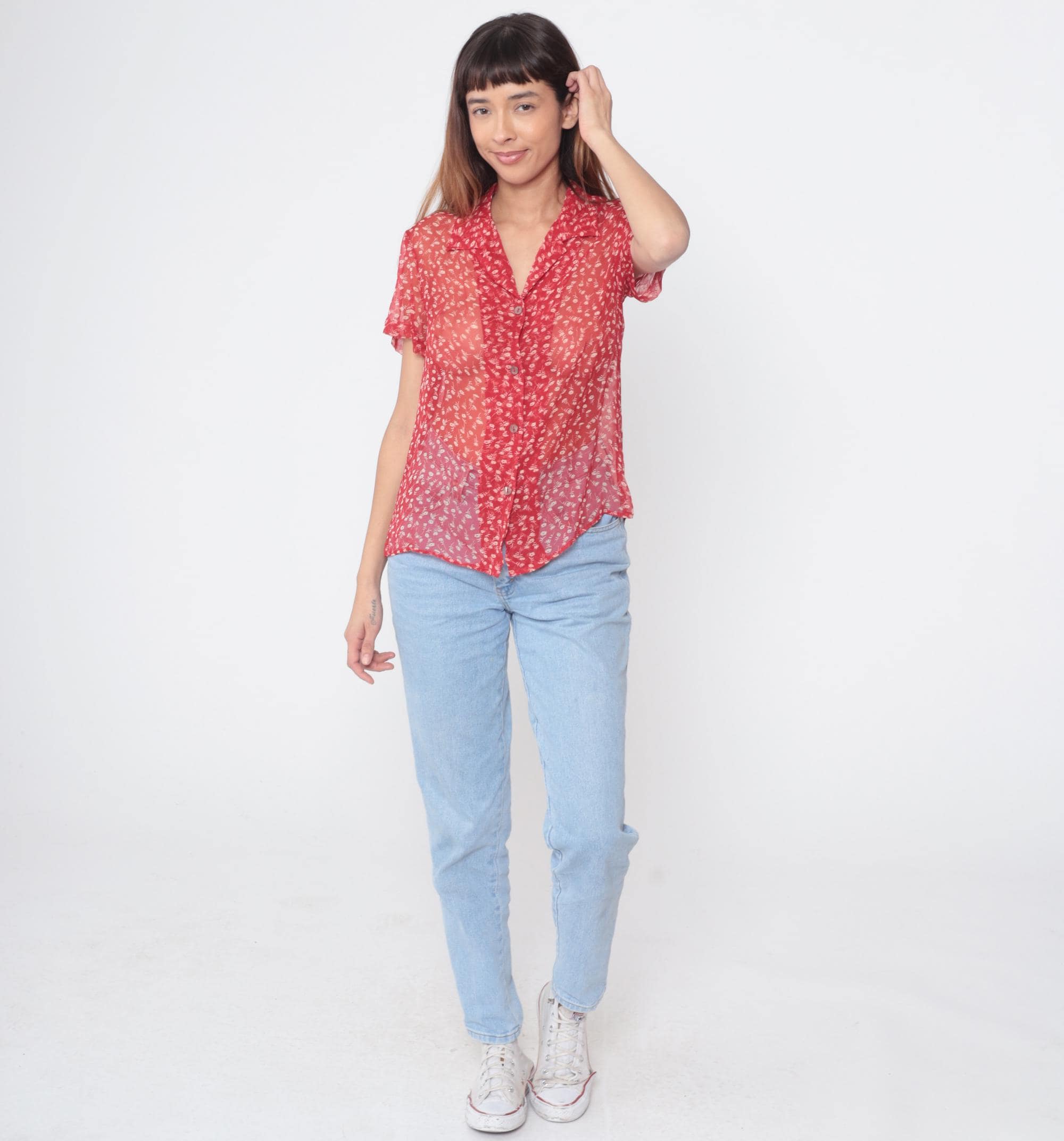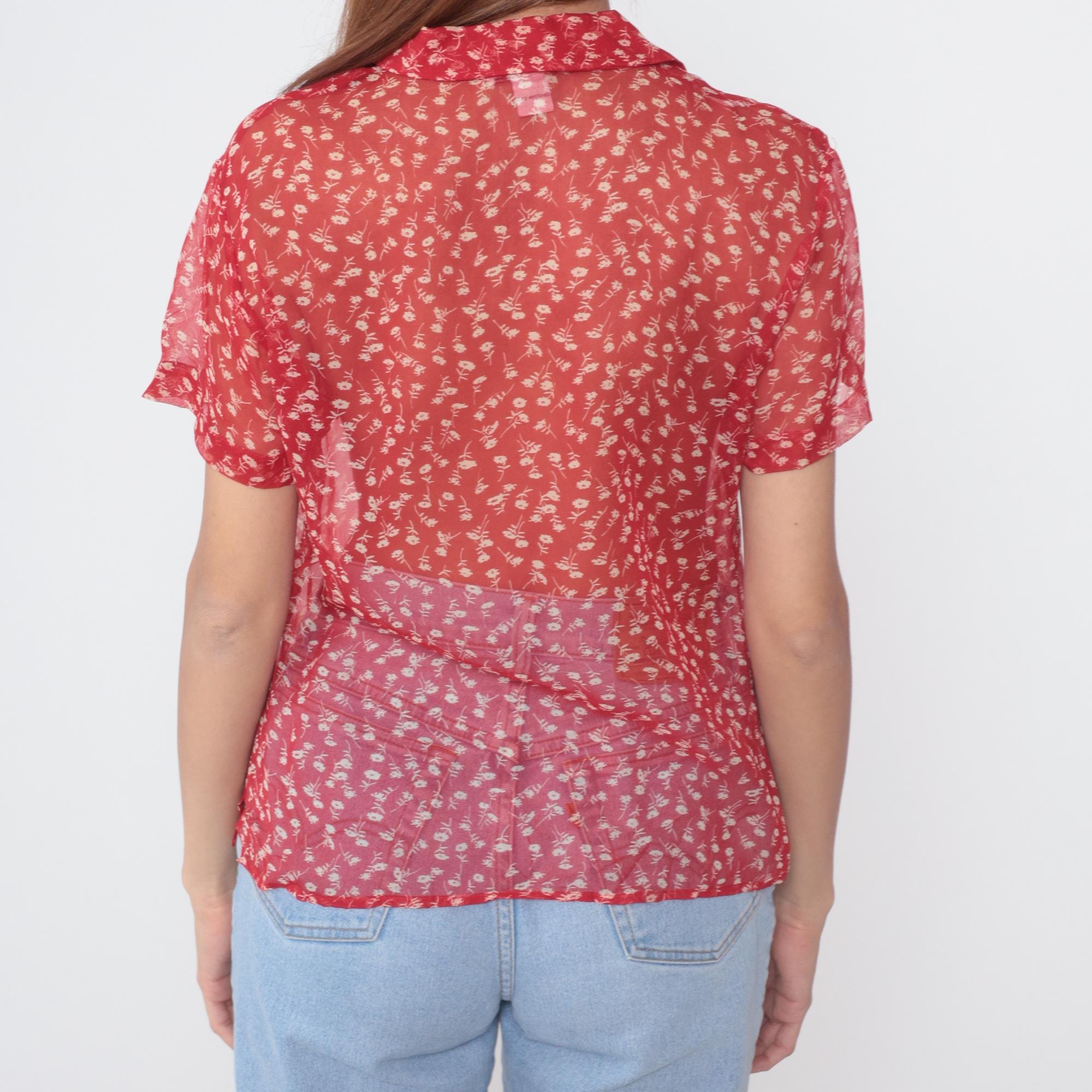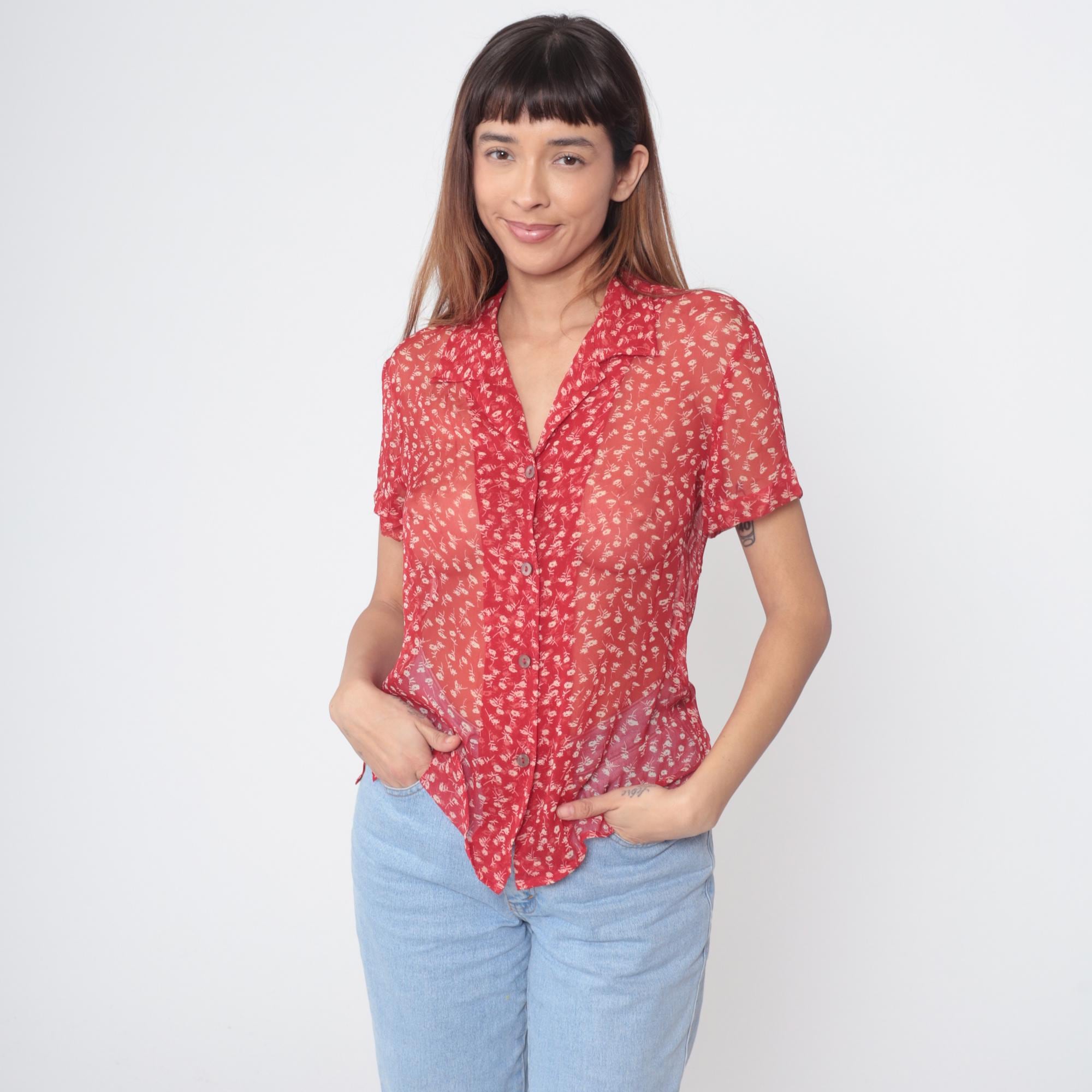90s red silk blouse by Robbie Bee featuring a delicate white floral ditsy print throughout. Lightweight sheer silk fabric with excellent drape. Classic button-down design with pointed collar and full front closure with pearlescent buttons. Short sleeves with a slightly relaxed fit.