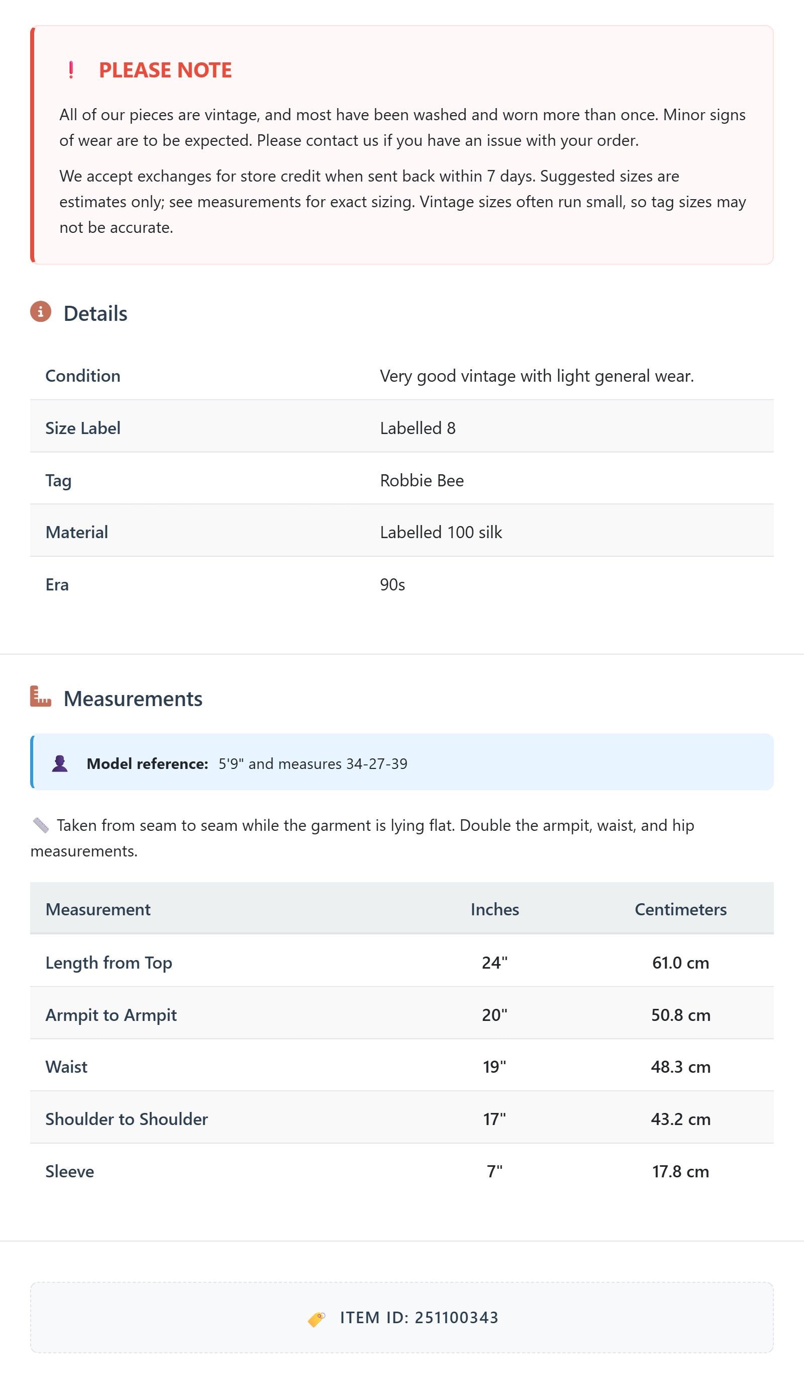Measurements are taken laying flat and should be doubled where applicable. The "best fits" size is just an estimate, and vintage sizing can vary from modern sizing. Please use measurements to ensure proper fit. The best thing to do is measure a similar item of your own, and compare. When an item has stretch, we will list the unstretched dimensions with the stretched measurement afterwards.