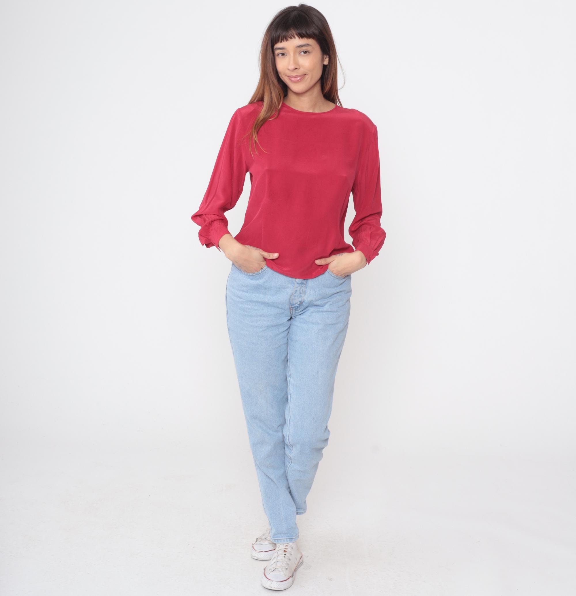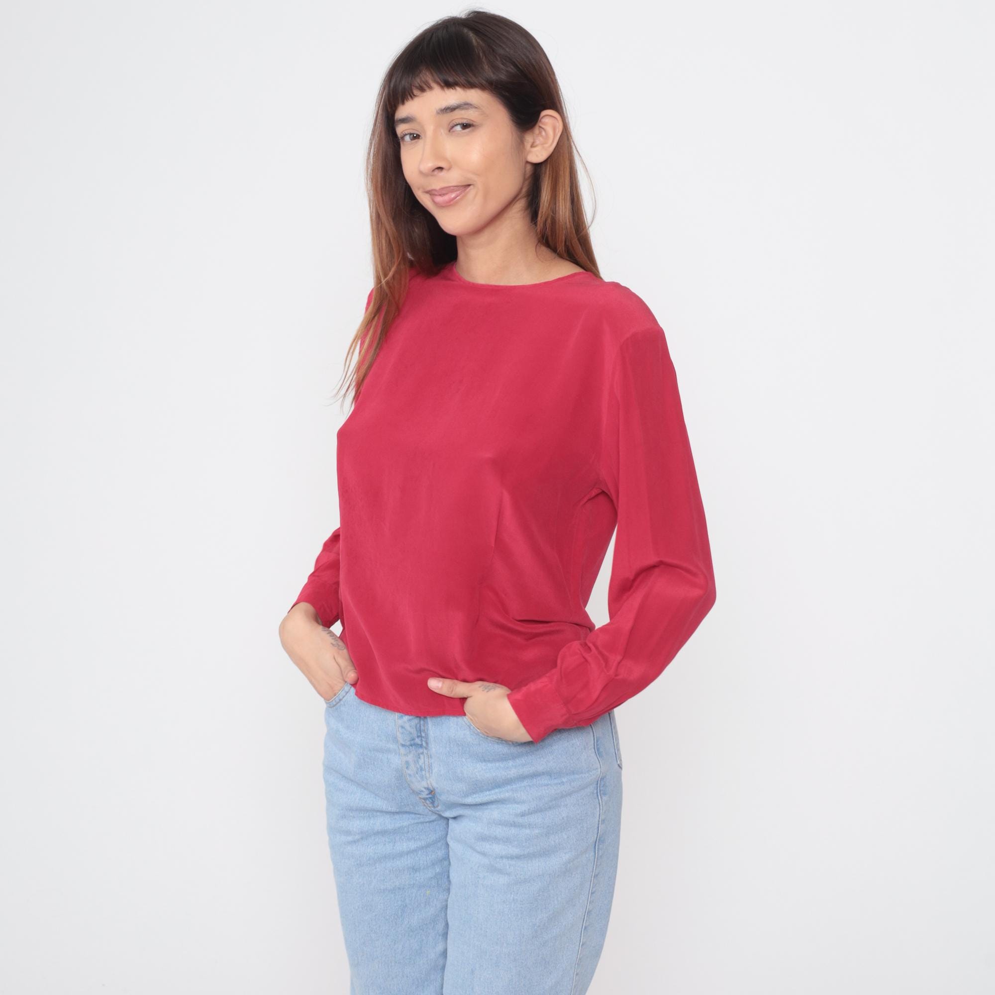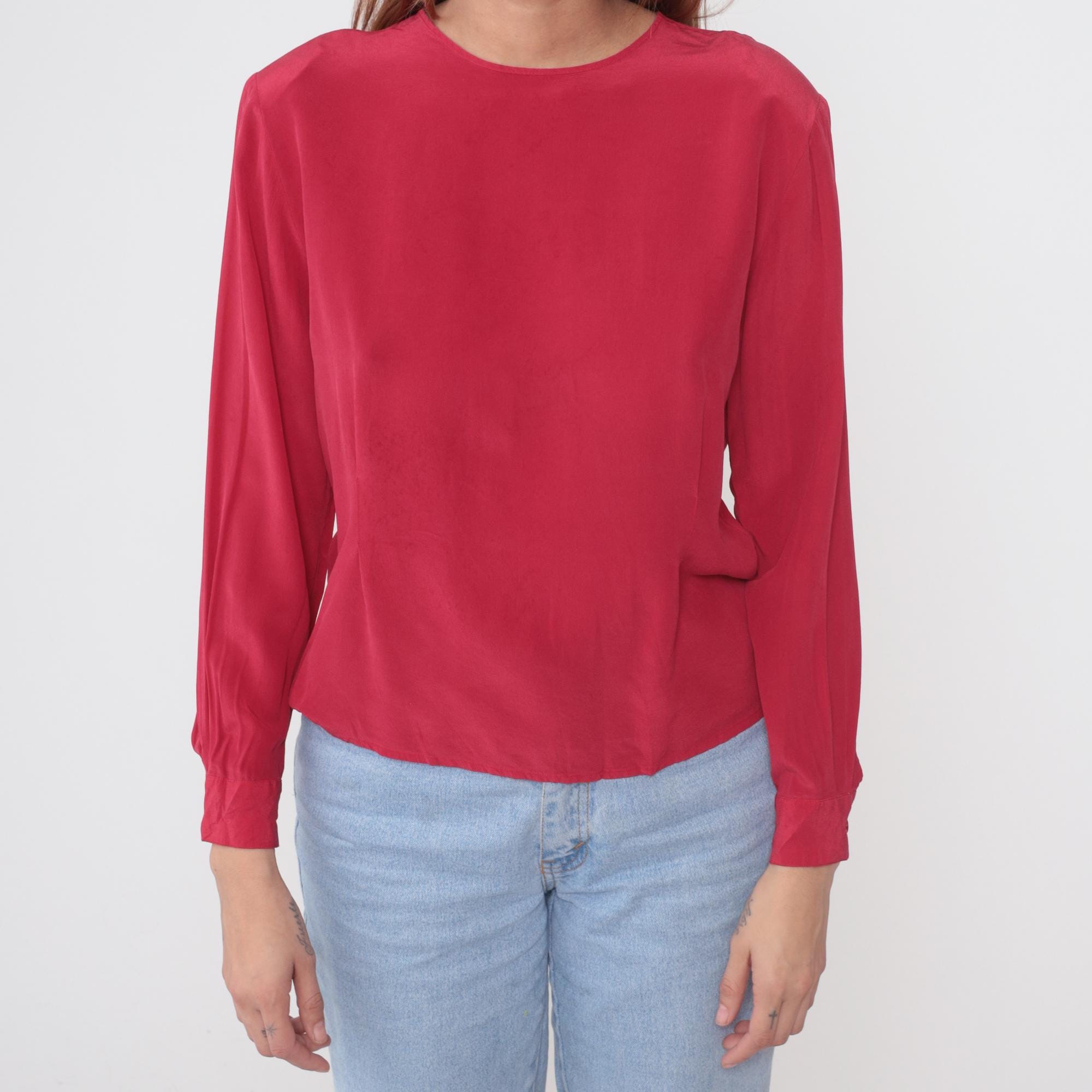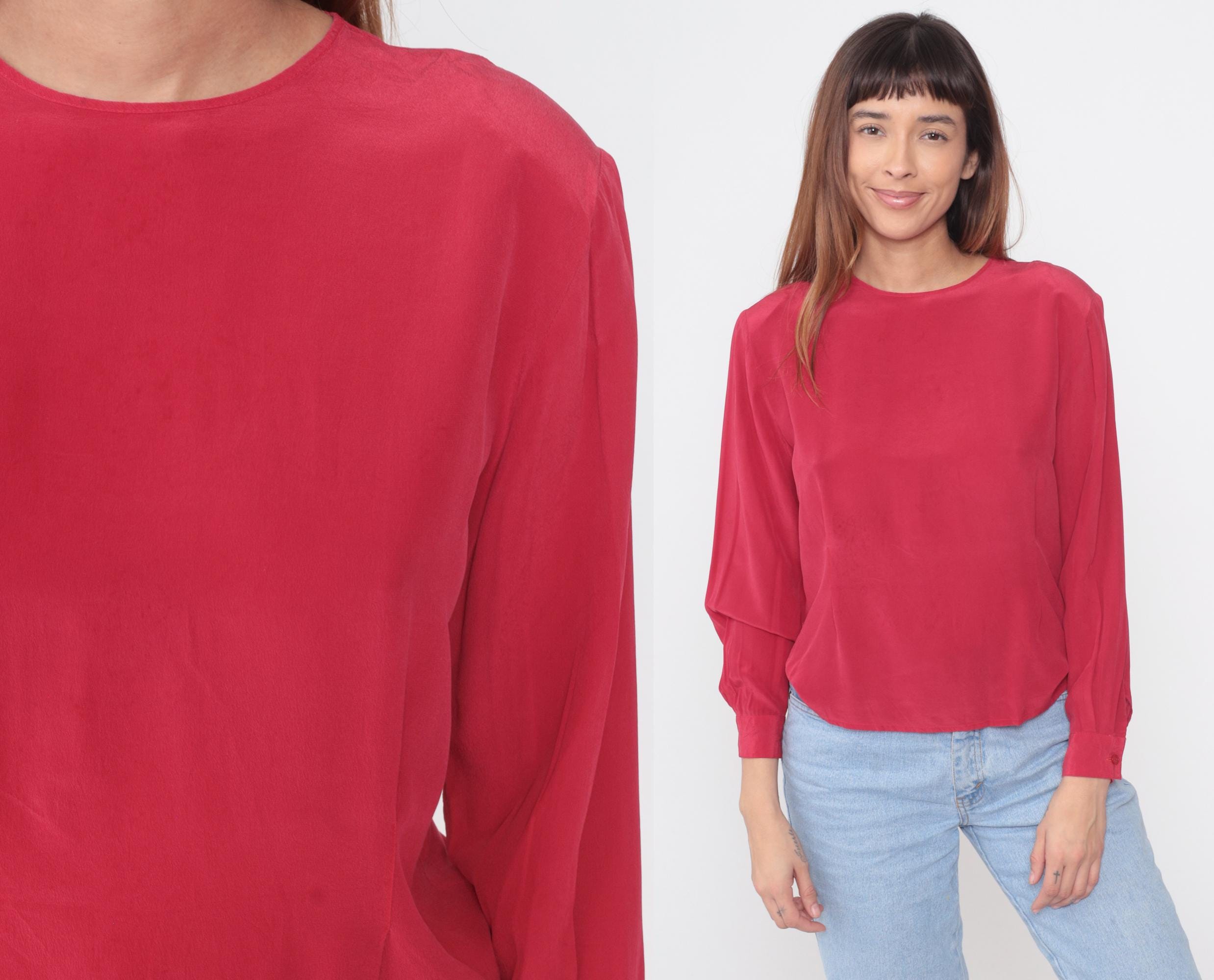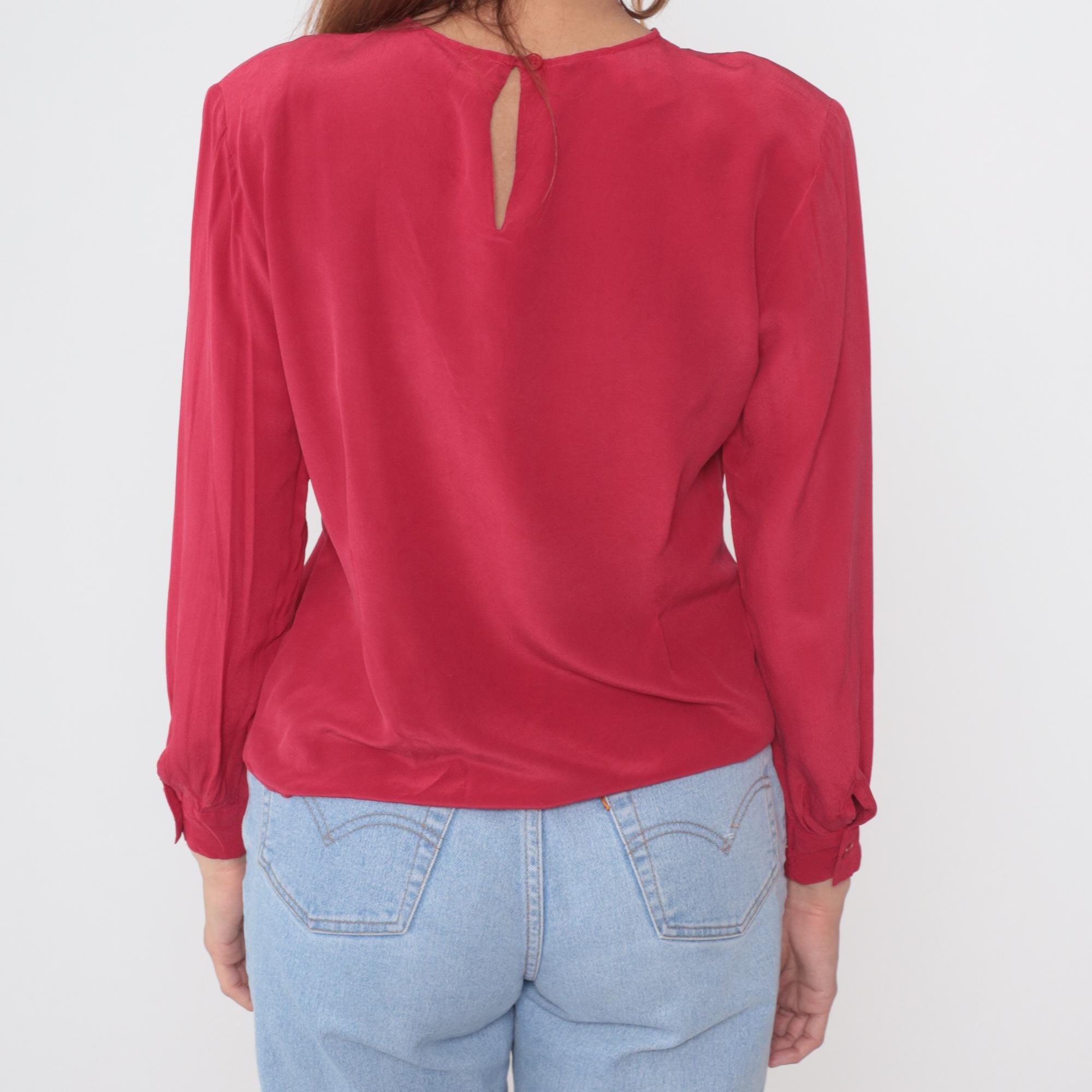 90s red blouse from Clio for Nordstrom. Crew neck with keyhole back opening and tie closure. Long sleeves with button cuffs. Relaxed fit through body with dropped shoulders.