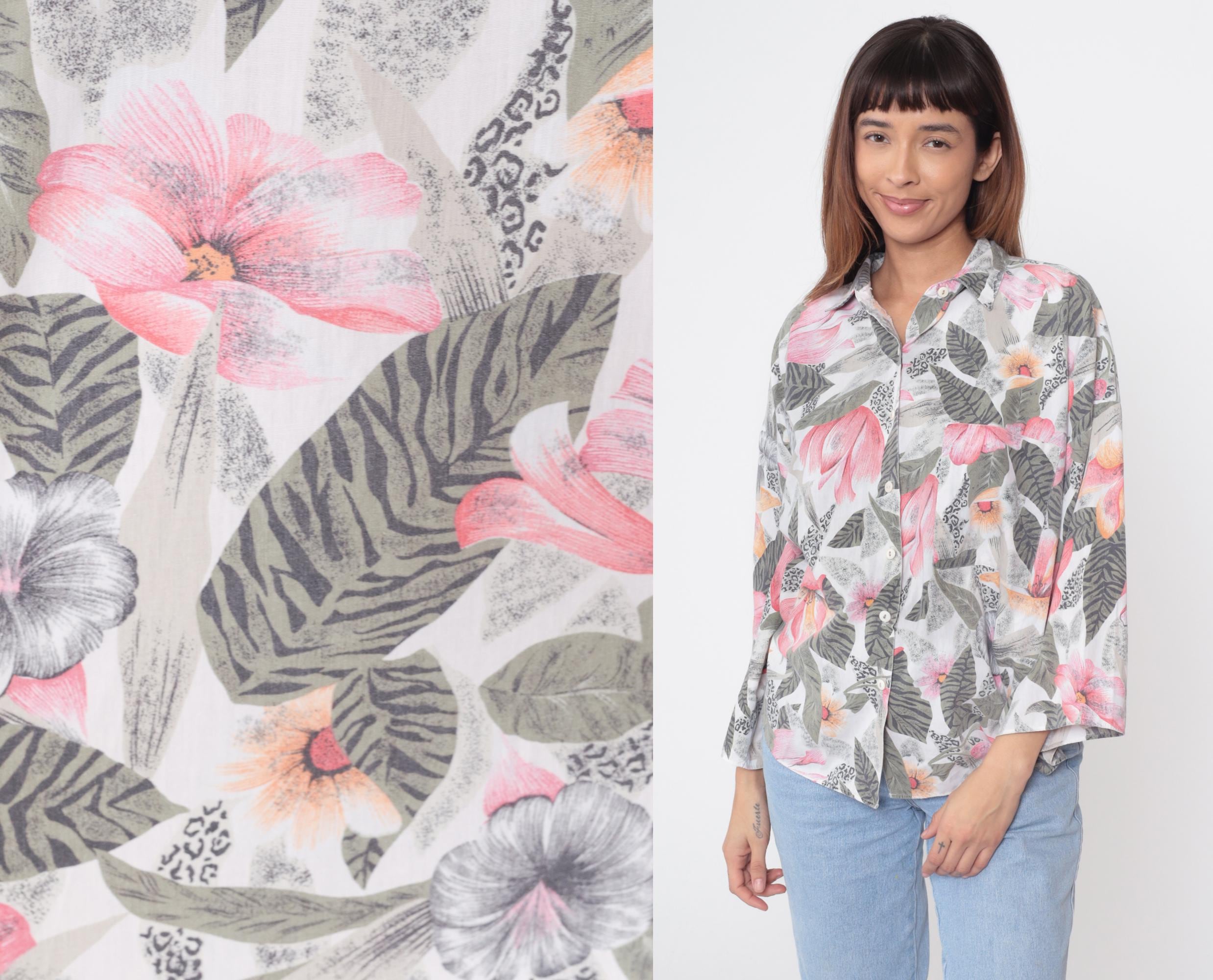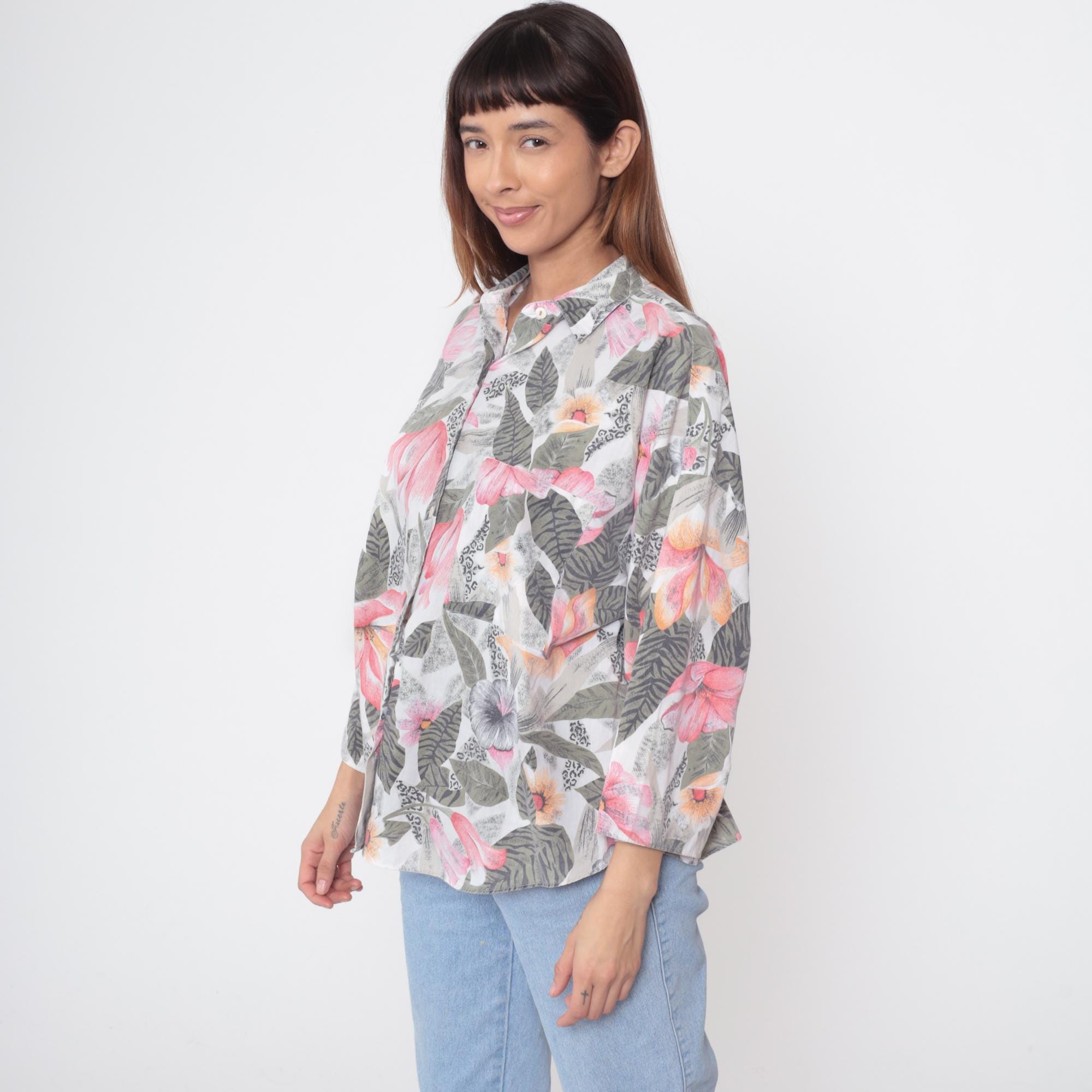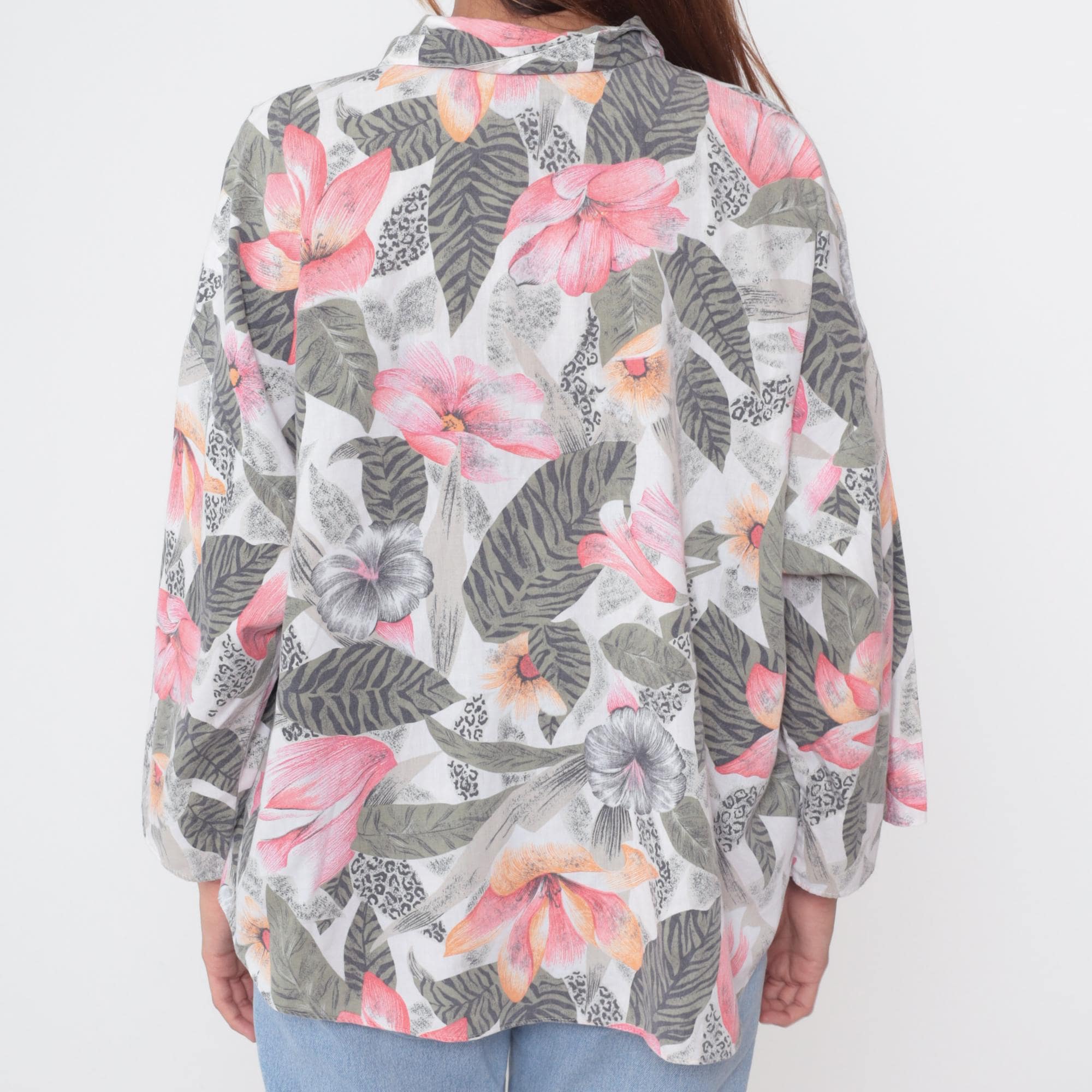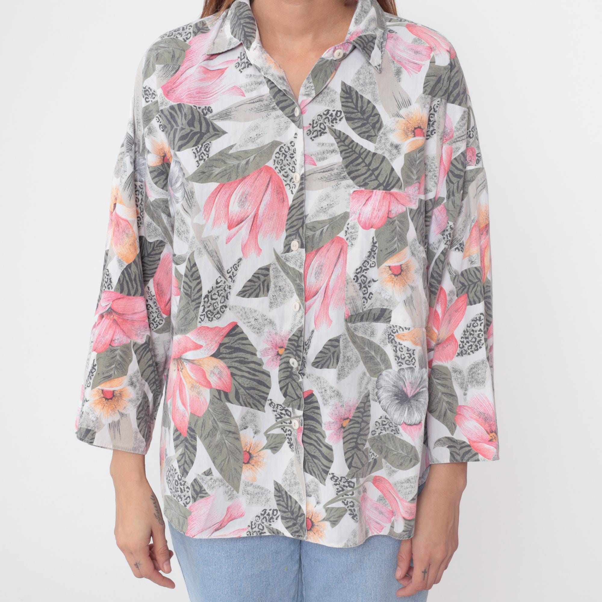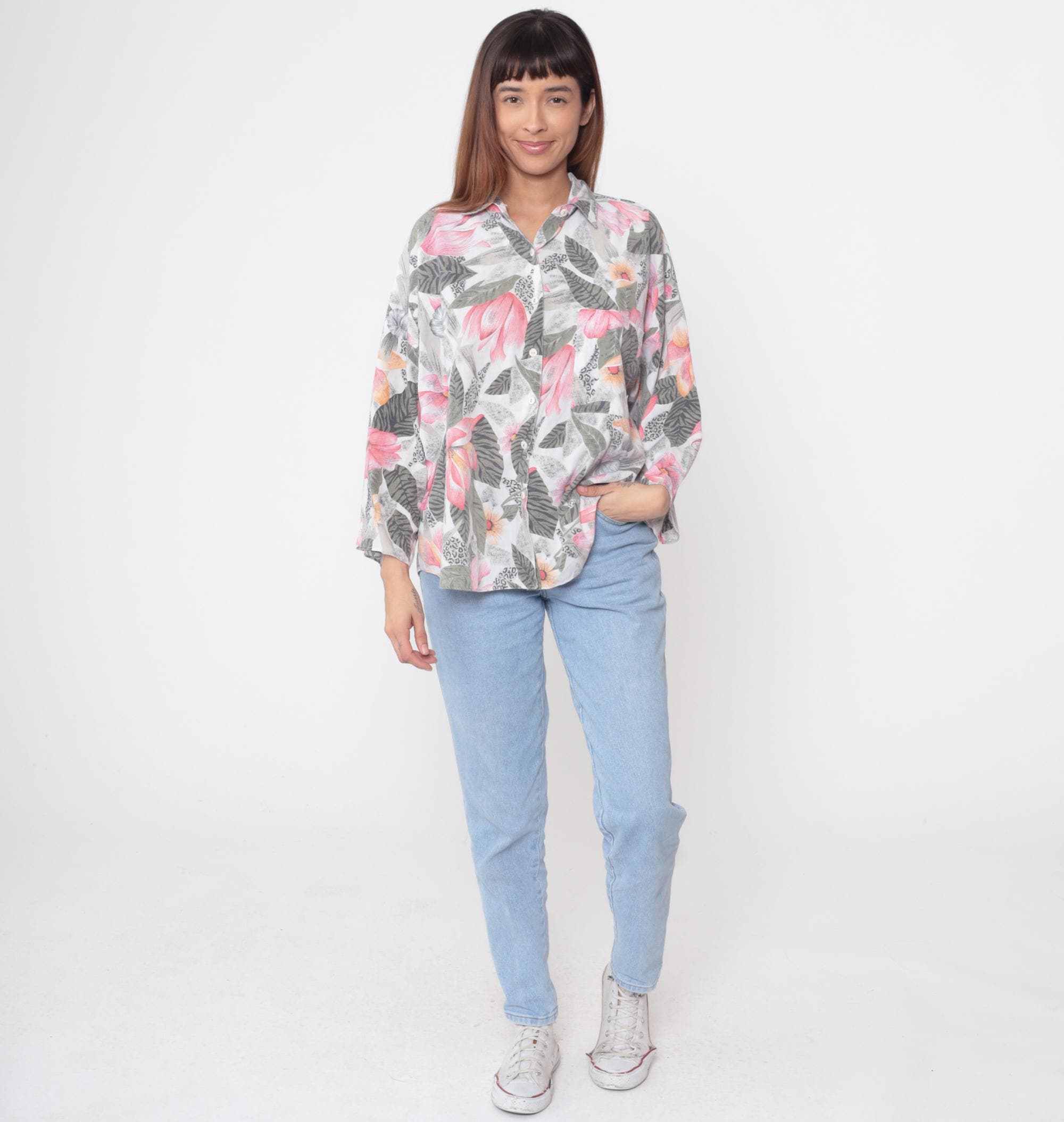 90s Box Office button down shirt featuring a bold floral and tropical leaf print in pink, orange, gray, and green tones. Designed with a relaxed oversized fit, pointed collar, and long sleeves.