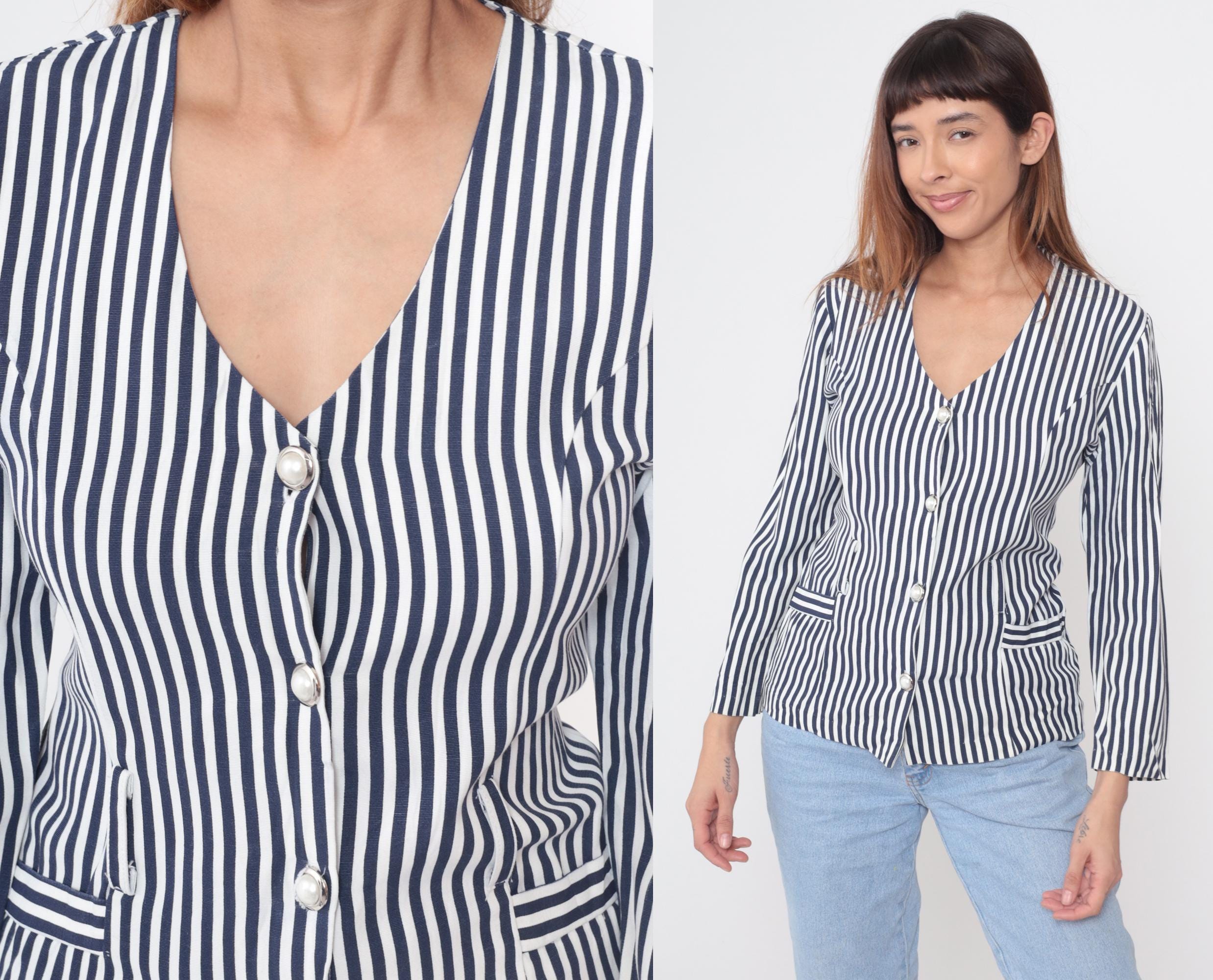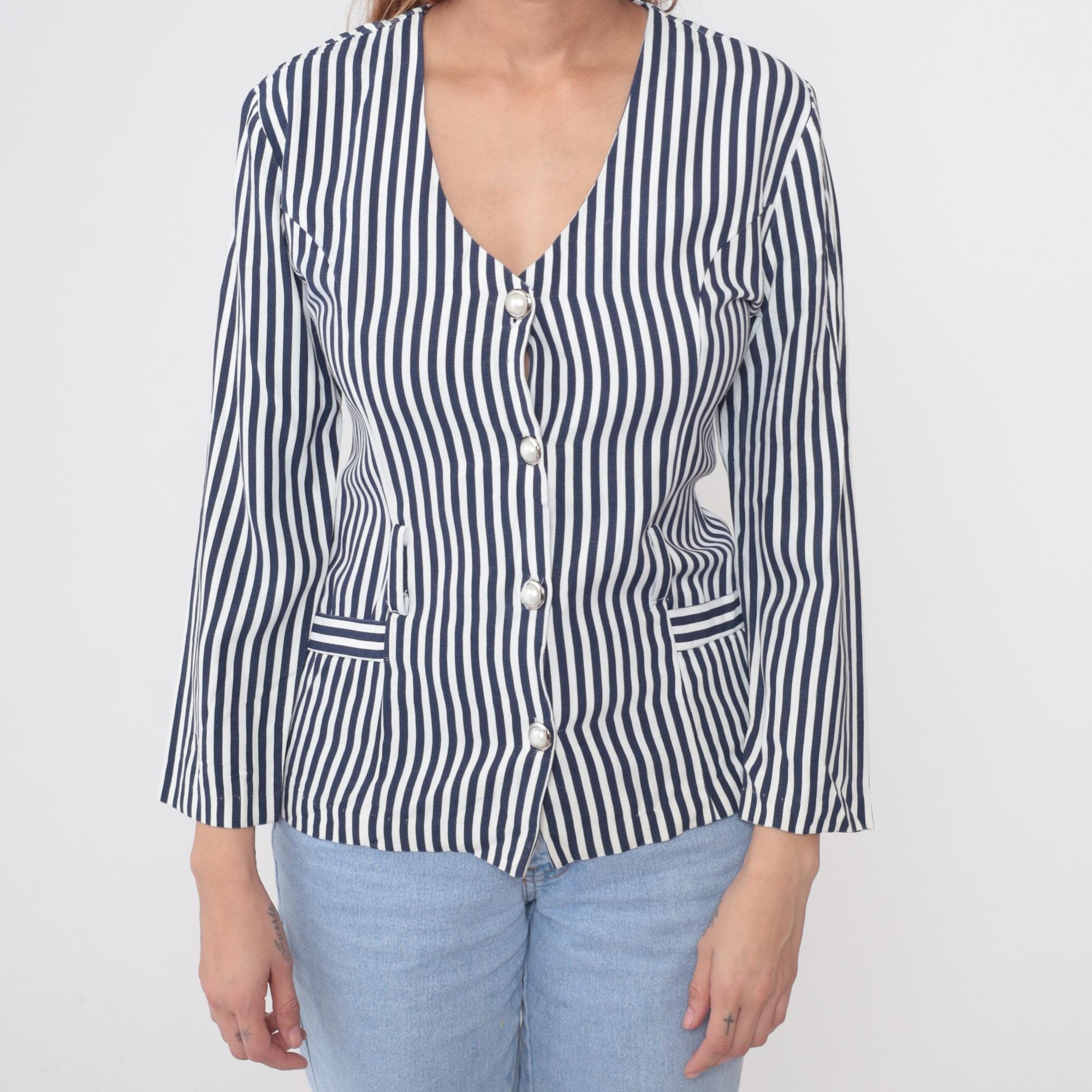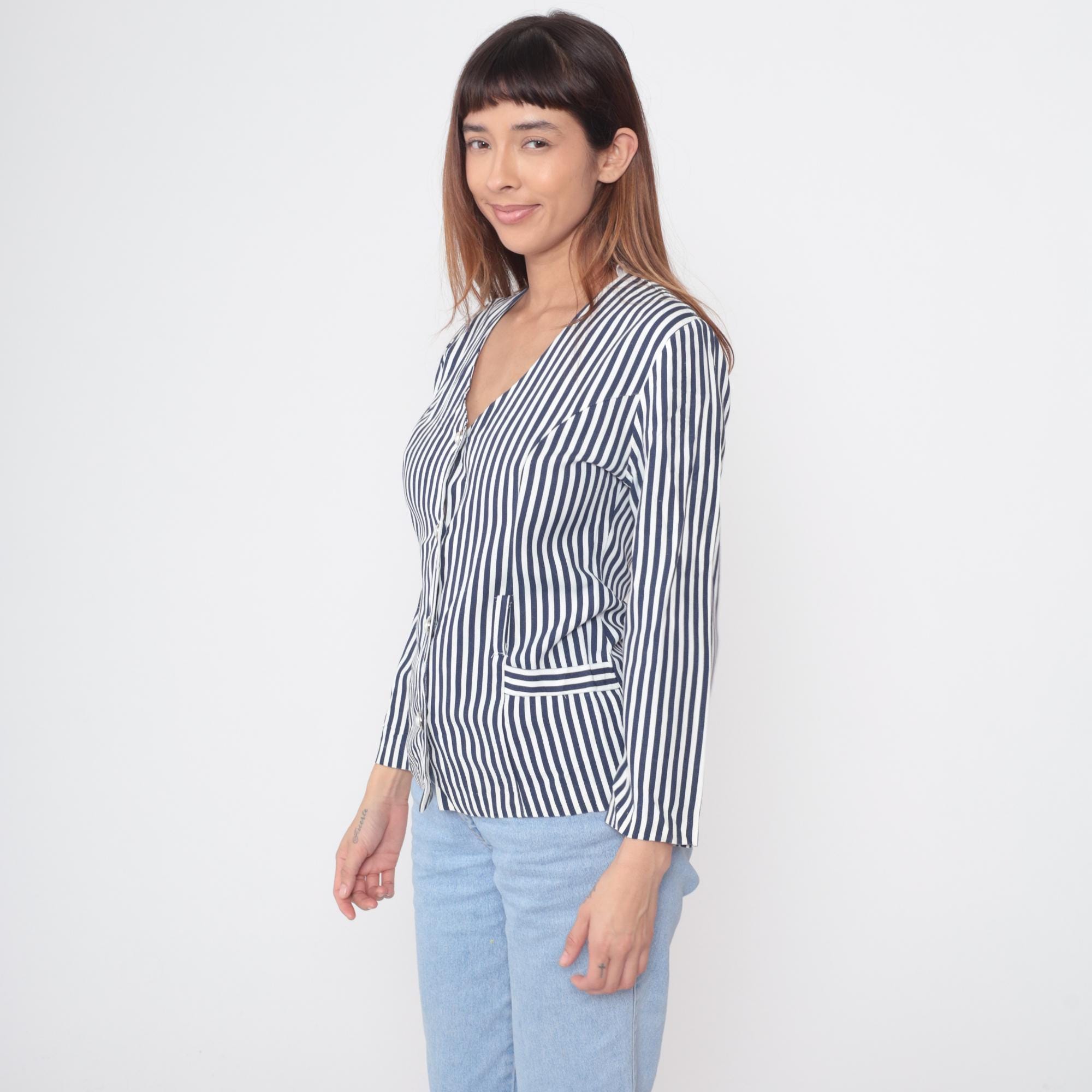 80s button front top with navy blue and white vertical stripes. Features a structured, tailored fit with pearl-style buttons, v-neckline, and long sleeves.