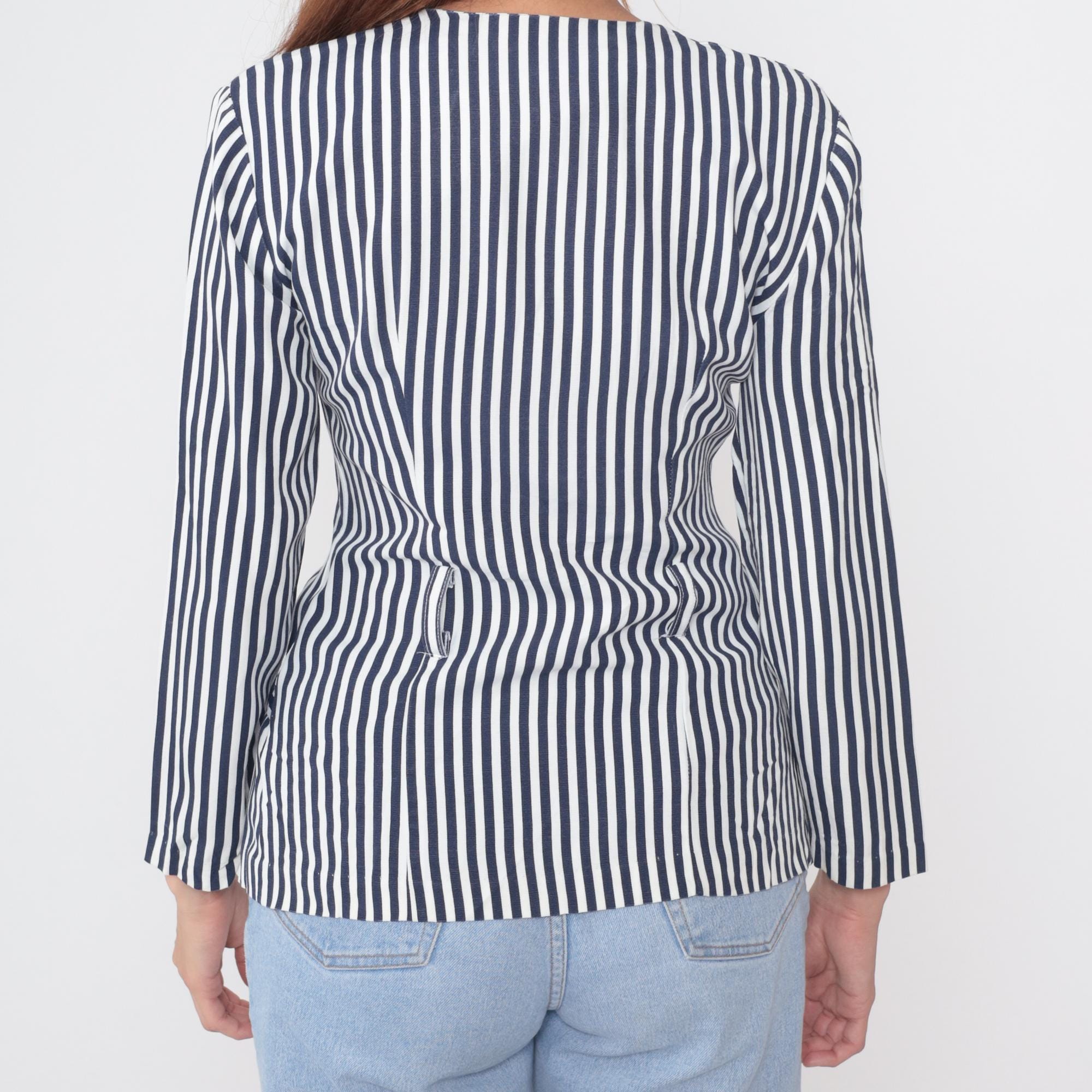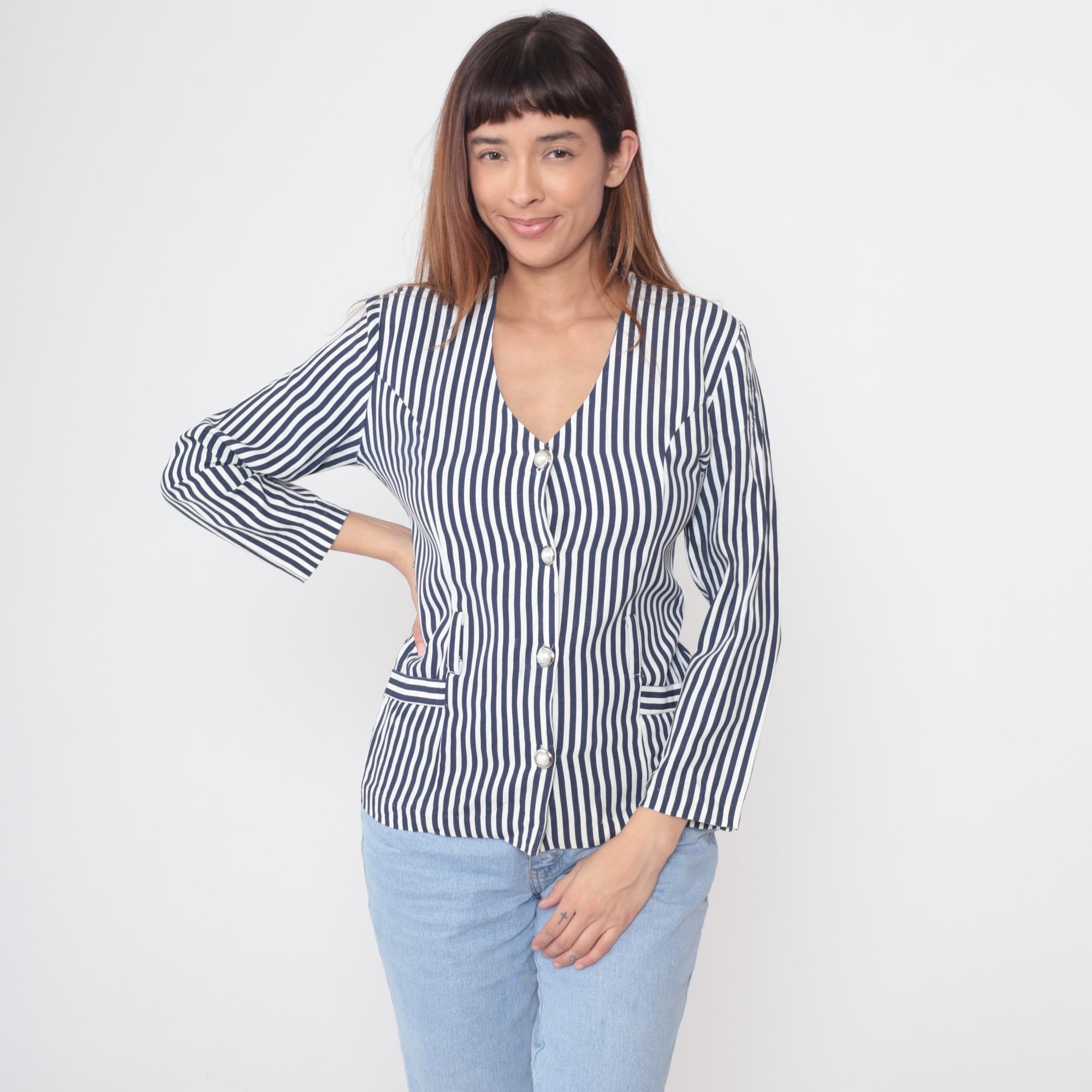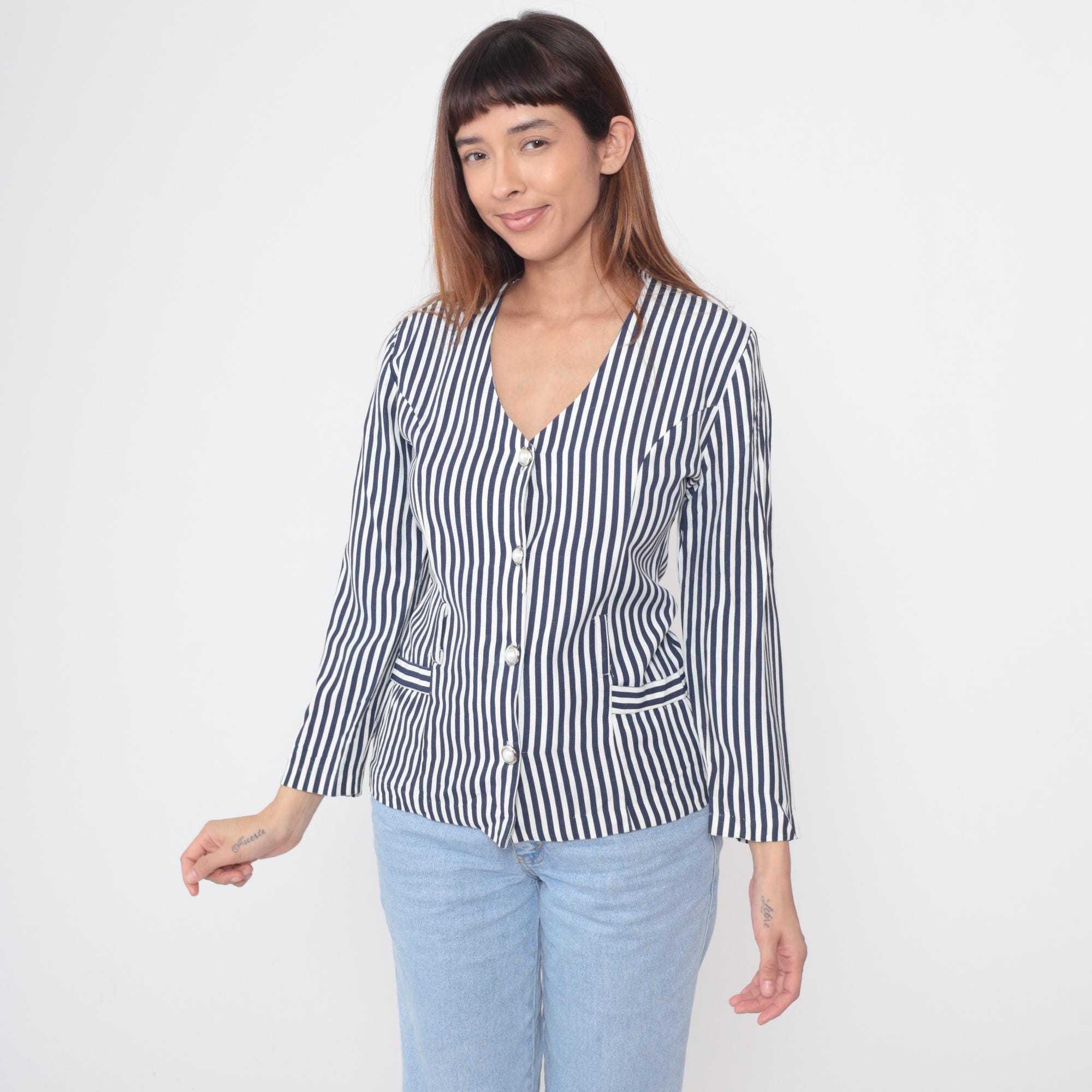 80s button front top with navy blue and white vertical stripes. Features a structured, tailored fit with pearl-style buttons, v-neckline, and long sleeves.