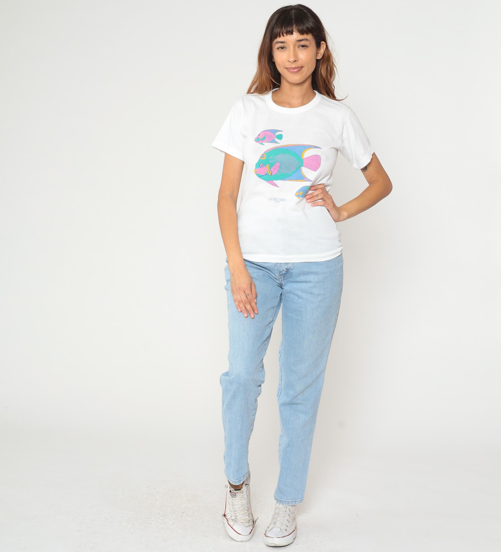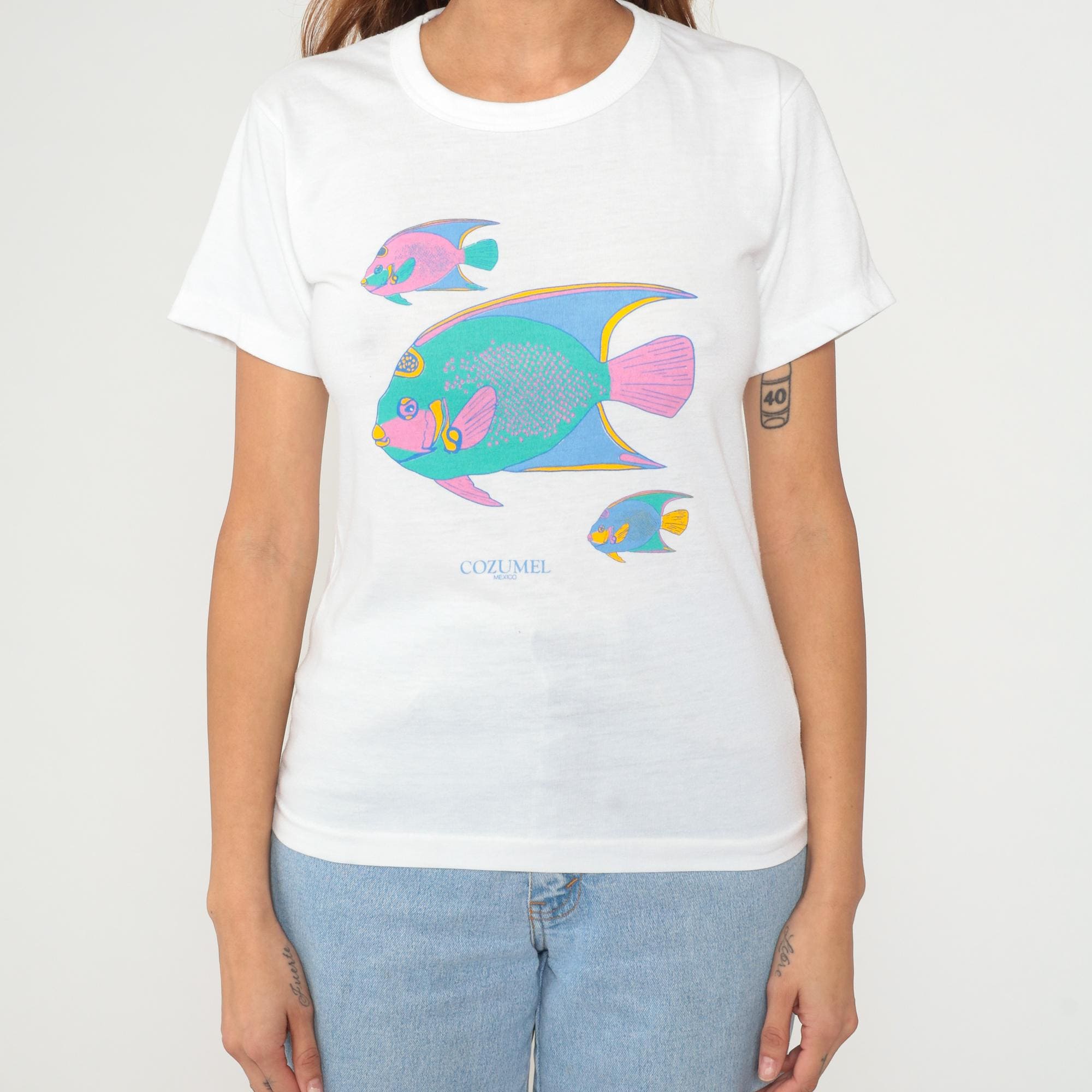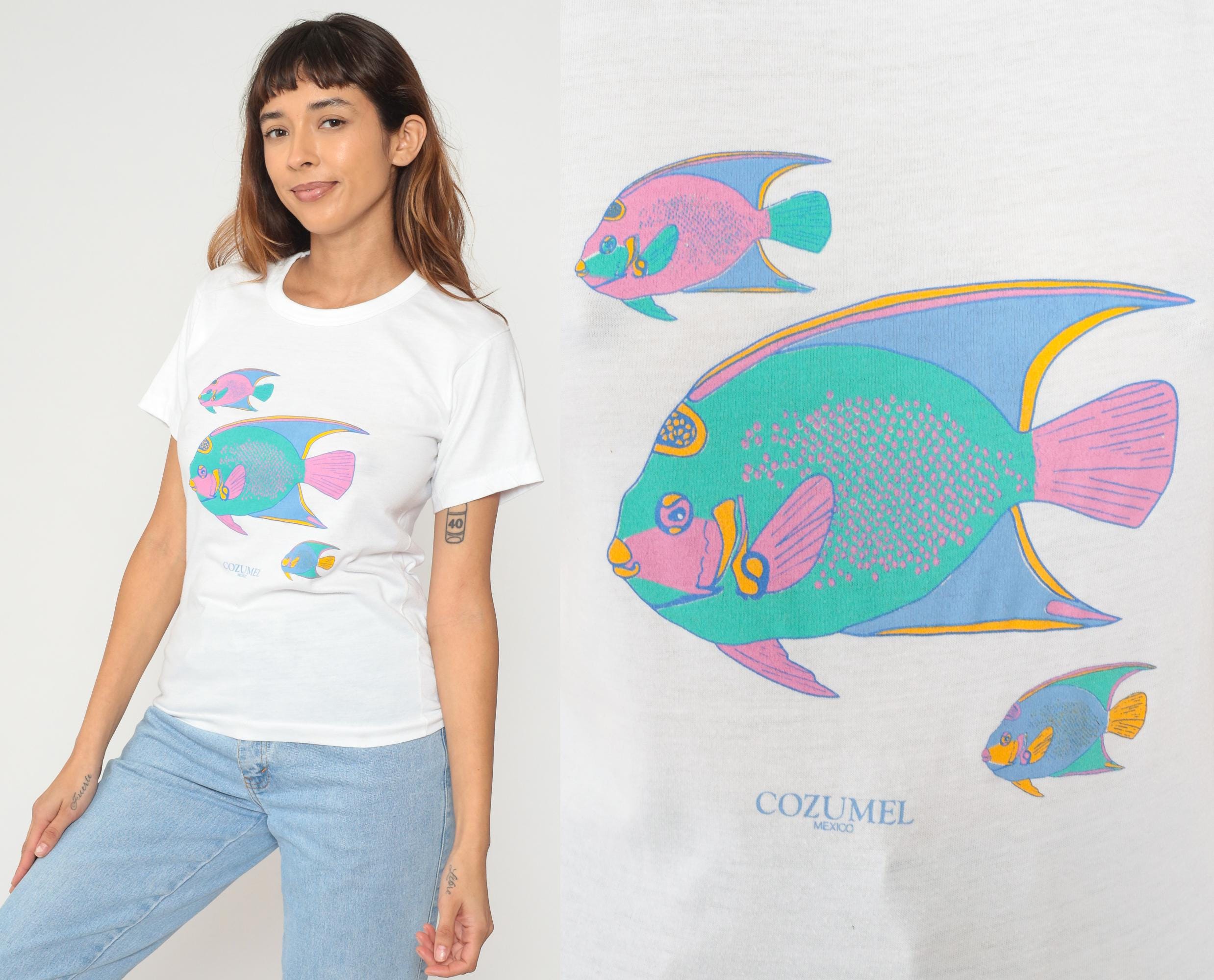 Cozumel, Mexico tropical fish graphic t-shirt from the Y2K era. White cotton tee featuring colorful angelfish in pink, turquoise, blue, and yellow with "Cozumel" text below the graphic. Three fish in varying sizes create a stacked composition on the front. Crew neck with short sleeves in a fitted silhouette.