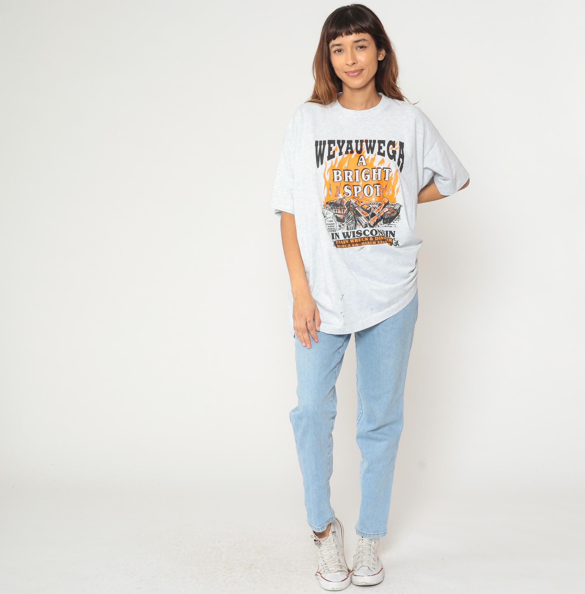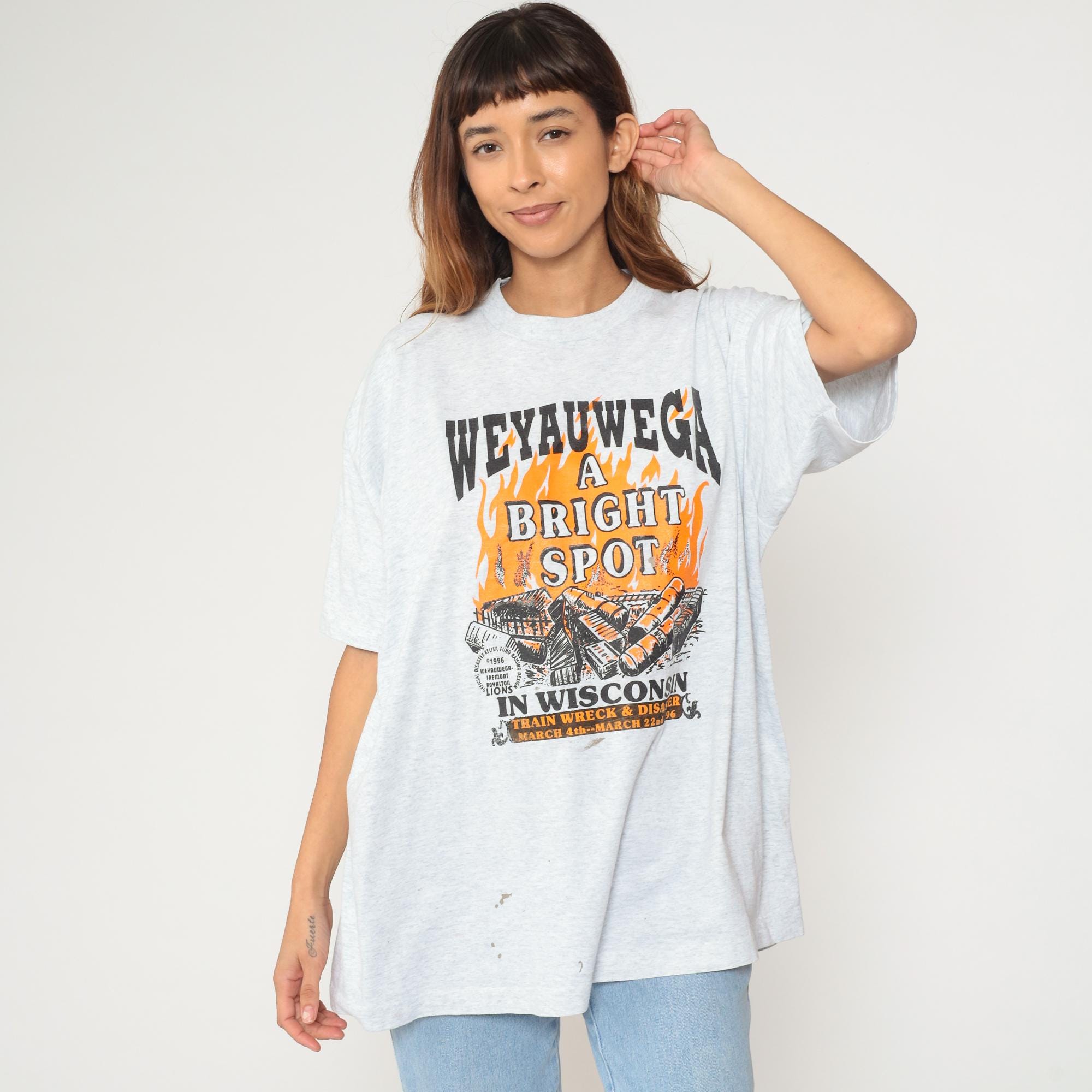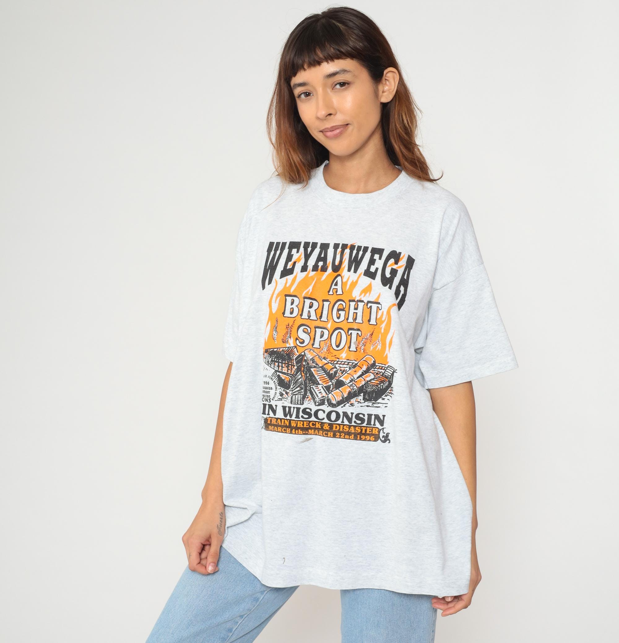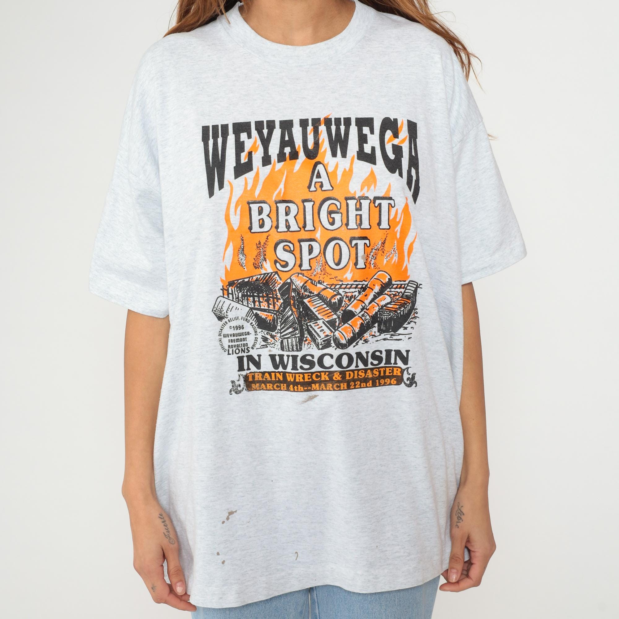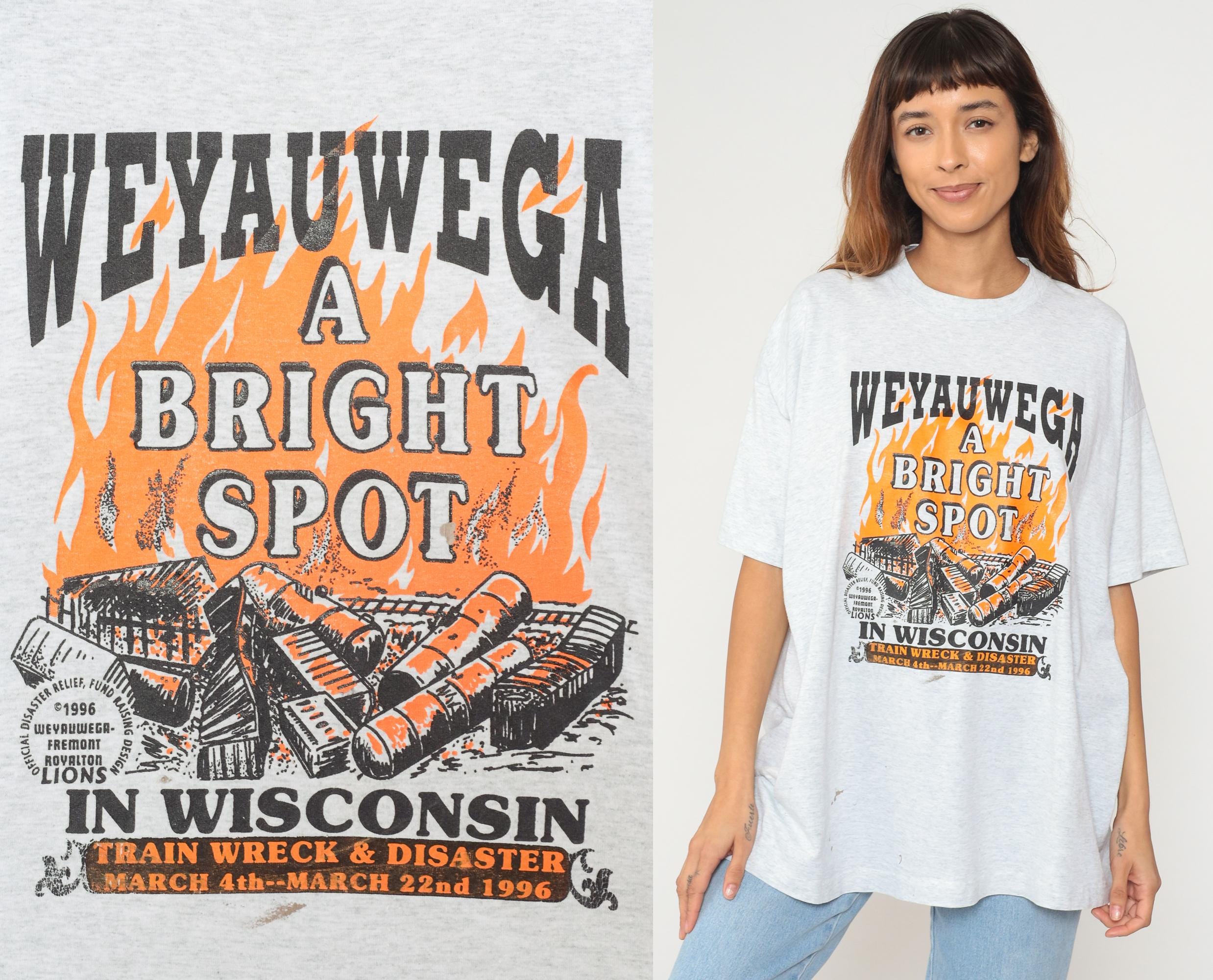 1996 Wisconsin train wreck disaster event t-shirt from Weyauwega. Heather gray cotton blend tee featuring "Weyauwega A Bright Spot" text with orange flame graphics surrounding a black and white illustration of a train wreck. "In Wisconsin Train Wreck & Disaster March 4th - March 22nd 1996" printed below the main graphic. Lions Club relief fund event shirt commemorating the Weyauwega-Fremont derailment.