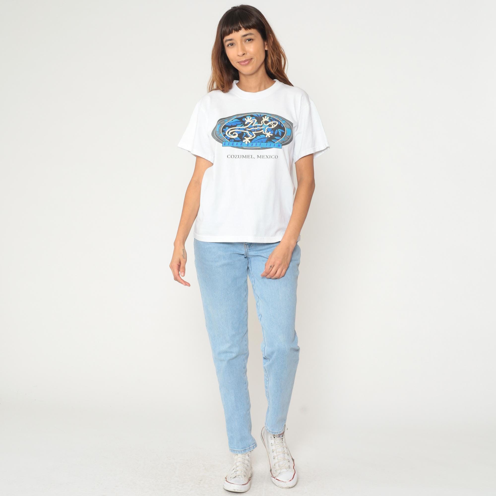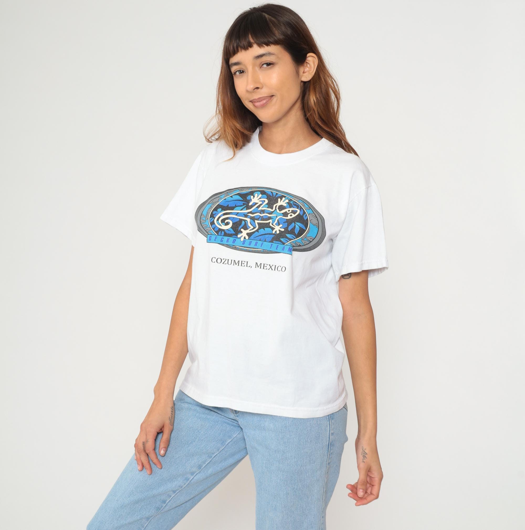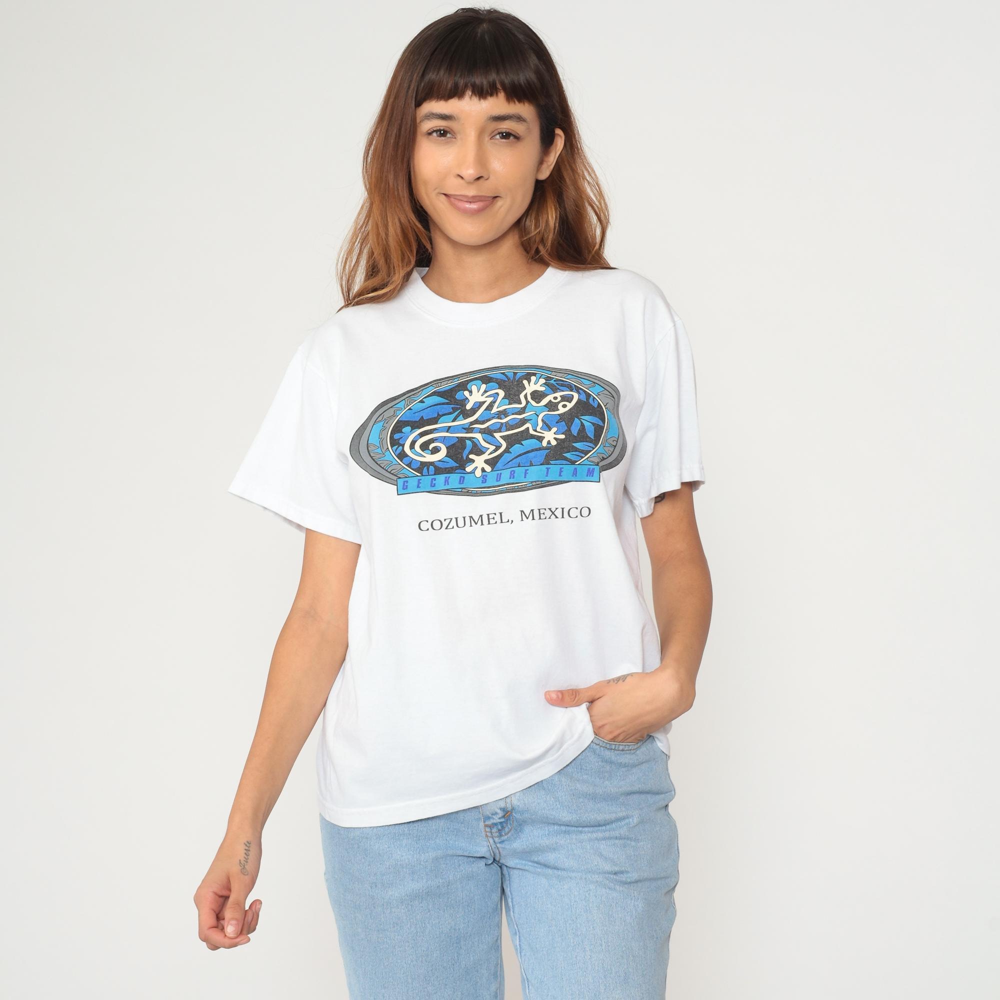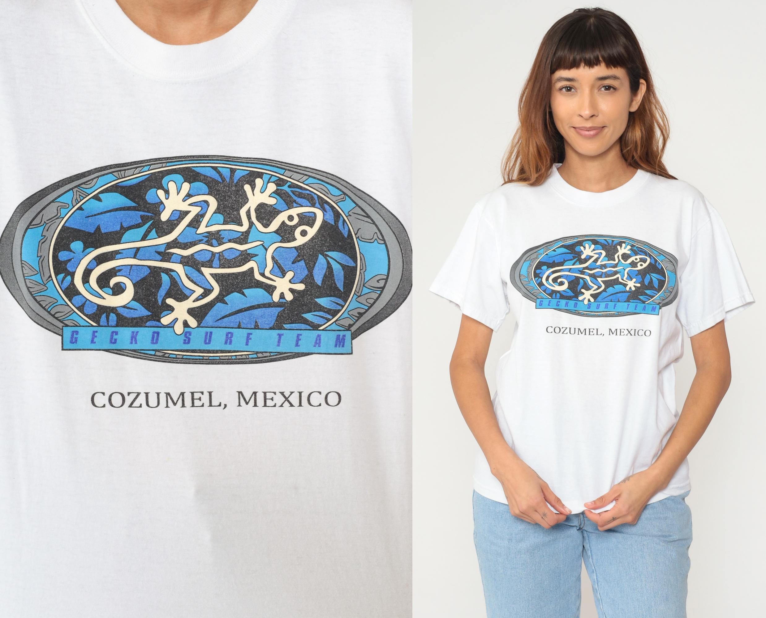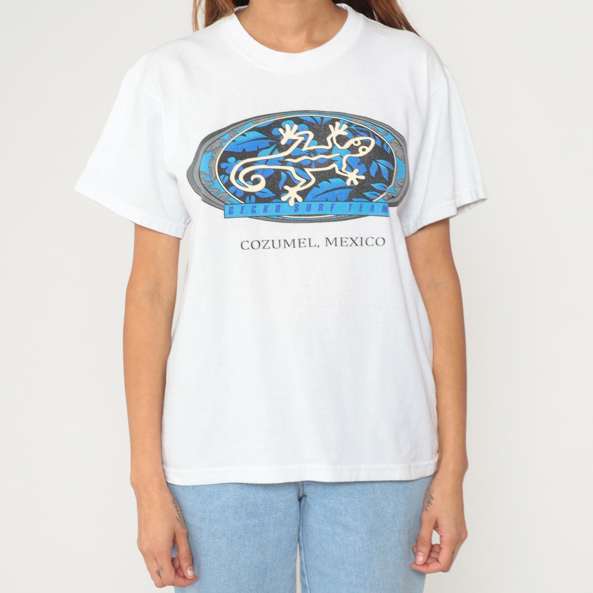 Cozumel, Mexico "Gecko Surf Team" graphic t-shirt from the Y2K era. White cotton tee featuring a large oval patch design with a cream gecko against blue tropical leaves and black background. "Gecko Surf Team" text in blue lettering across the bottom of the graphic, with "Cozumel, Mexico" printed below in gray. Crew neck with short sleeves in an oversized, relaxed fit.