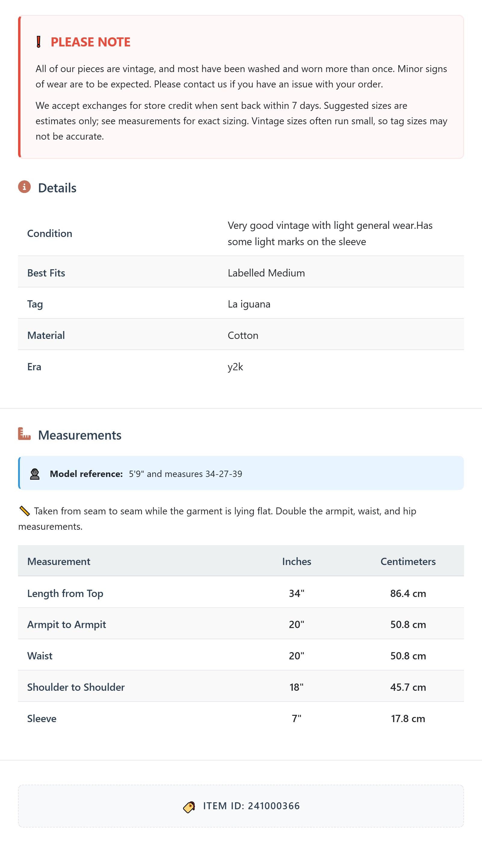 All of our pieces are vintage, and most have been washed and worn more than once. Minor signs of wear are to be expected. Please contact us if you have an issue with your order. We accept exchanges for store credit when sent back within 7 days.
