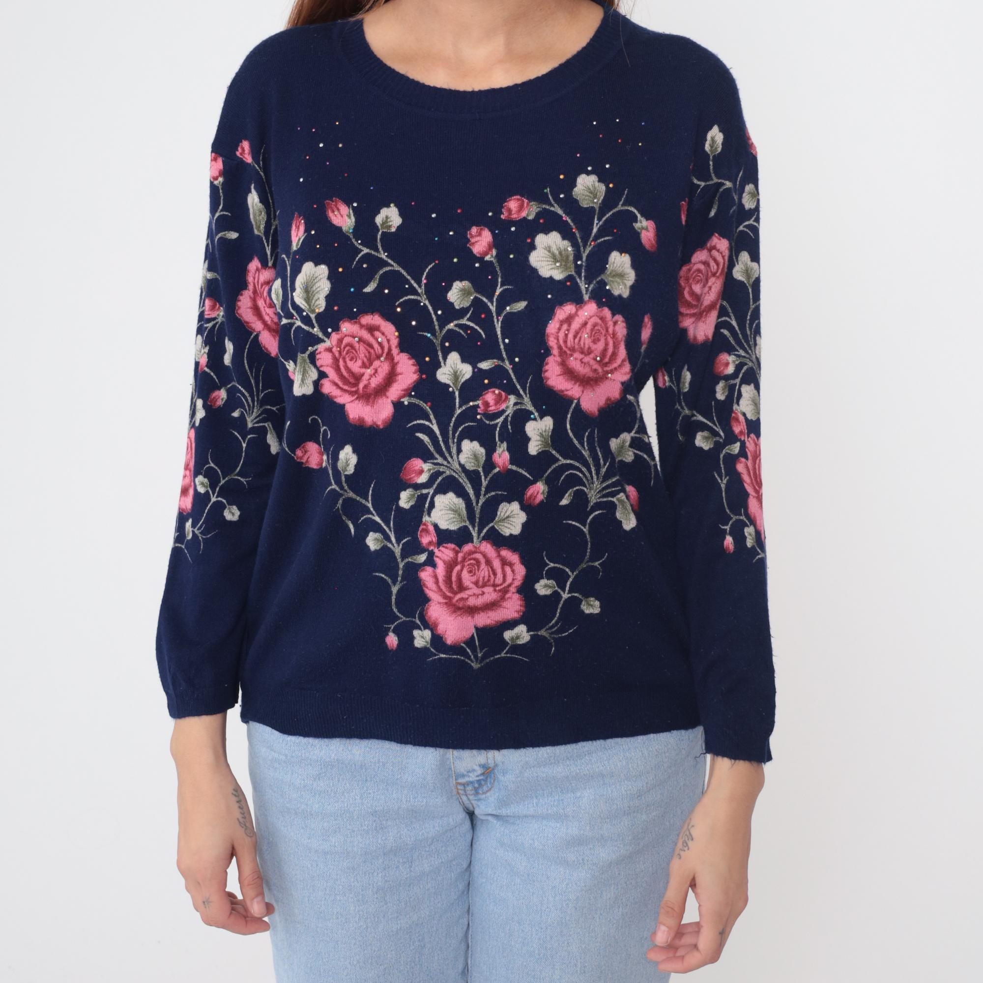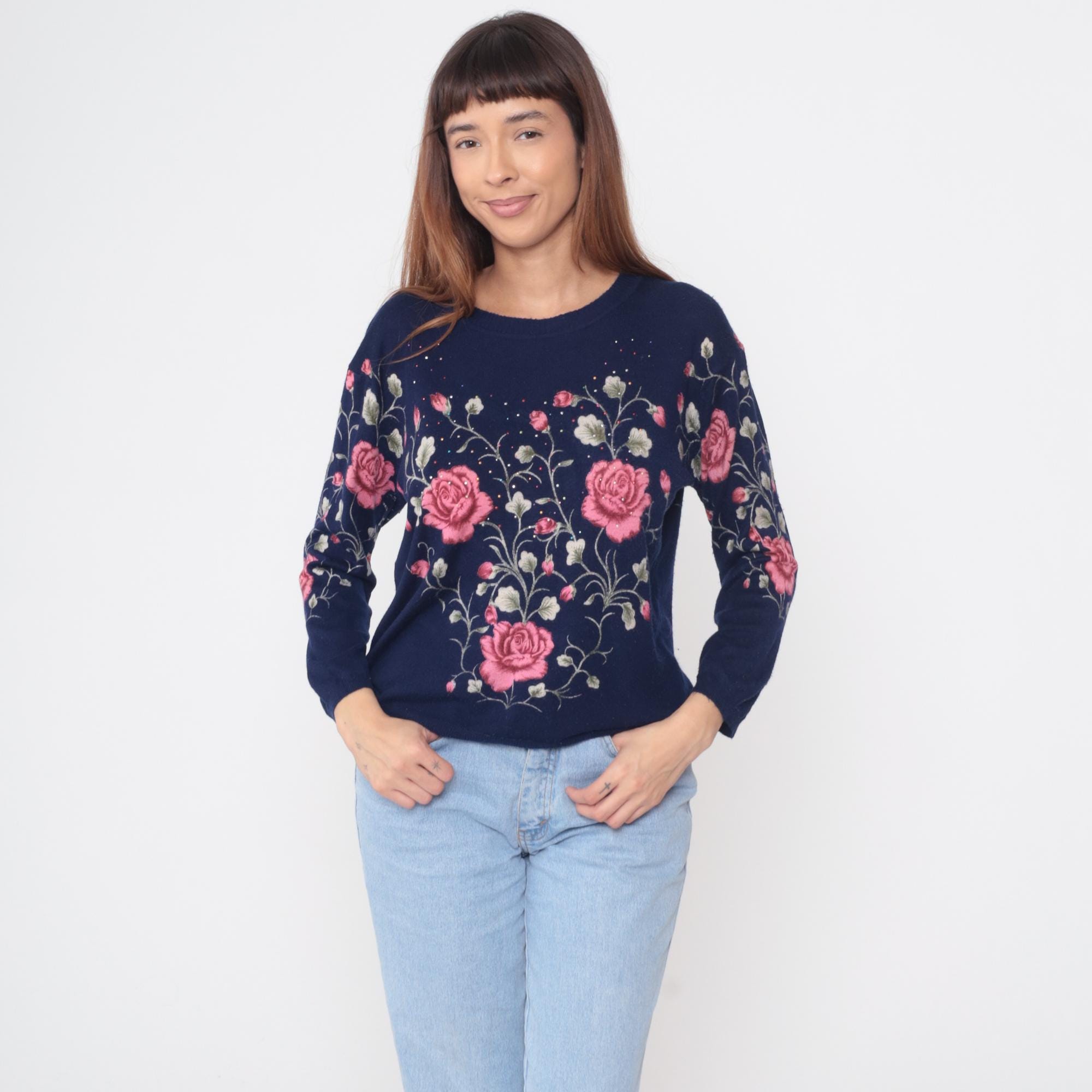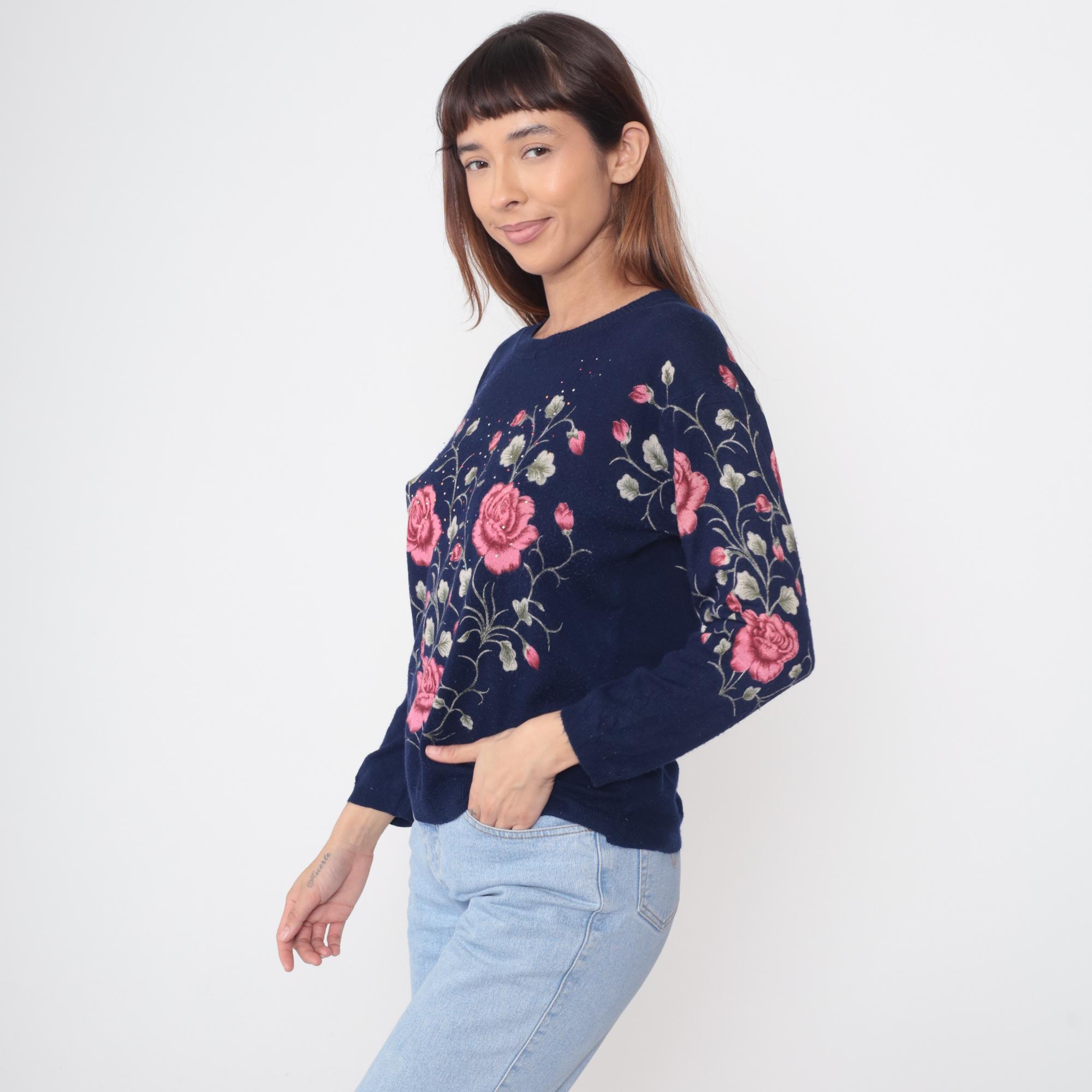 90s navy blue sweater featuring pink rose embroidery with scattered beaded accents across the front and sleeves. Made from an acrylic blend knit with a soft feel and slightly cropped length. Pull-on style with a crew neckline.