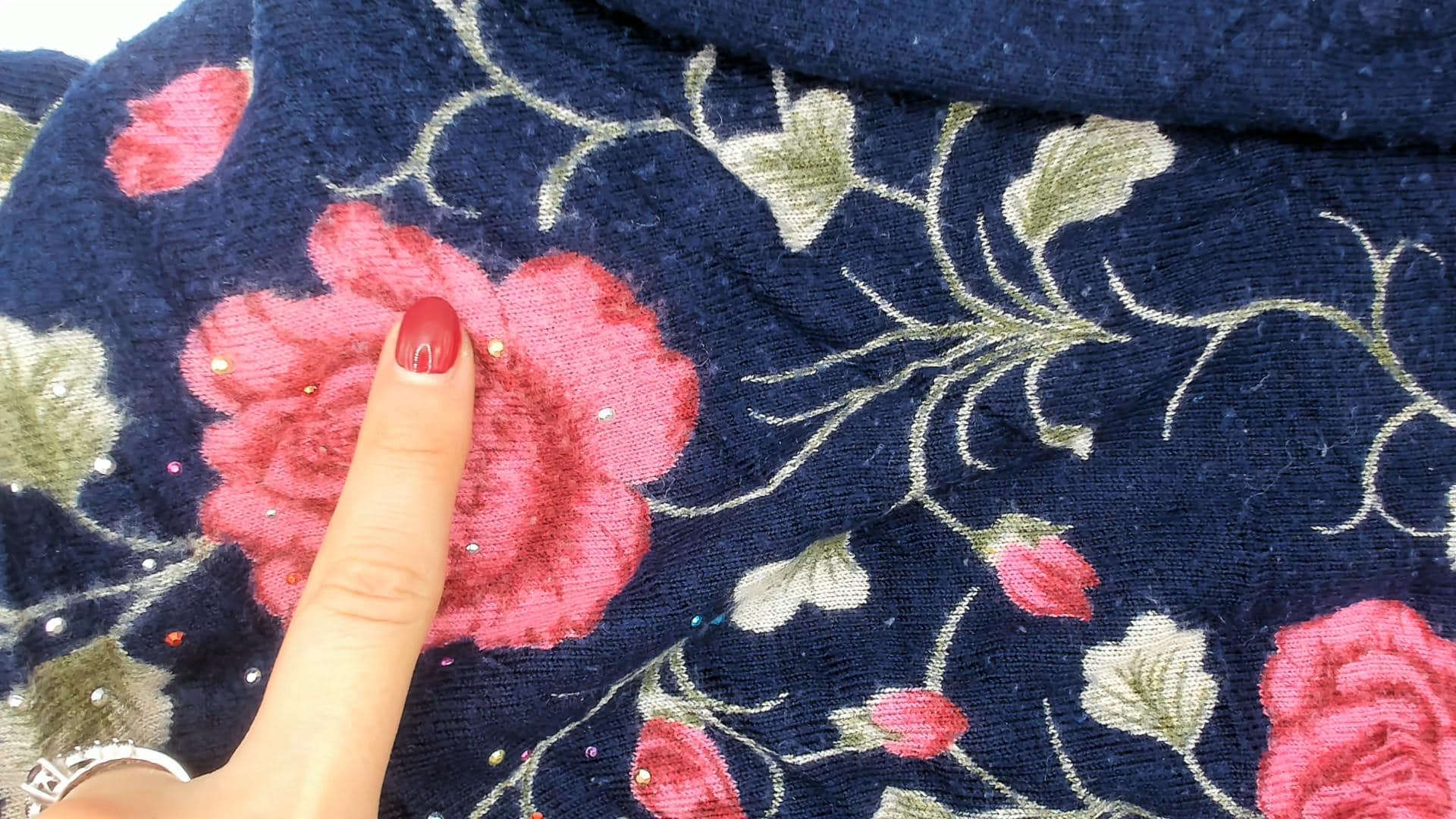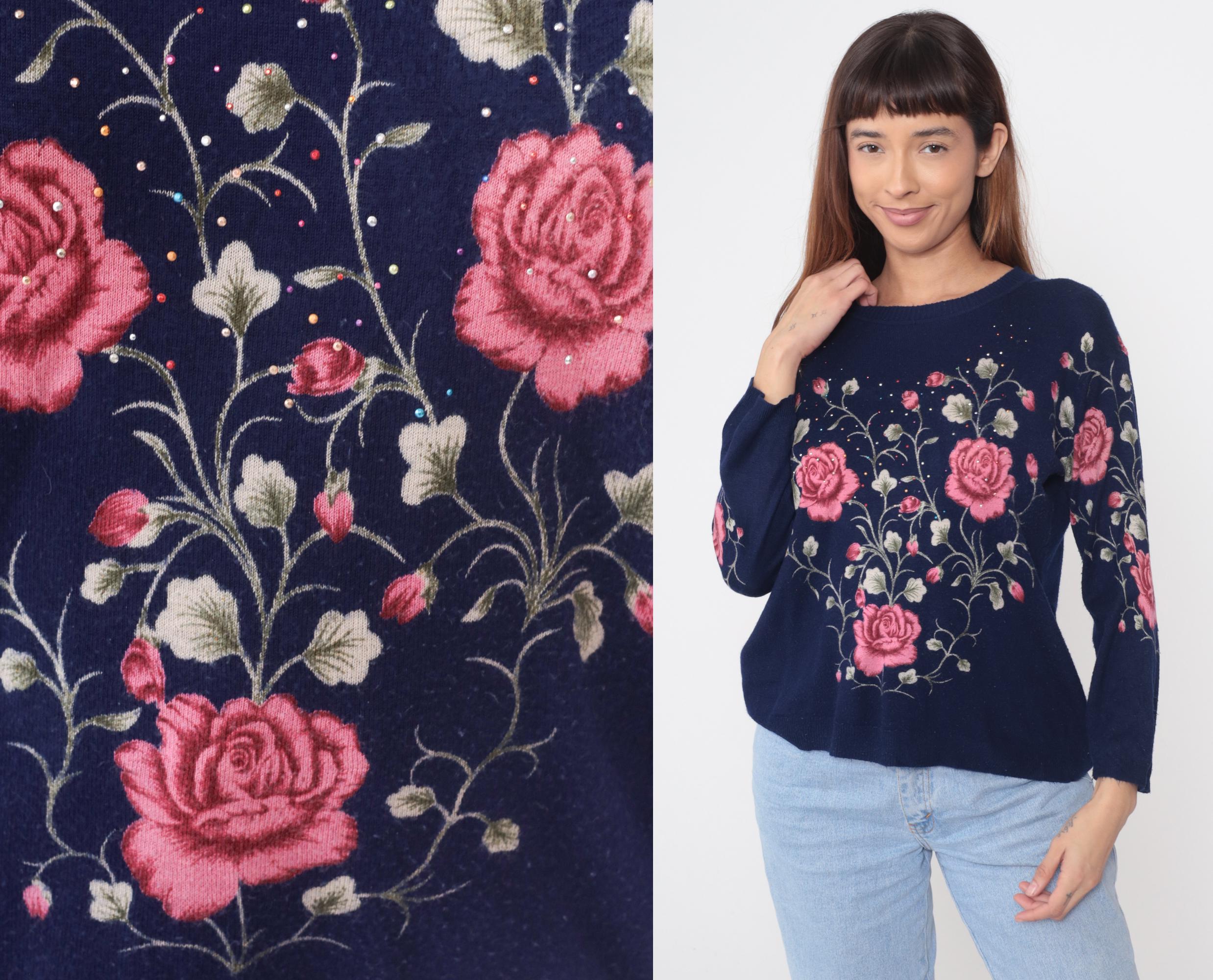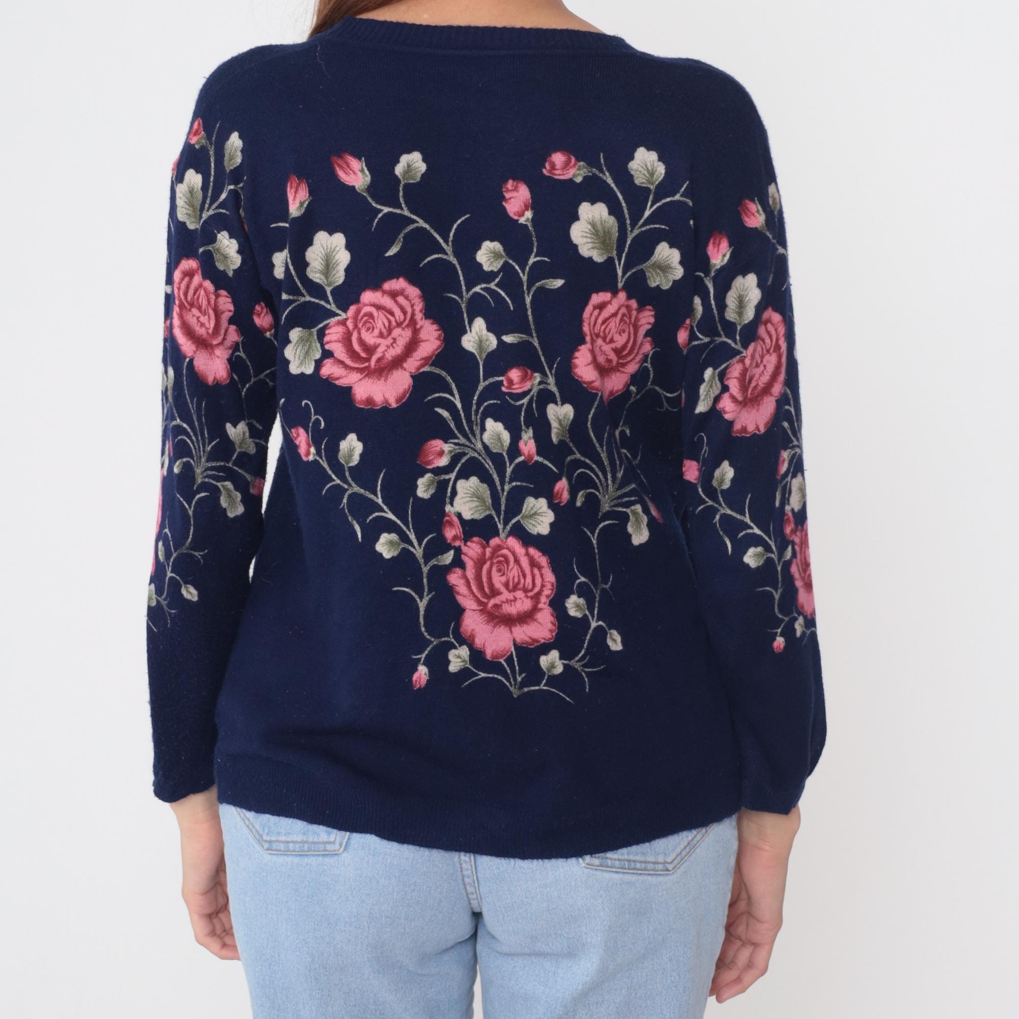 90s navy blue sweater featuring pink rose embroidery with scattered beaded accents across the front and sleeves. Made from an acrylic blend knit with a soft feel and slightly cropped length. Pull-on style with a crew neckline.