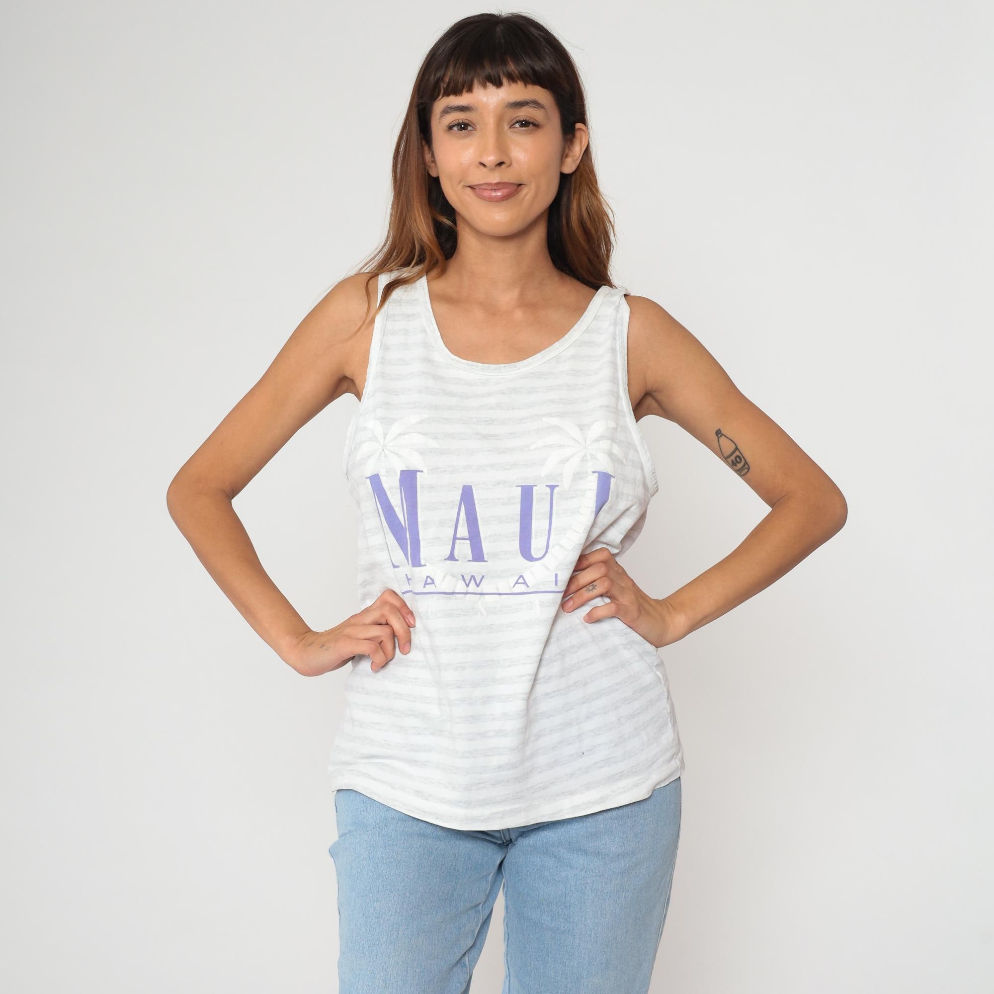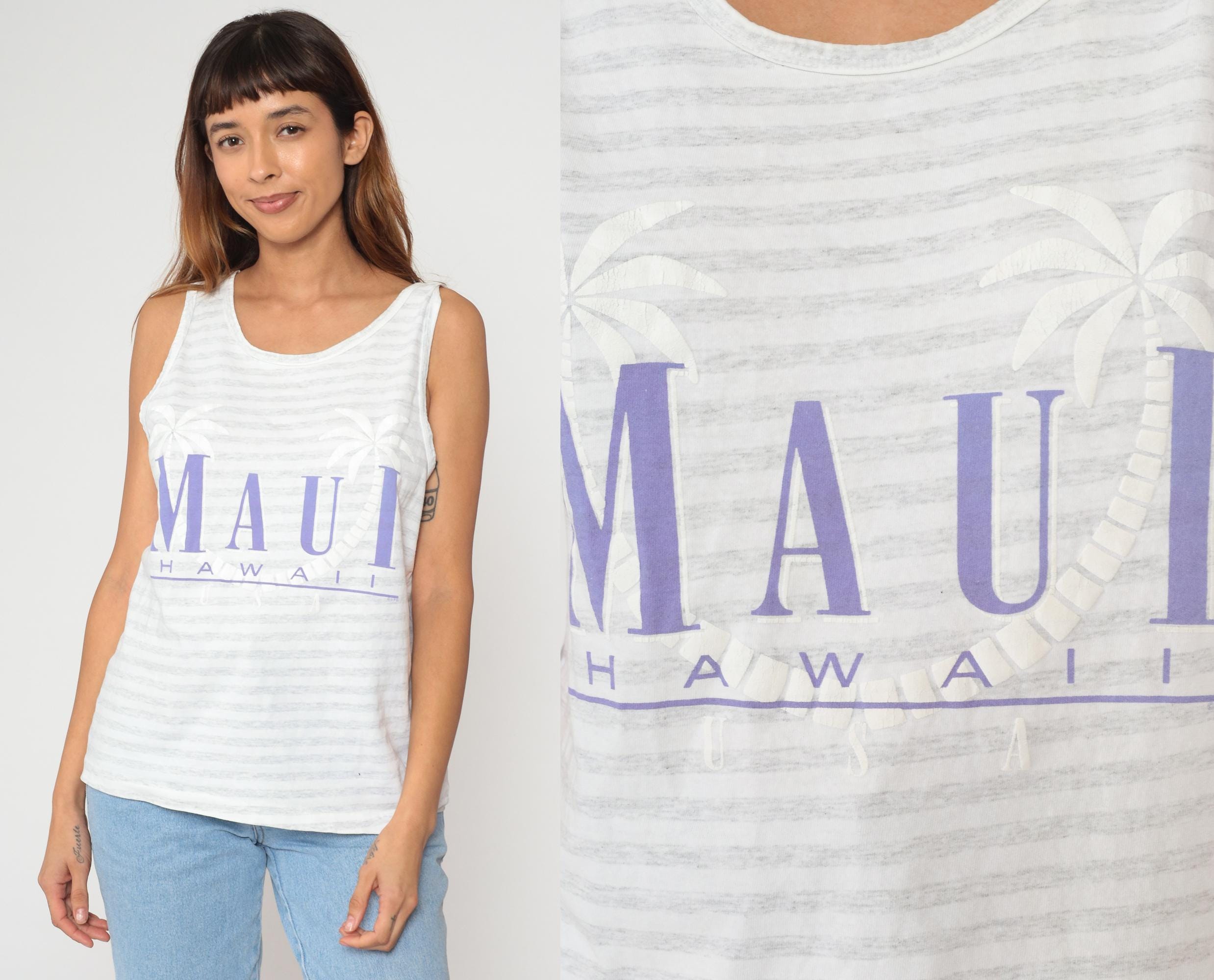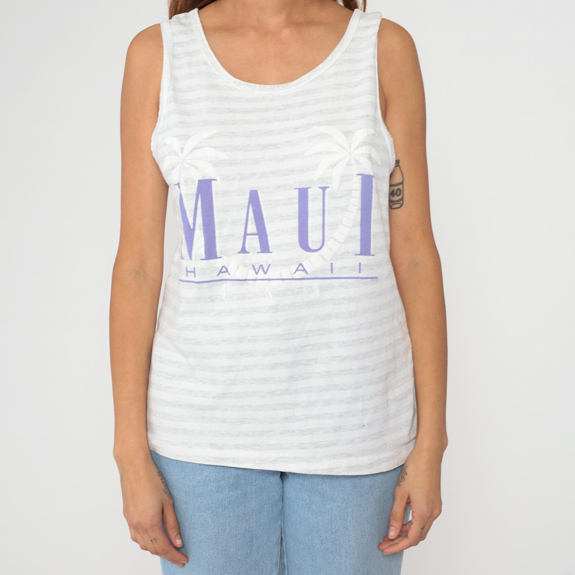 Maui, Hawaii destination tank top from the 1990s. White and gray horizontal stripe cotton tank featuring "Maui Hawaii" in purple block letters with palm tree graphics on either side of the text. Crew neck with wide shoulder straps in a relaxed fit.