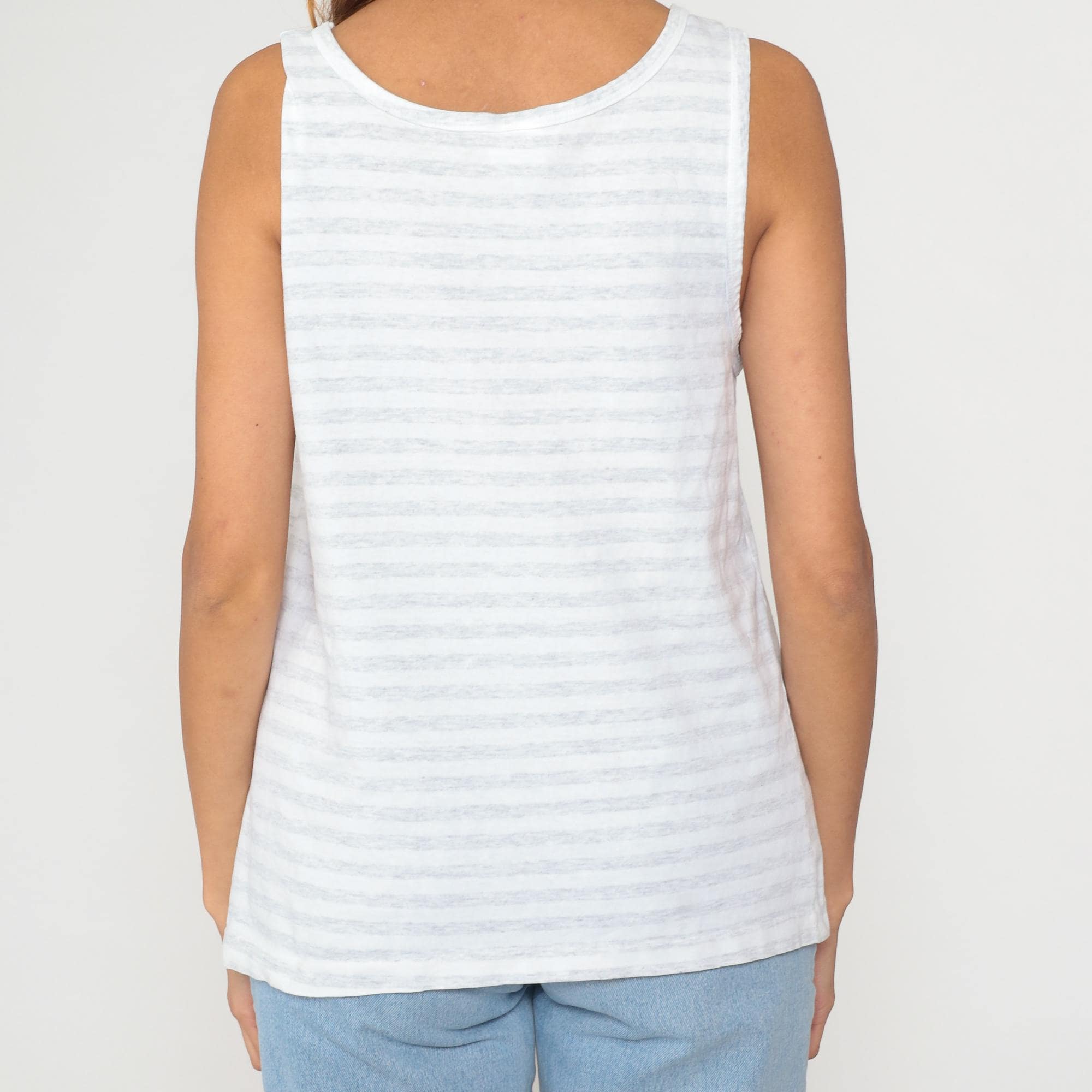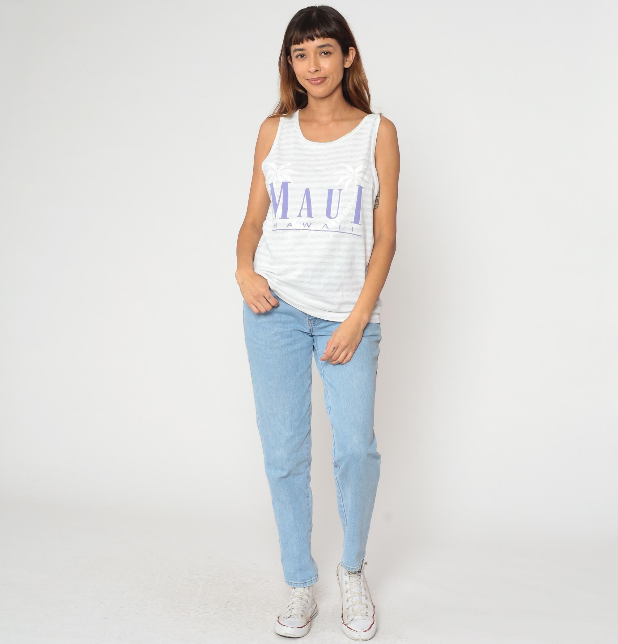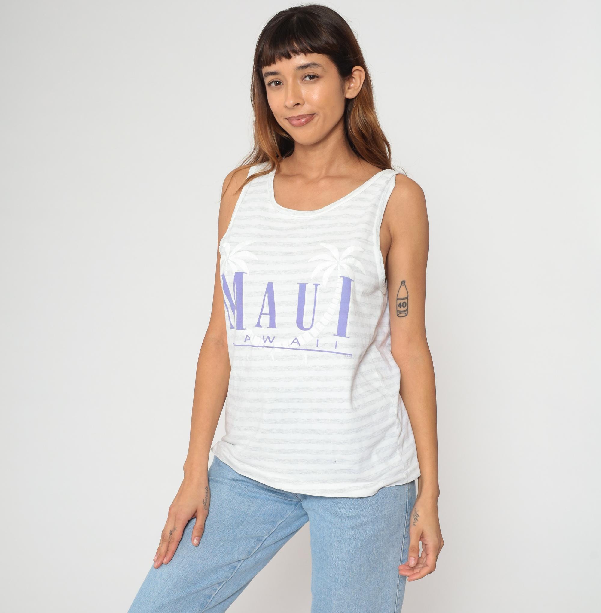 Maui, Hawaii destination tank top from the 1990s. White and gray horizontal stripe cotton tank featuring "Maui Hawaii" in purple block letters with palm tree graphics on either side of the text. Crew neck with wide shoulder straps in a relaxed fit.
