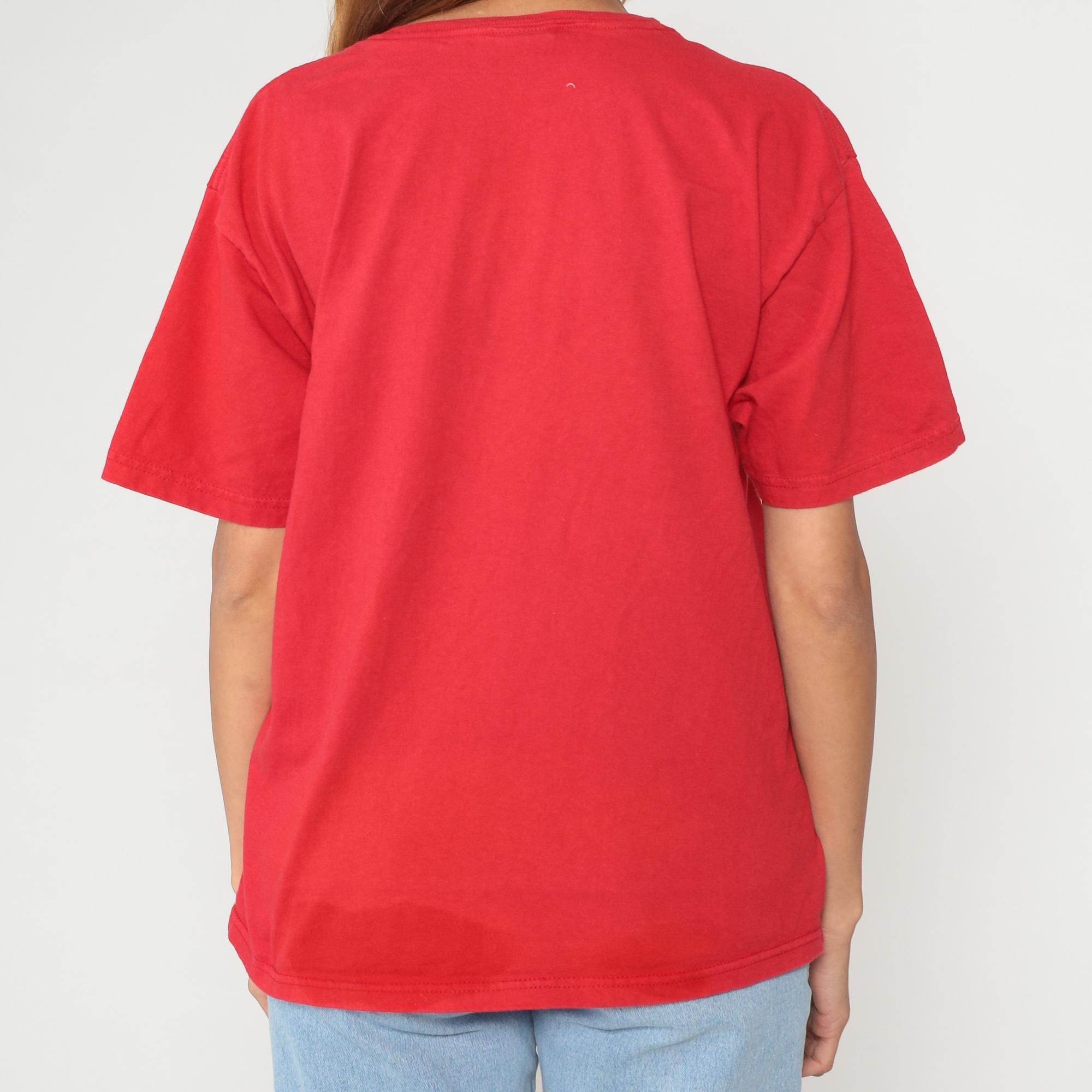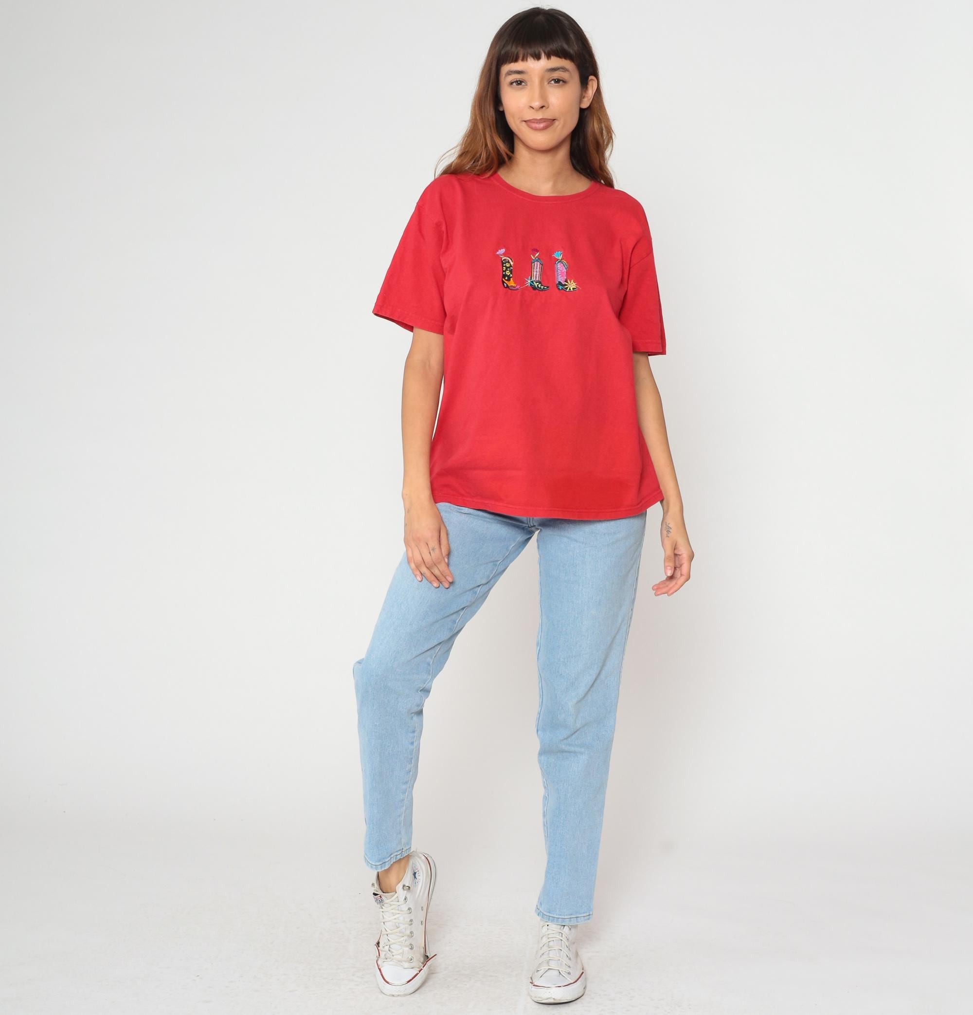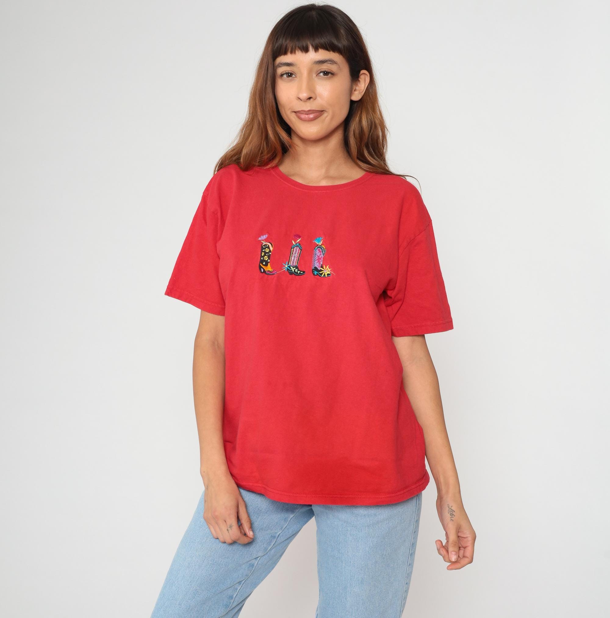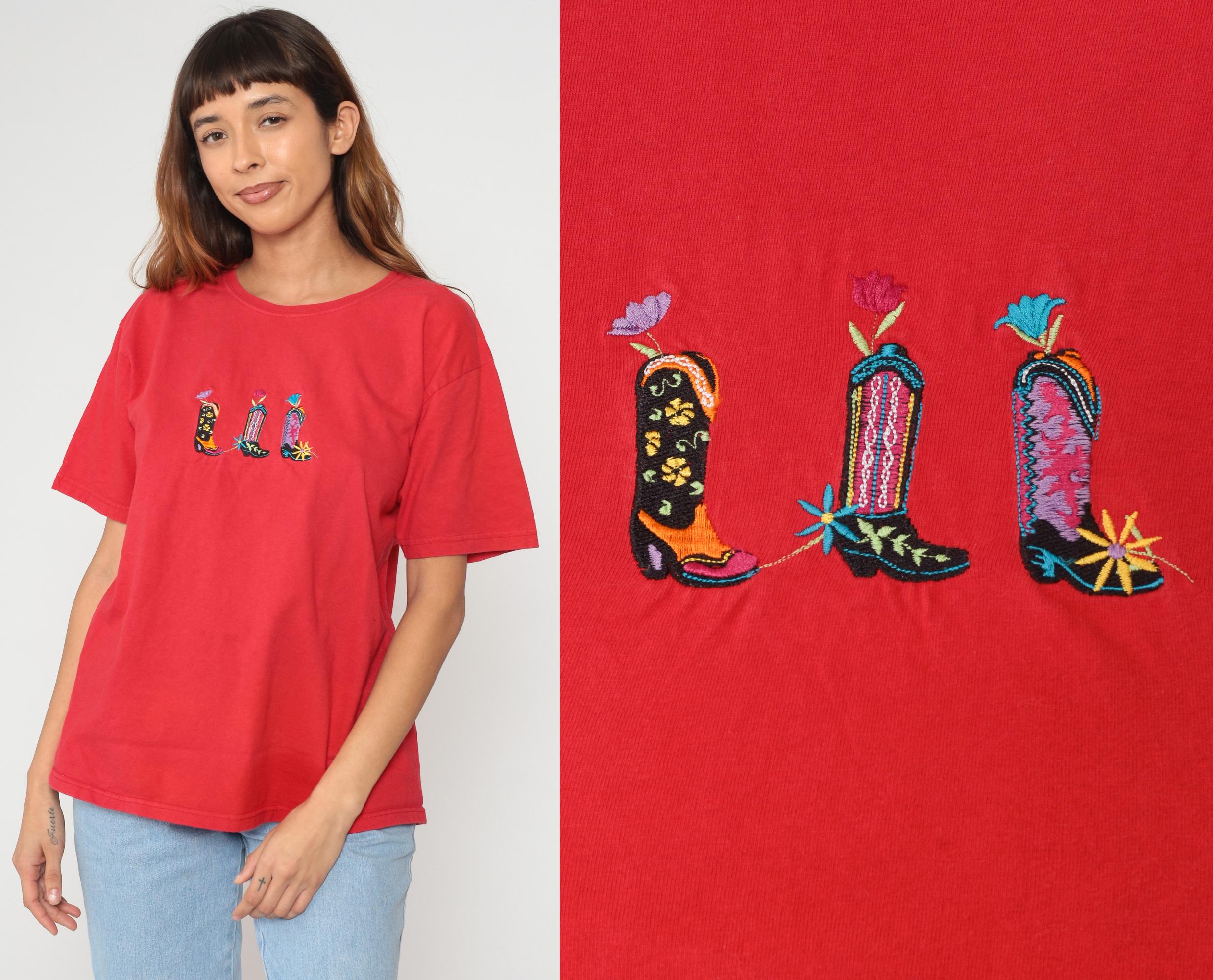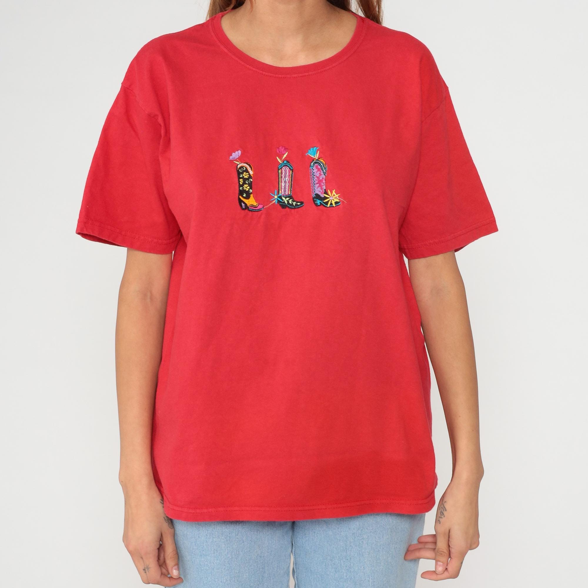 Embroidered cowboy boot t-shirt from the 1990s. Red cotton tee featuring three colorful embroidered western boots across the chest in black with yellow floral details, striped with pink and blue accents, and pink with turquoise details. Each boot topped with a small embroidered flower. Crew neck with short sleeves in an oversized, boxy fit.