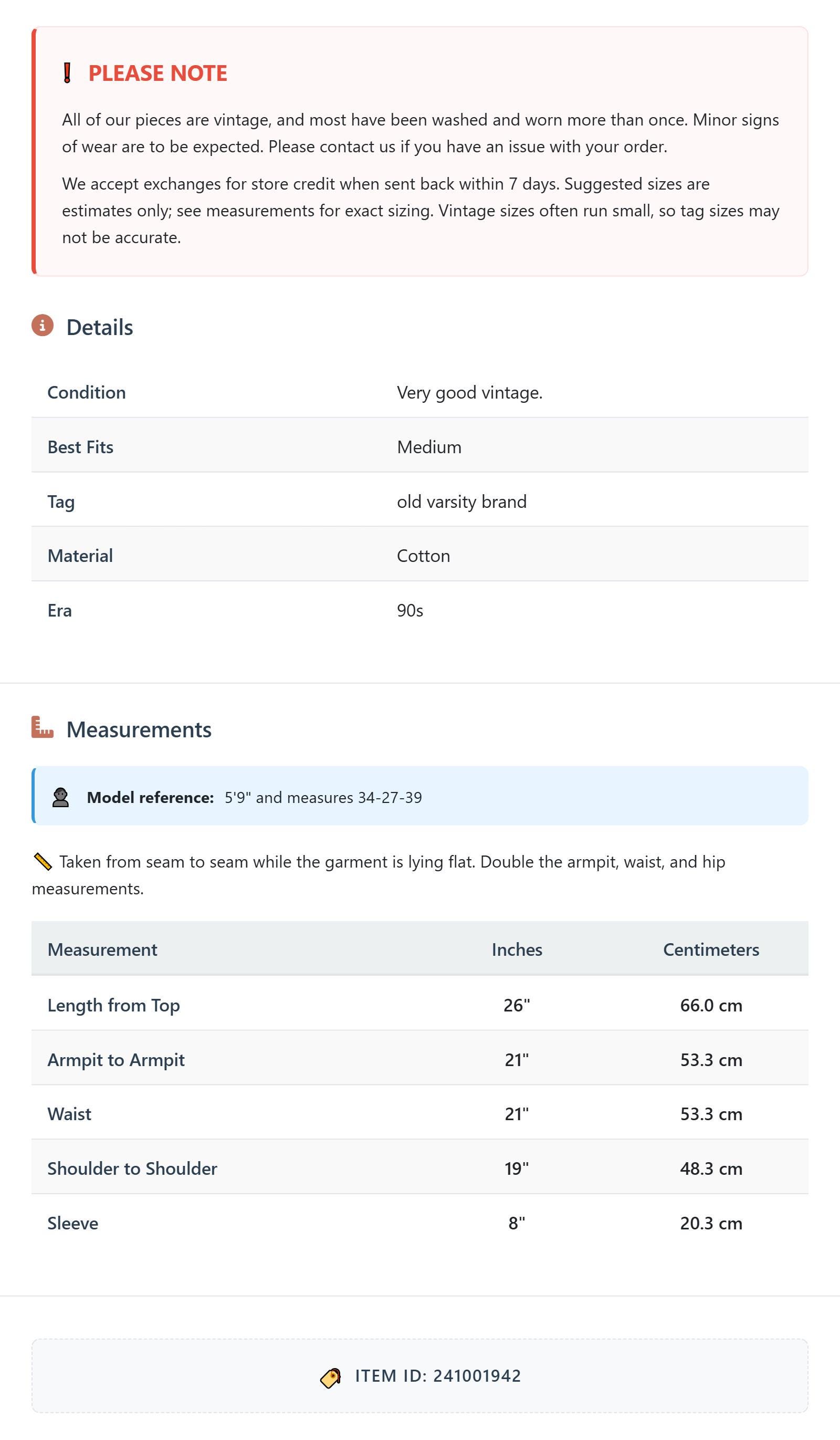 All of our pieces are vintage, and most have been washed and worn more than once. Minor signs of wear are to be expected. Please contact us if you have an issue with your order. We accept exchanges for store credit when sent back within 7 days.