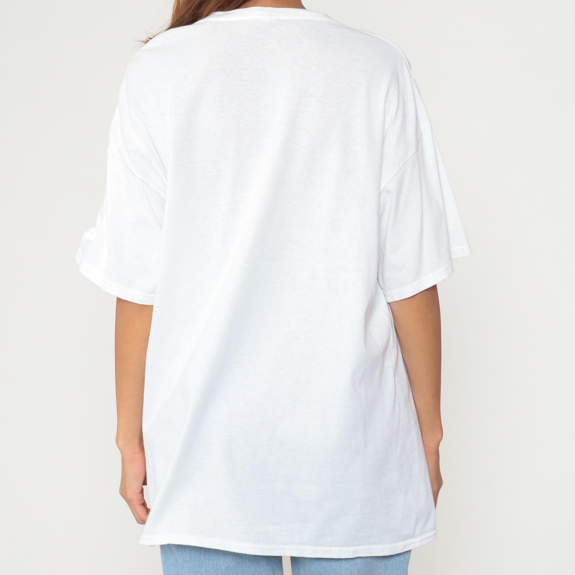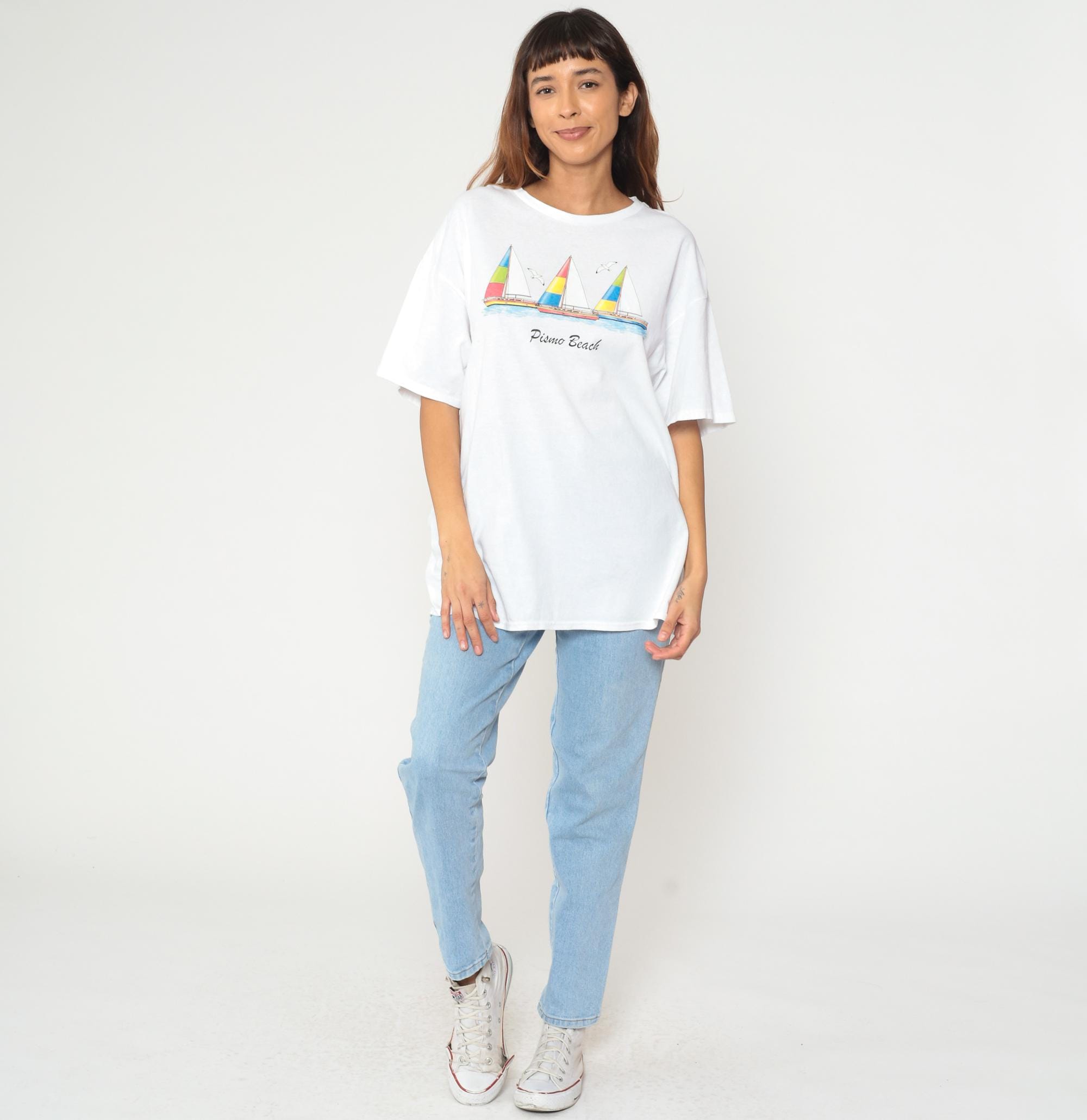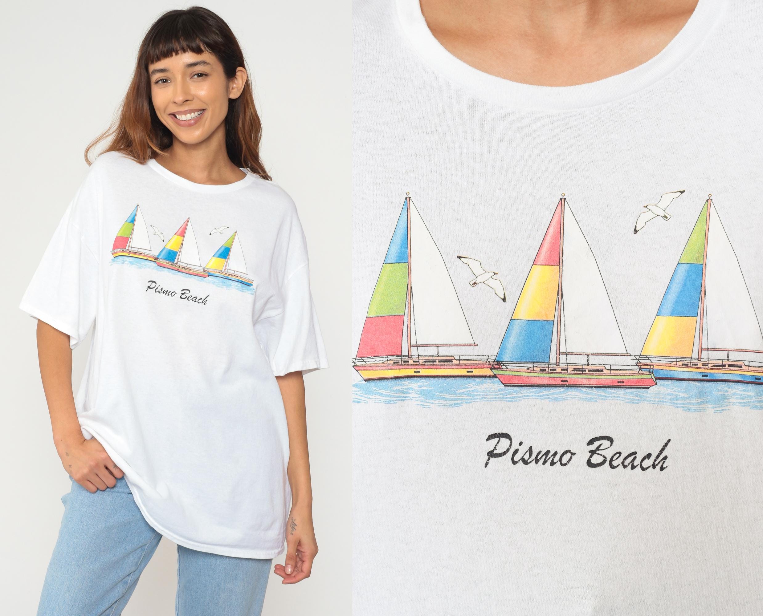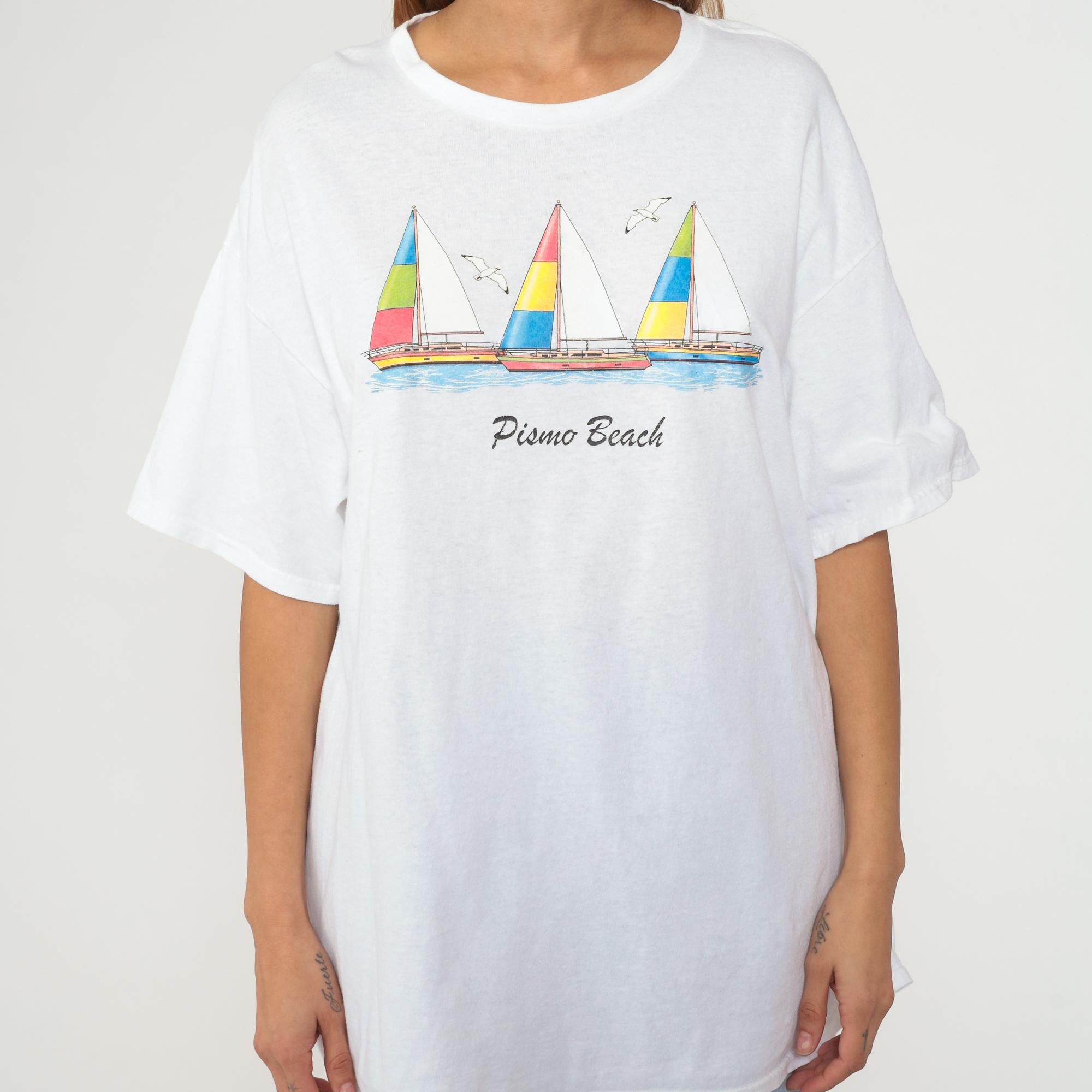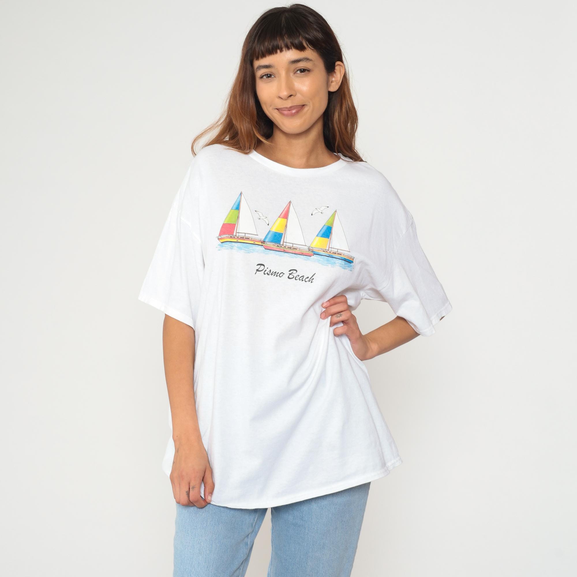Pismo Beach, California sailboat graphic t-shirt from the 1990s. White cotton tee featuring three colorful sailboats with striped sails in blue, yellow, green, pink, and coral floating on water with two seagulls above. "Pismo Beach" printed in black script below the graphic. Crew neck with short sleeves in an oversized, boxy fit.