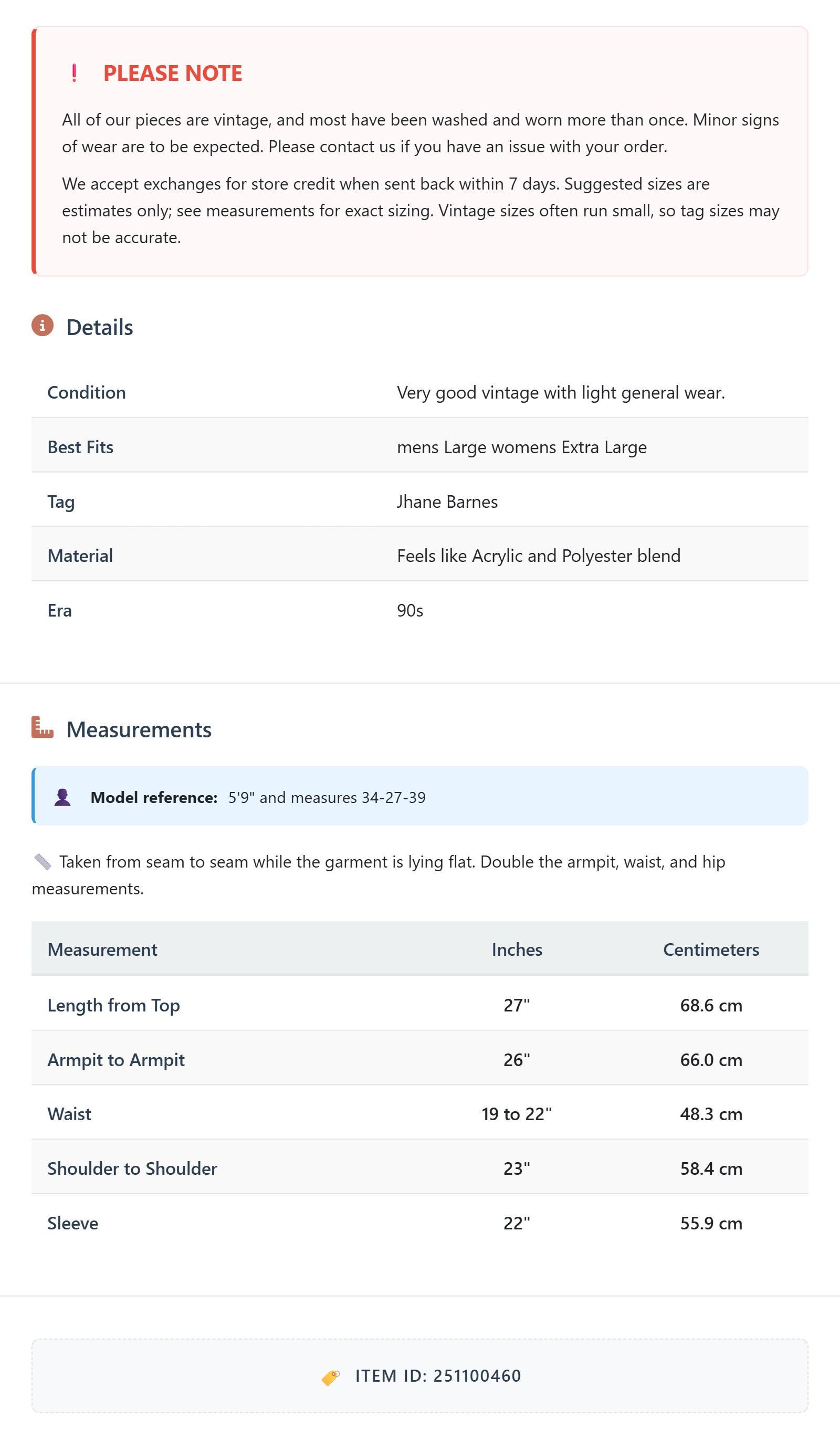 Suggested sizes are estimates only; see measurements for exact sizing. Vintage sizes often run small, so tag sizes may not be accurate.