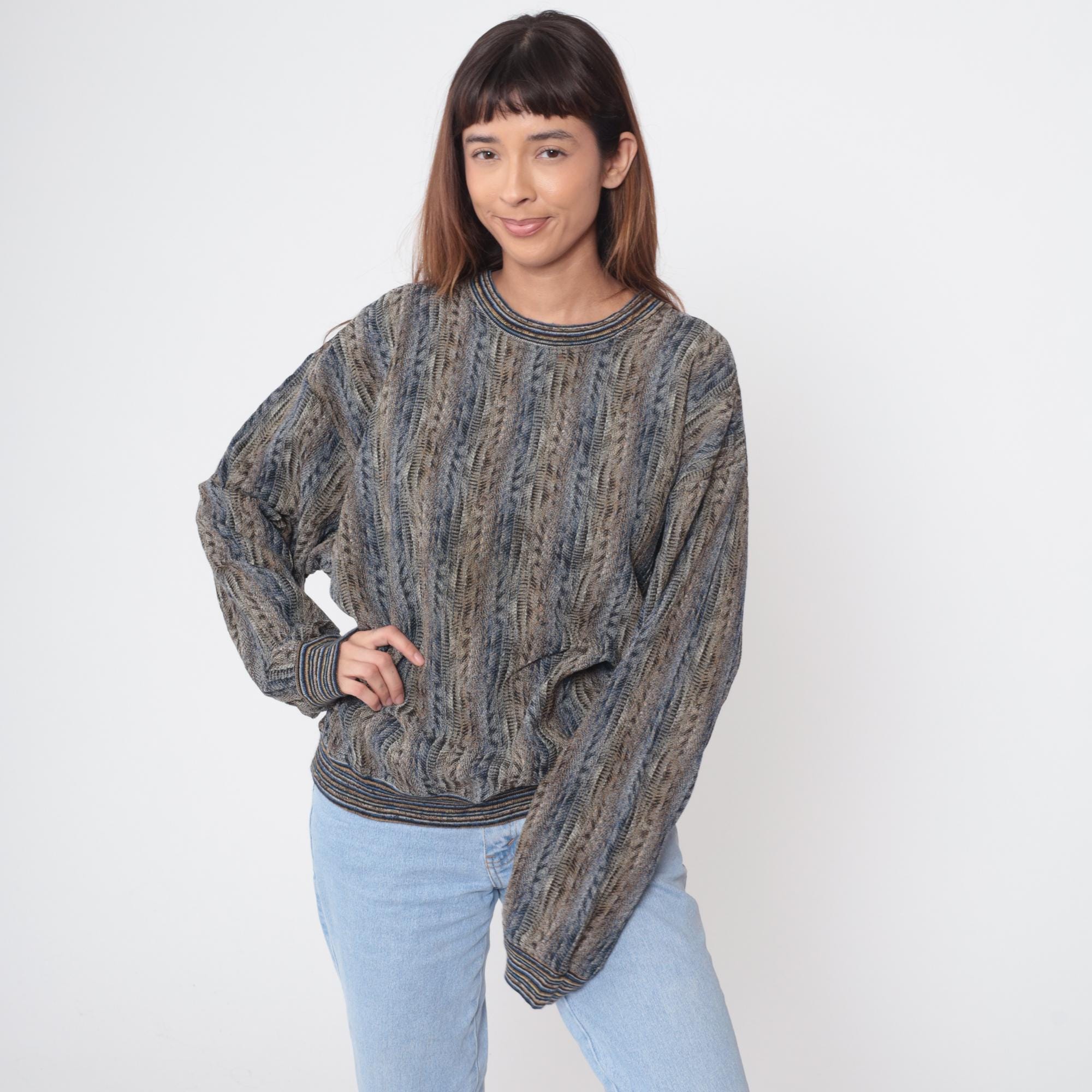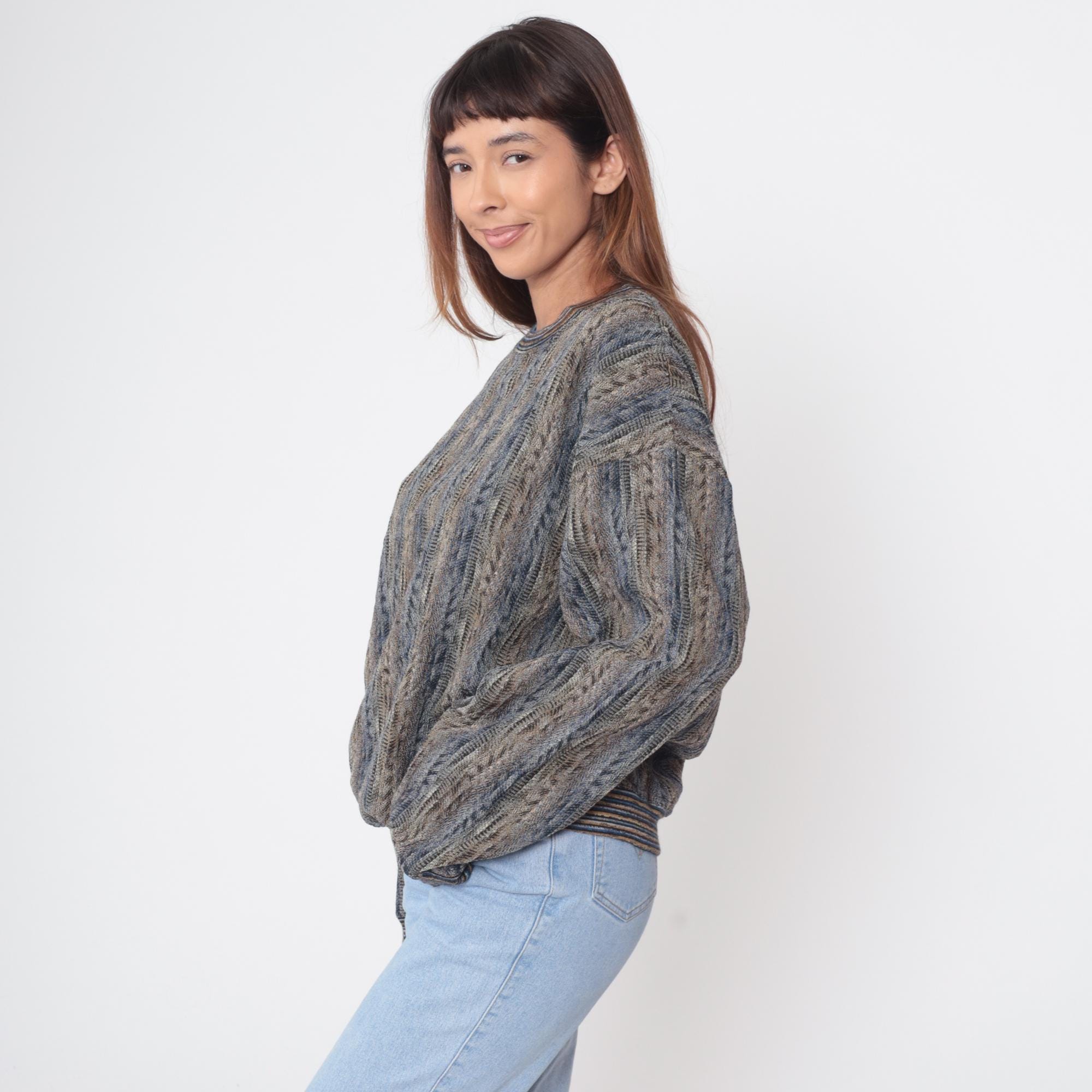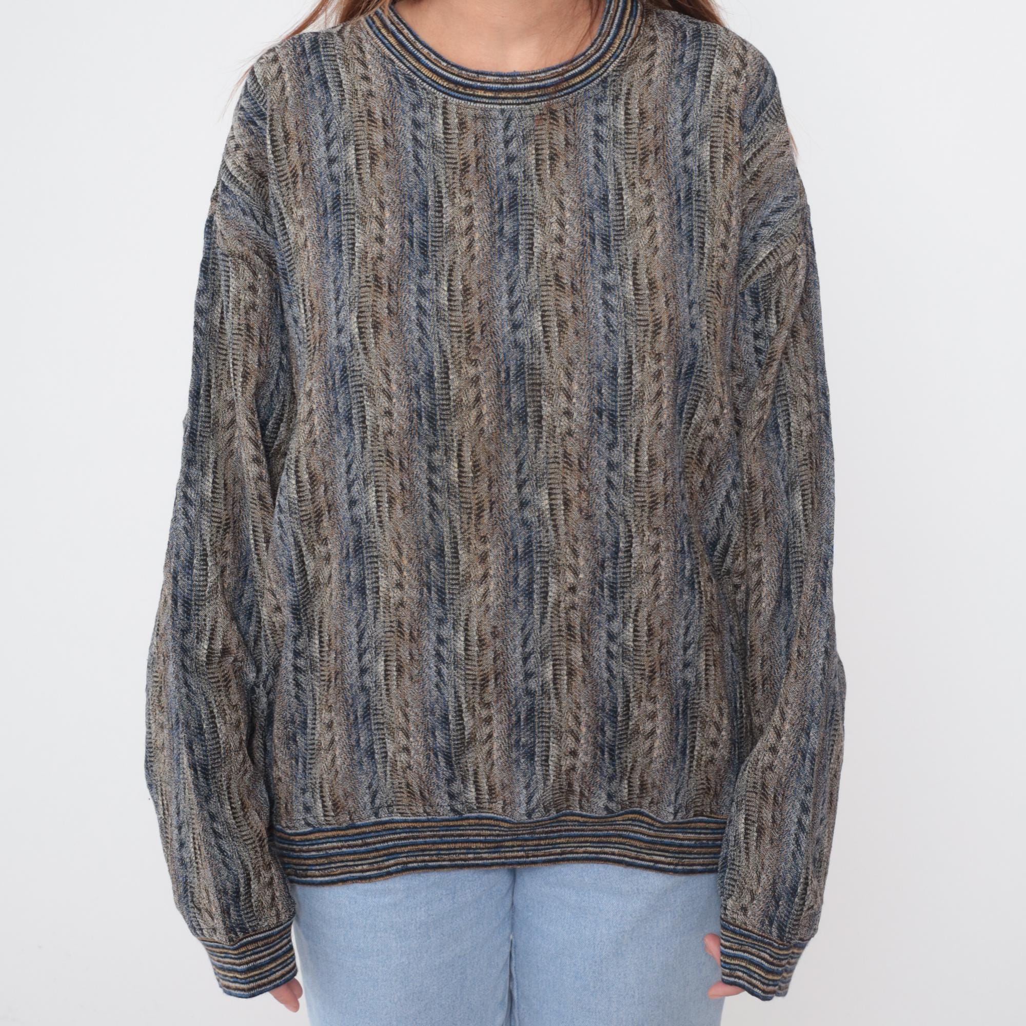 Jhane Barnes Menswear 1990s knit sweater. This long-sleeve sweater features a colorful textured vertical knit pattern in blue, brown, tan, and black earth tones. It has a crew neck, ribbed cuffs, and a ribbed hem with stripe accents.
