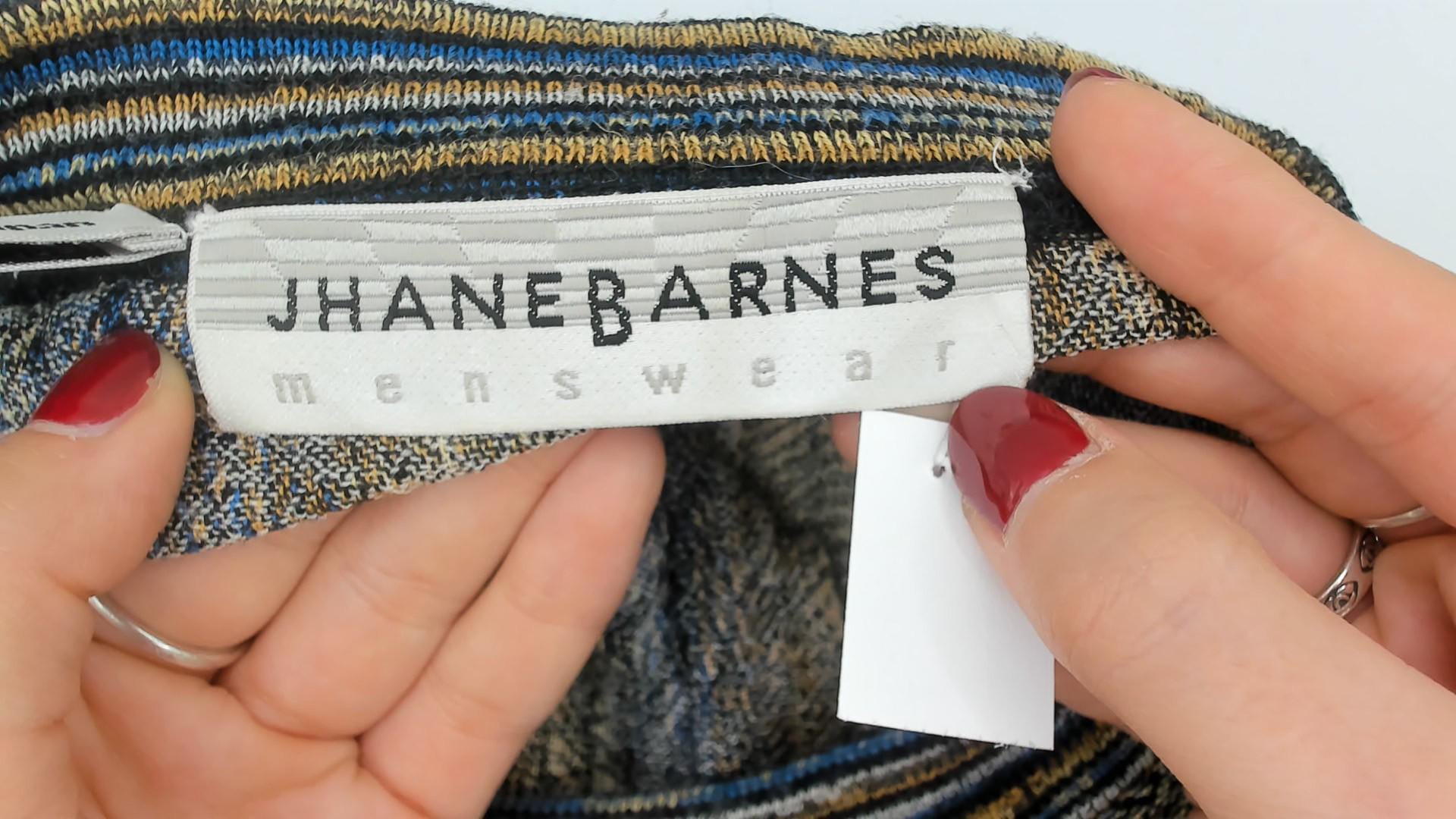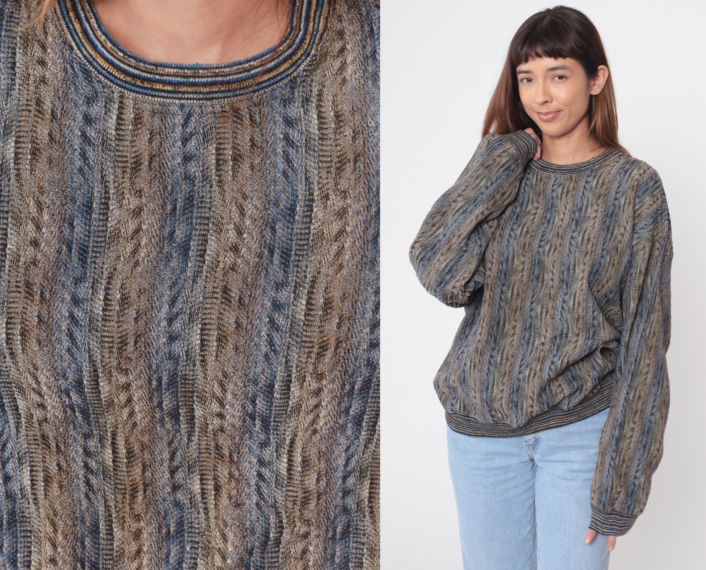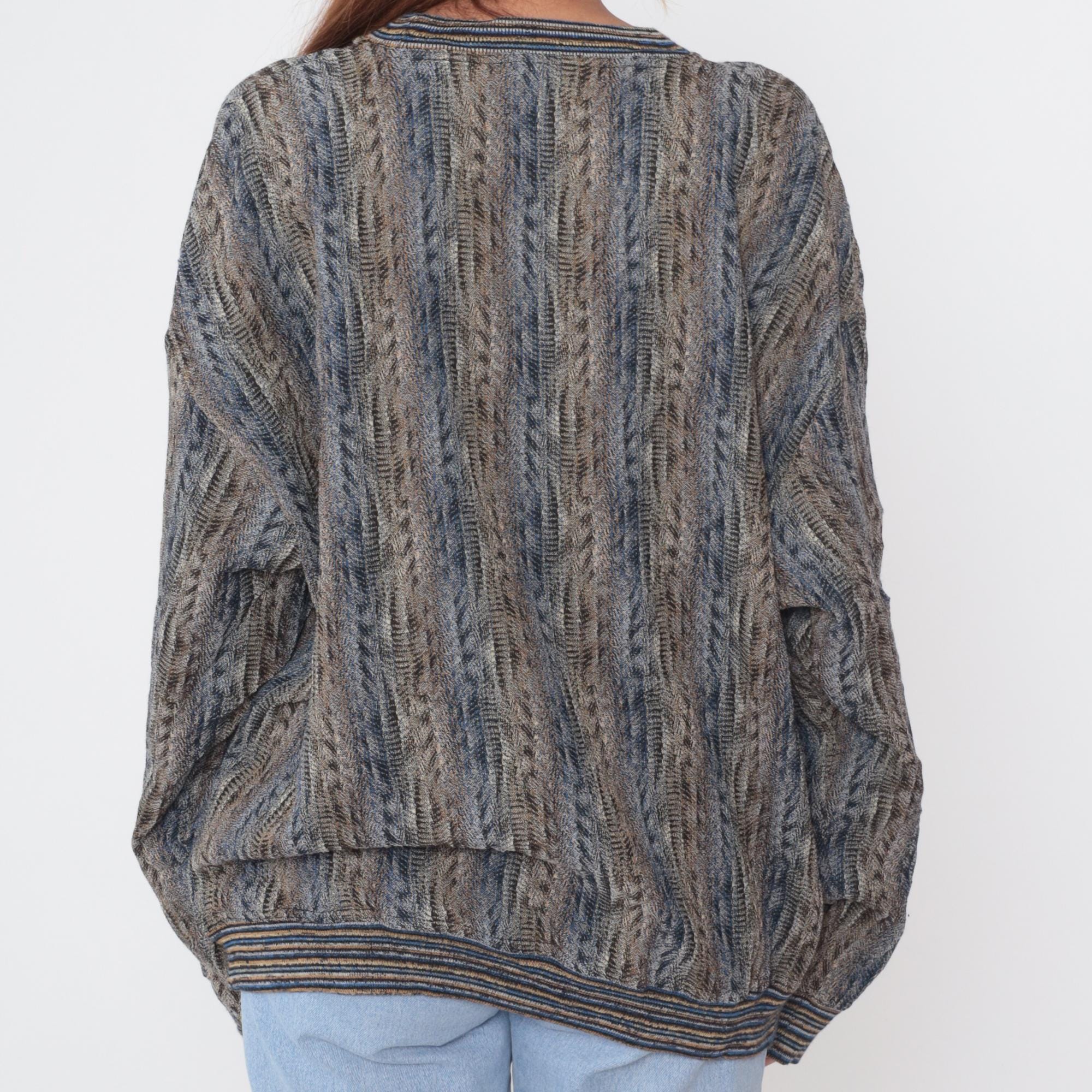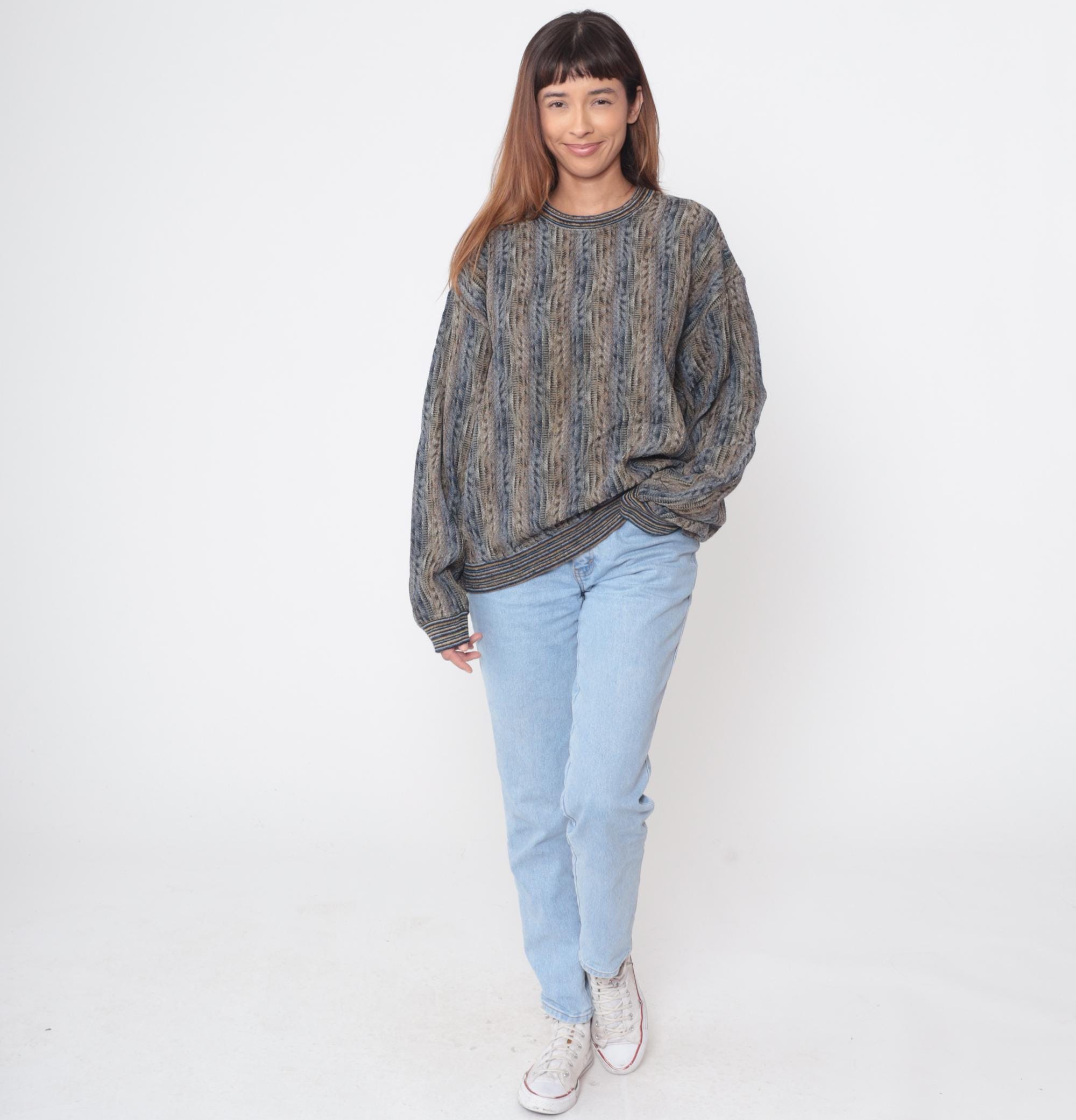 Jhane Barnes Menswear 1990s knit sweater. This long-sleeve sweater features a colorful textured vertical knit pattern in blue, brown, tan, and black earth tones. It has a crew neck, ribbed cuffs, and a ribbed hem with stripe accents.