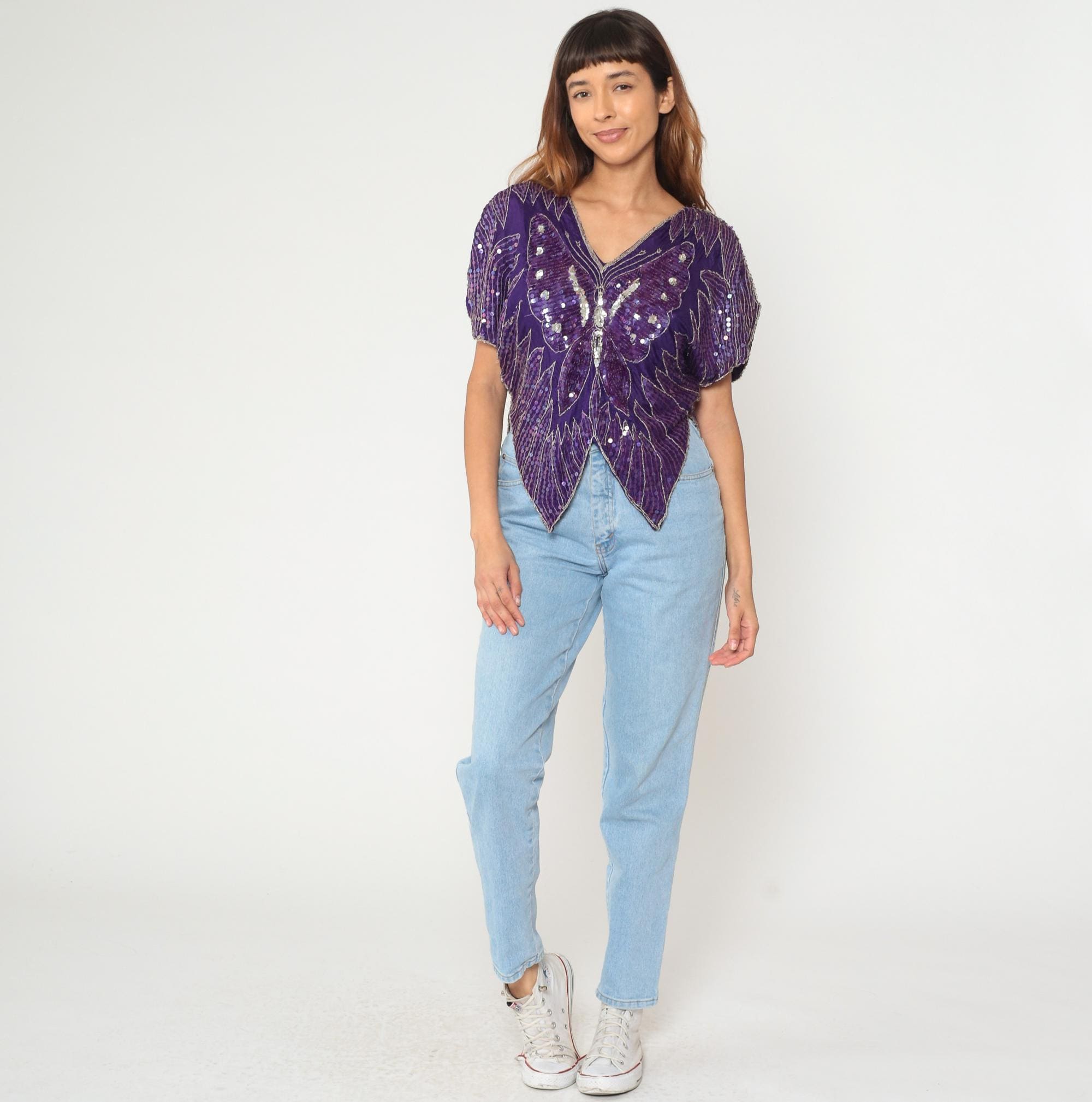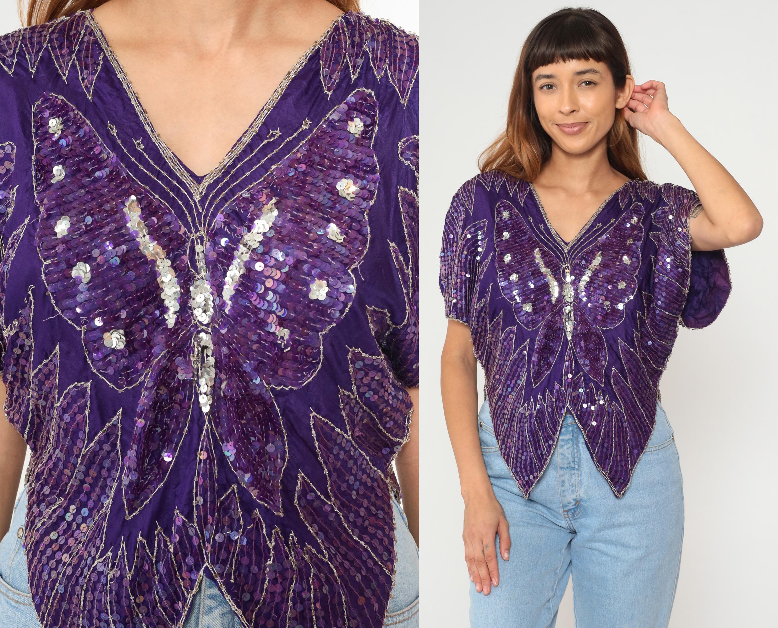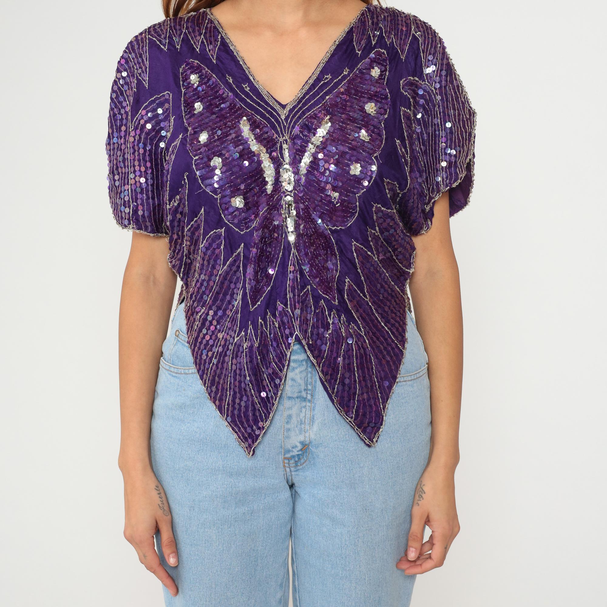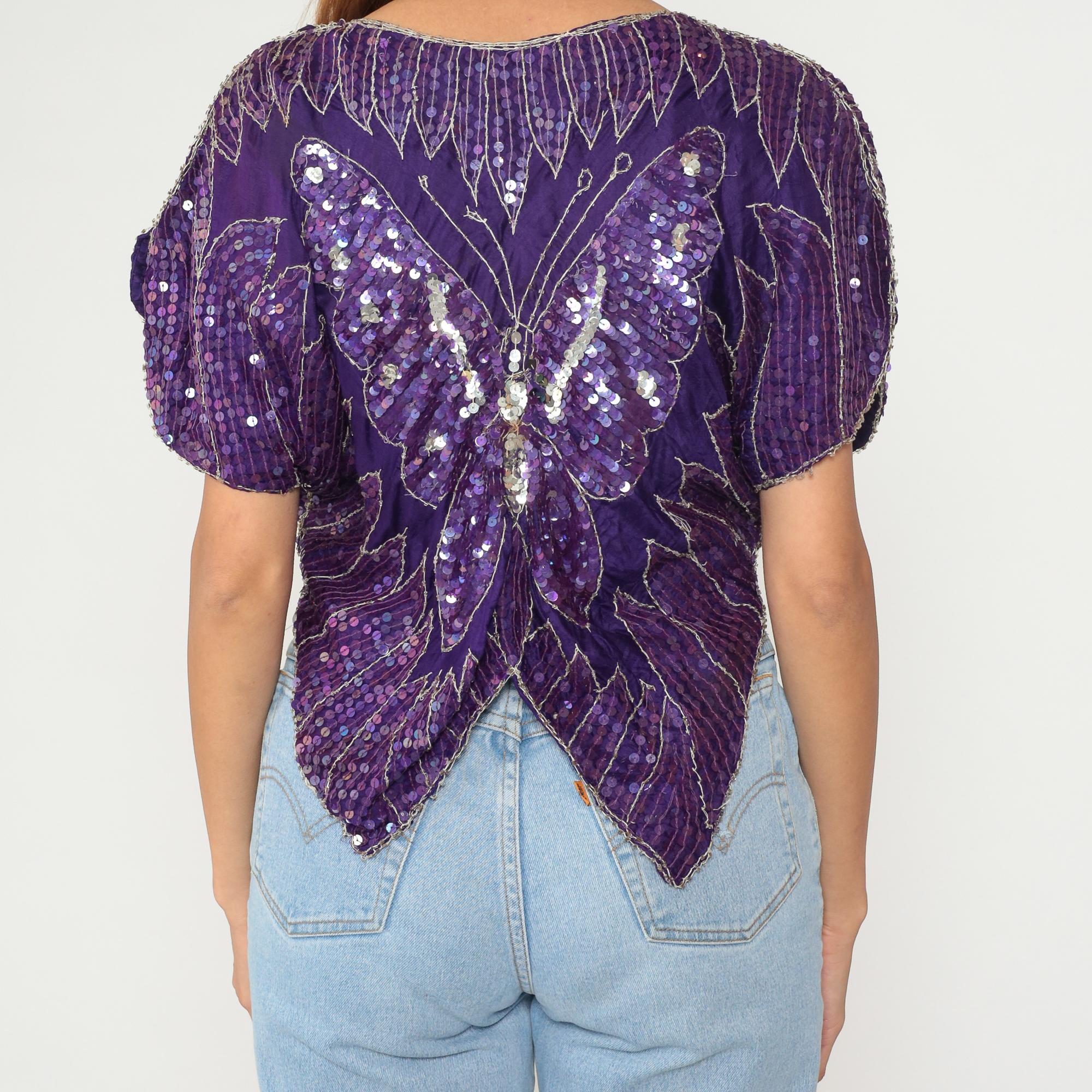 Vintage 90s blouse in purpler sequins with a butterfly design. Cropped fit with short sleeves.