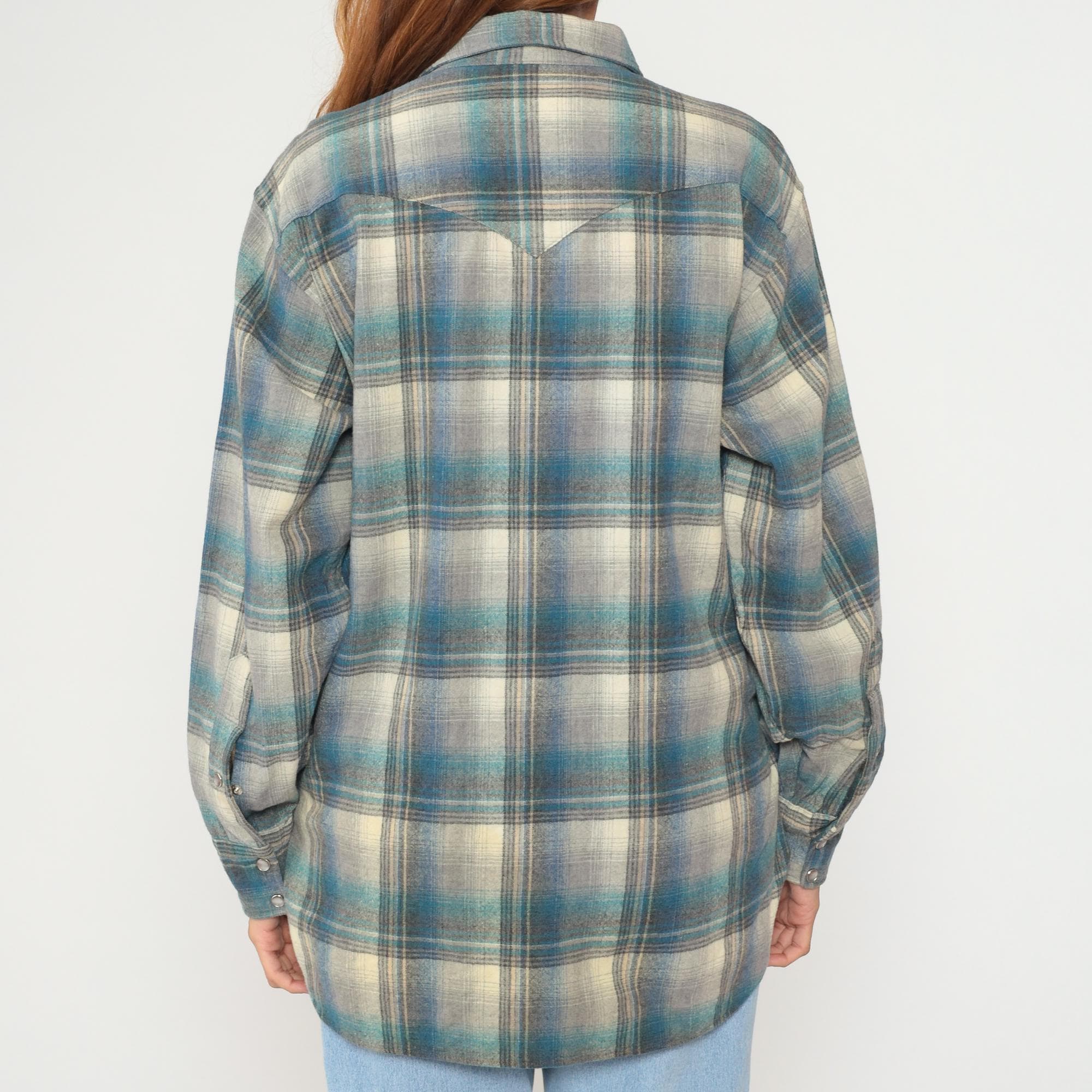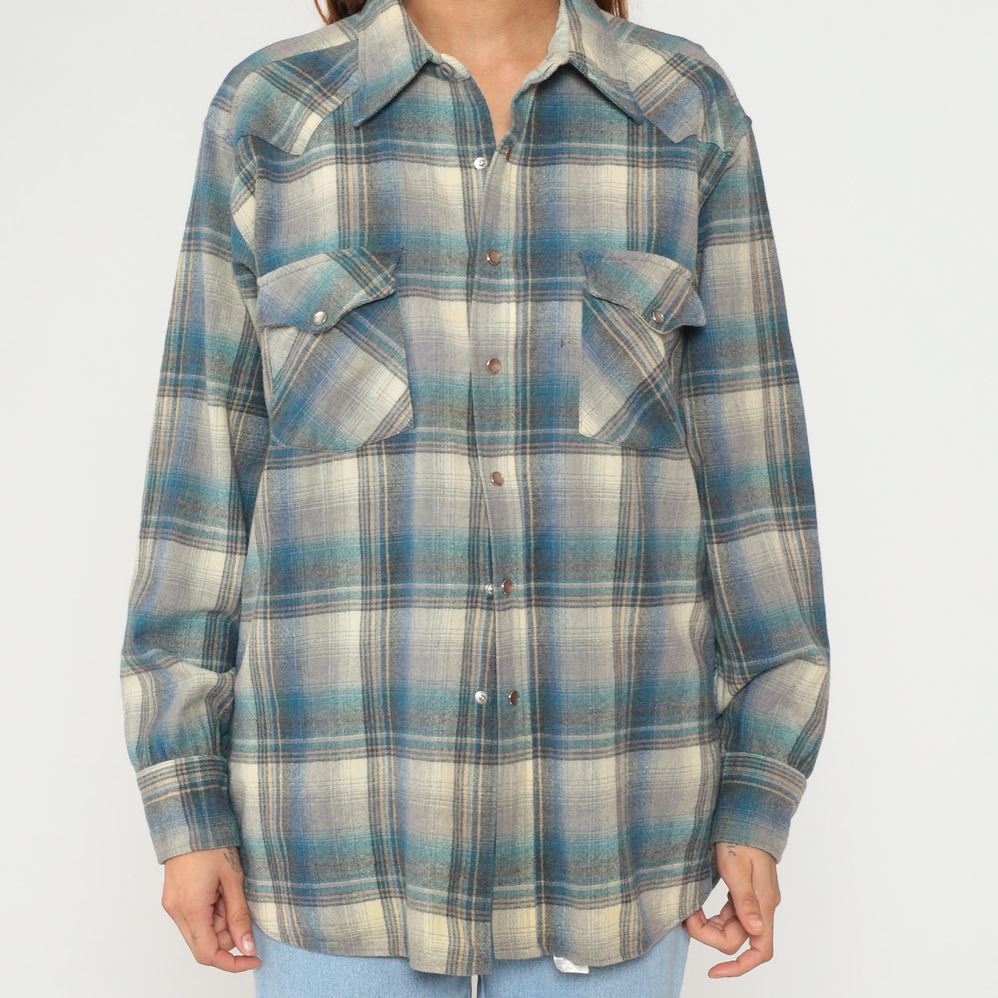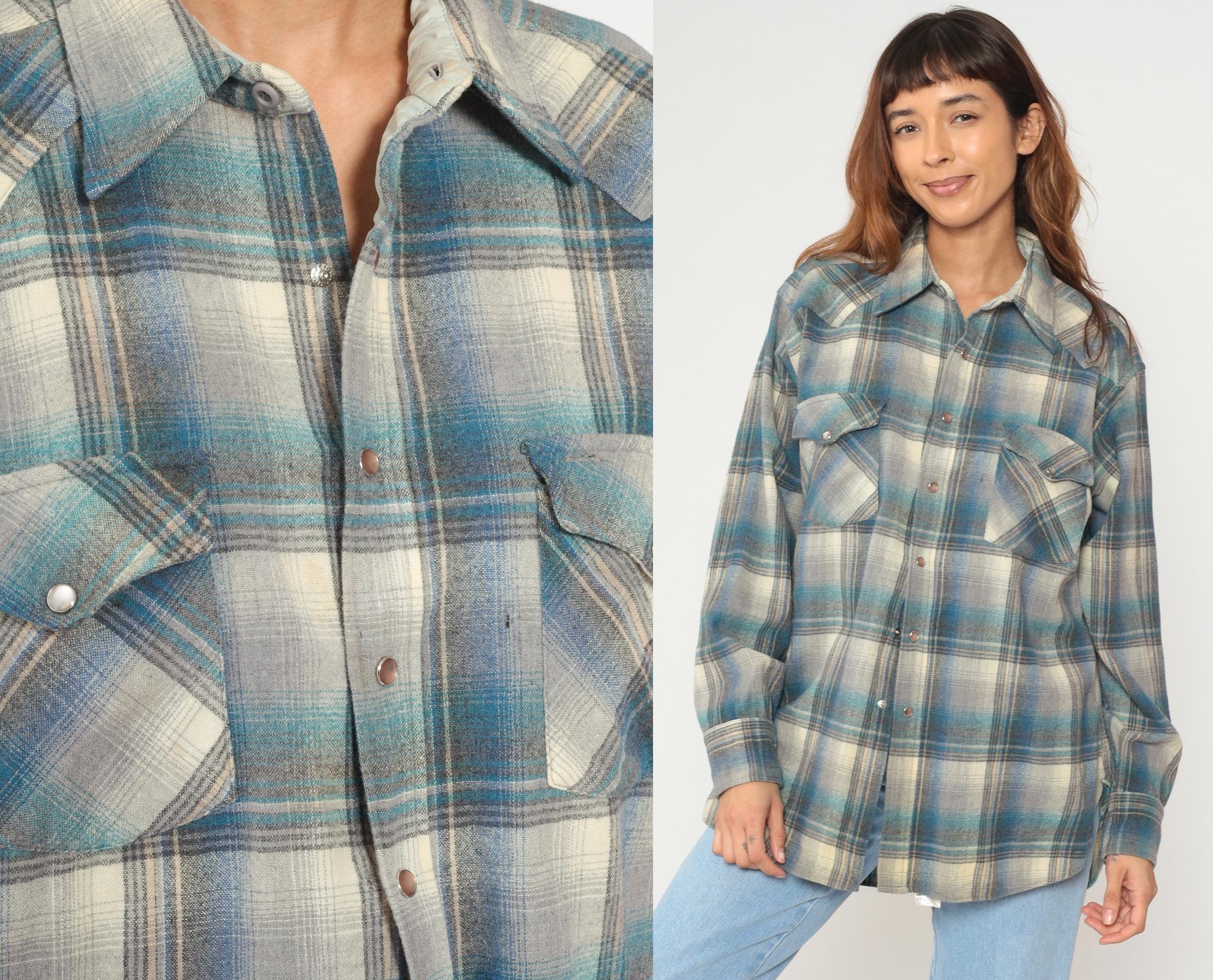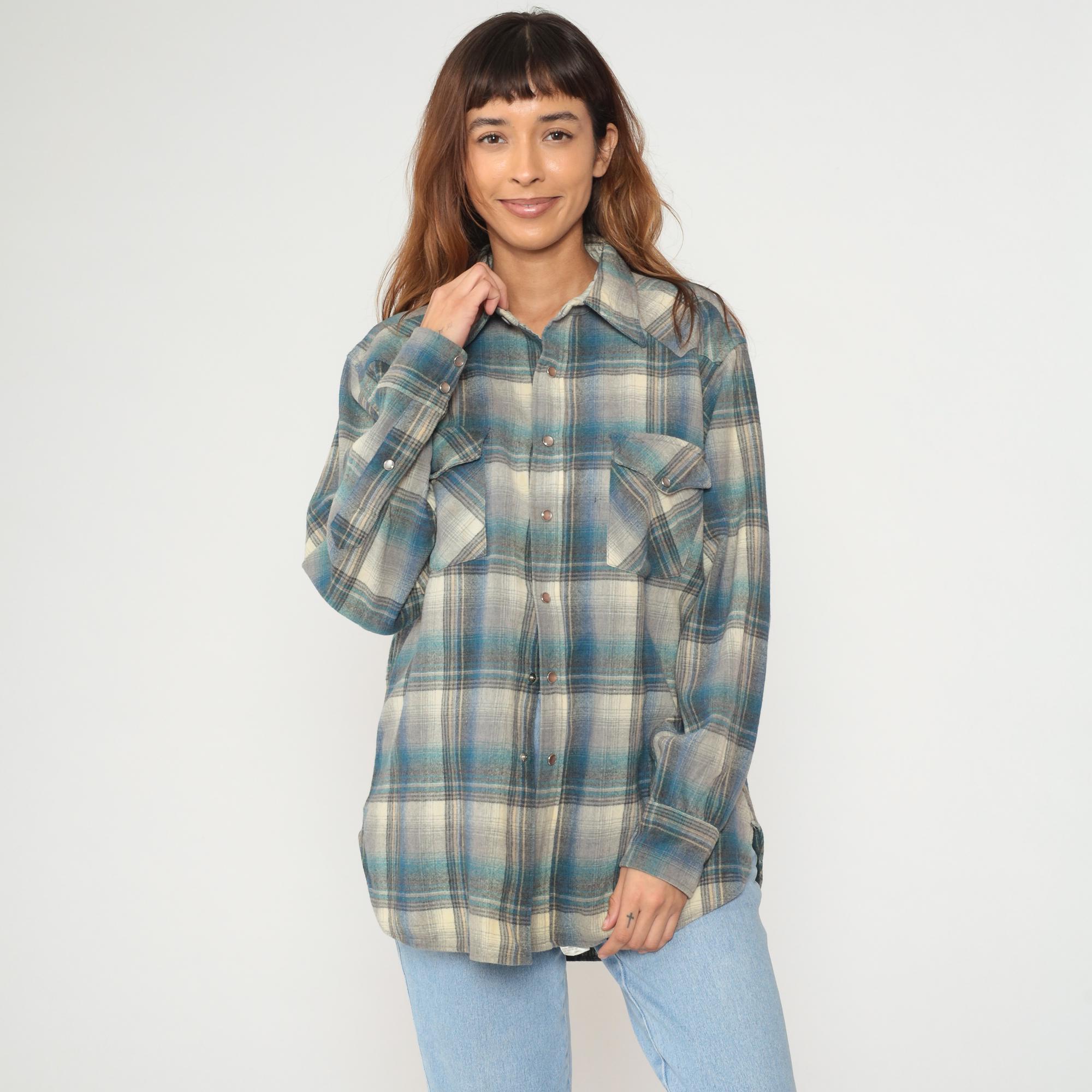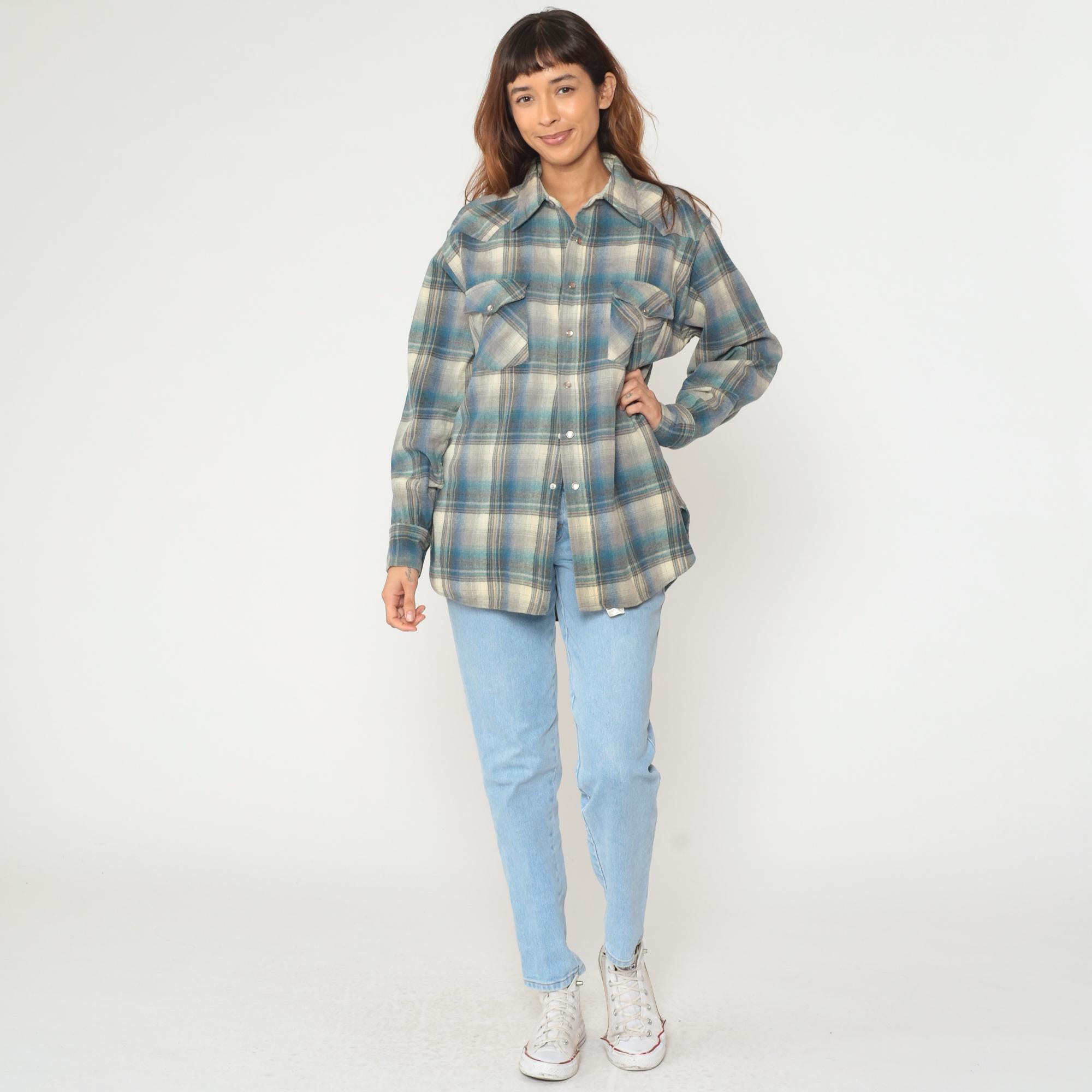 Vintage 1990s Pendleton Board Shirt in blue, green, and grey plaid, crafted from virgin wool. This vintage piece features two front chest flap pockets, button front closure, and a straight cut. Made in the USA. Distressed with small holes throughout.