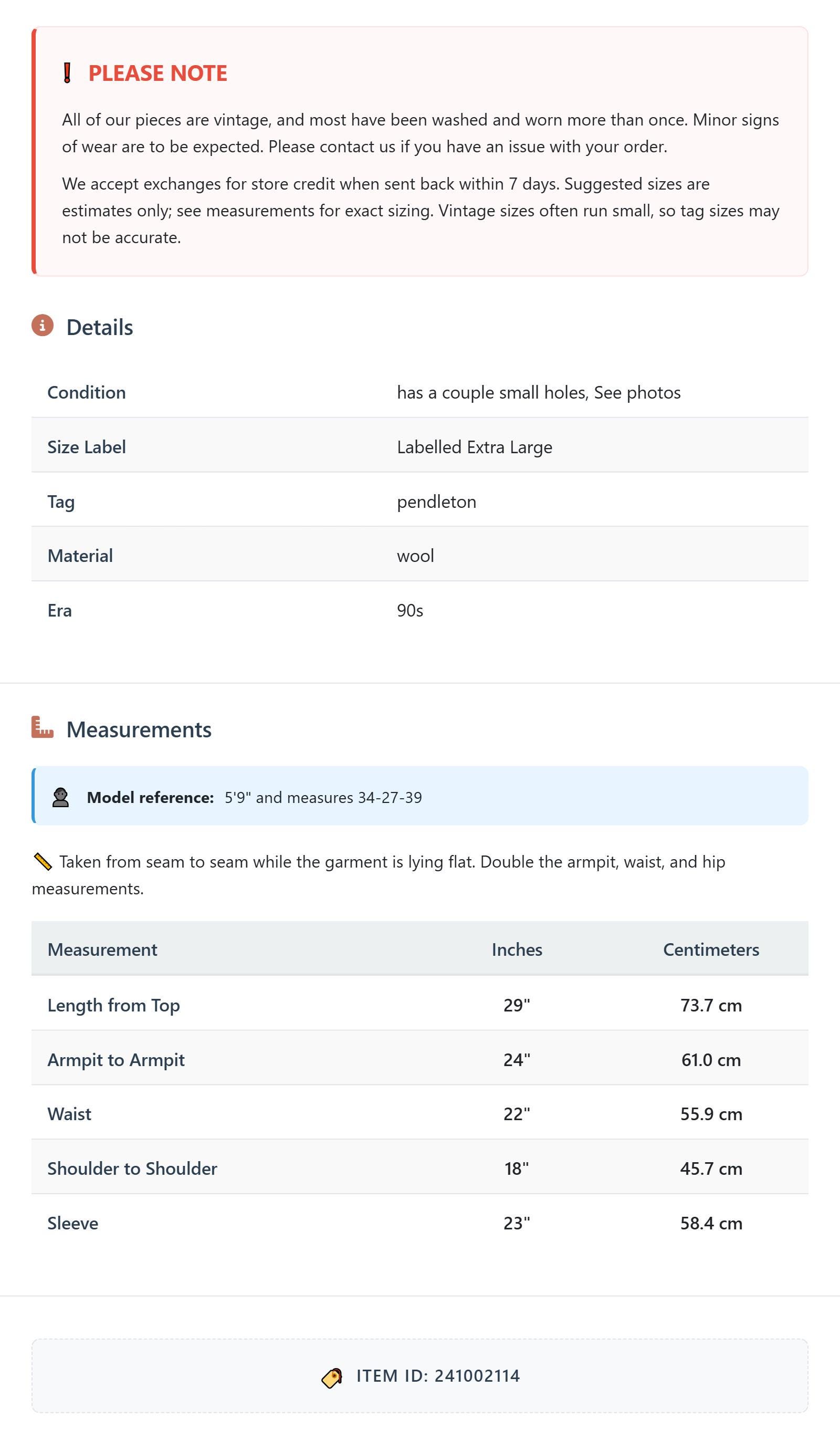 All of our pieces are vintage, and most have been washed and worn more than once. Minor signs of wear are to be expected. Please contact us if you have an issue with your order. We accept exchanges for store credit when sent back within 7 days.
