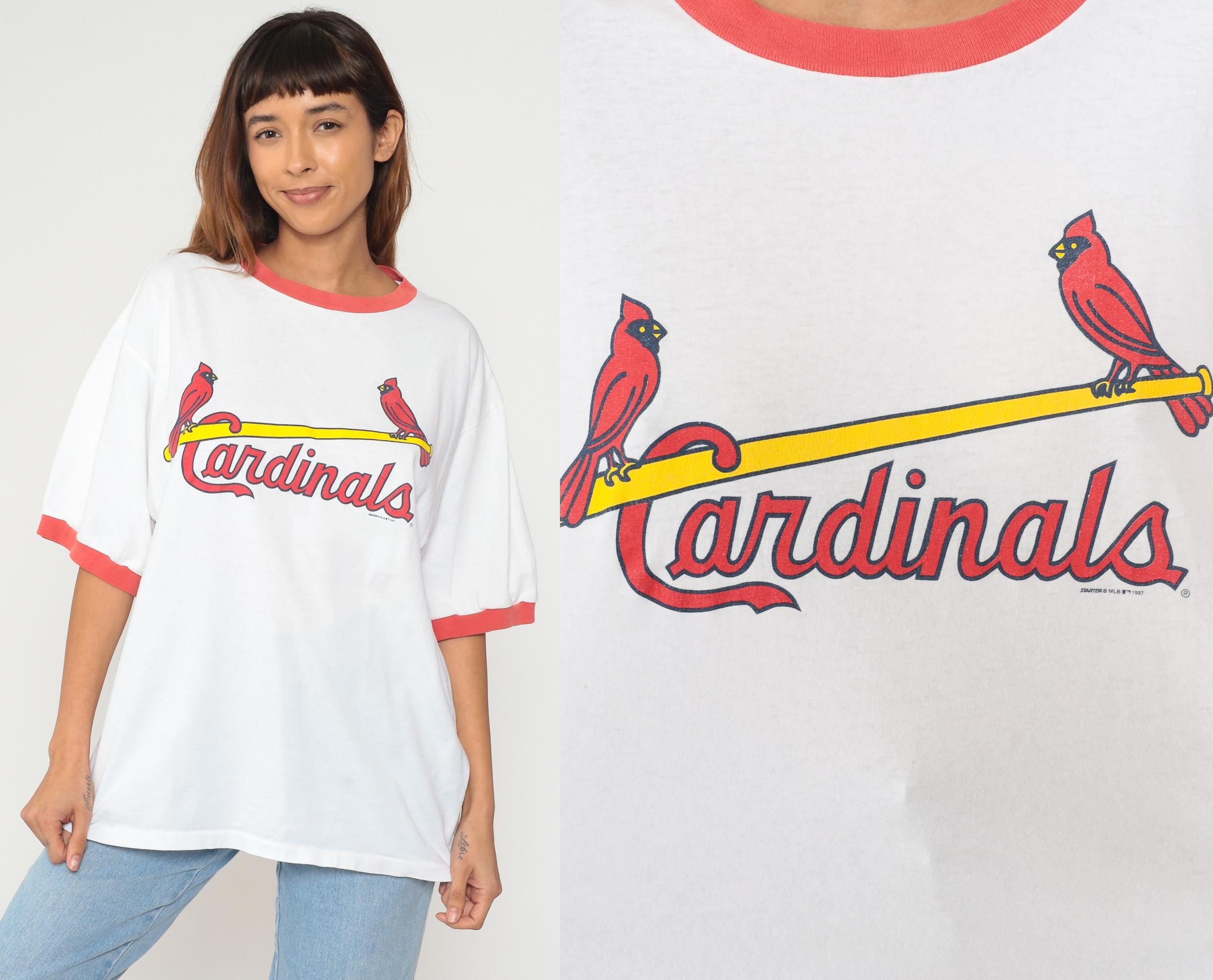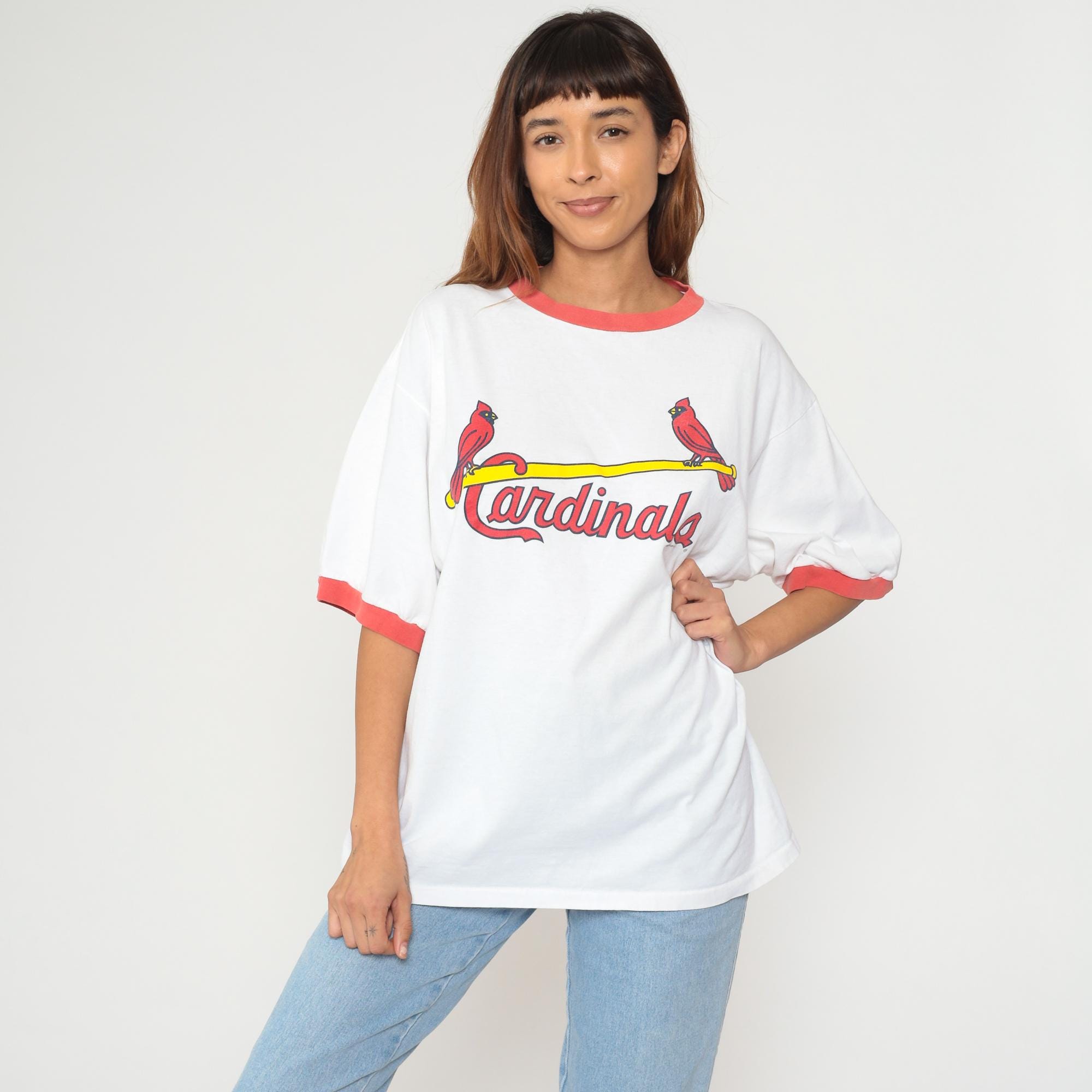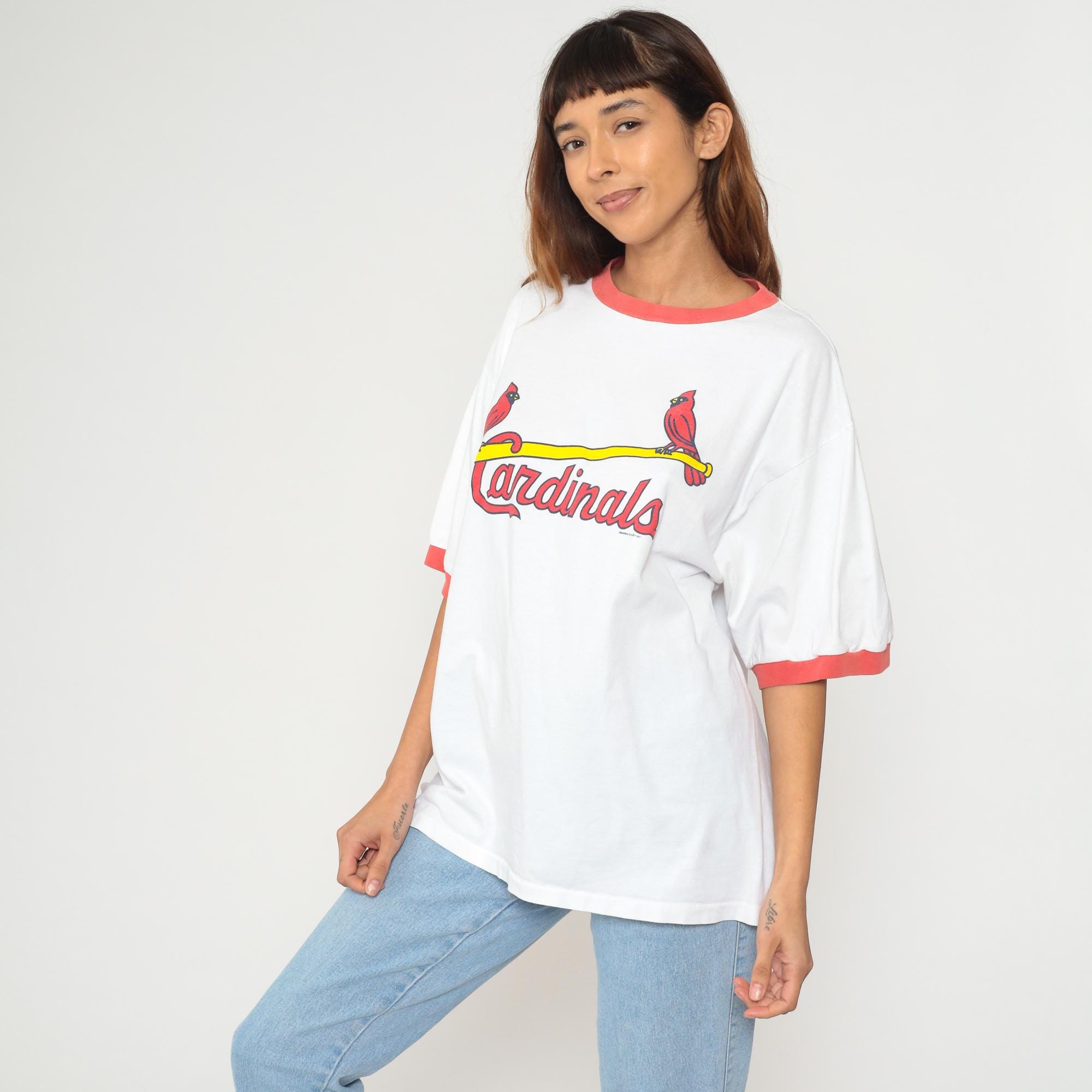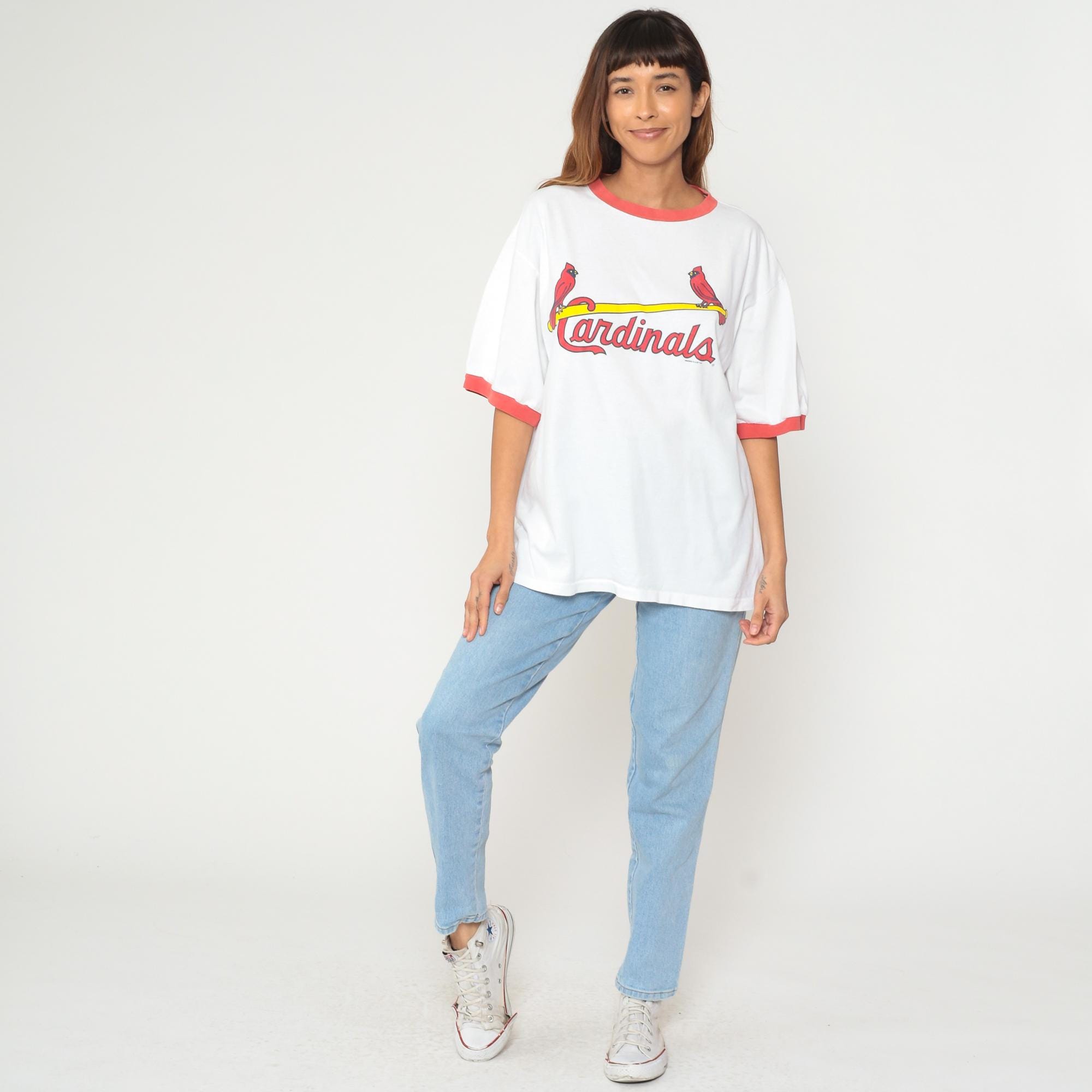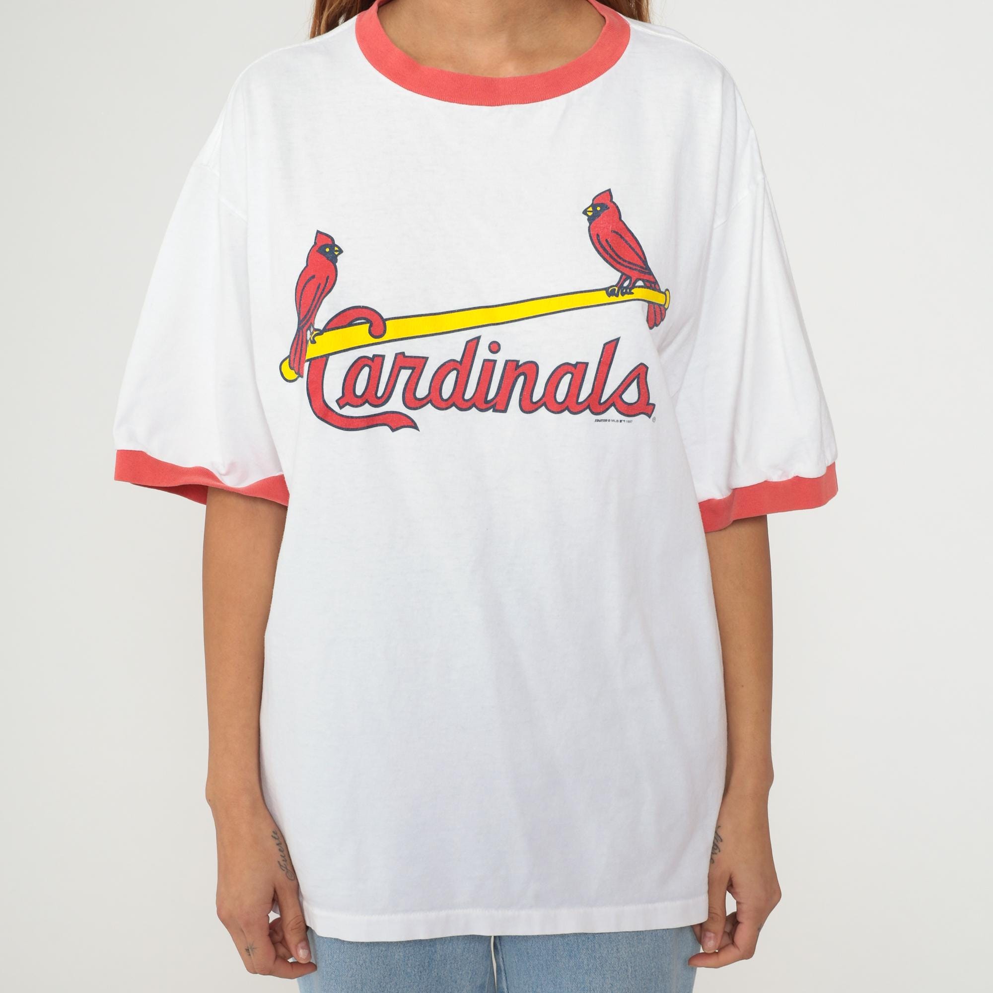 Vintage 90s ringer t shirt with the St Louis Cardinals baseball logo on the front.
