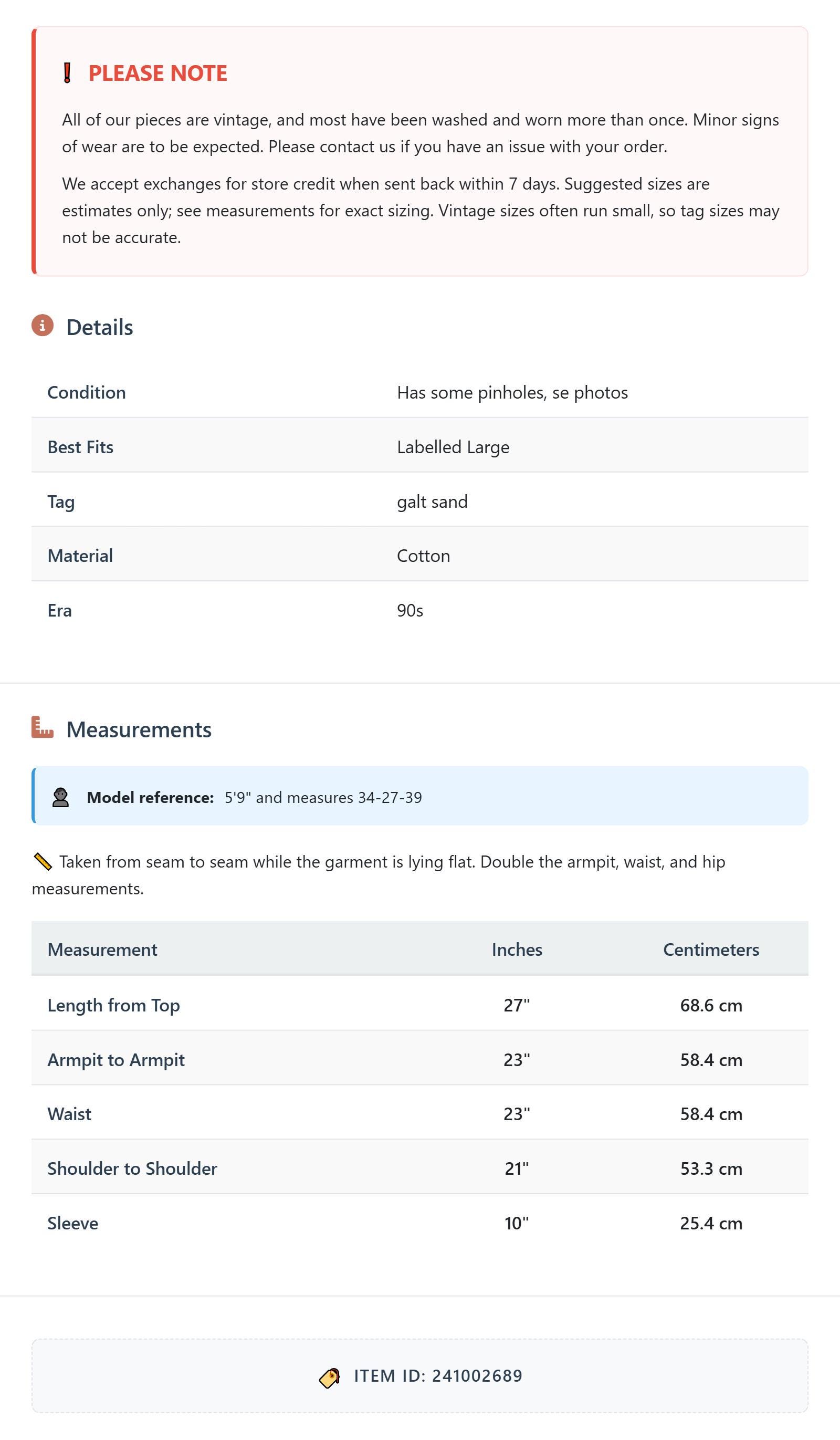 Suggested sizes are estimates only; see measurements for exact sizing. Vintage sizes often run small, so tag sizes may not be accurate.