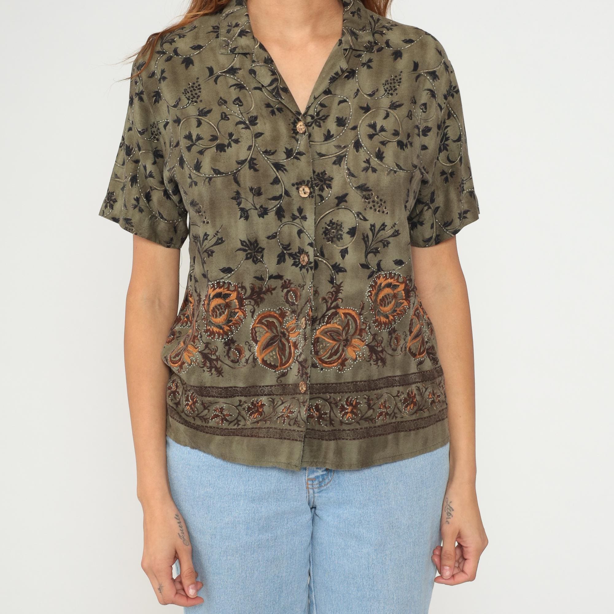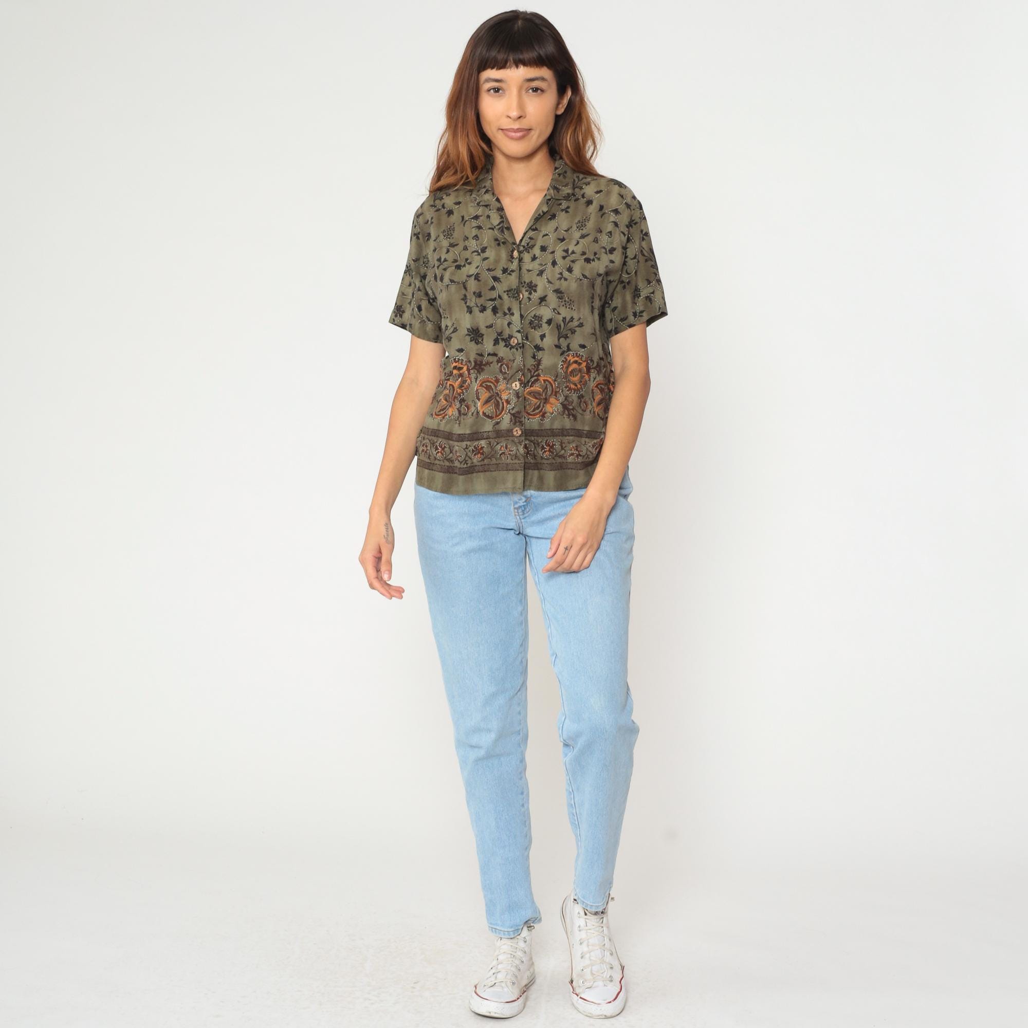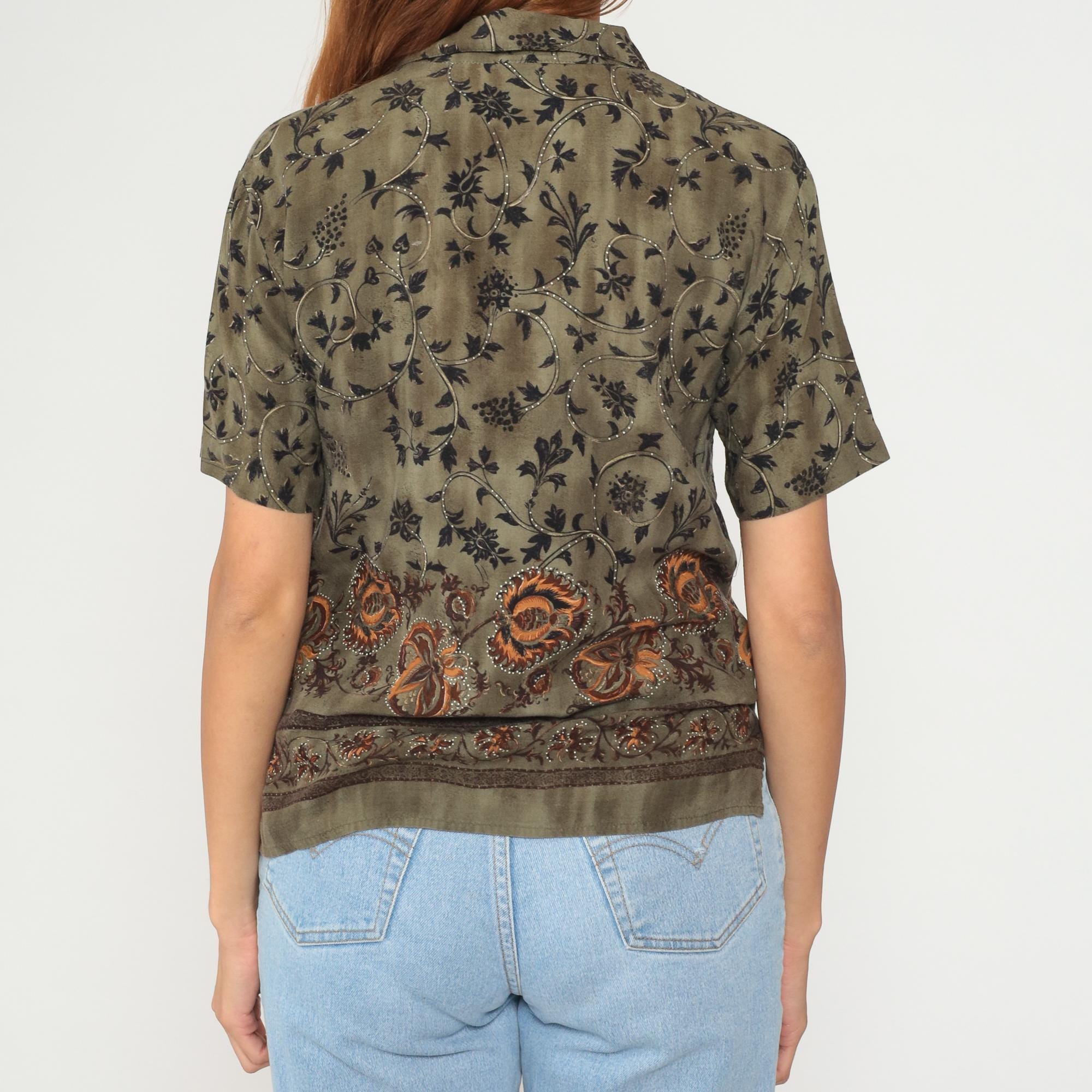 90s rayon blouse in olive green with paisley and botanical floral print. Decorative border print along the hem with orange and brown paisley motifs outlined in dotted details. Short sleeves, button front closure, and notched collar. Tagged Teddi Petites. The print includes swirling vine patterns with small flowers and leaves throughout the body, transitioning to the ornate paisley border at the bottom hem.