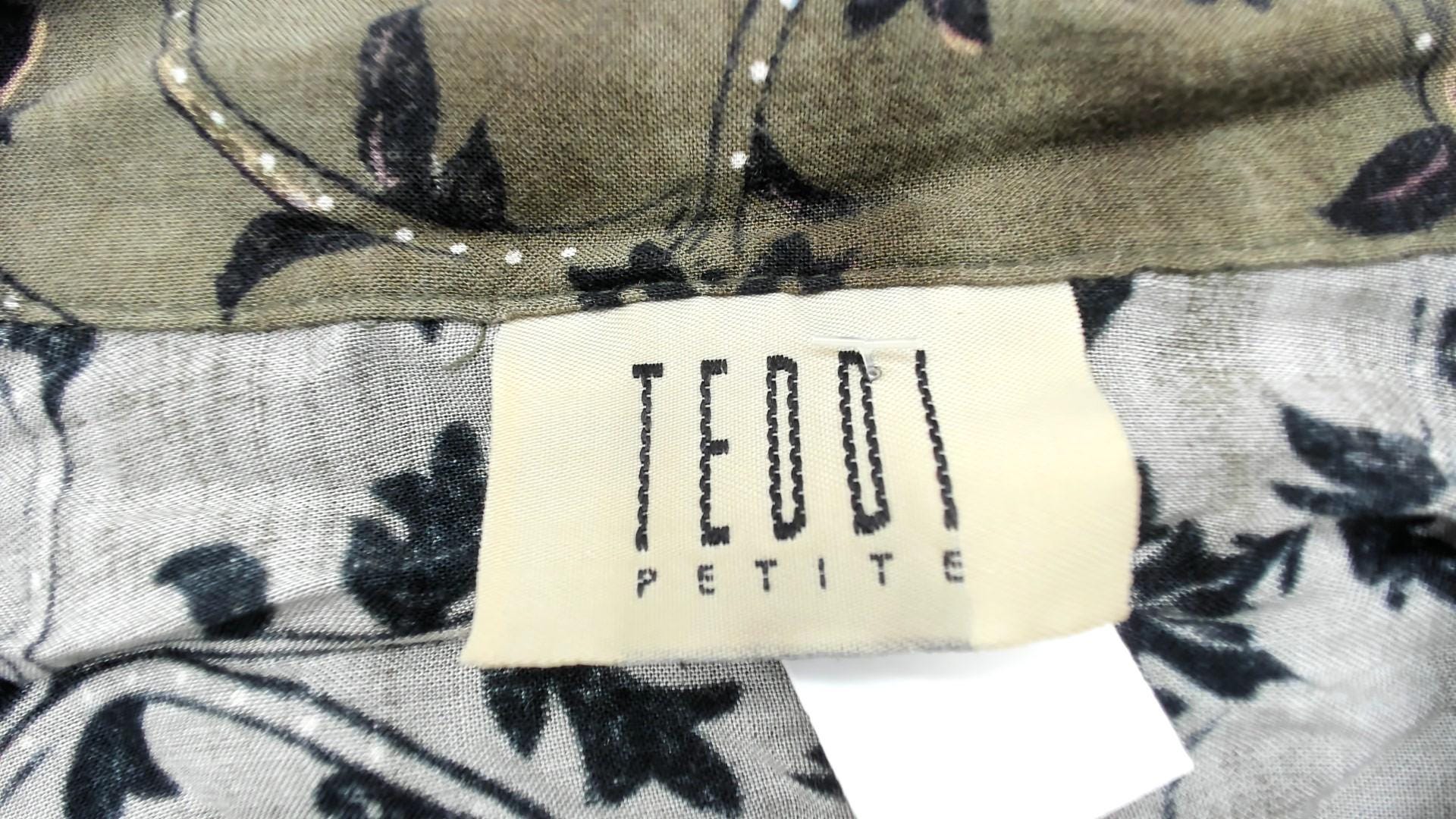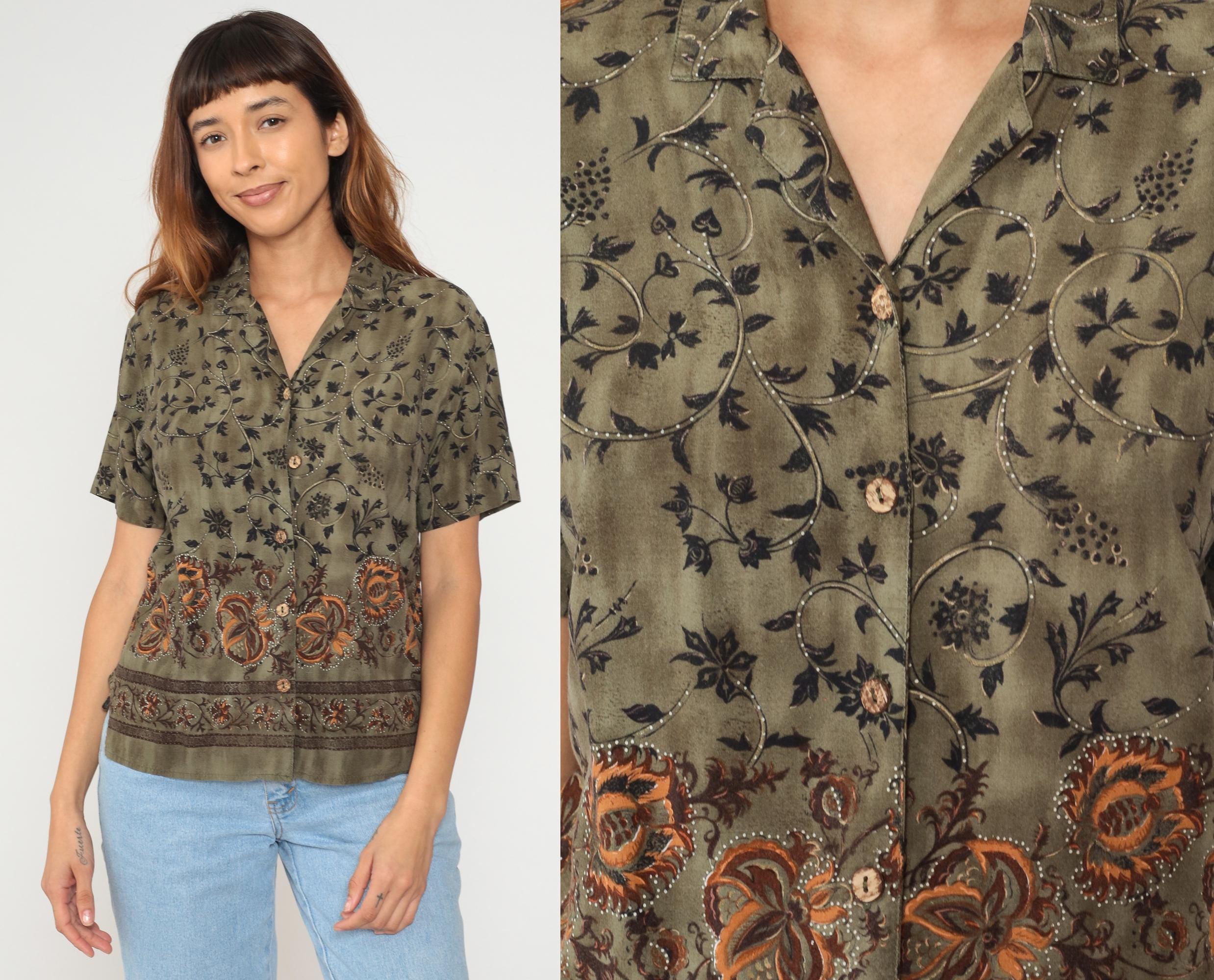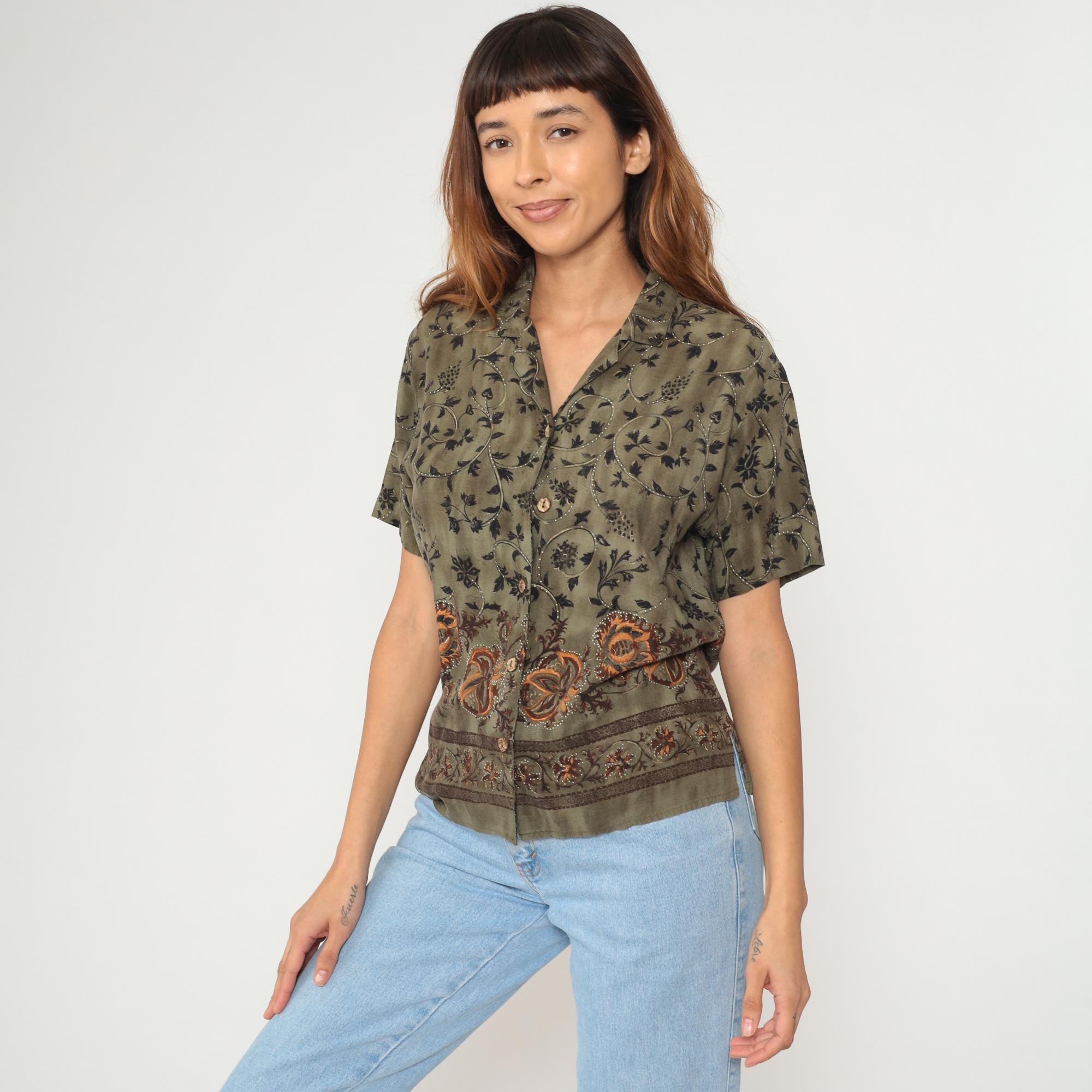 90s rayon blouse in olive green with paisley and botanical floral print. Decorative border print along the hem with orange and brown paisley motifs outlined in dotted details. Short sleeves, button front closure, and notched collar. Tagged Teddi Petites. The print includes swirling vine patterns with small flowers and leaves throughout the body, transitioning to the ornate paisley border at the bottom hem.