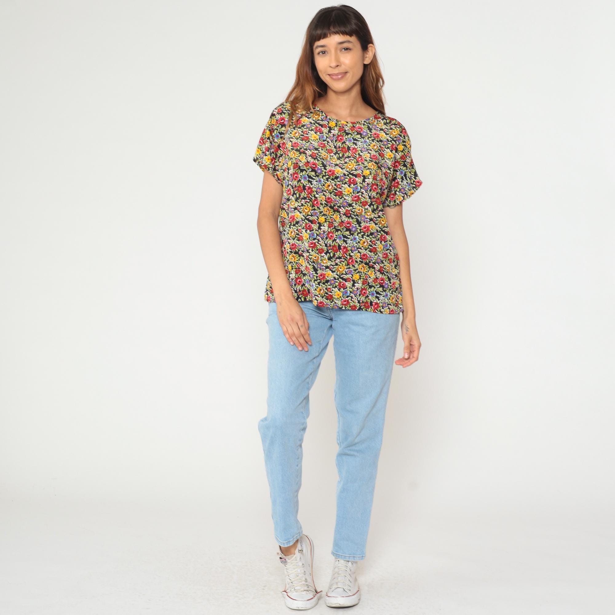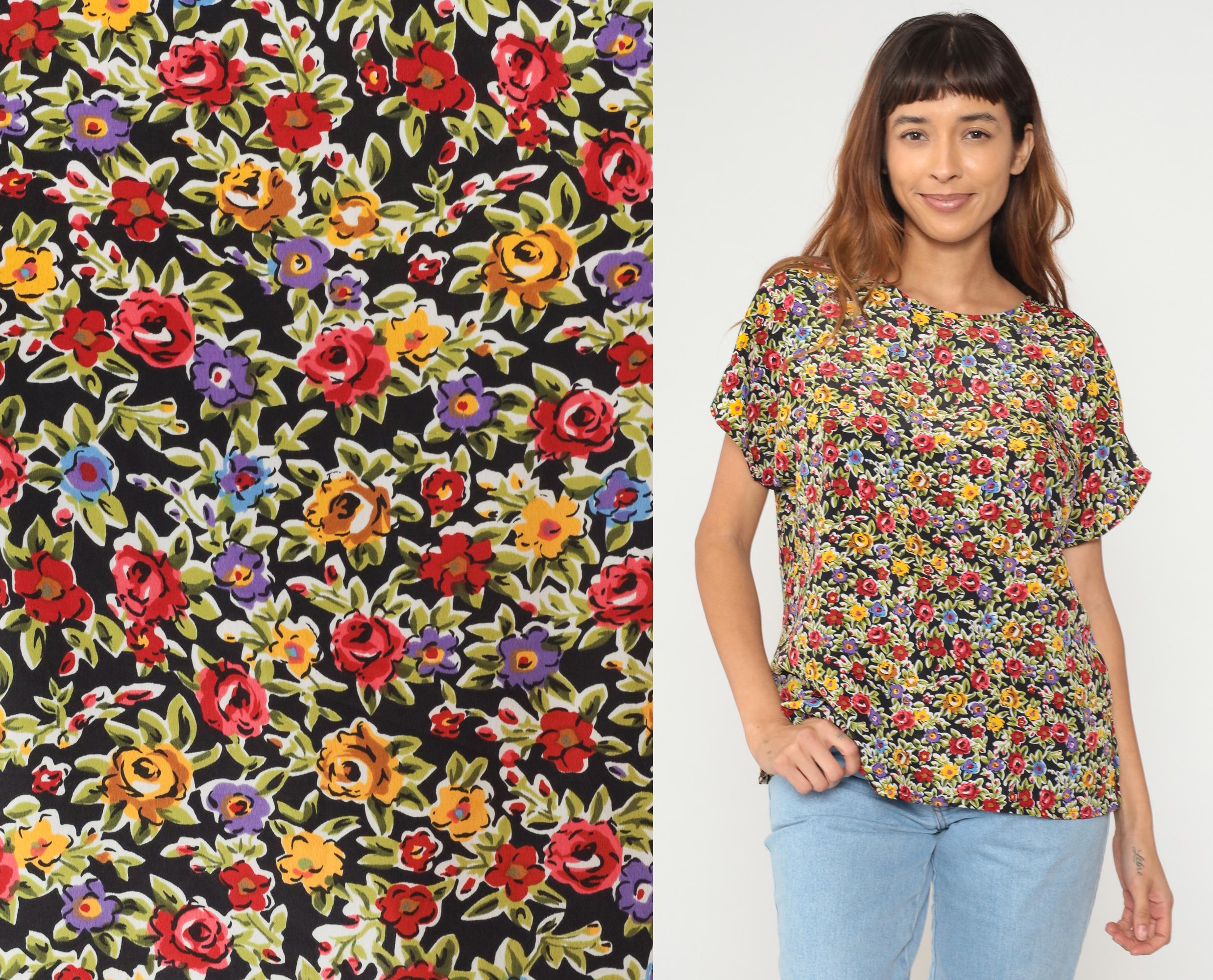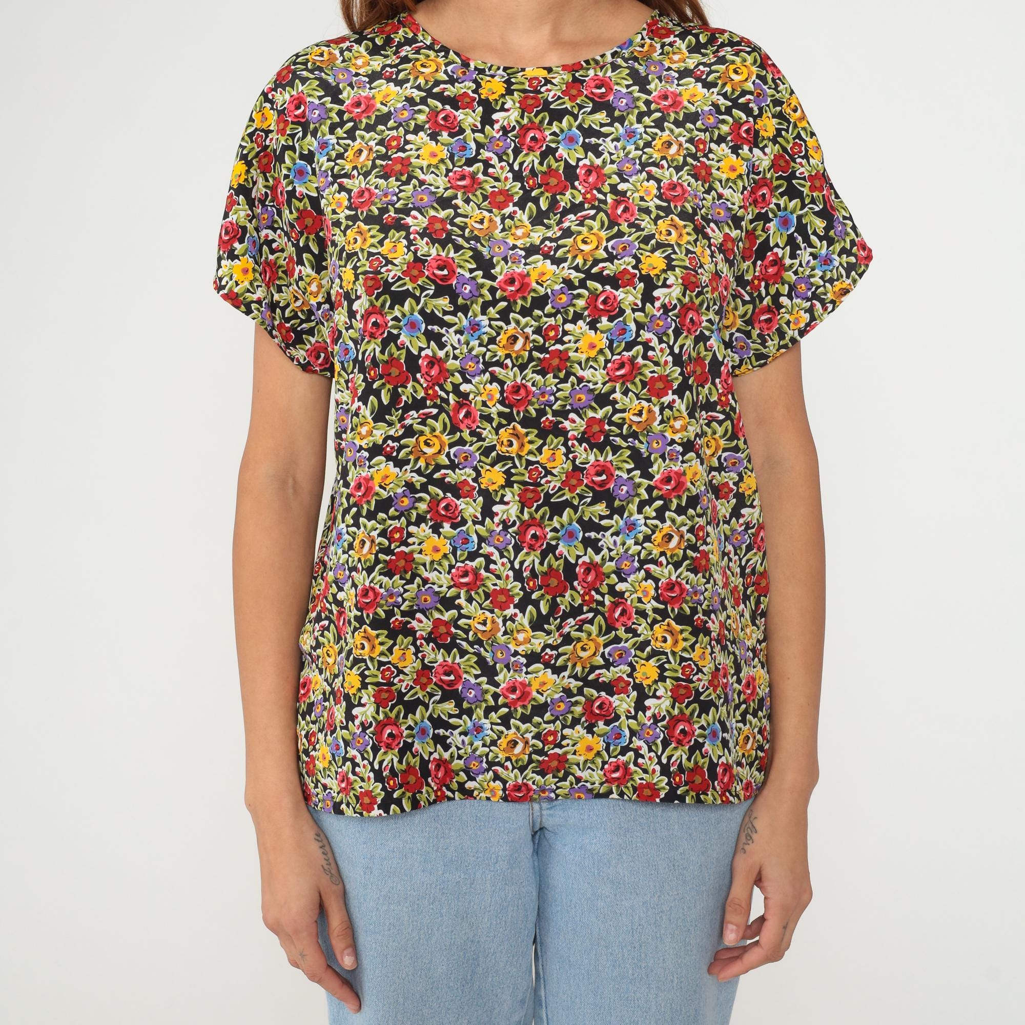 90s blouse with black background and ditsy floral print. Small roses in red, yellow, purple, and blue with green leaves scattered throughout. Short sleeves, crew neck, and oversized boxy fit. Multicolor flower pattern covers entire garment.