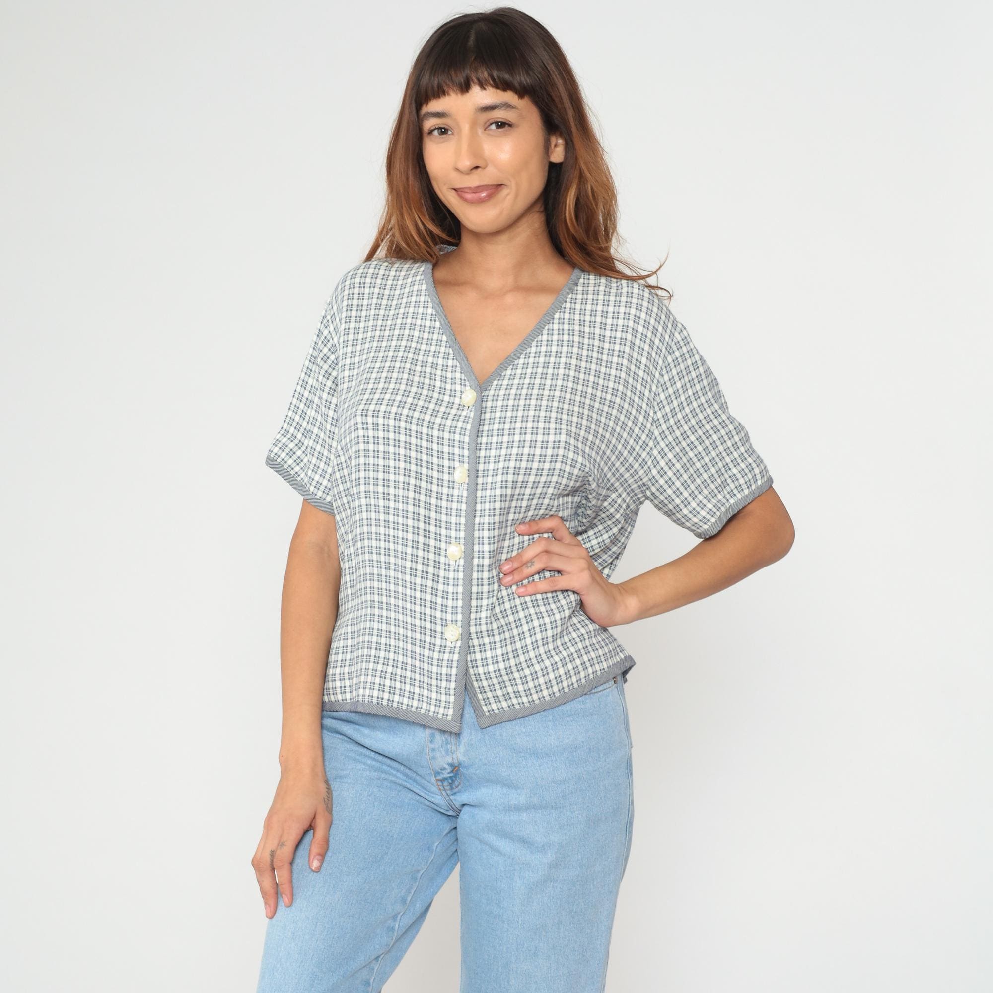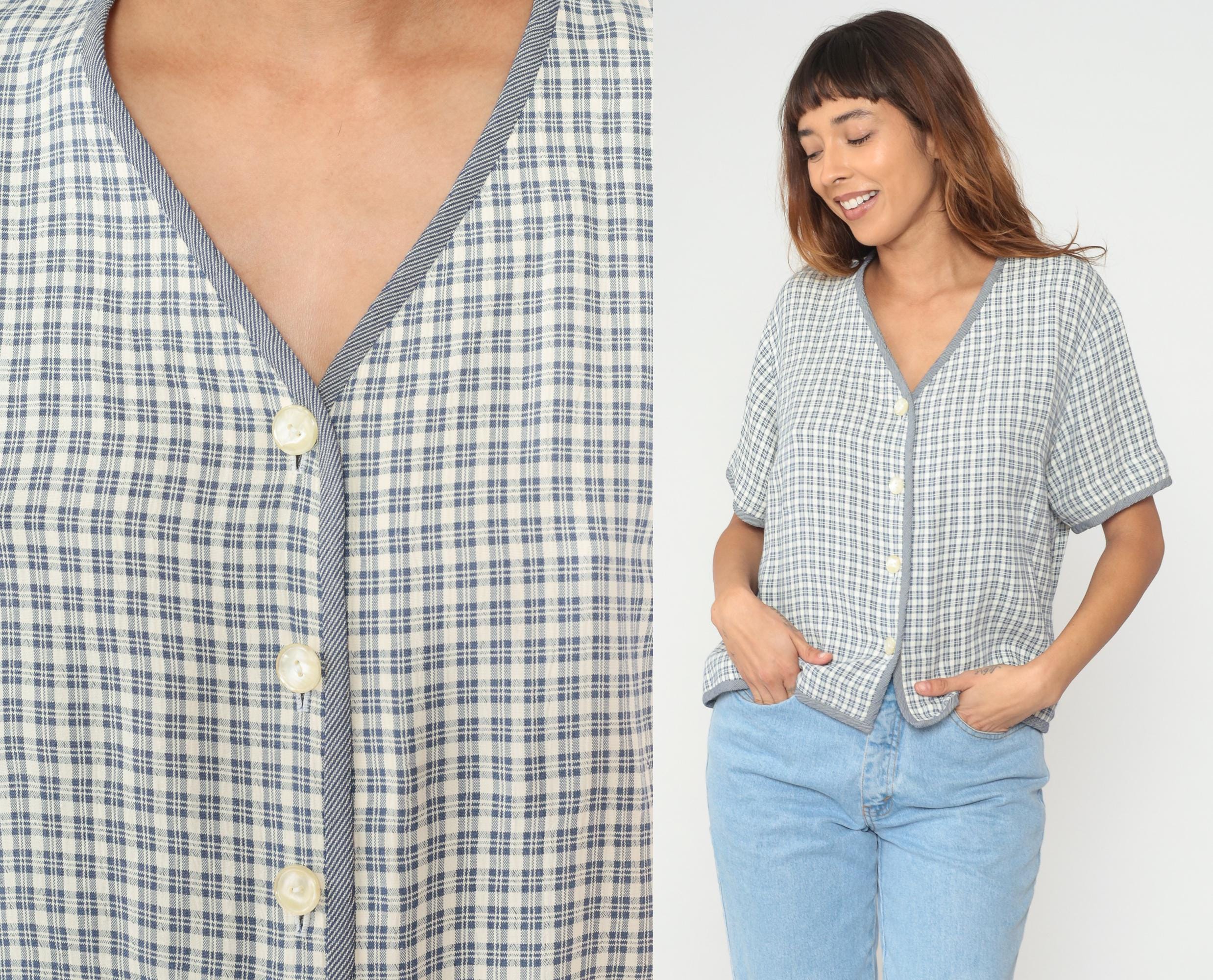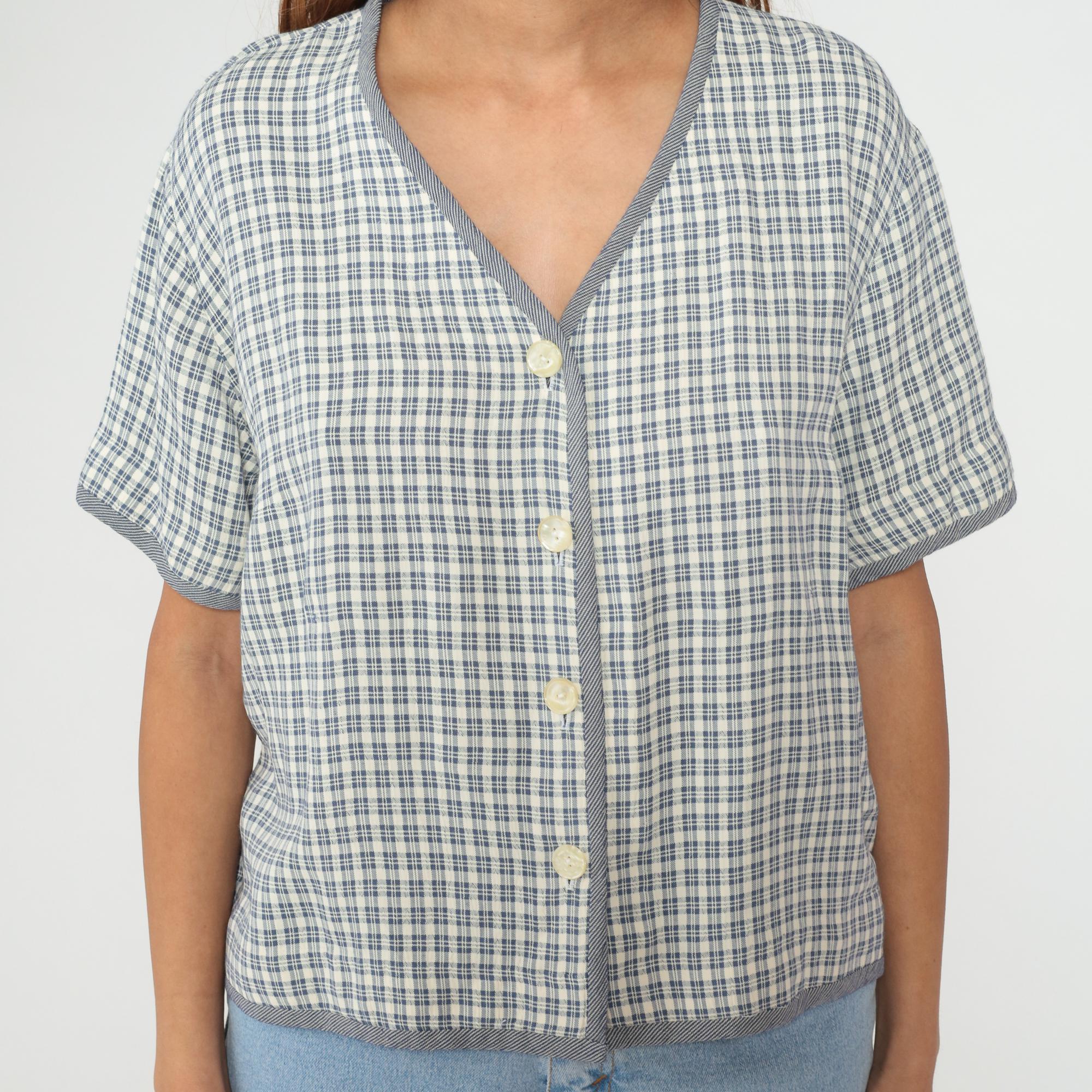 90s rayon blouse with gingham check in blue and white. Small windowpane pattern throughout with contrast stripe trim on collar and cuffs. Short sleeves, V-neck, and button front closure.