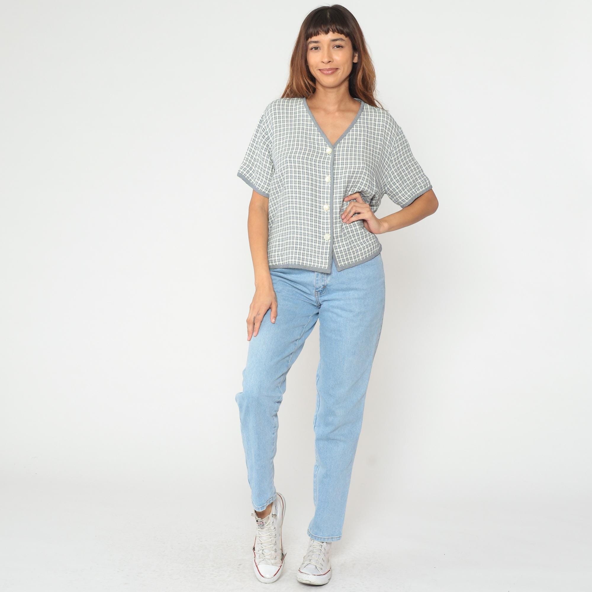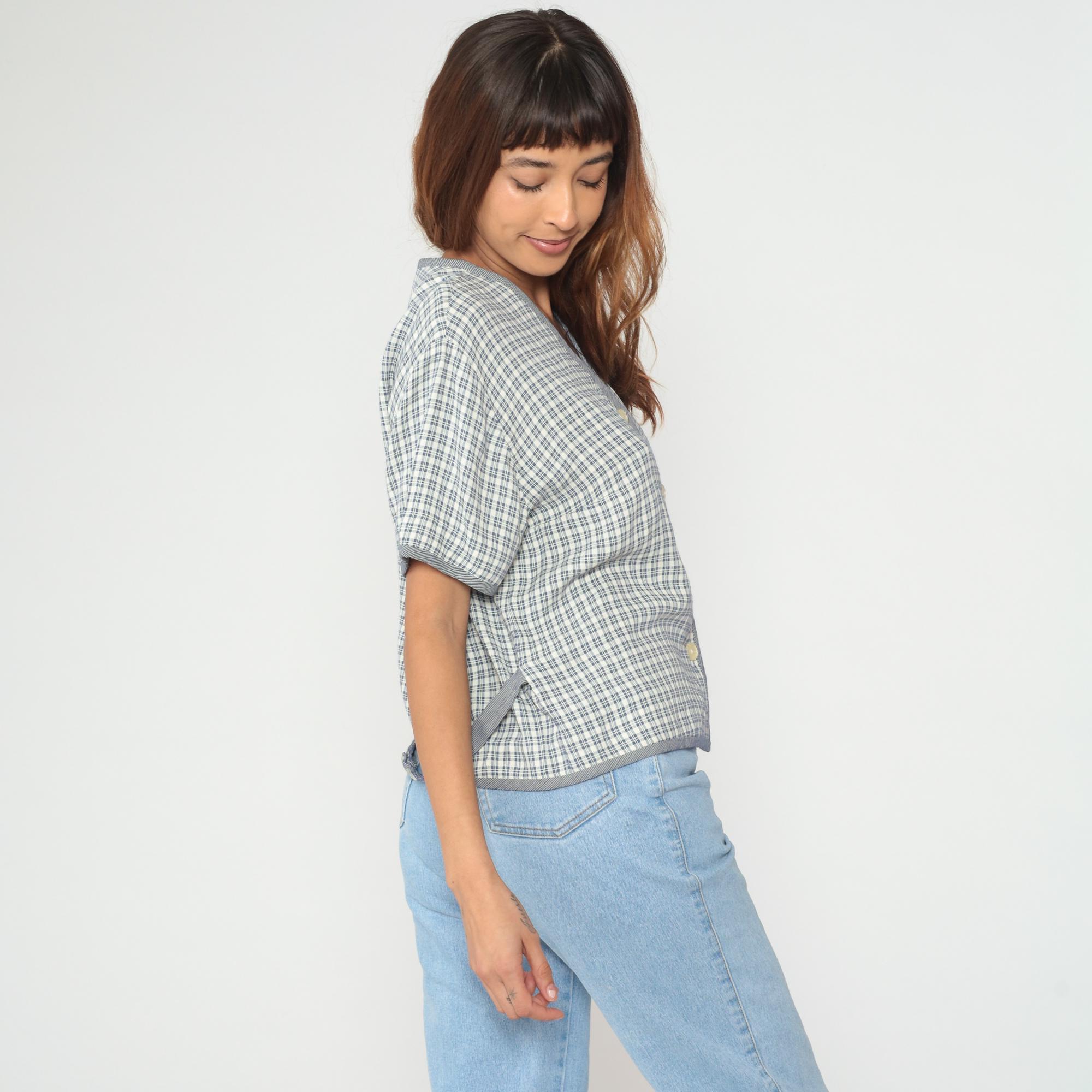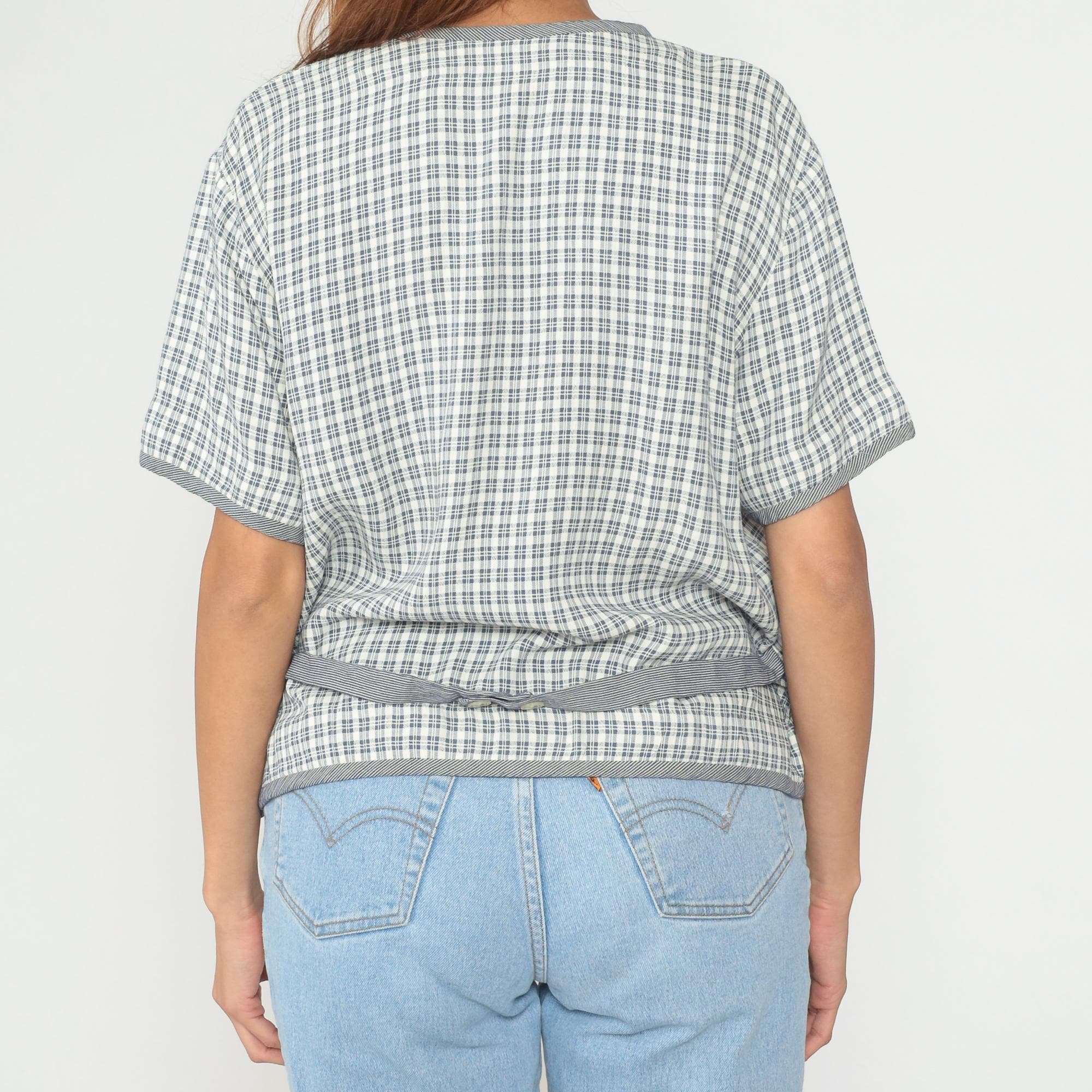 90s rayon blouse with gingham check in blue and white. Small windowpane pattern throughout with contrast stripe trim on collar and cuffs. Short sleeves, V-neck, and button front closure.