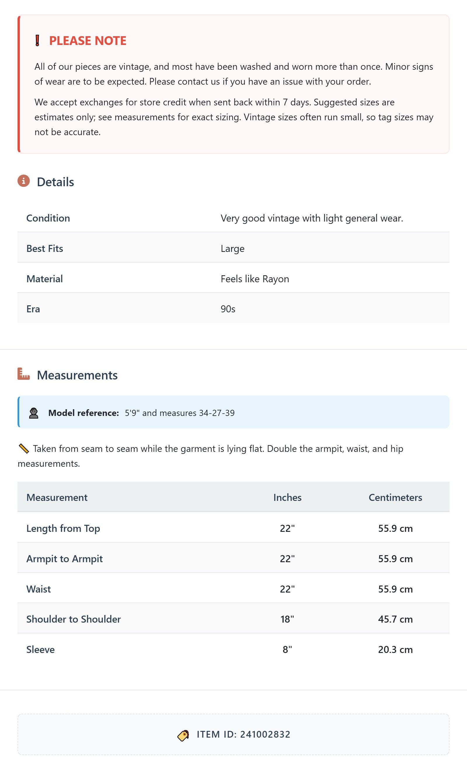 Suggested sizes are estimates only; see measurements for exact sizing. Vintage sizes often run small, so tag sizes may not be accurate.