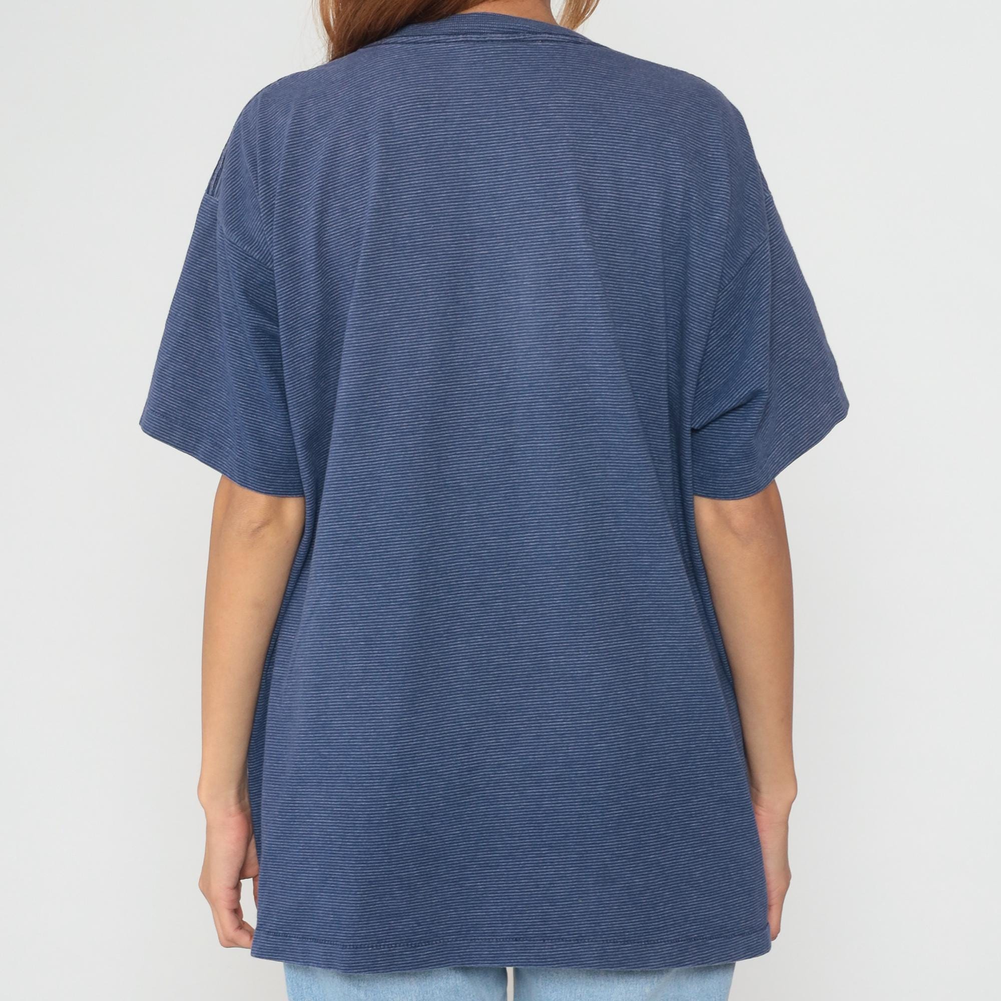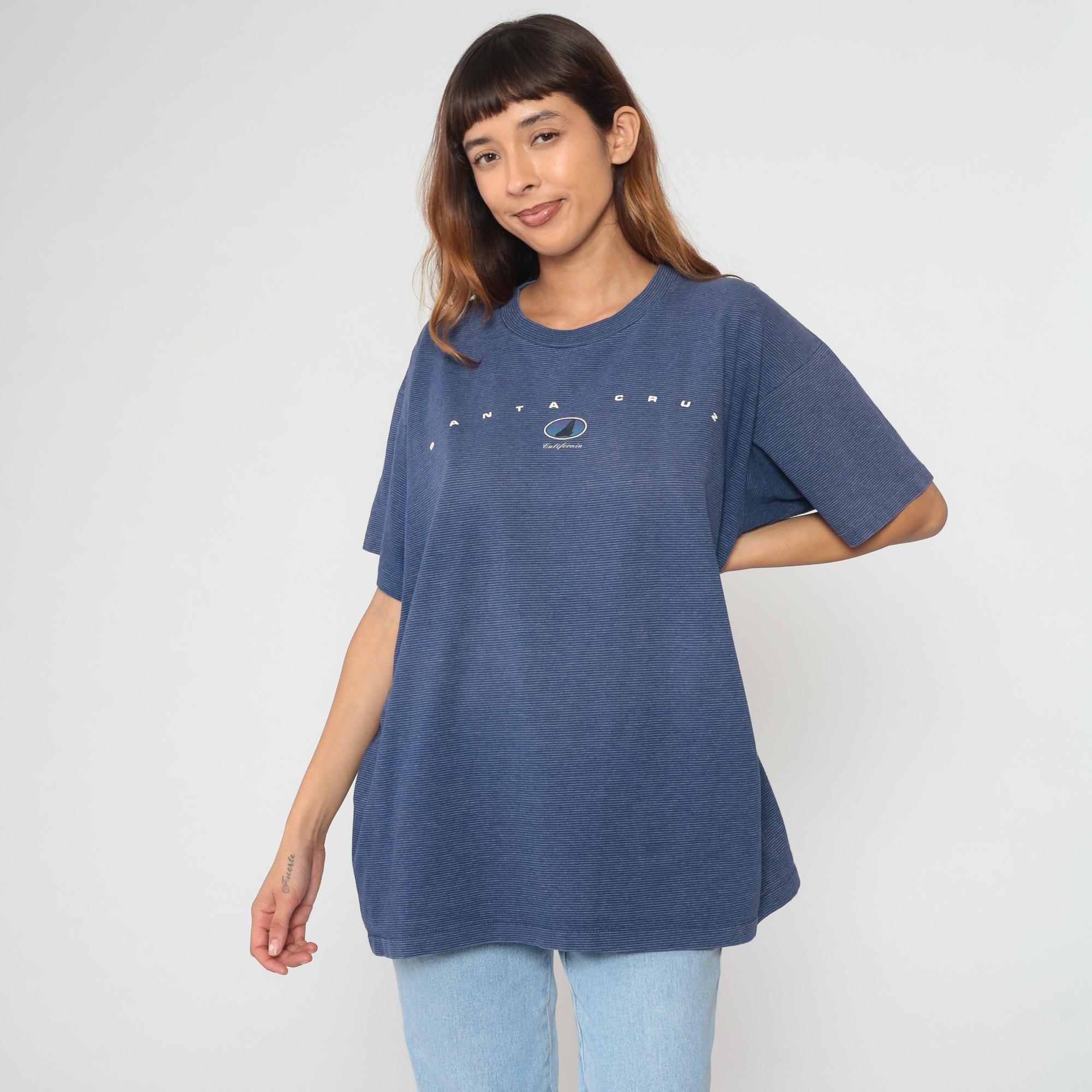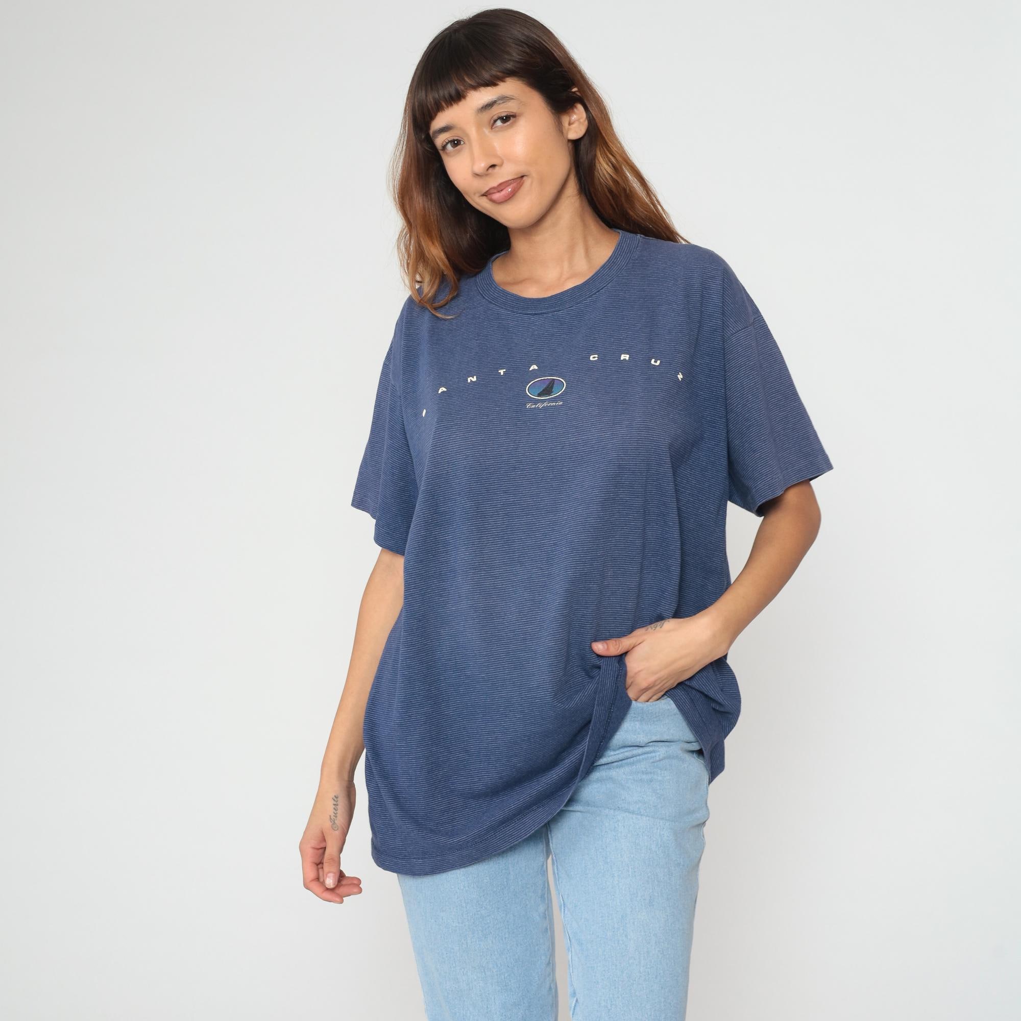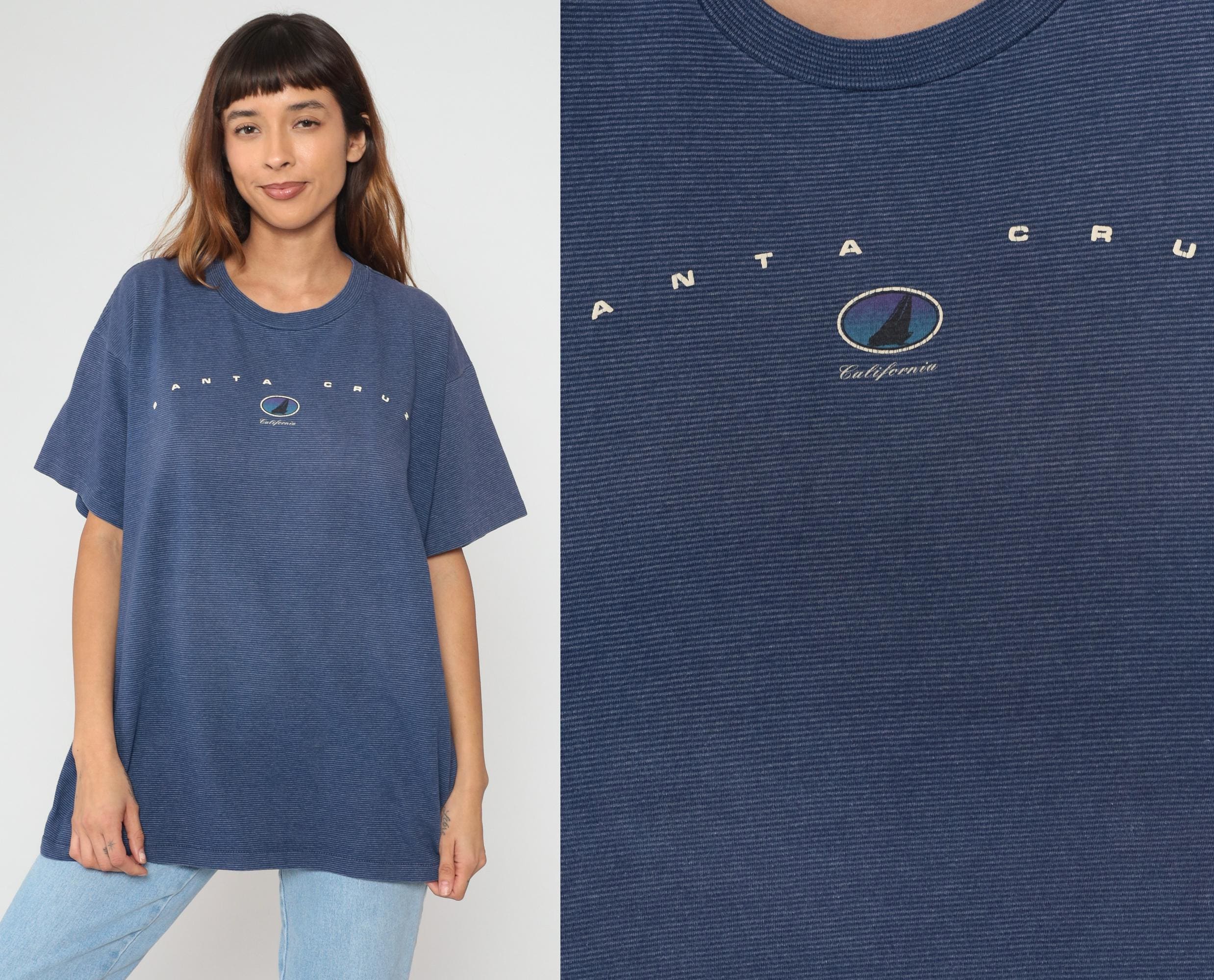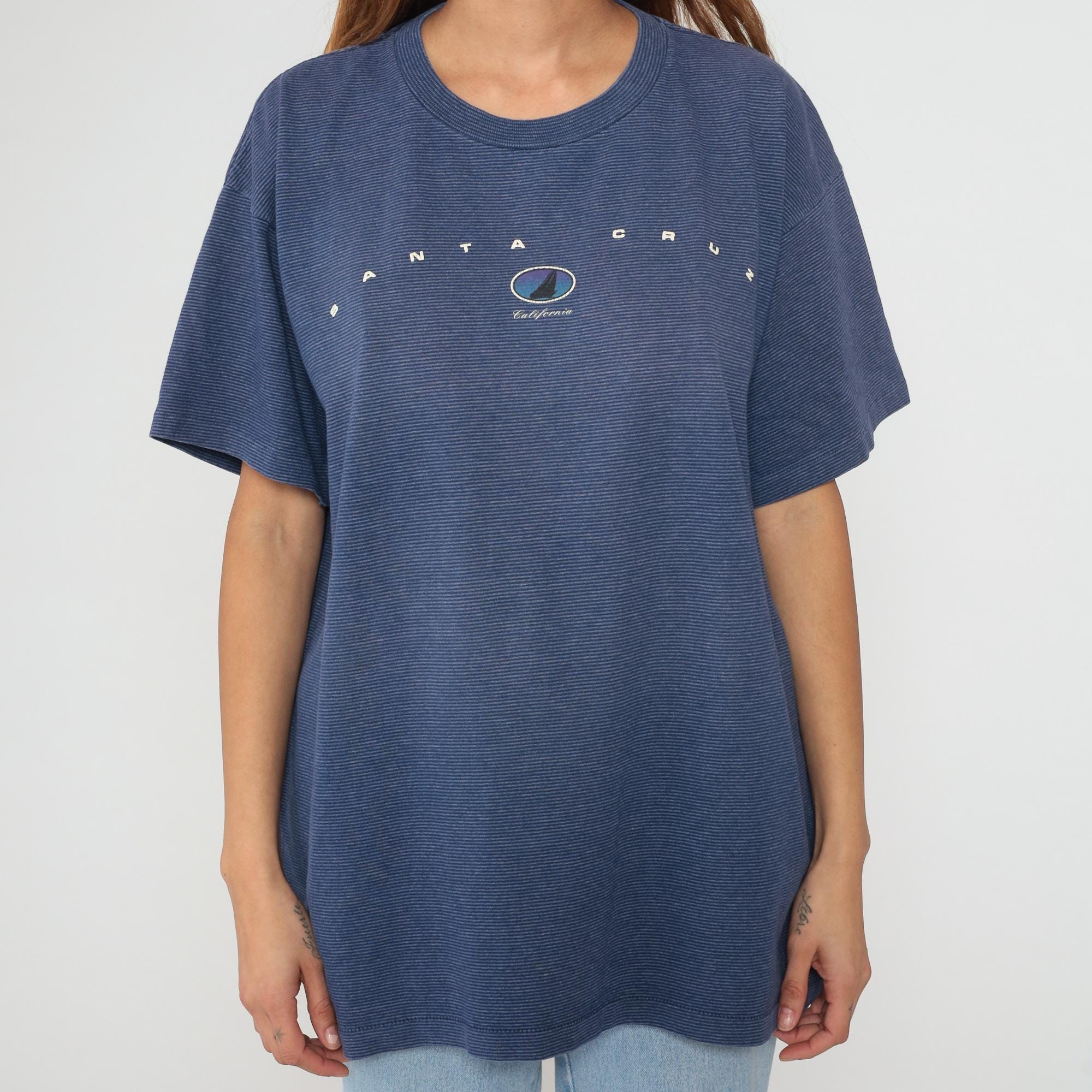 90s cotton blend tee with Santa Cruz California graphic on blue striped fabric. Small oval logo with sailboat image and "California" text underneath. Short sleeves, crew neck, and oversized relaxed fit.