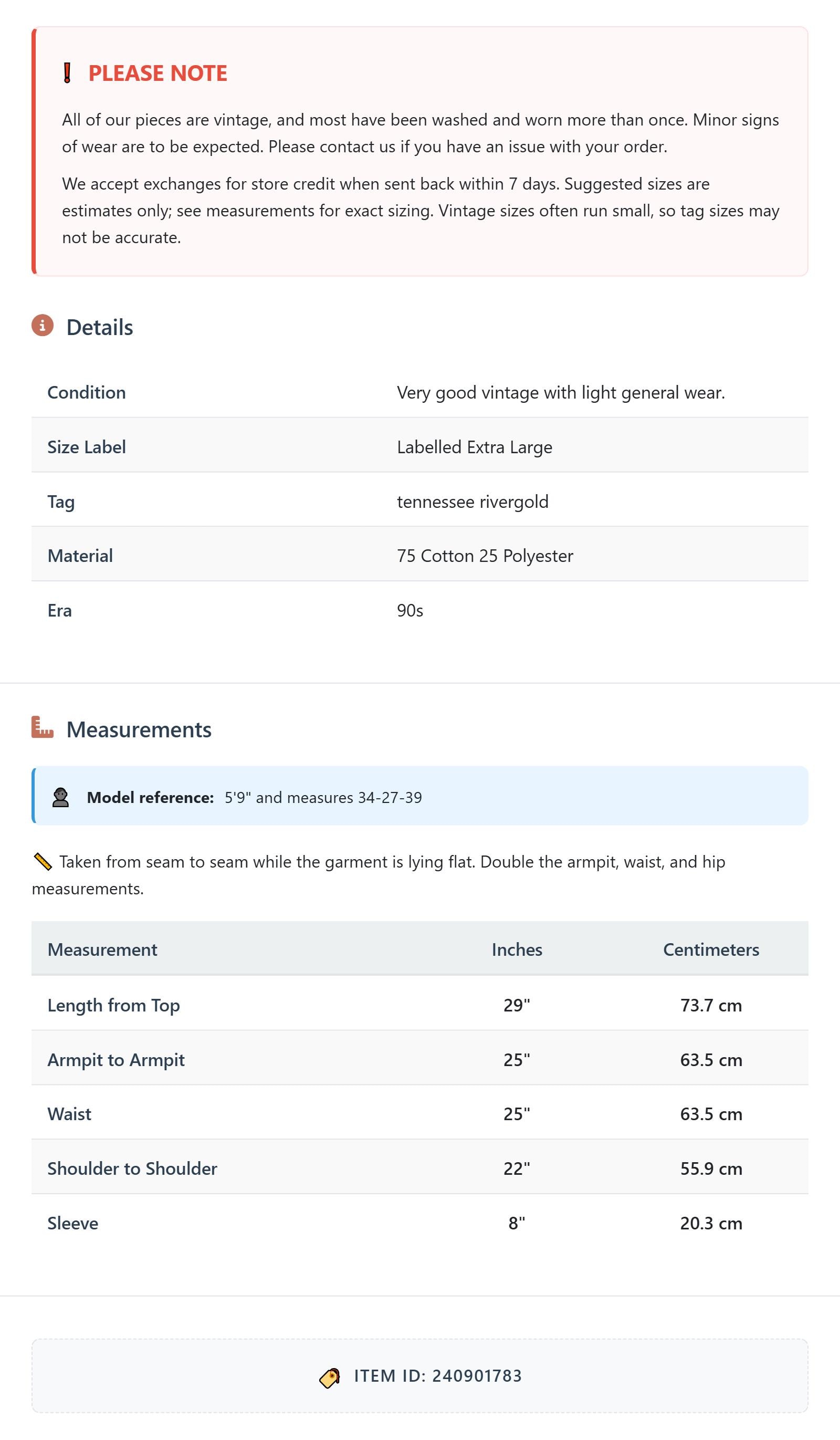 All of our pieces are vintage, and most have been washed and worn more than once. Minor signs of wear are to be expected. Please contact us if you have an issue with your order. We accept exchanges for store credit when sent back within 7 days.
