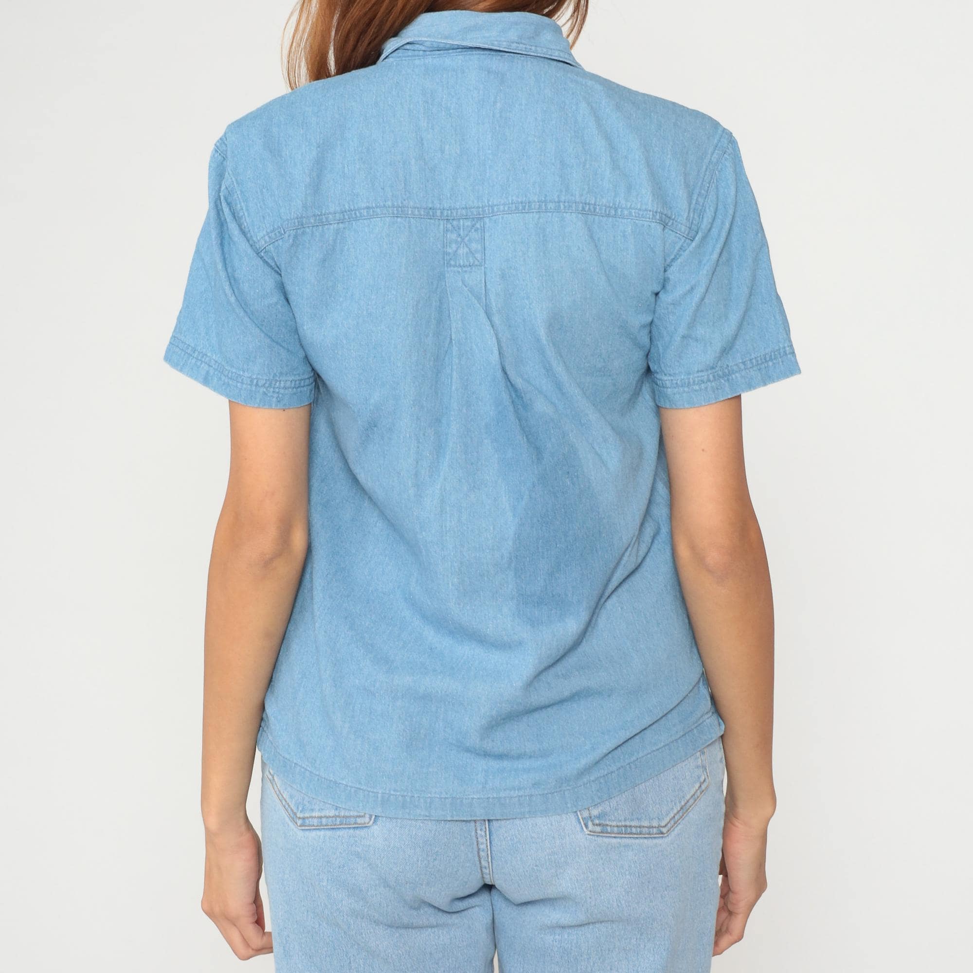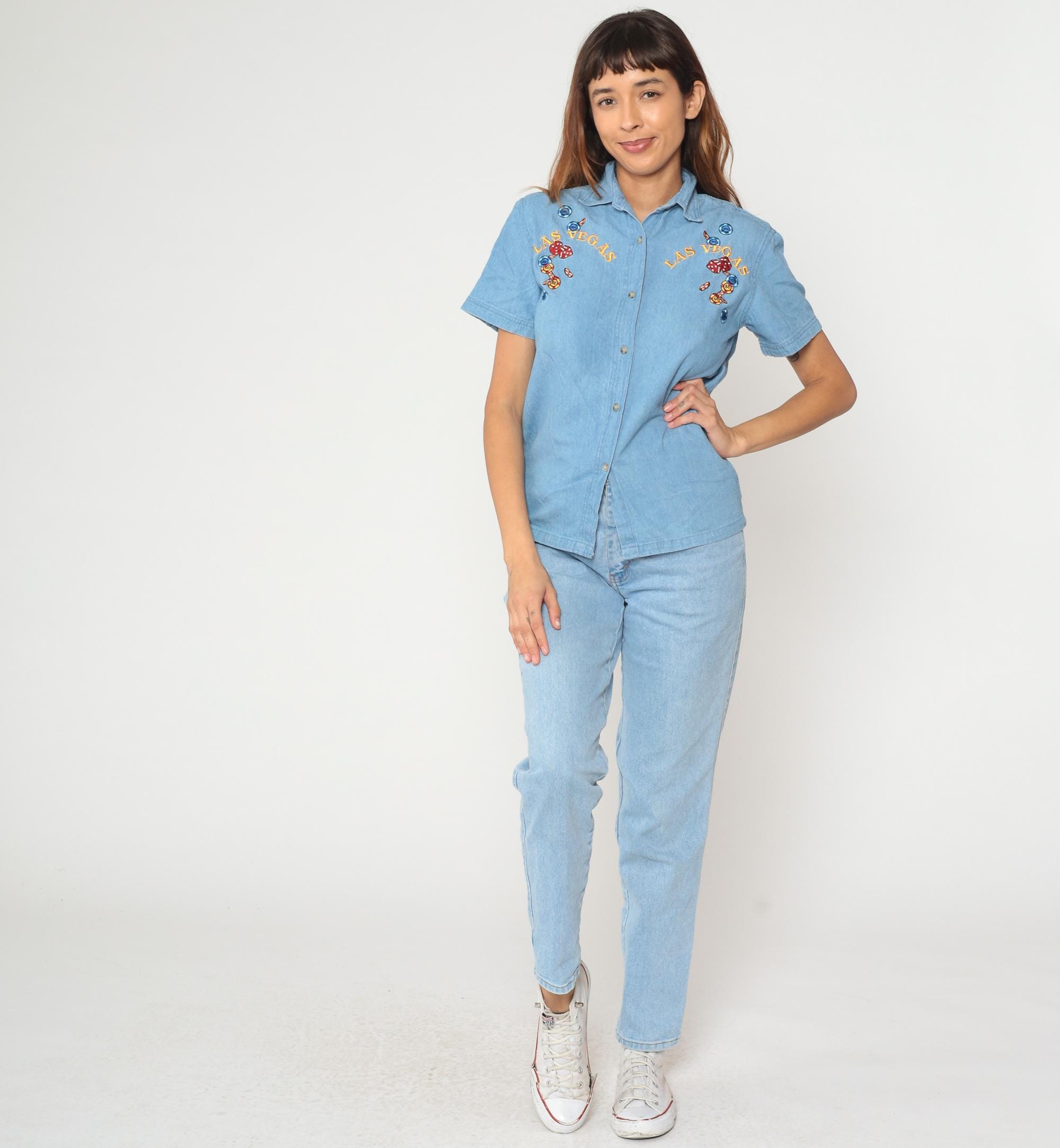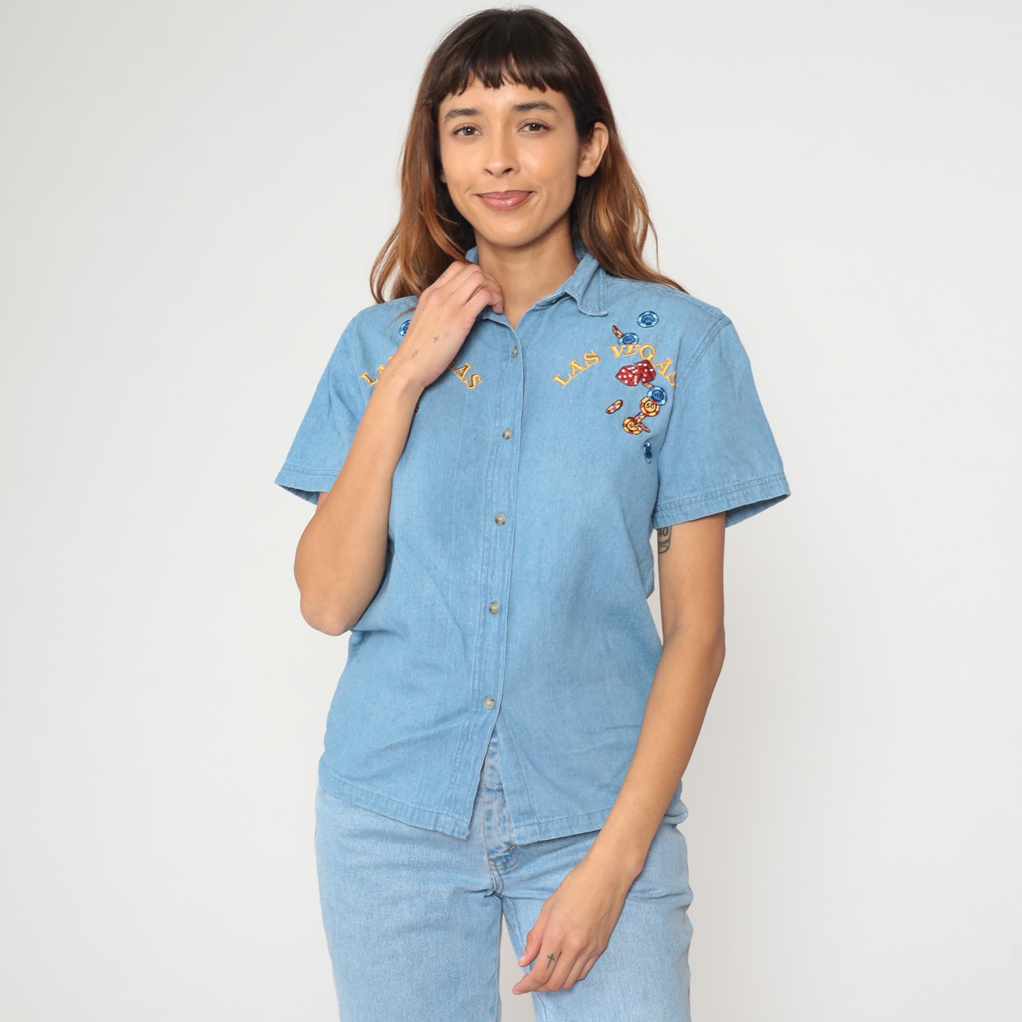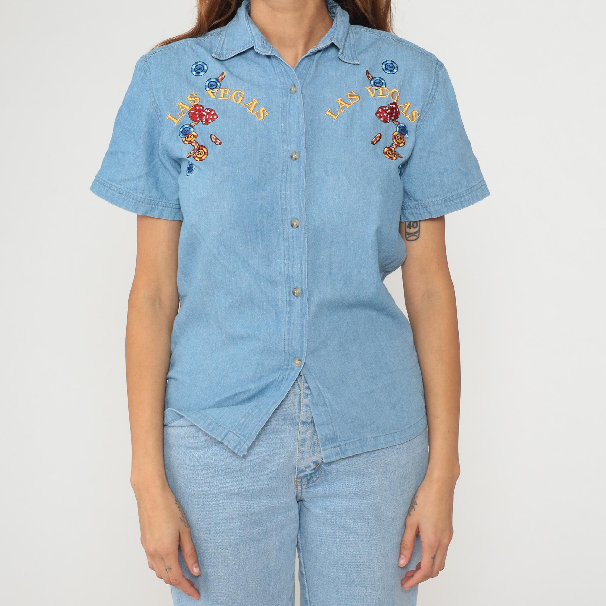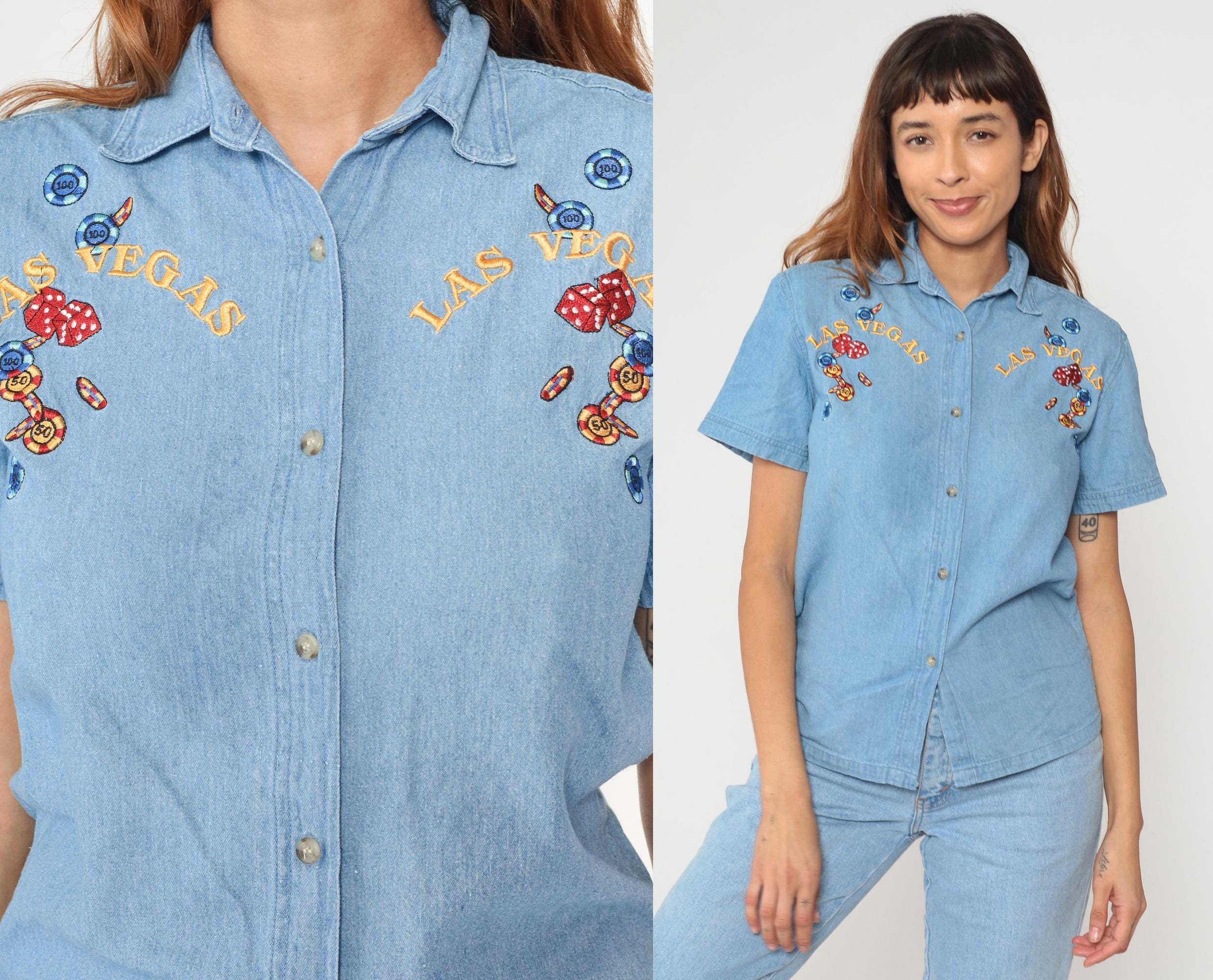 Y2K cotton denim shirt with Las Vegas casino embroidery. Features "LAS VEGAS" text with dice, poker chips, and gambling motifs embroidered on chest and collar. Short sleeves, button front closure, and fitted cut.