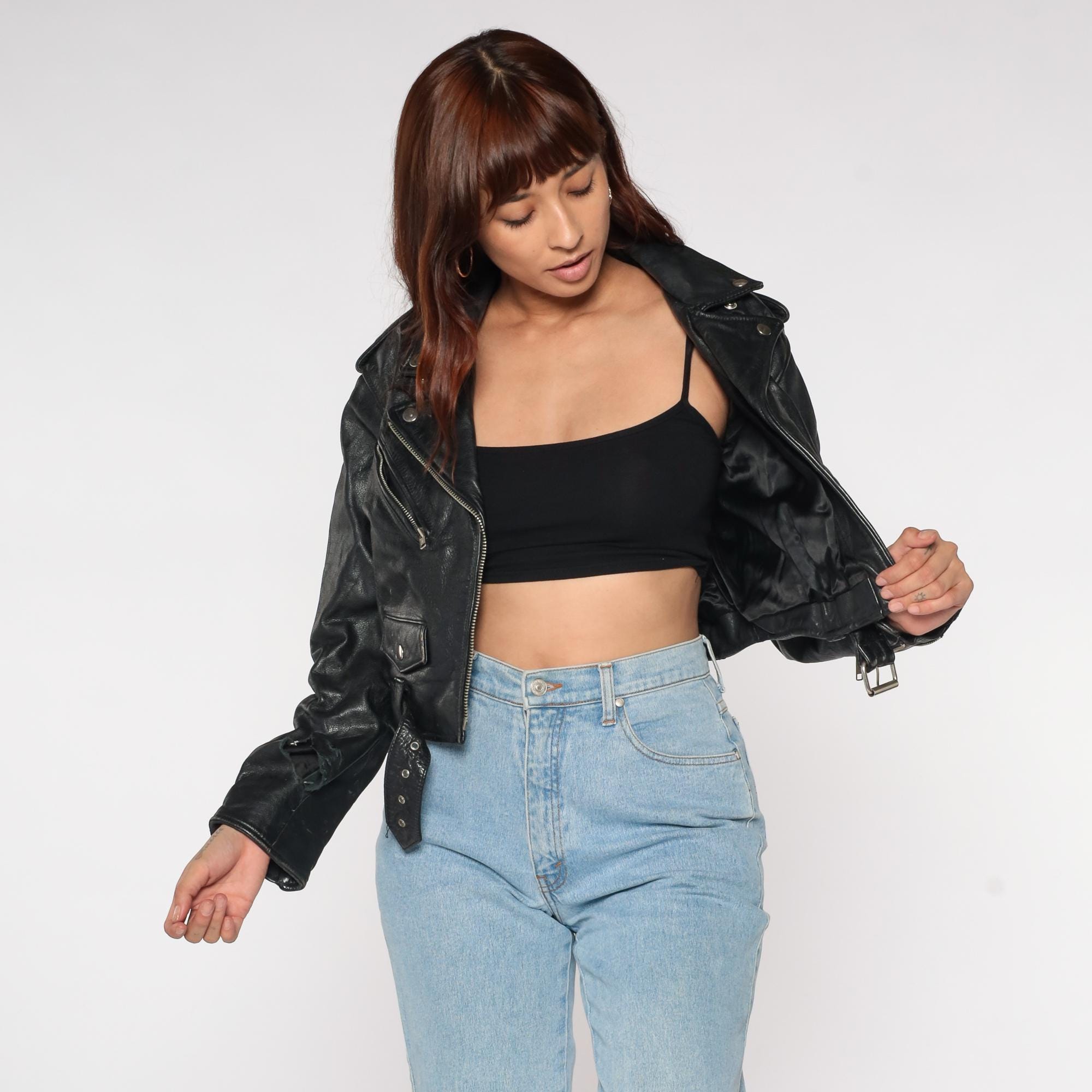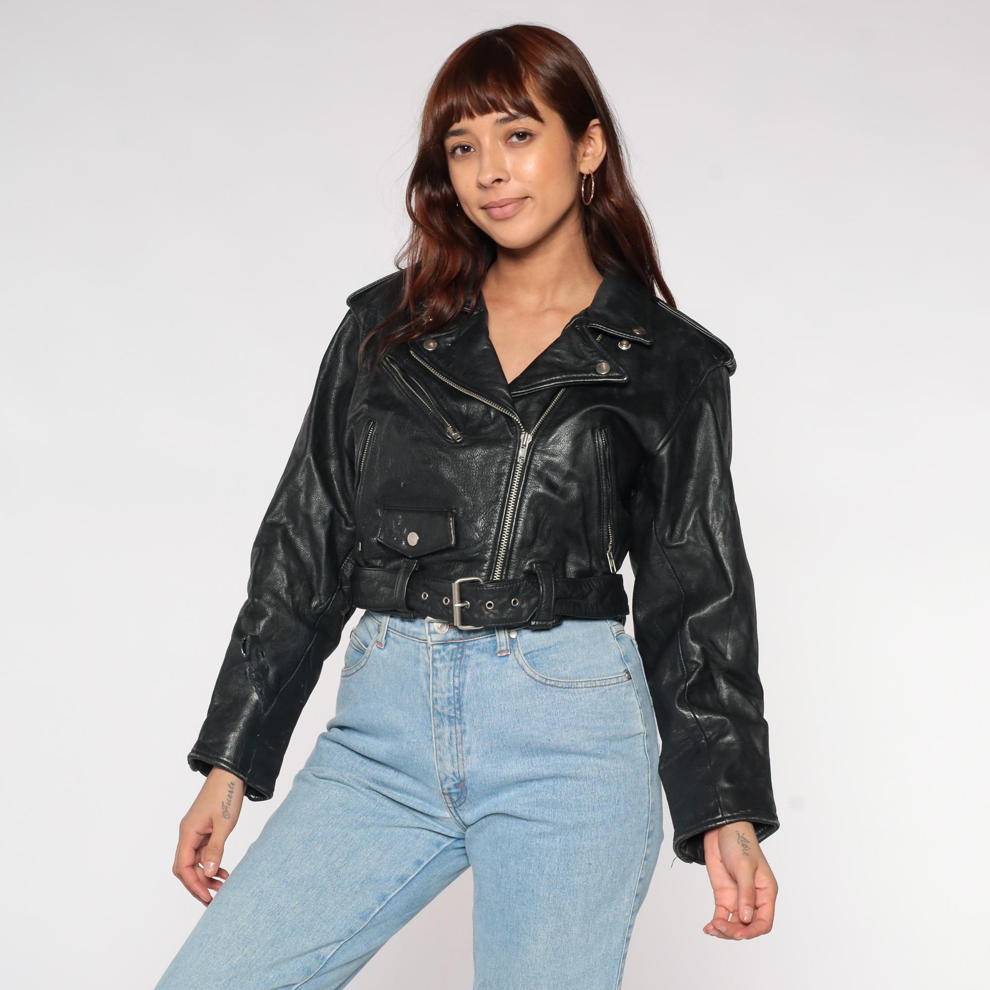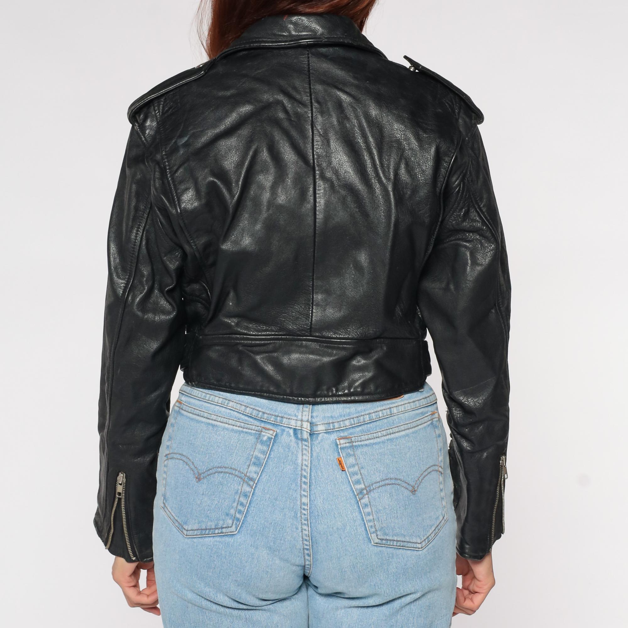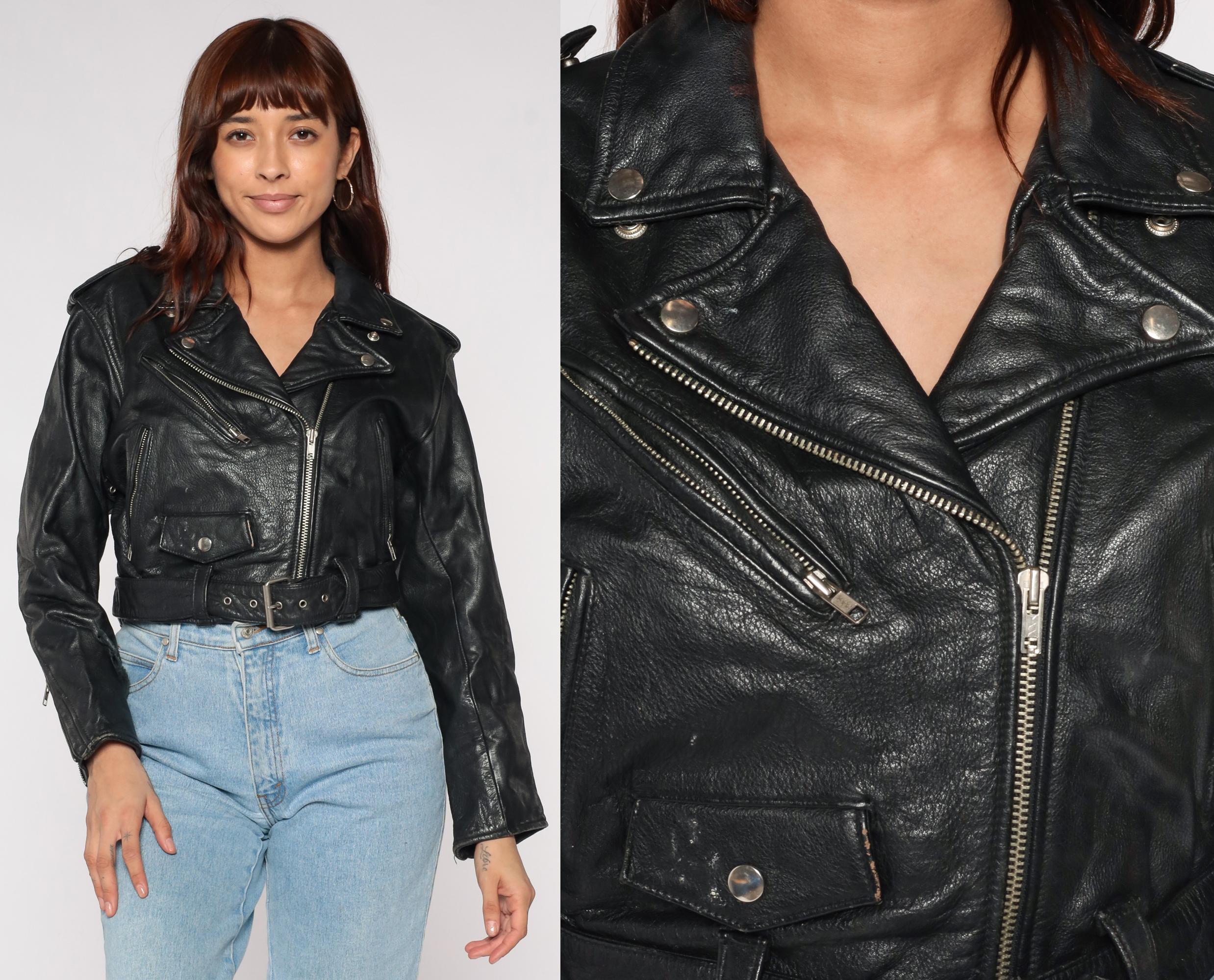 90s black leather moto jacket by Tannery West. Classic biker style with asymmetrical zip front, multiple zip pockets, and belt details. Silver-tone hardware throughout.